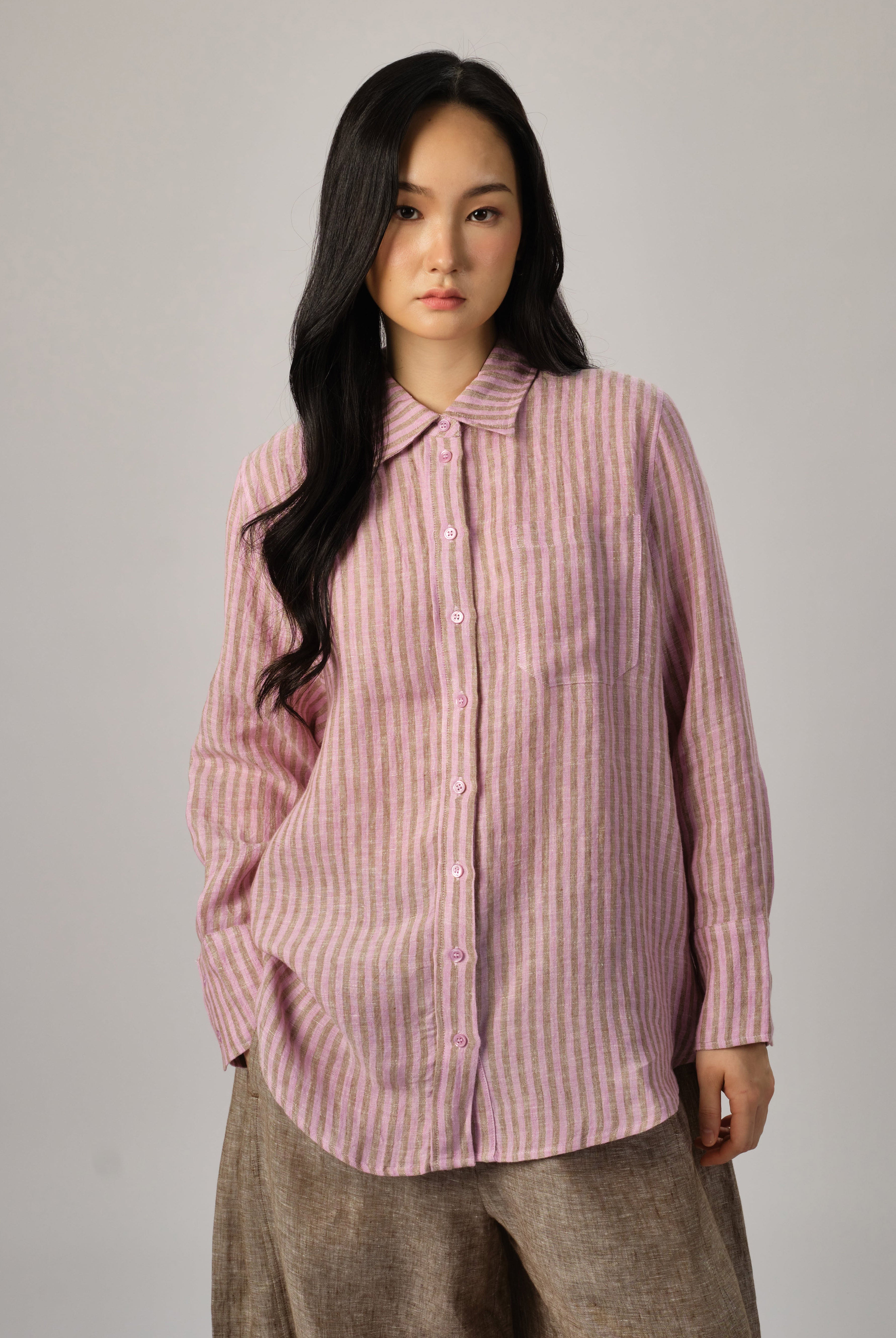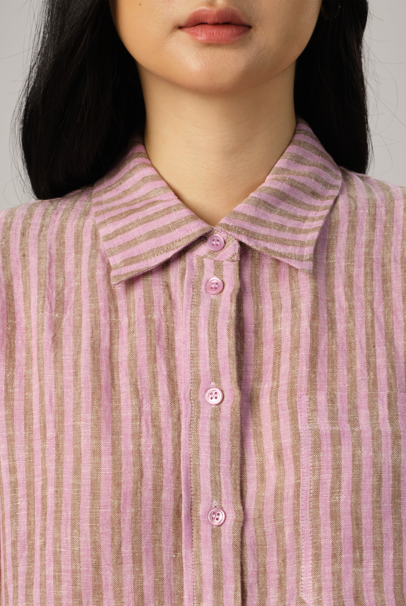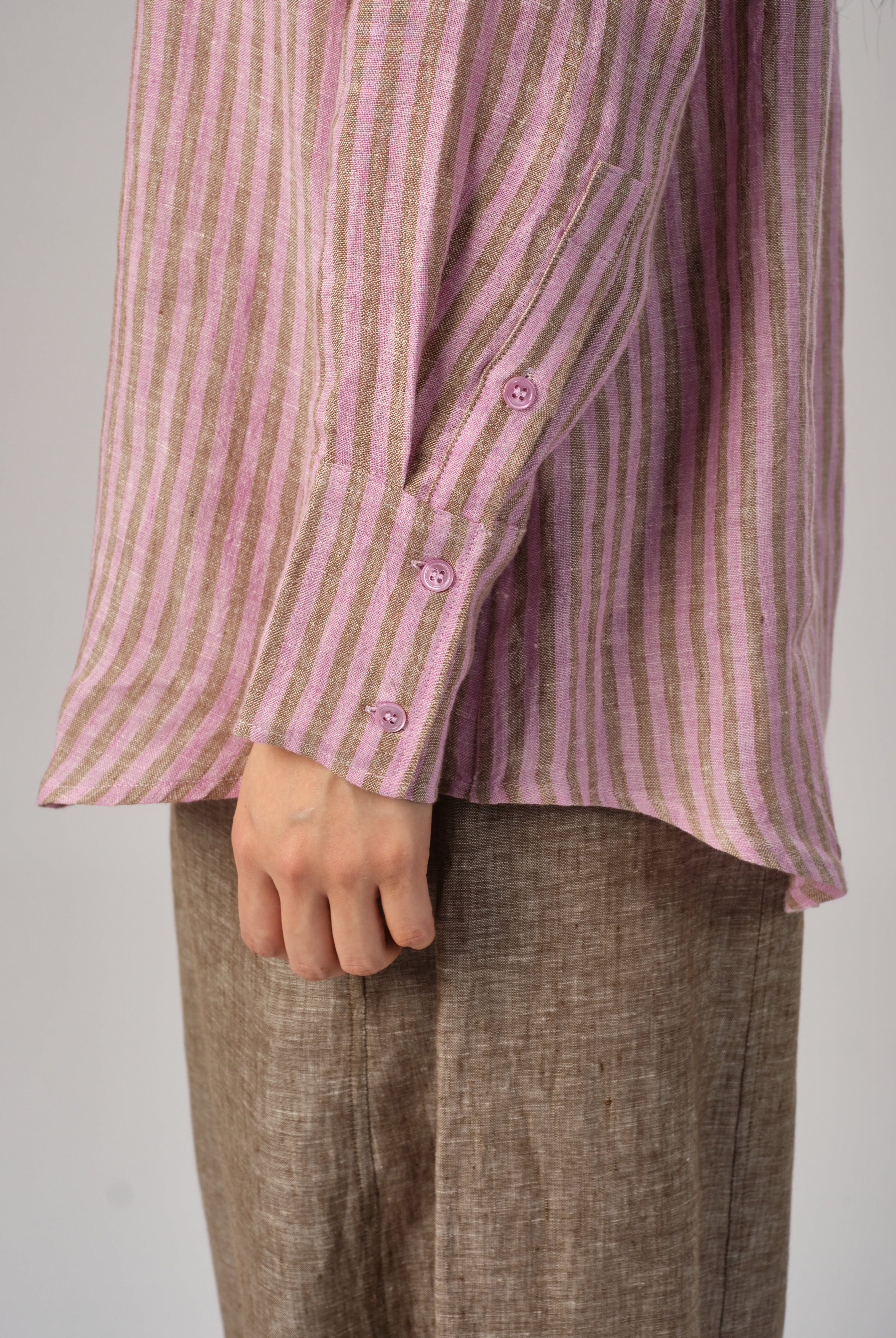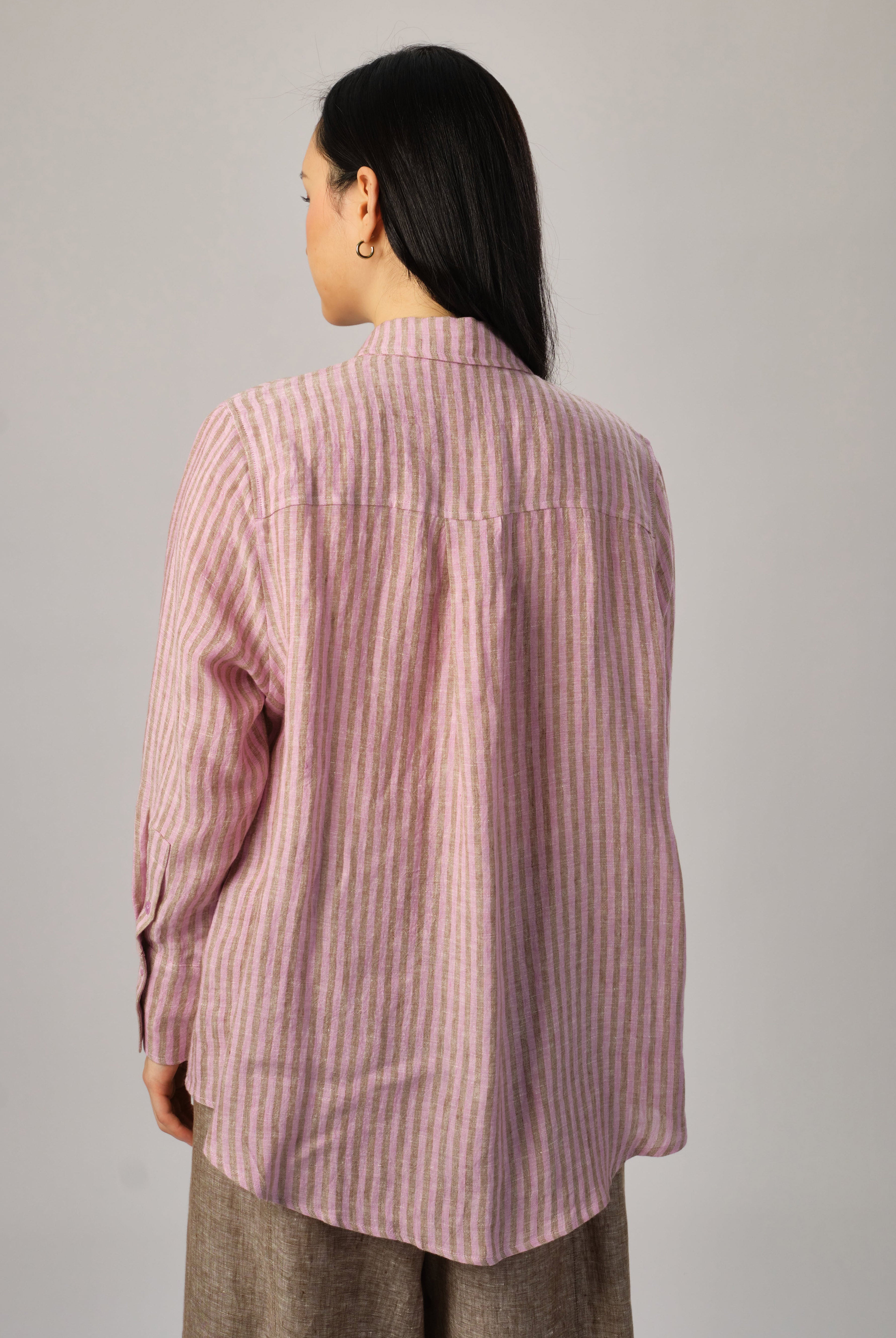 A semi-fitted shirt, with a front shell button opening. Features a high-low hem. Rendered in linen with a striped weave pattern.
