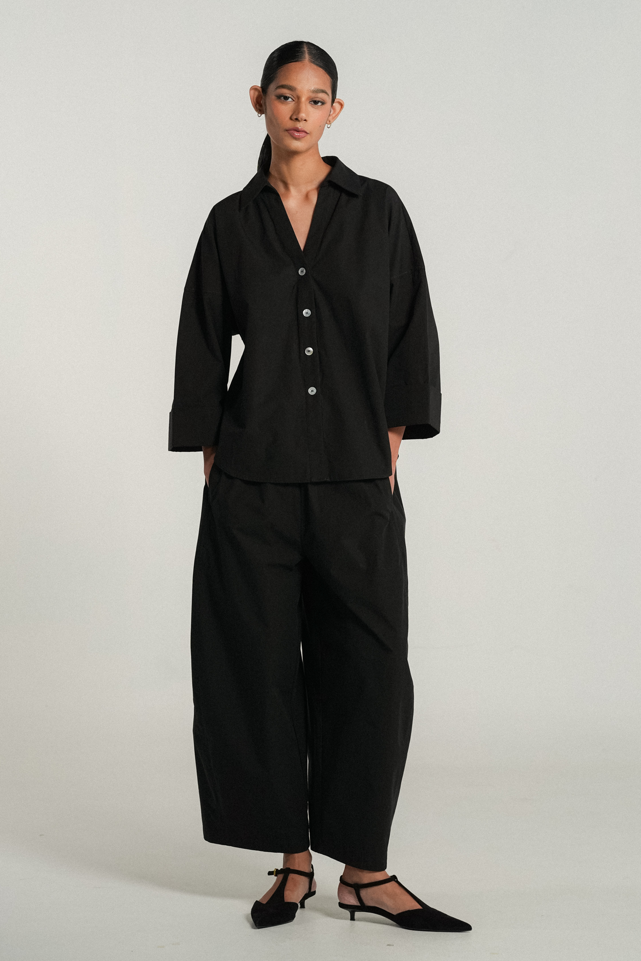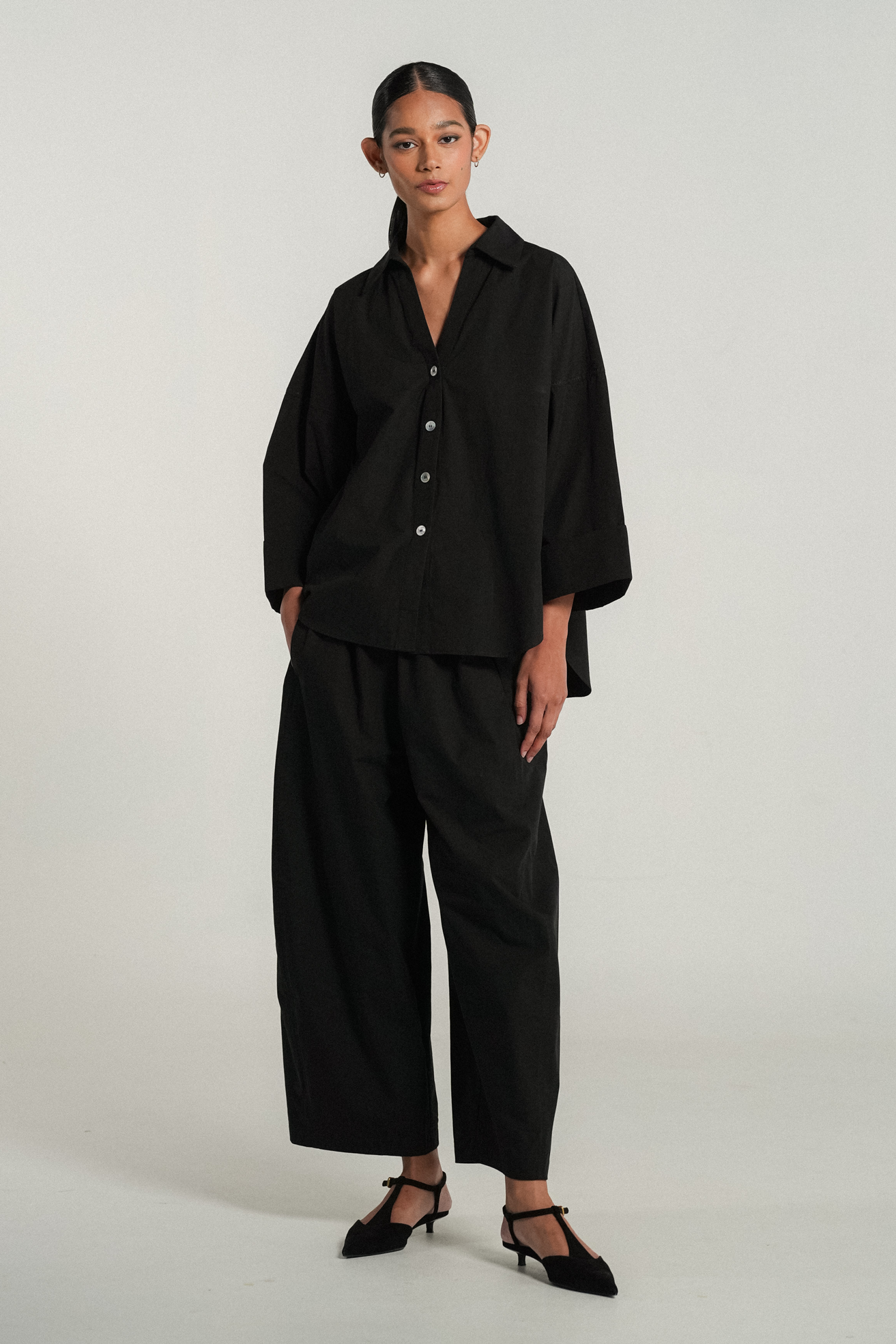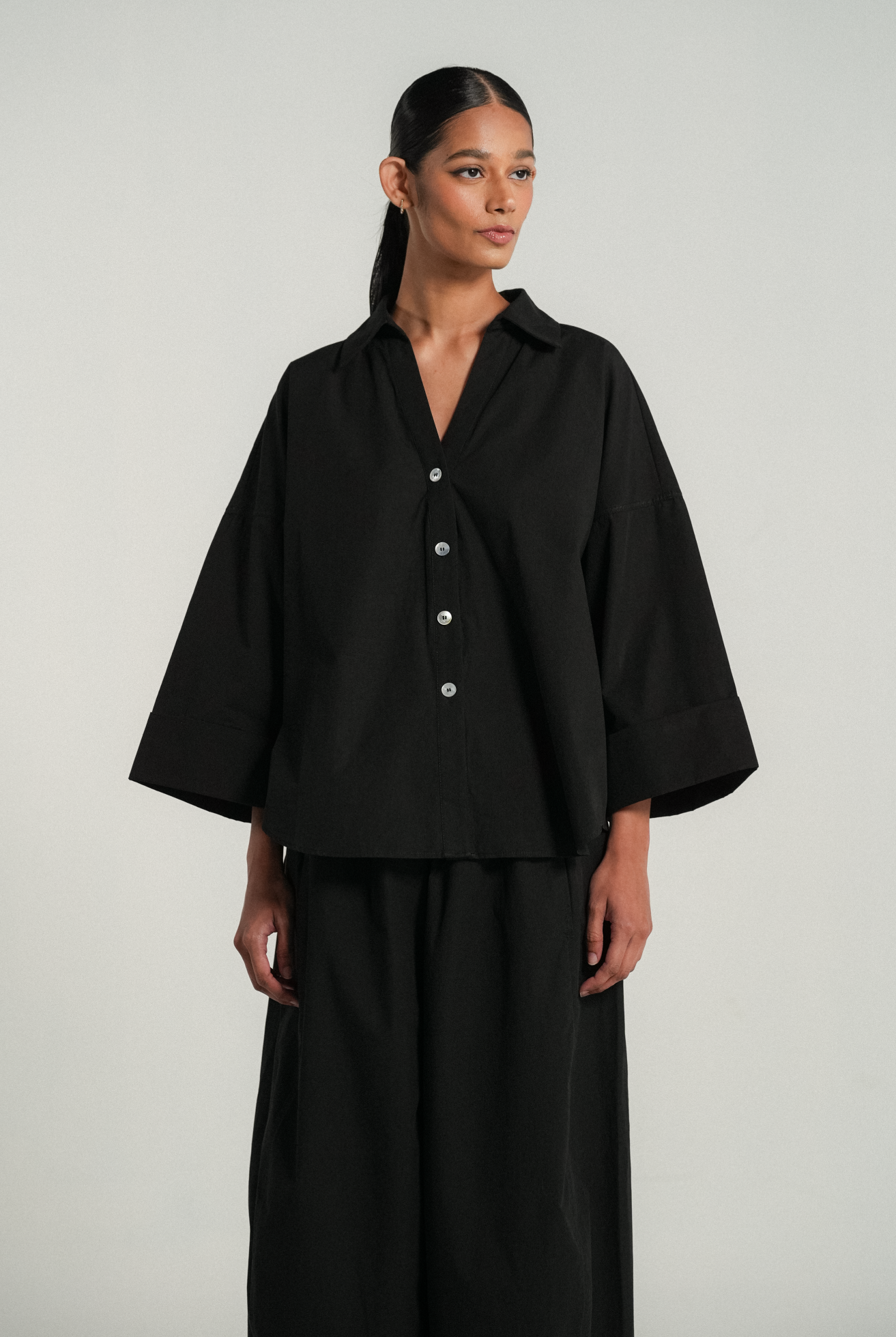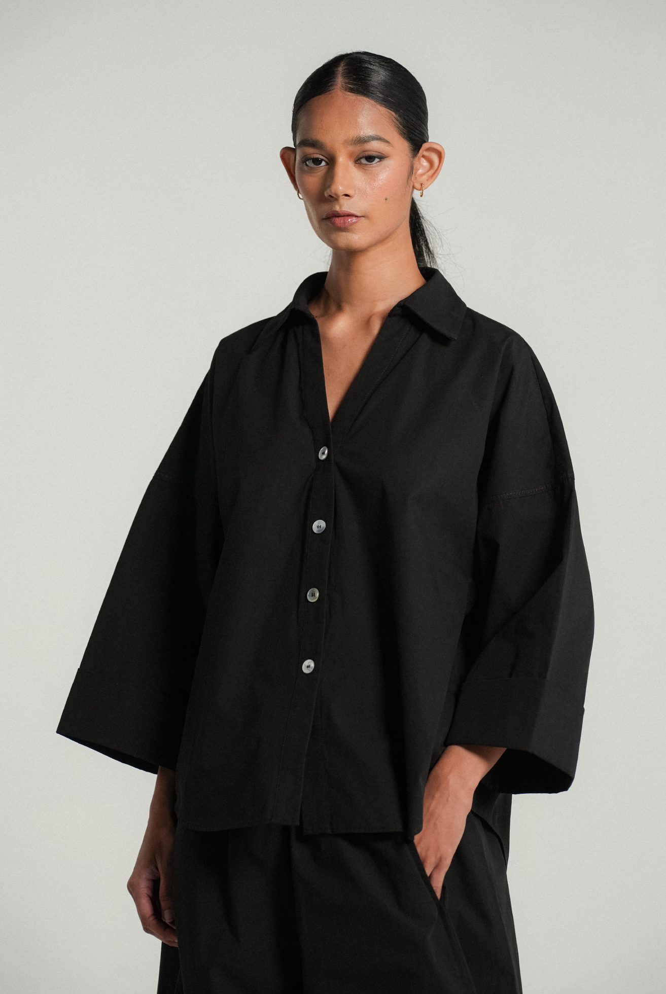 An oversized fit with an open V-neck and pointed collar, complemented by drop shoulders for an easygoing silhouette. Rendered in cotton poplin.