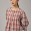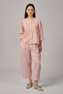 A relaxed, feminine silhouette in cotton, with a gingham weave pattern. Features micro pintuck detailing and a round neck with lace-trimmed button opening. Finished with bracelet-length sleeves.