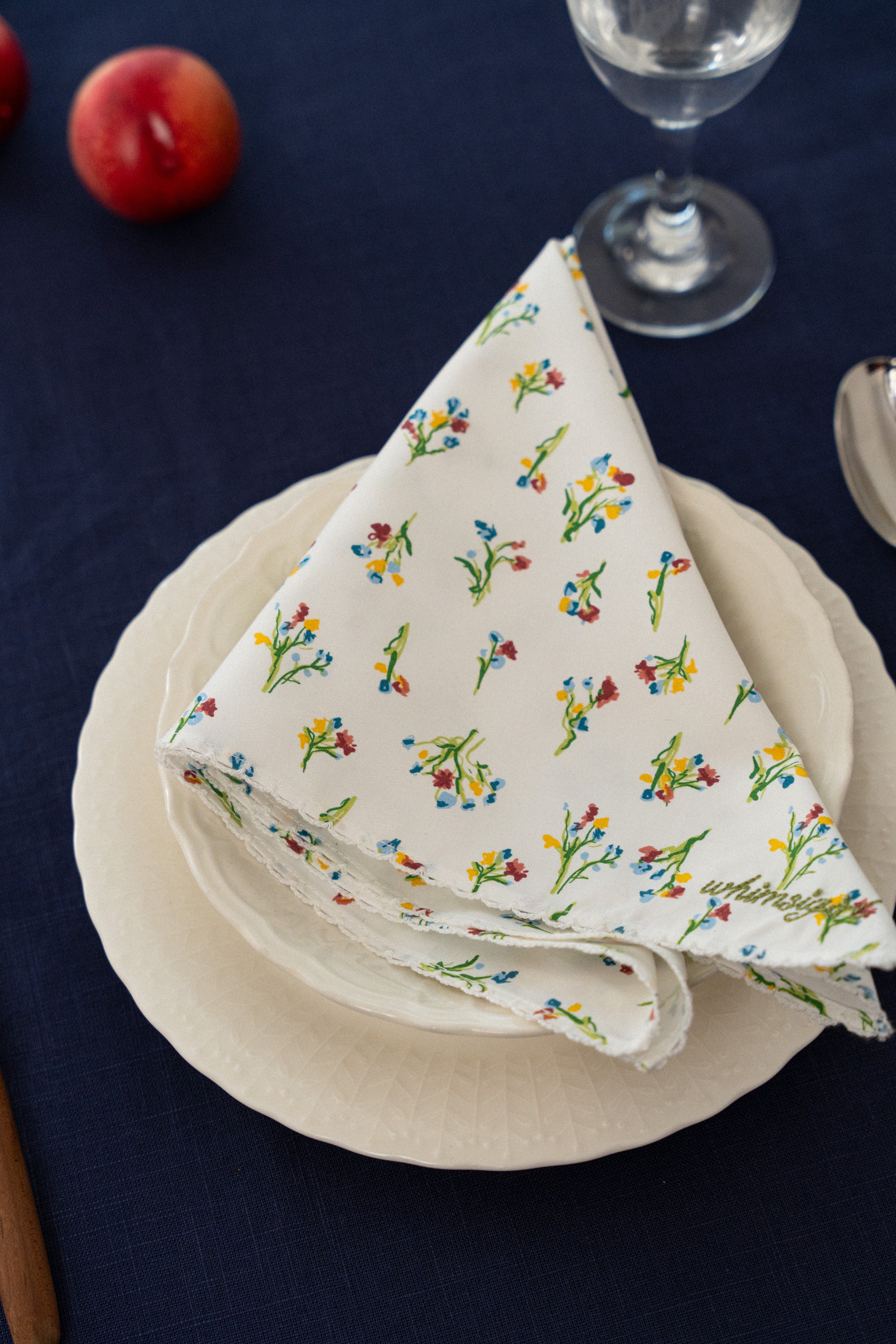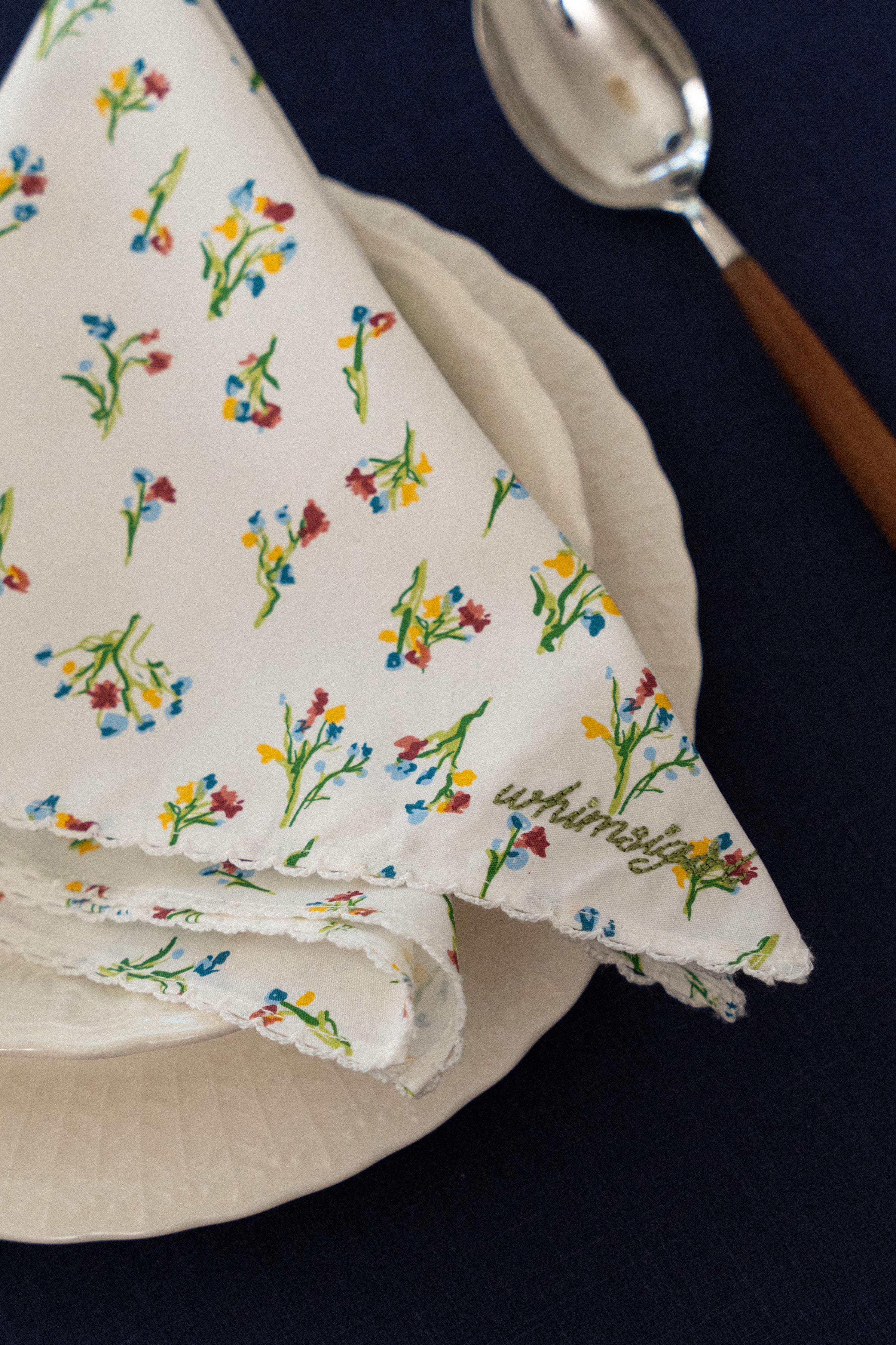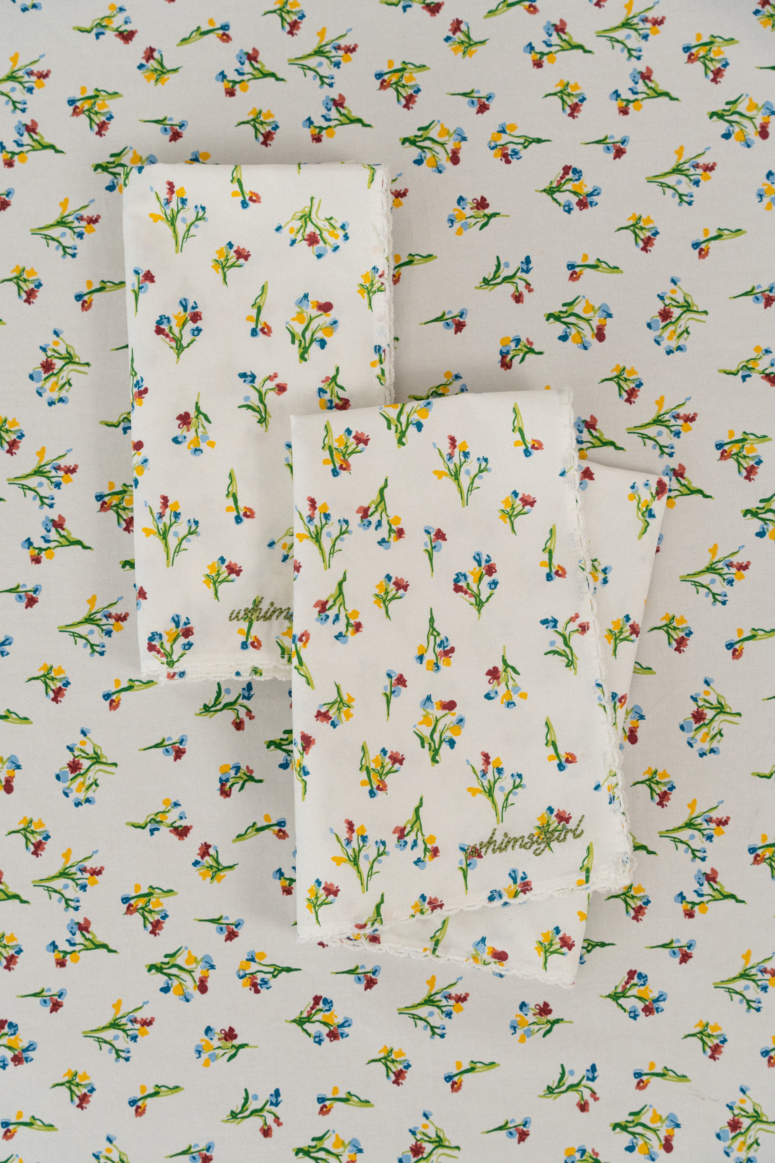 Square shaped napkins that feature a Whimsigirl original floral print and signature trimmings. Rendered in cotton, and finished with our embroidered logo in the corner. Sold in packs of two.
