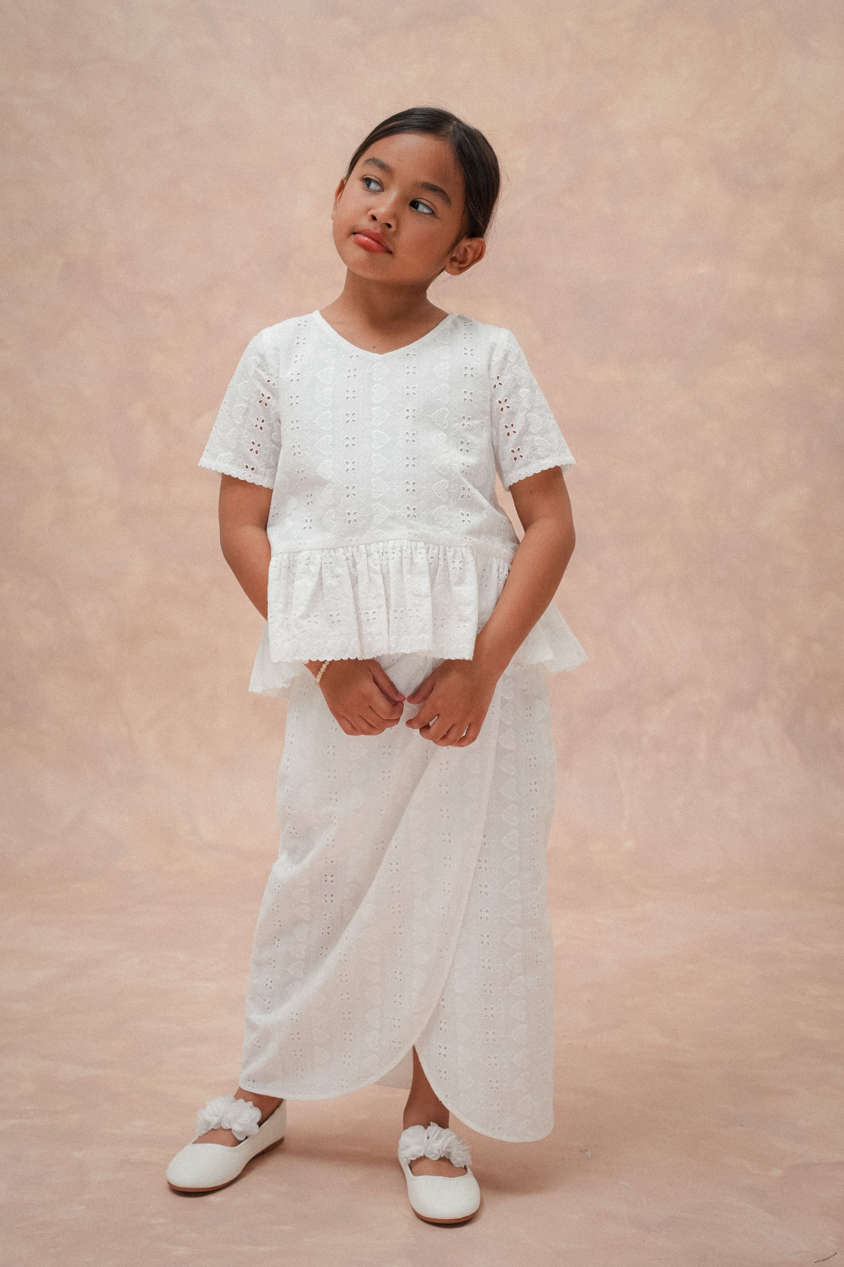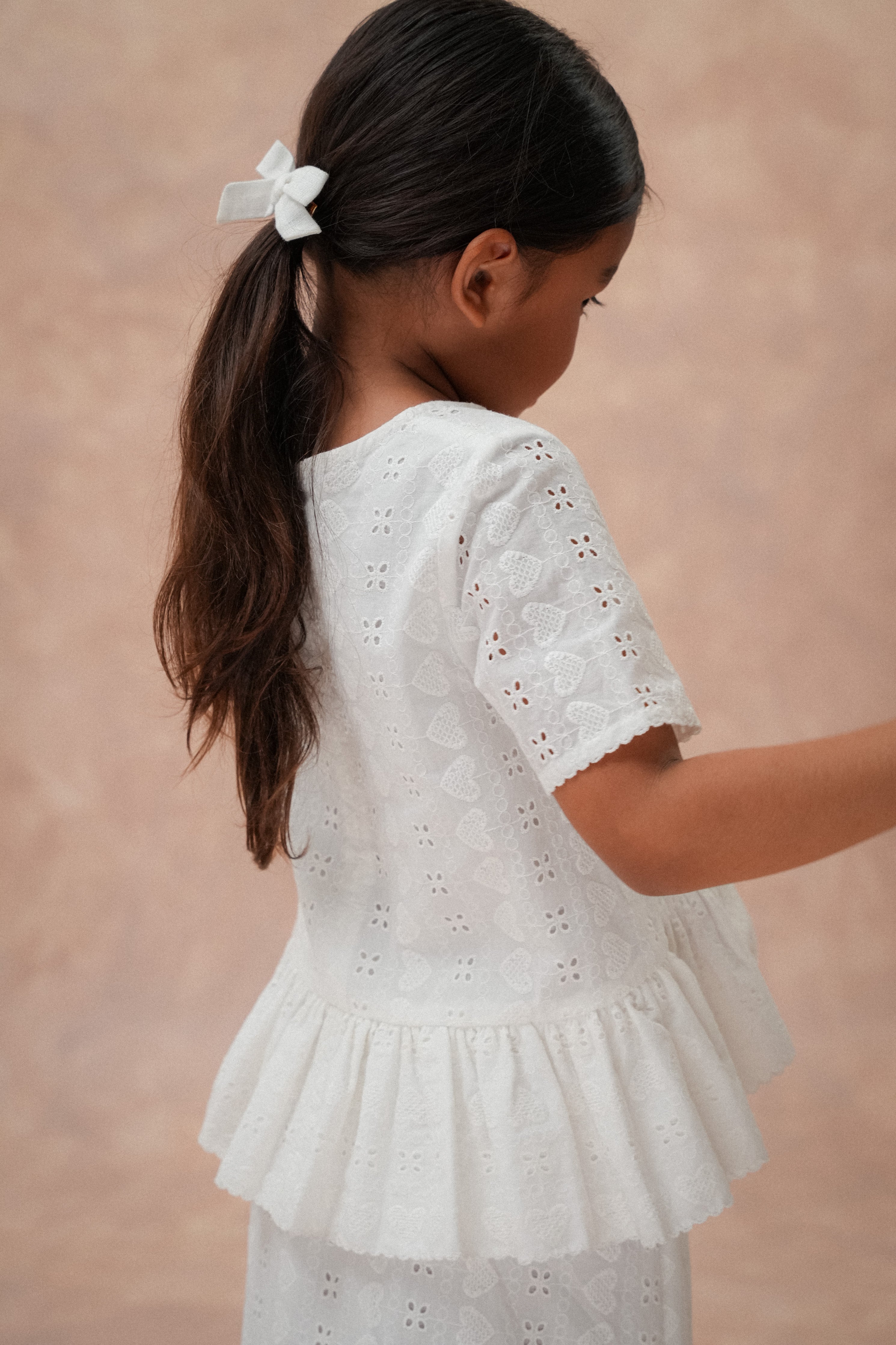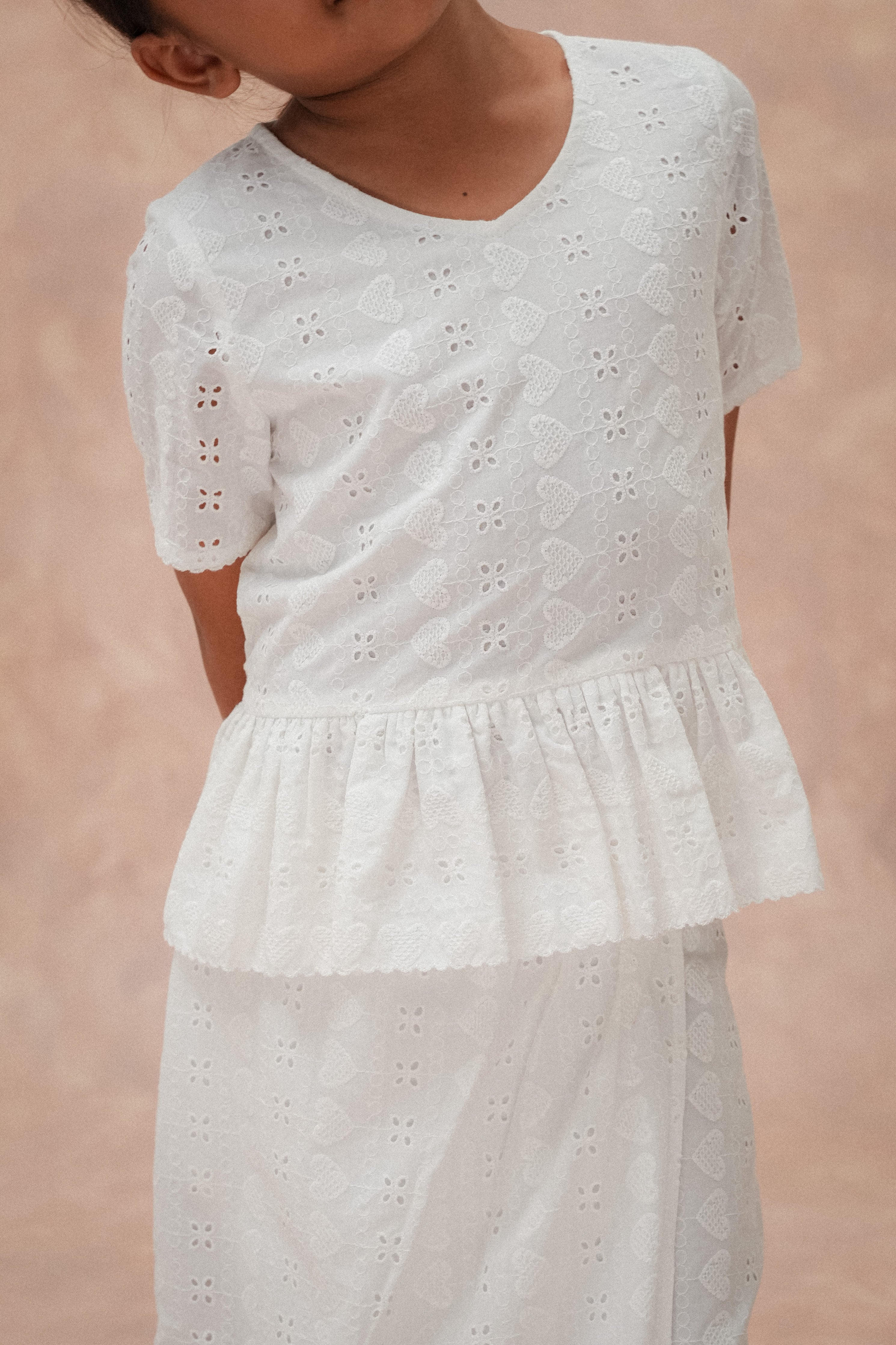 A minimalist moment for the Mini one, made from 100% cotton with textured patterns. The blouse features a flounce at the hem, and zip opening in the back. Includes a matching tulip skirt with half elastic waistband, for easy slip on.