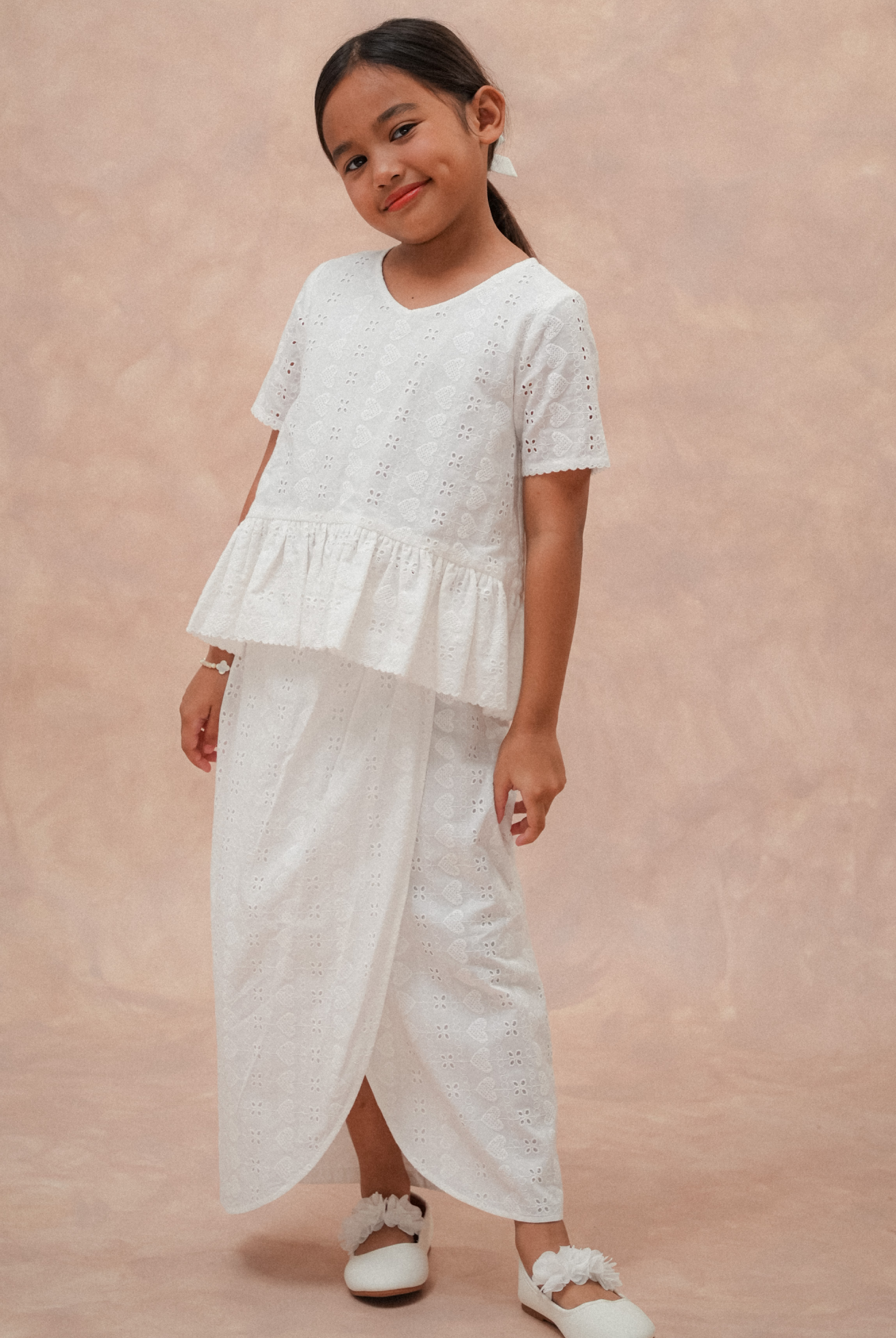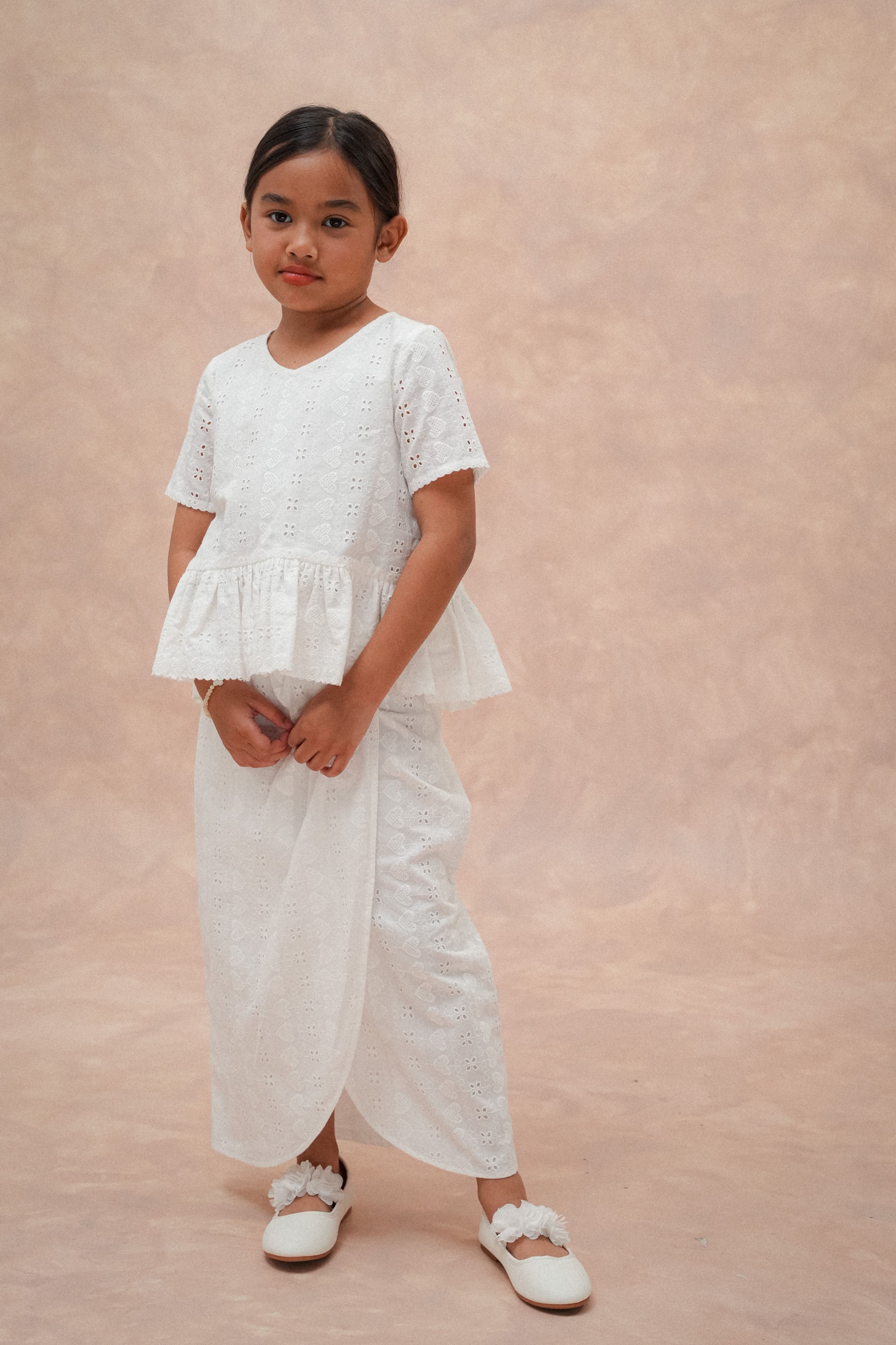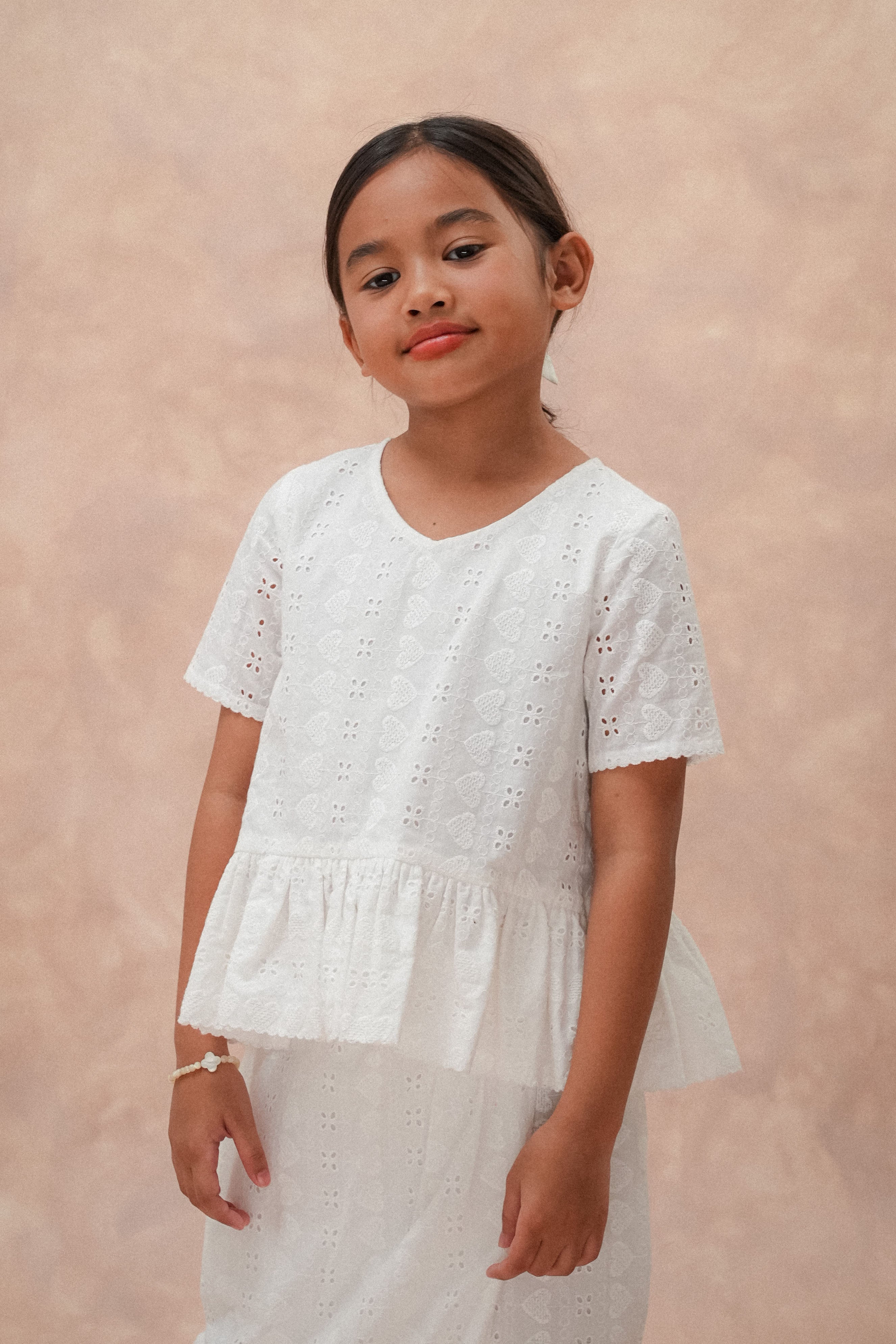 A minimalist moment for the Mini one, made from 100% cotton with textured patterns. The blouse features a flounce at the hem, and zip opening in the back. Includes a matching tulip skirt with half elastic waistband, for easy slip on.