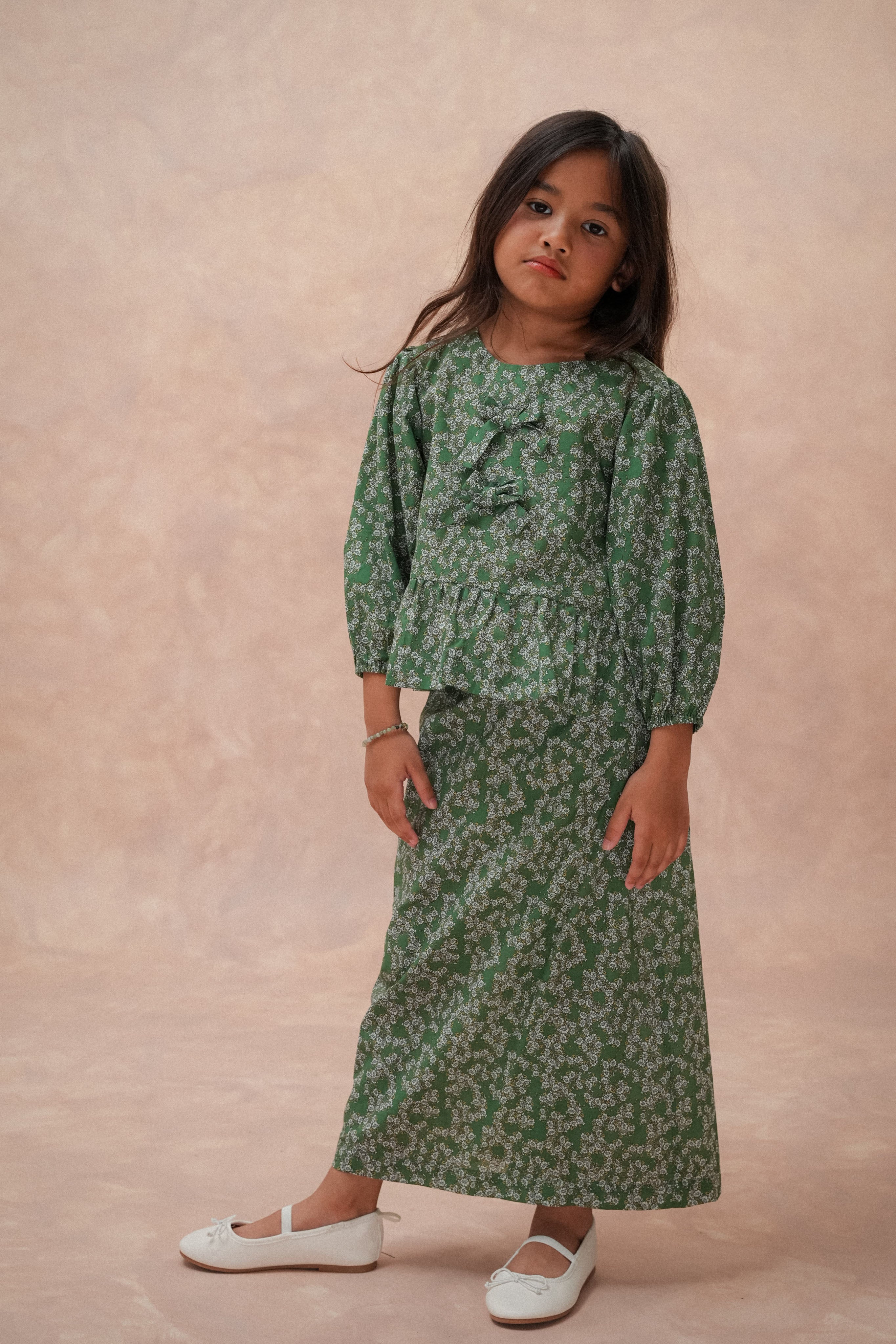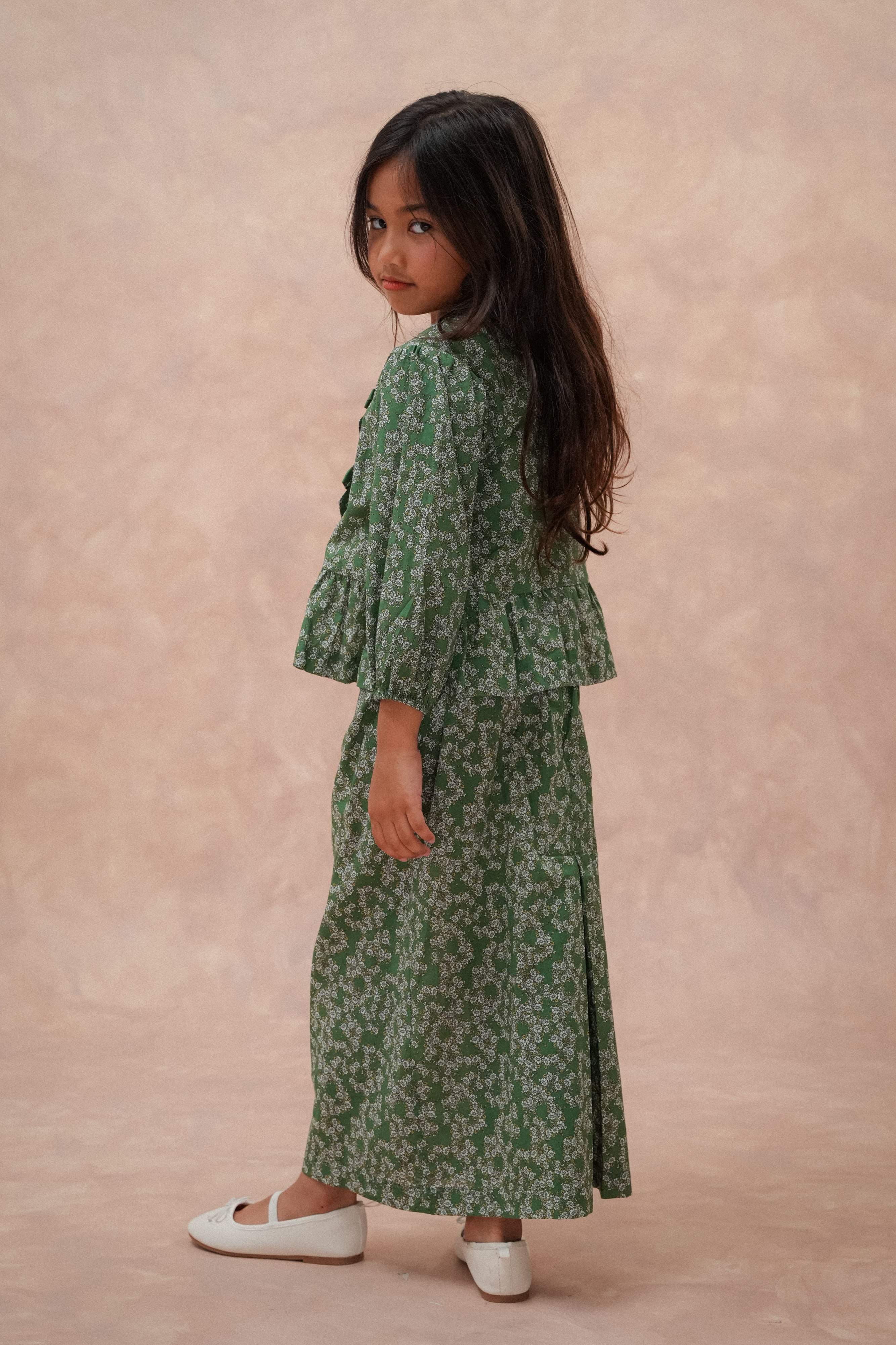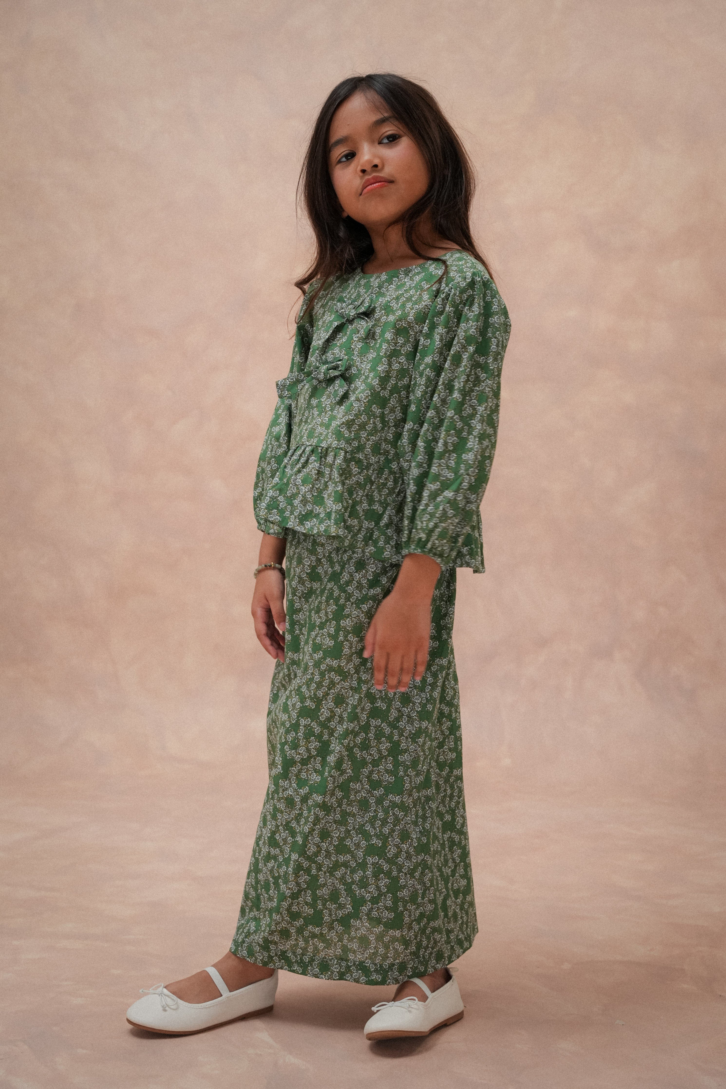 A redux of our beloved Painter’s Bow Blouse, now comes in a printed set and for the Mini one. Features playful bows, and flounce at the hem of the top. With full sleeves and a zip opening in the back, the set comes with a matching back-pleated skirt for easy movement.