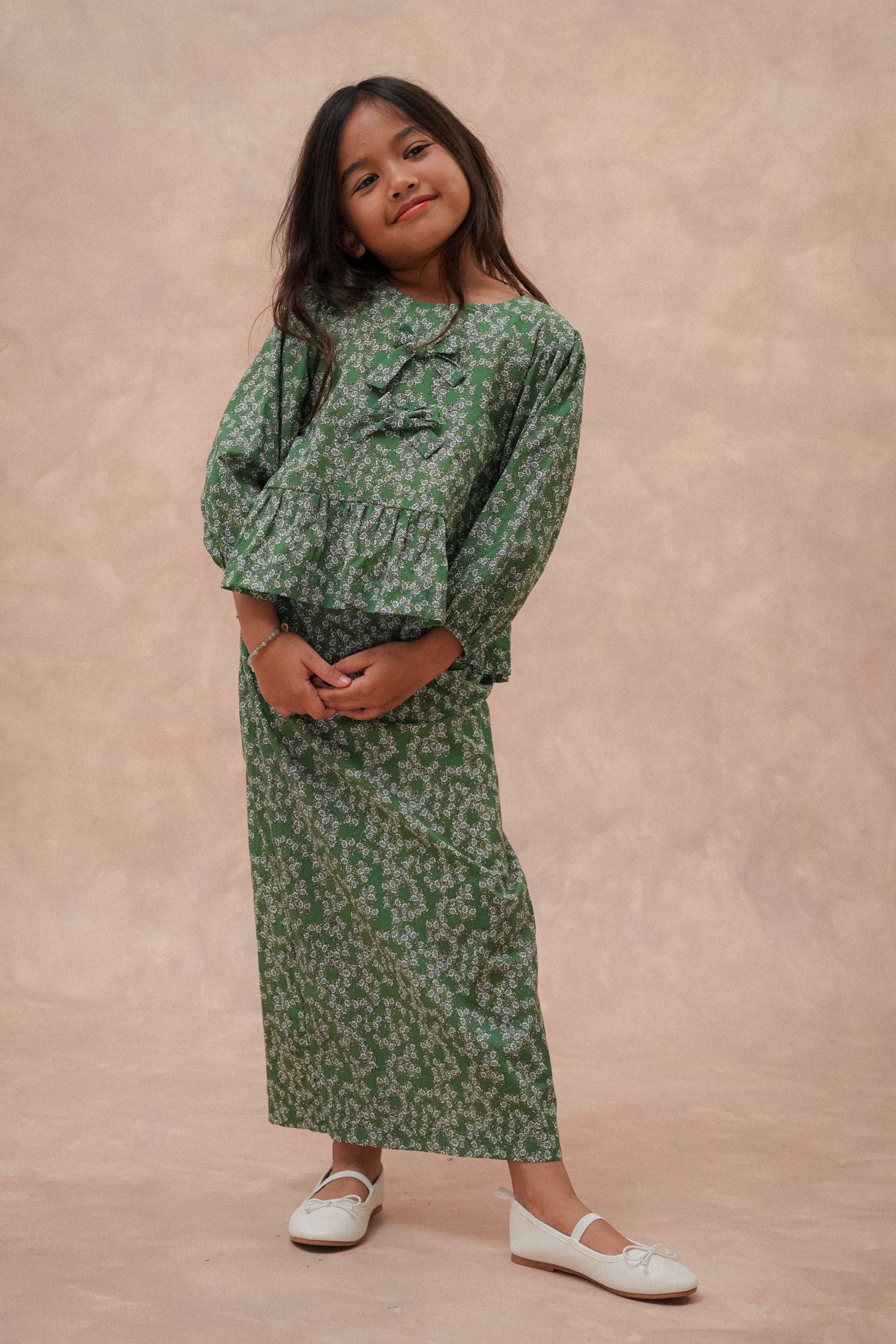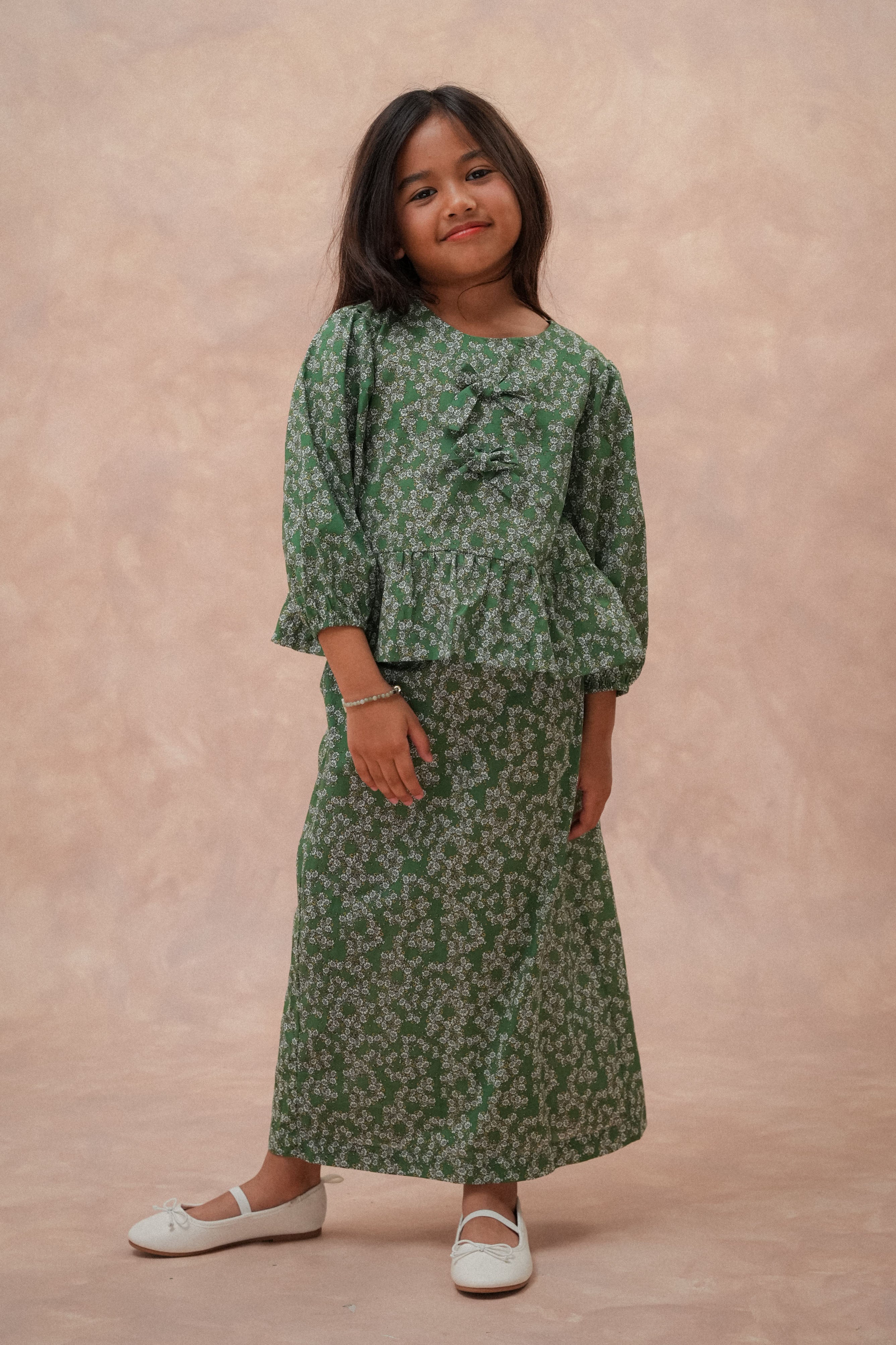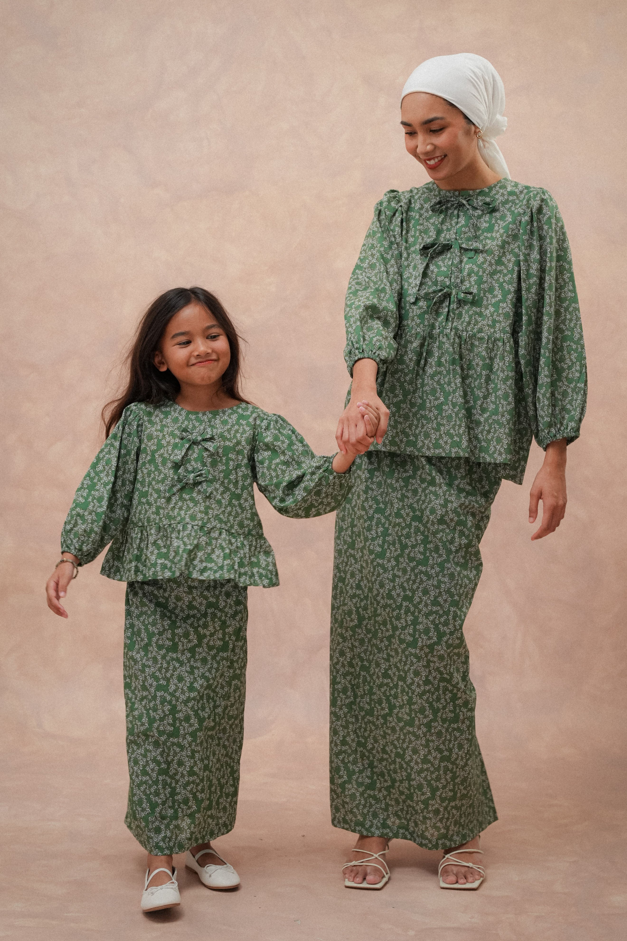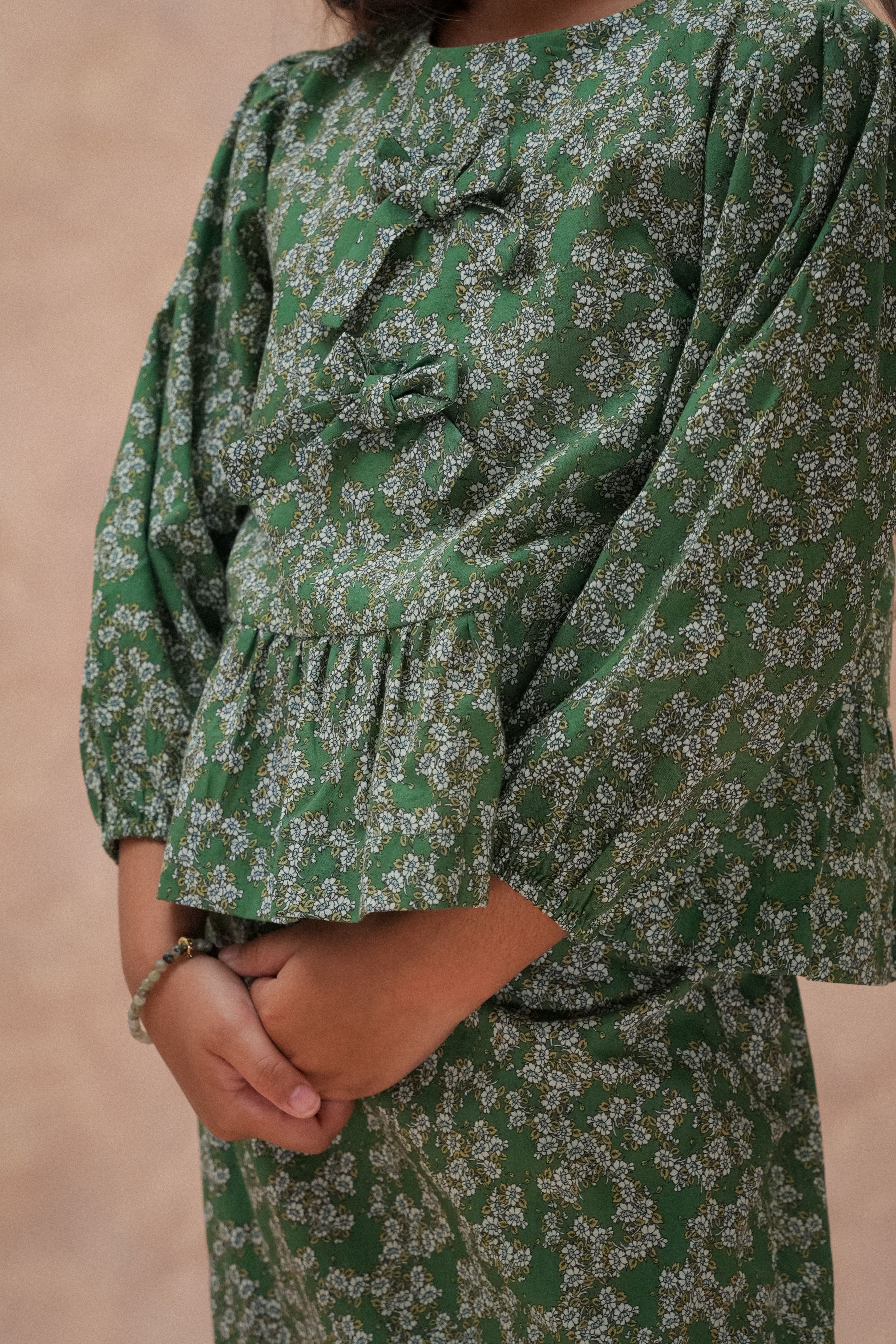A redux of our beloved Painter’s Bow Blouse, now comes in a printed set and for the Mini one. Features playful bows, and flounce at the hem of the top. With full sleeves and a zip opening in the back, the set comes with a matching back-pleated skirt for easy movement.