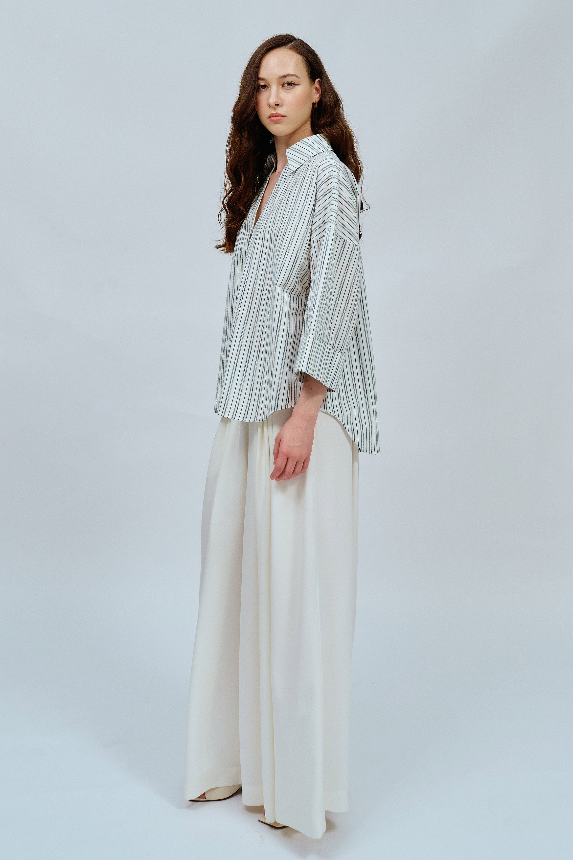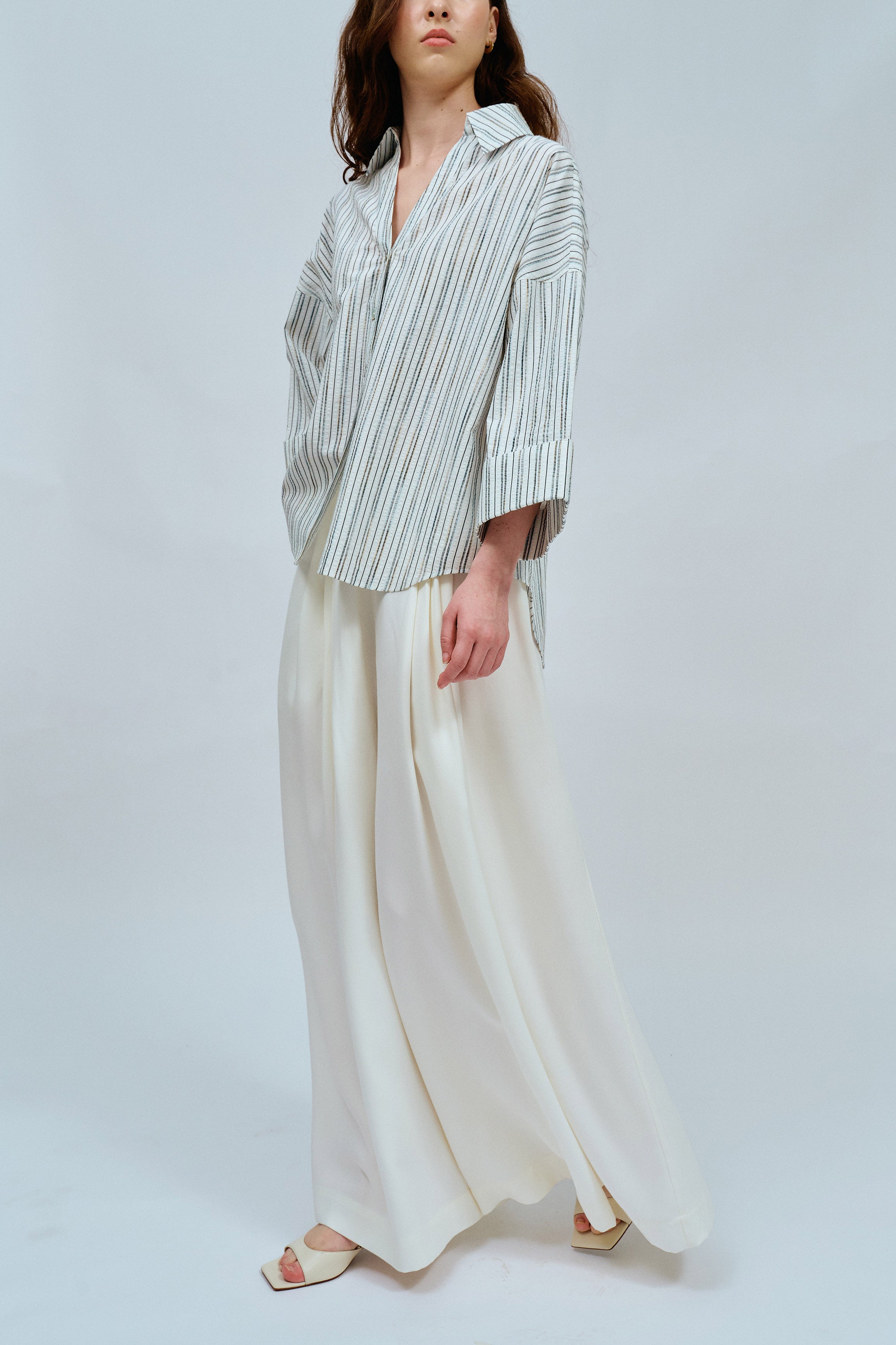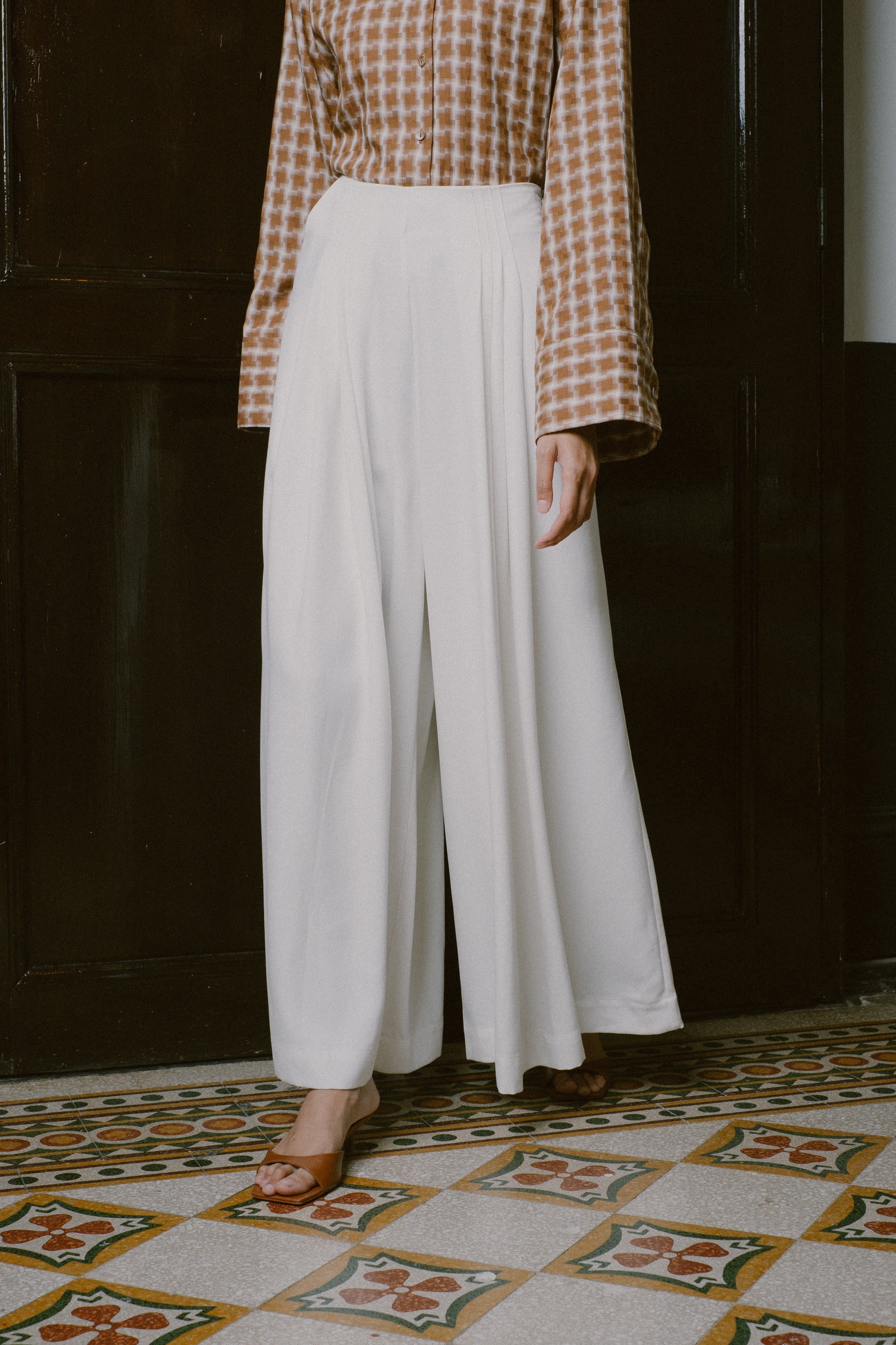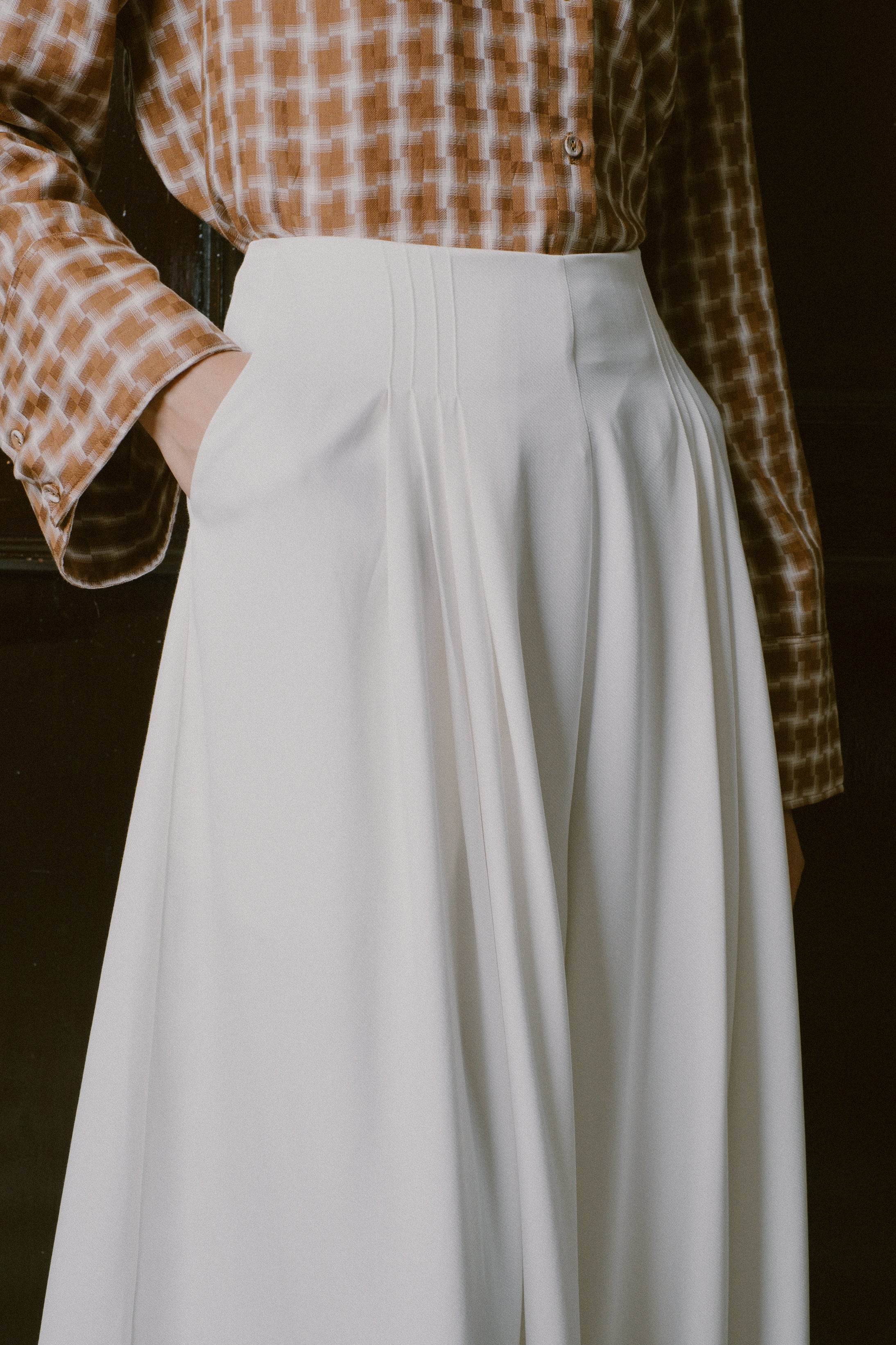 Cut with a wide flare and front tucks for sculptural drape. Features a clean side zip, single pocket and a structured waistband for a polished finish.