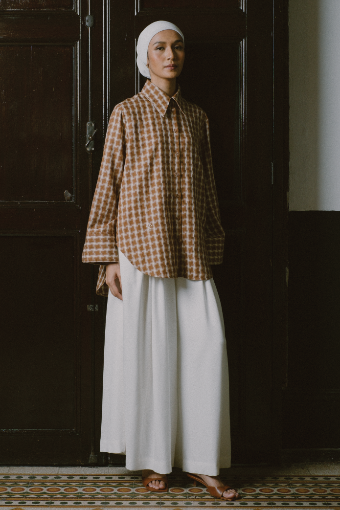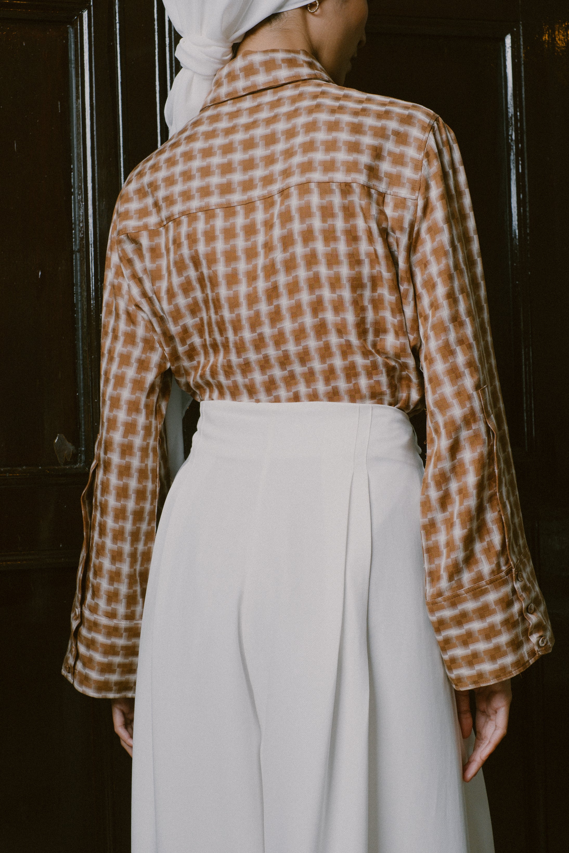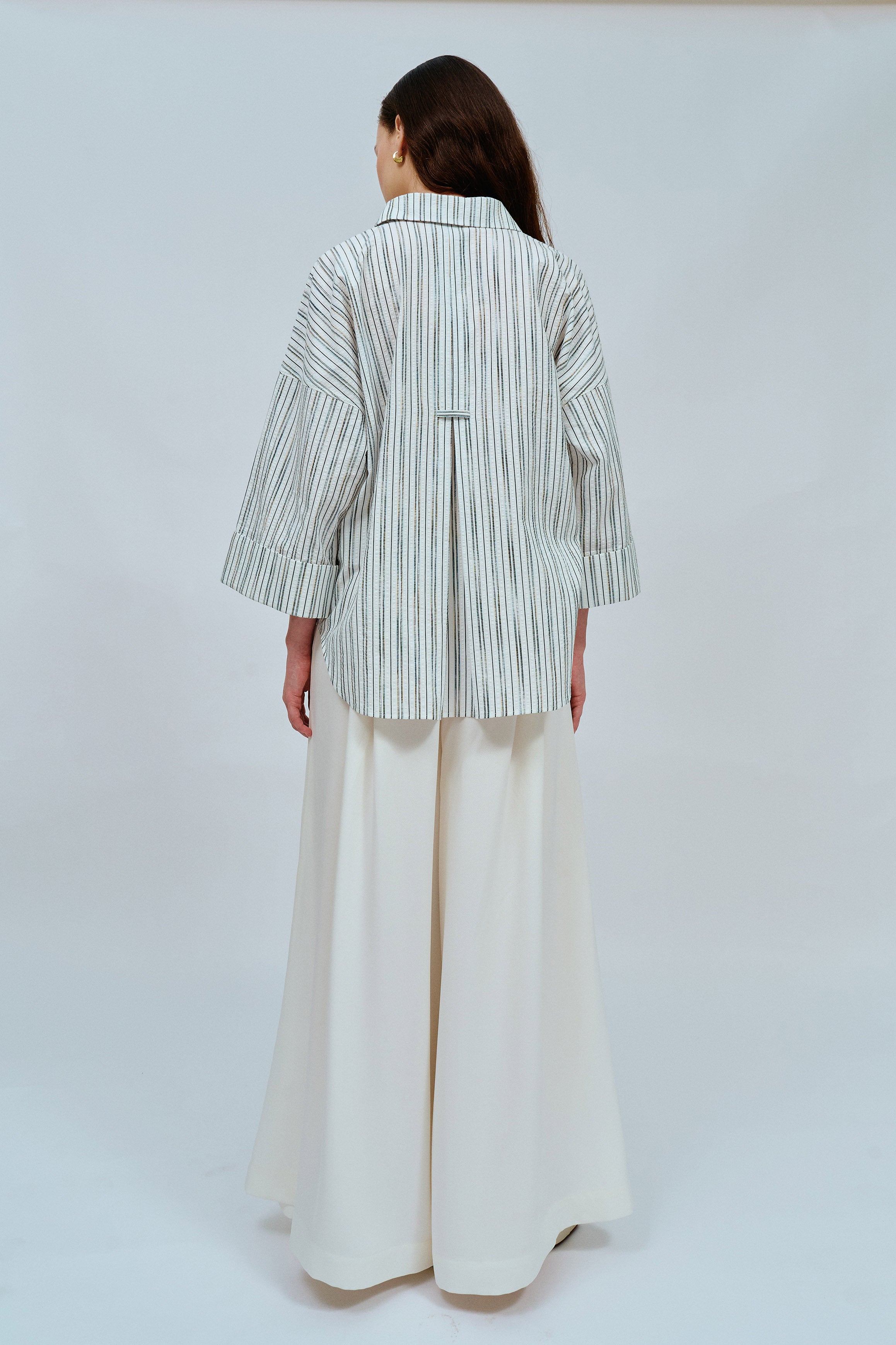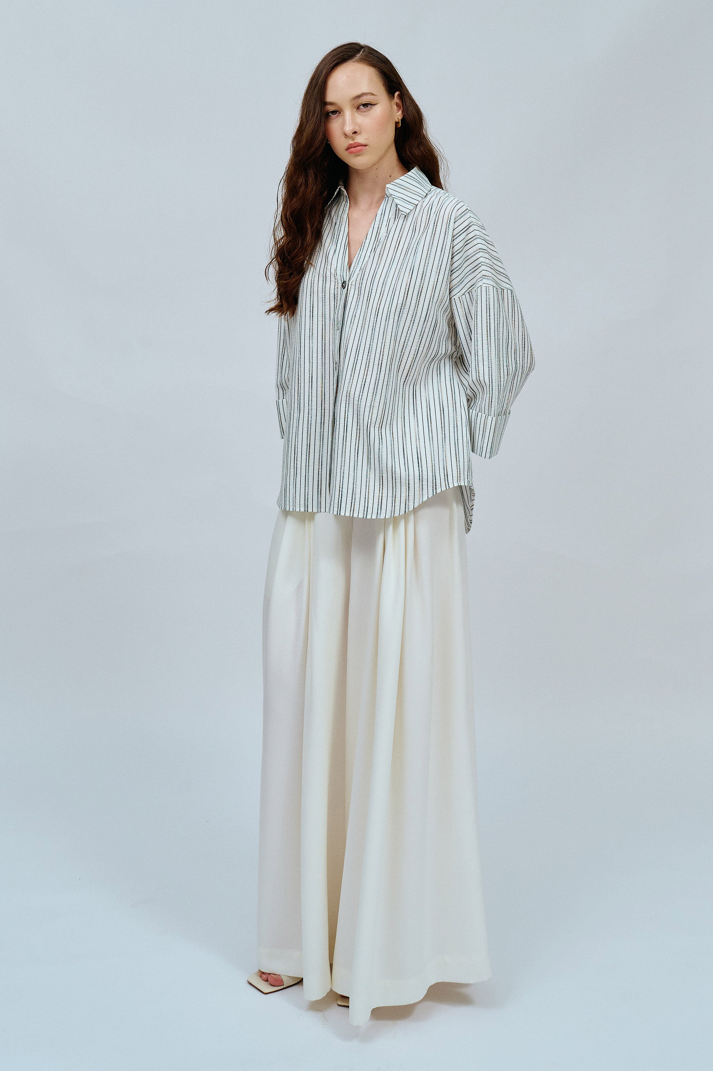 Cut with a wide flare and front tucks for sculptural drape. Features a clean side zip, single pocket and a structured waistband for a polished finish.