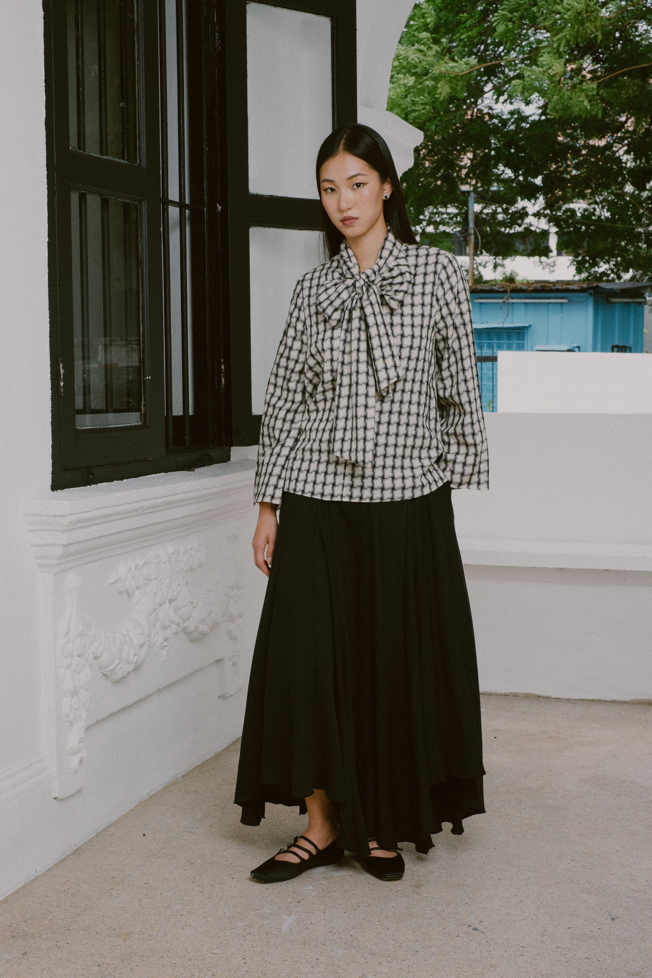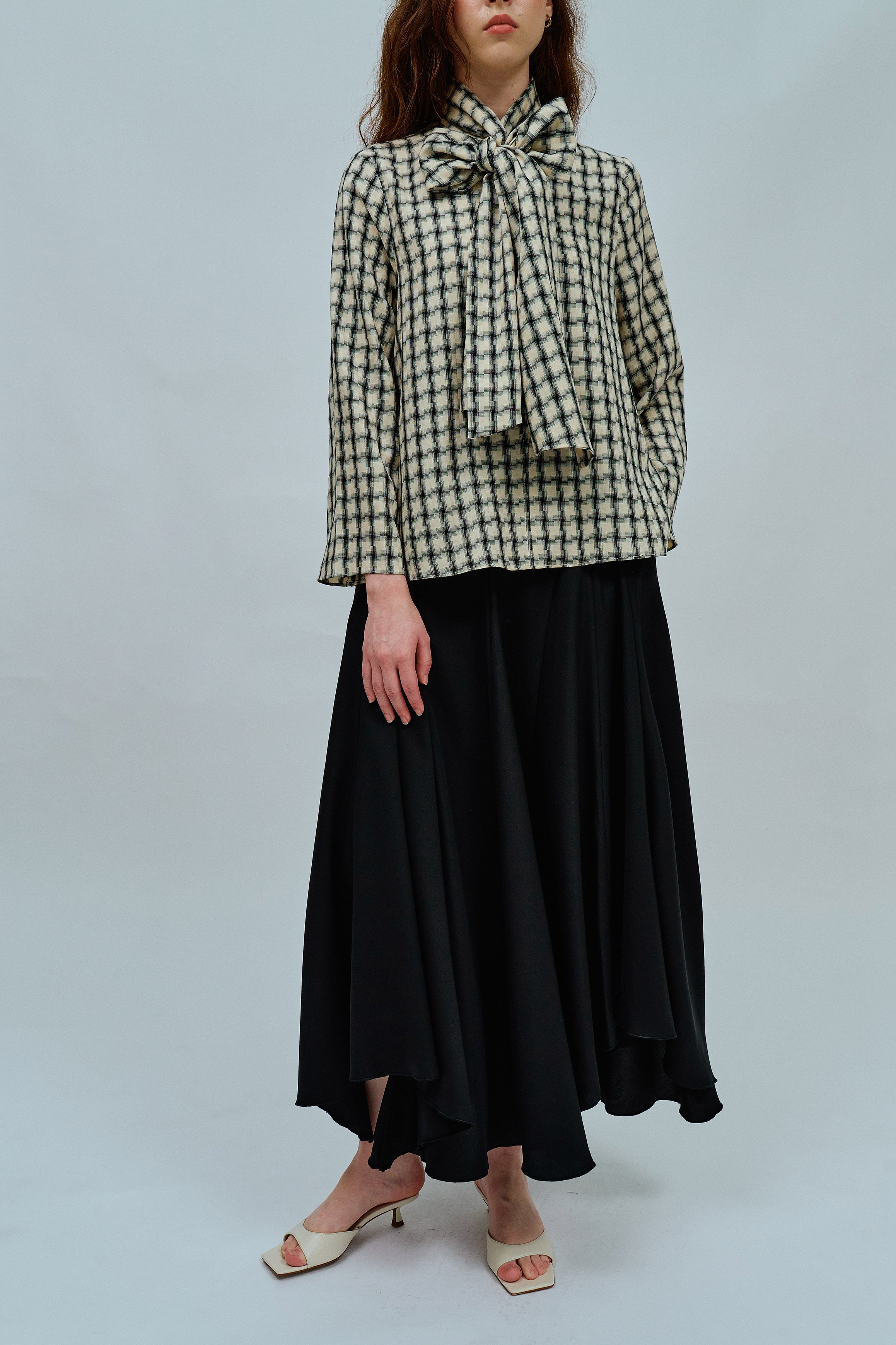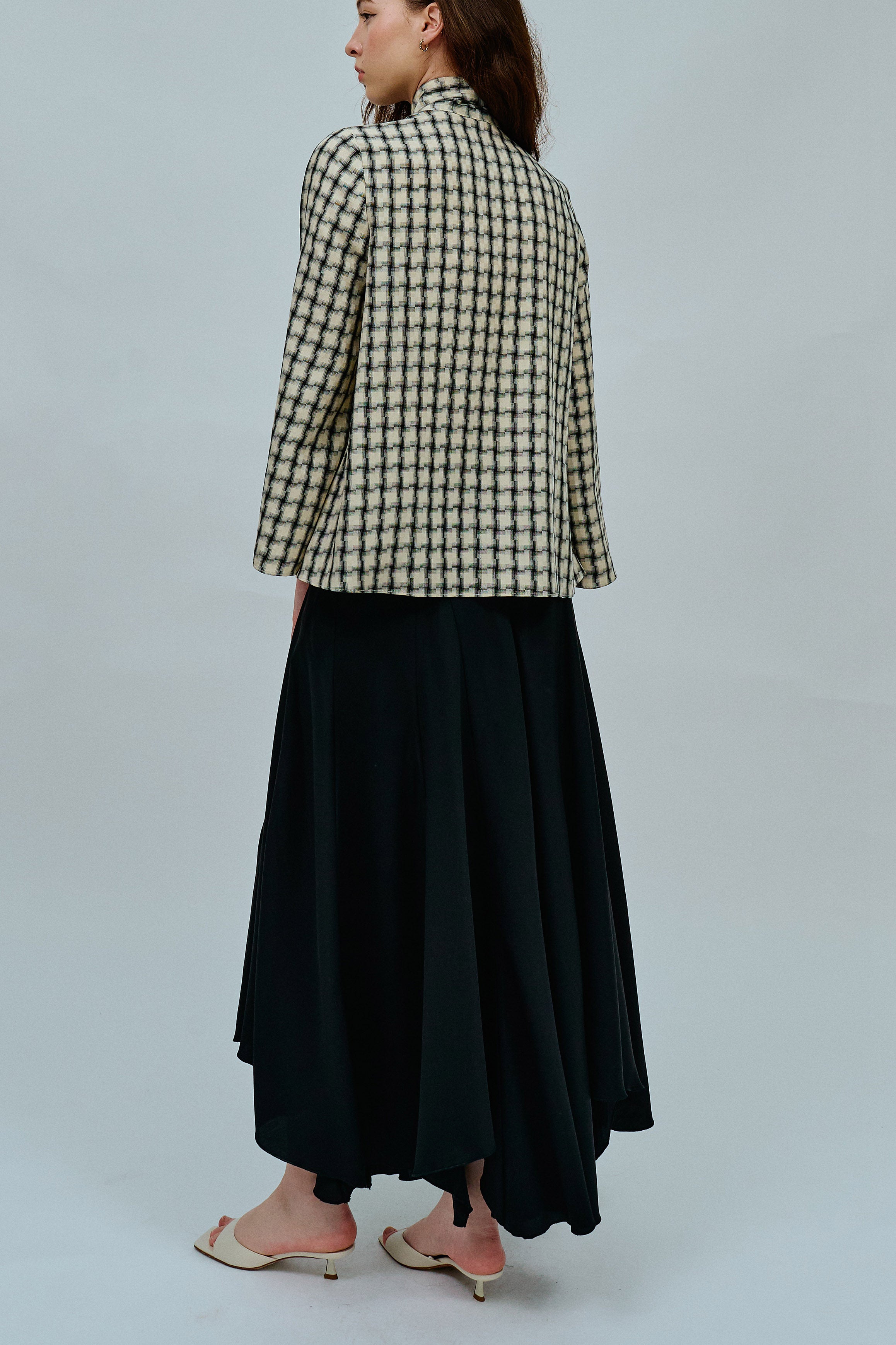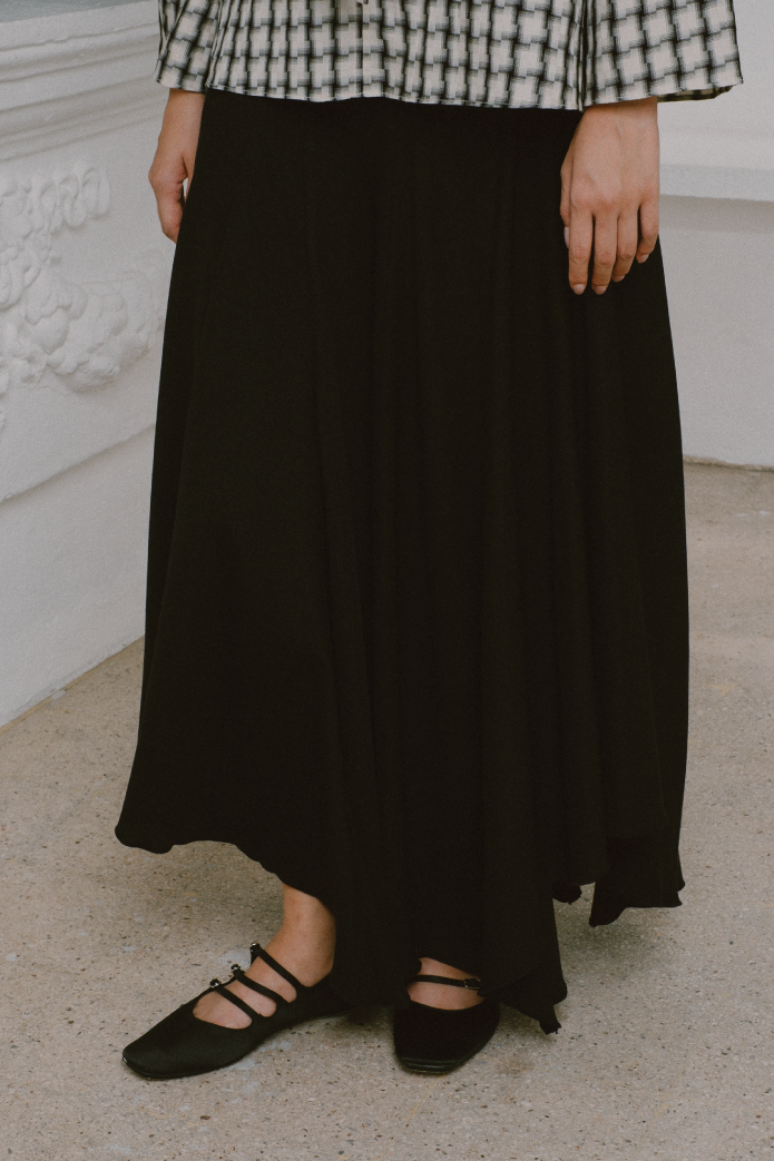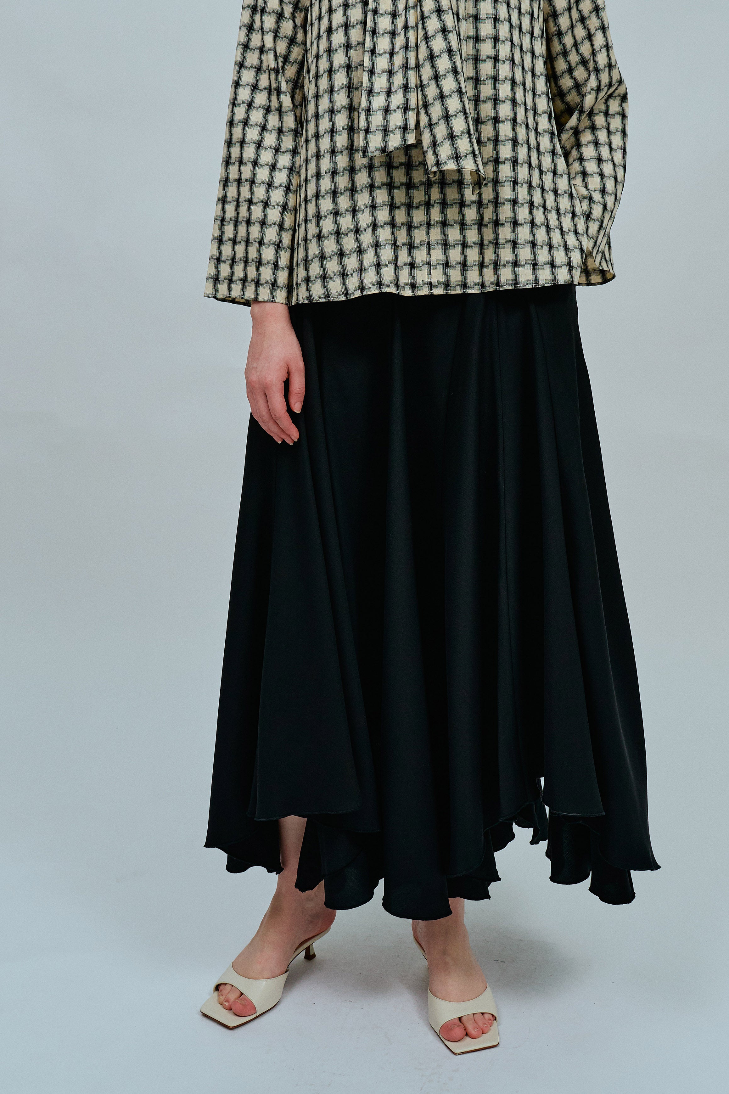 An easy-flowing midi skirt with an asymmetric hem. Finished with side pockets and a back zip closure.