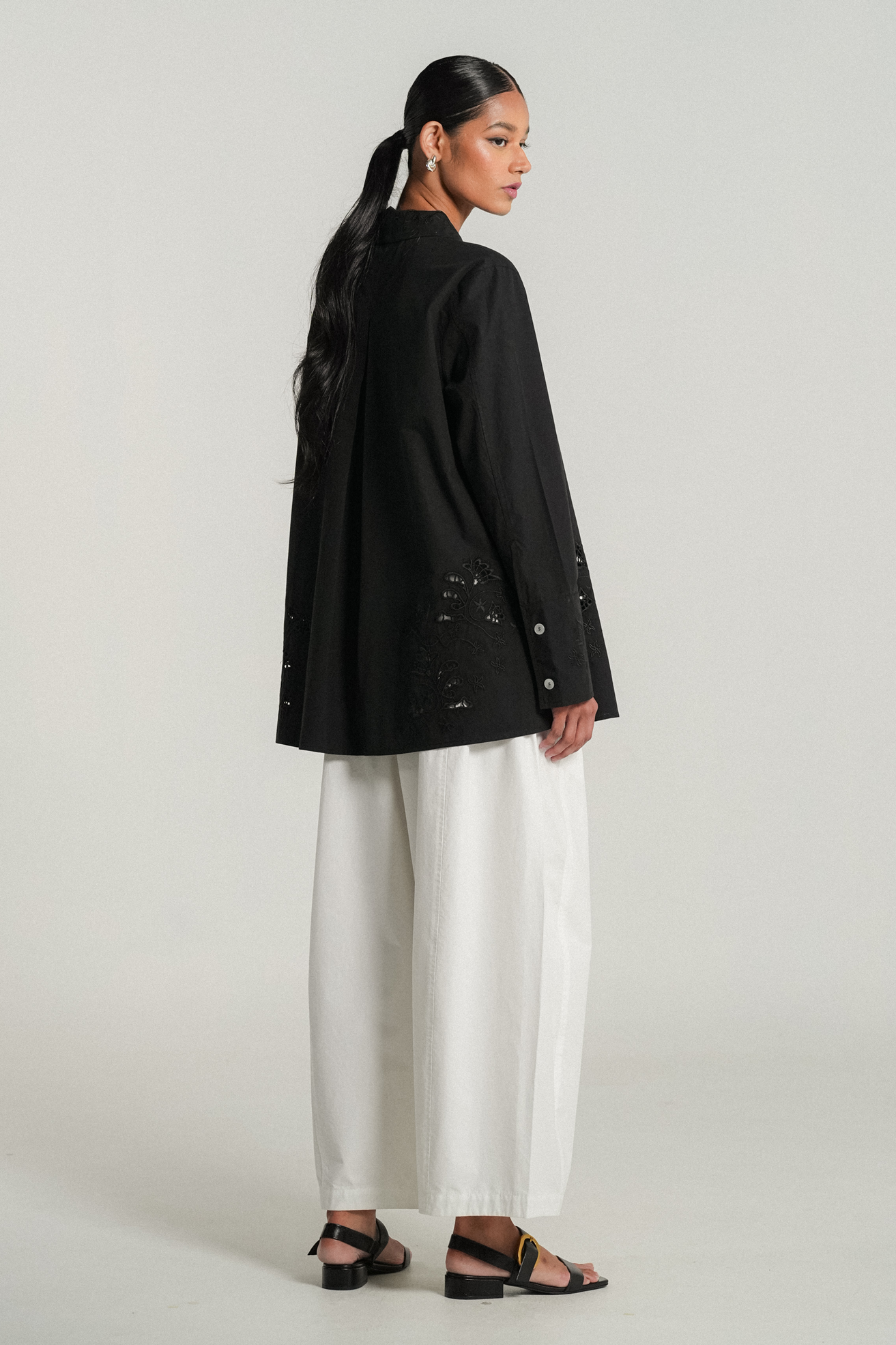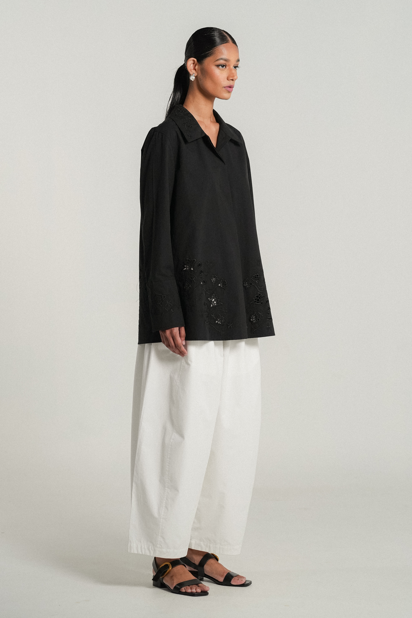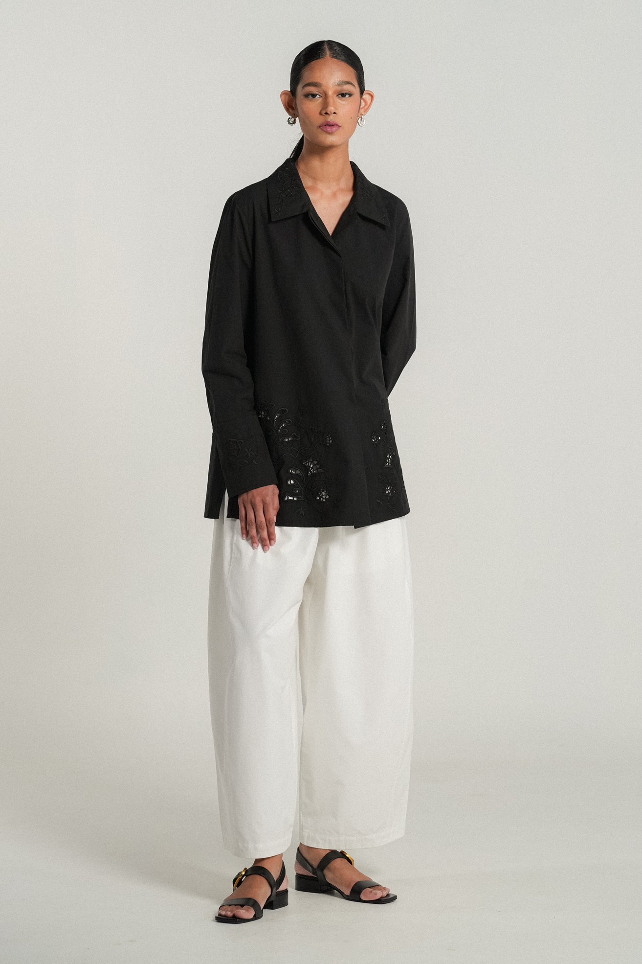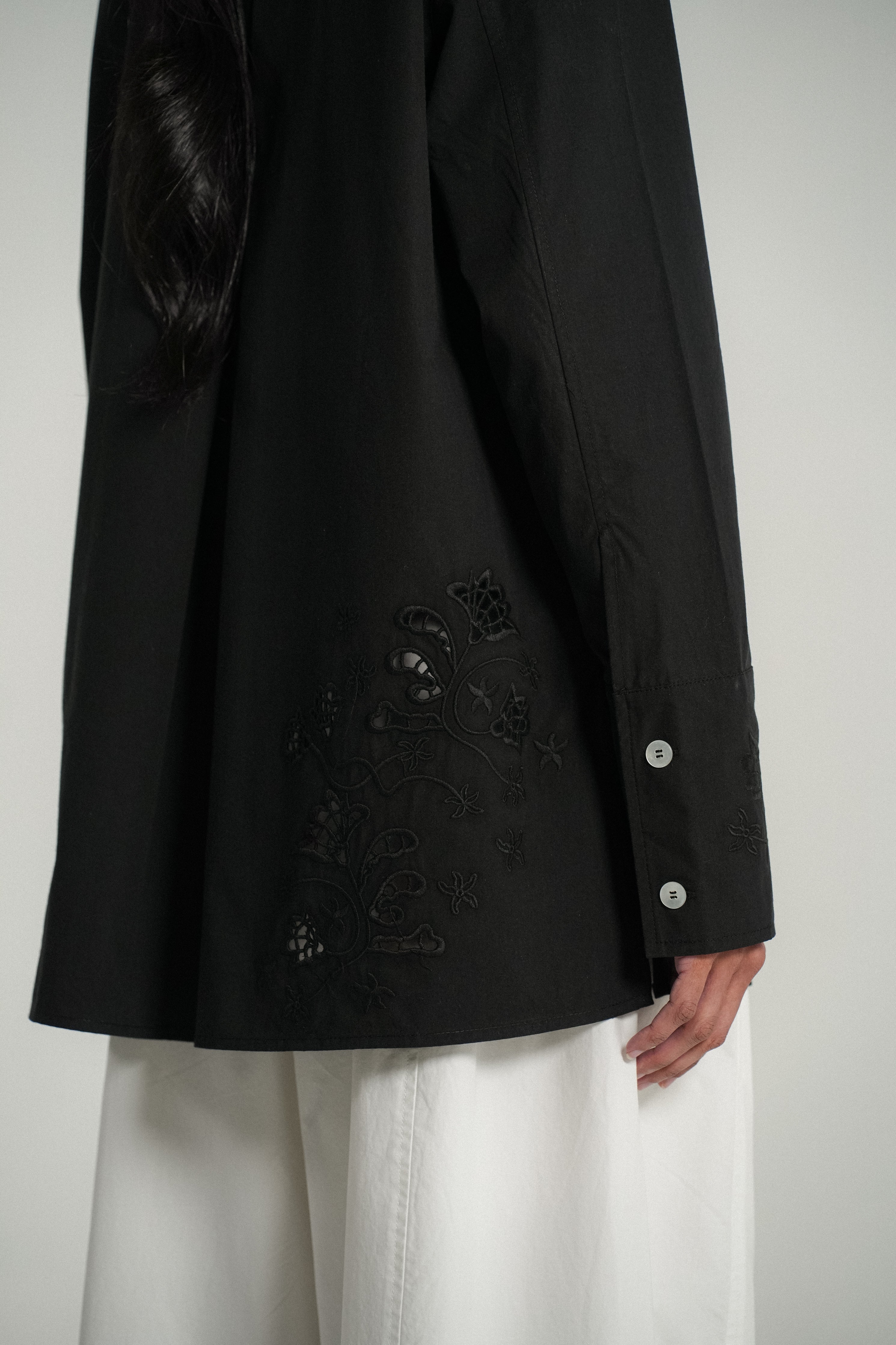 A crisp shirt, rendered in cotton. A relaxed fit with side slits that features delicate flower embroidery on the pointed collar. Intricate eyelet embroidery both front and back, finished with embroidered cuffs on slim-cut sleeves.