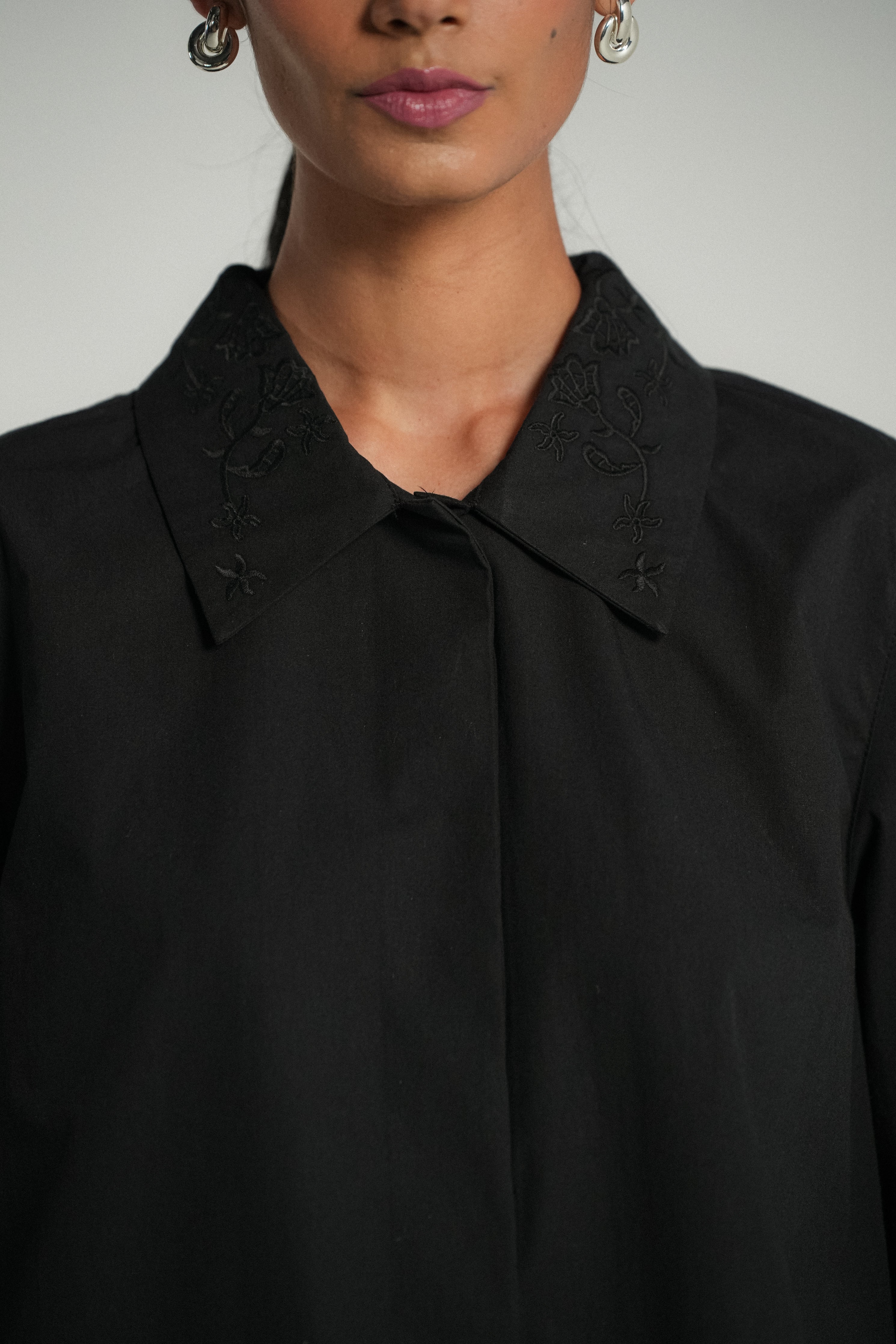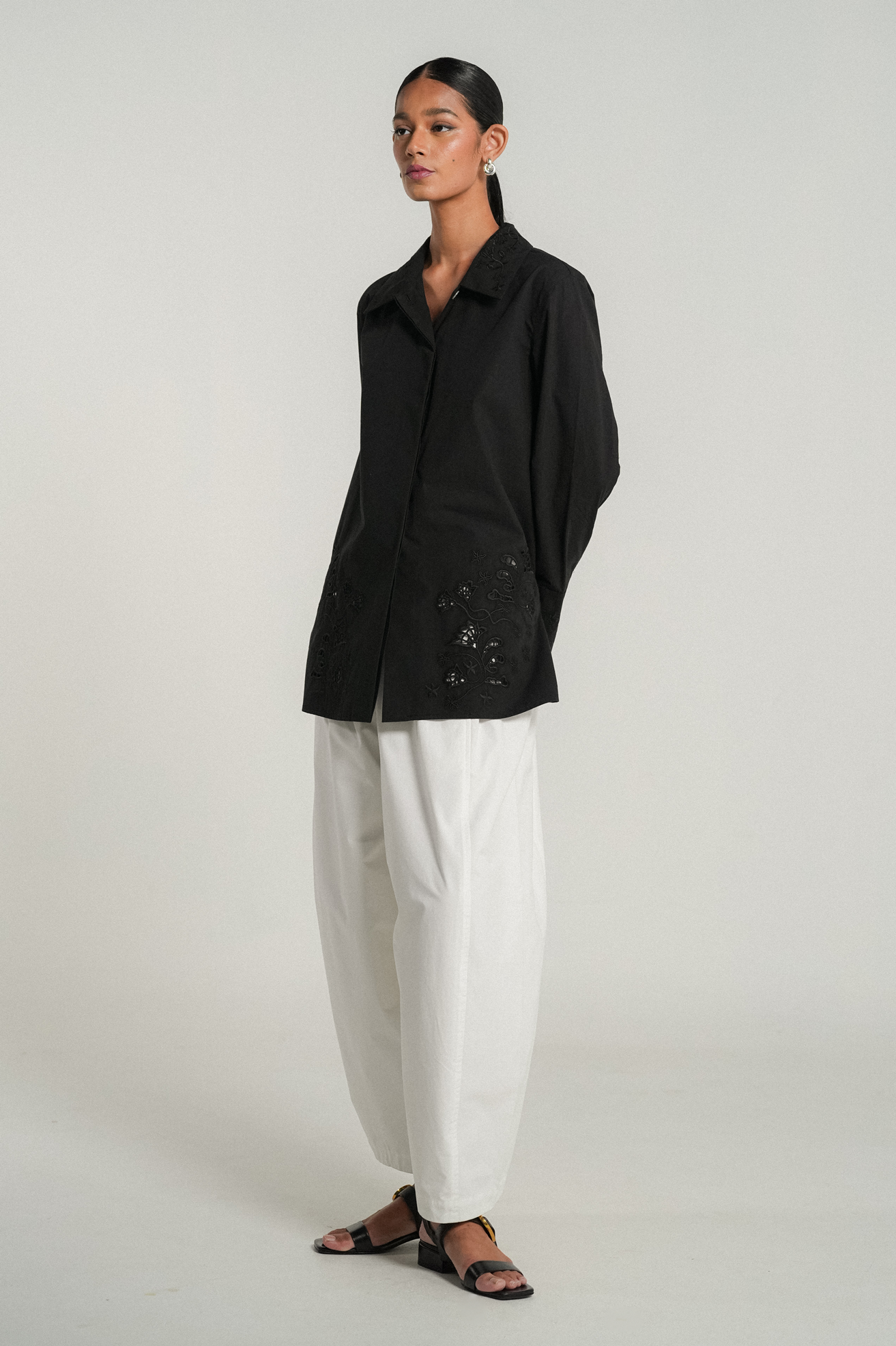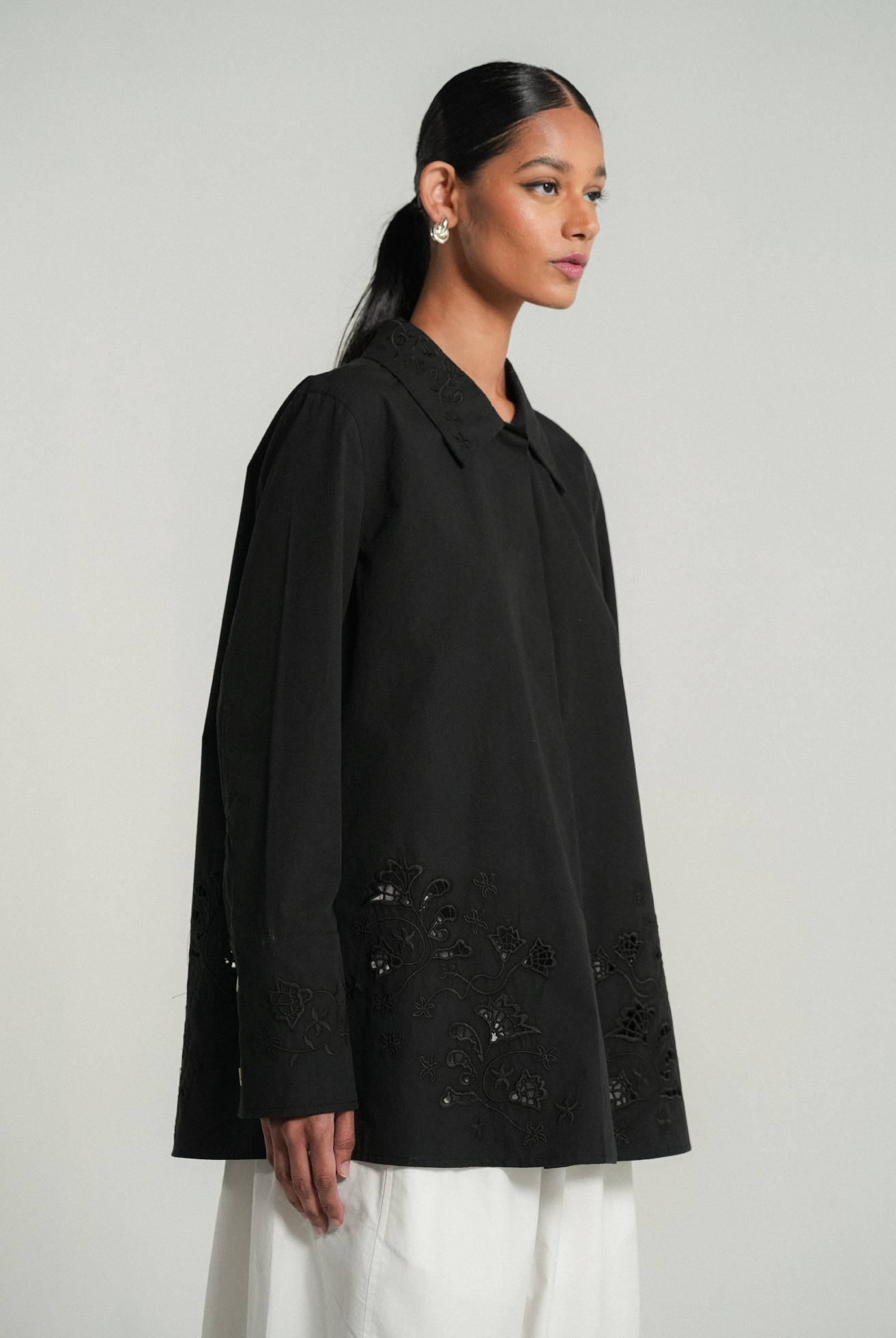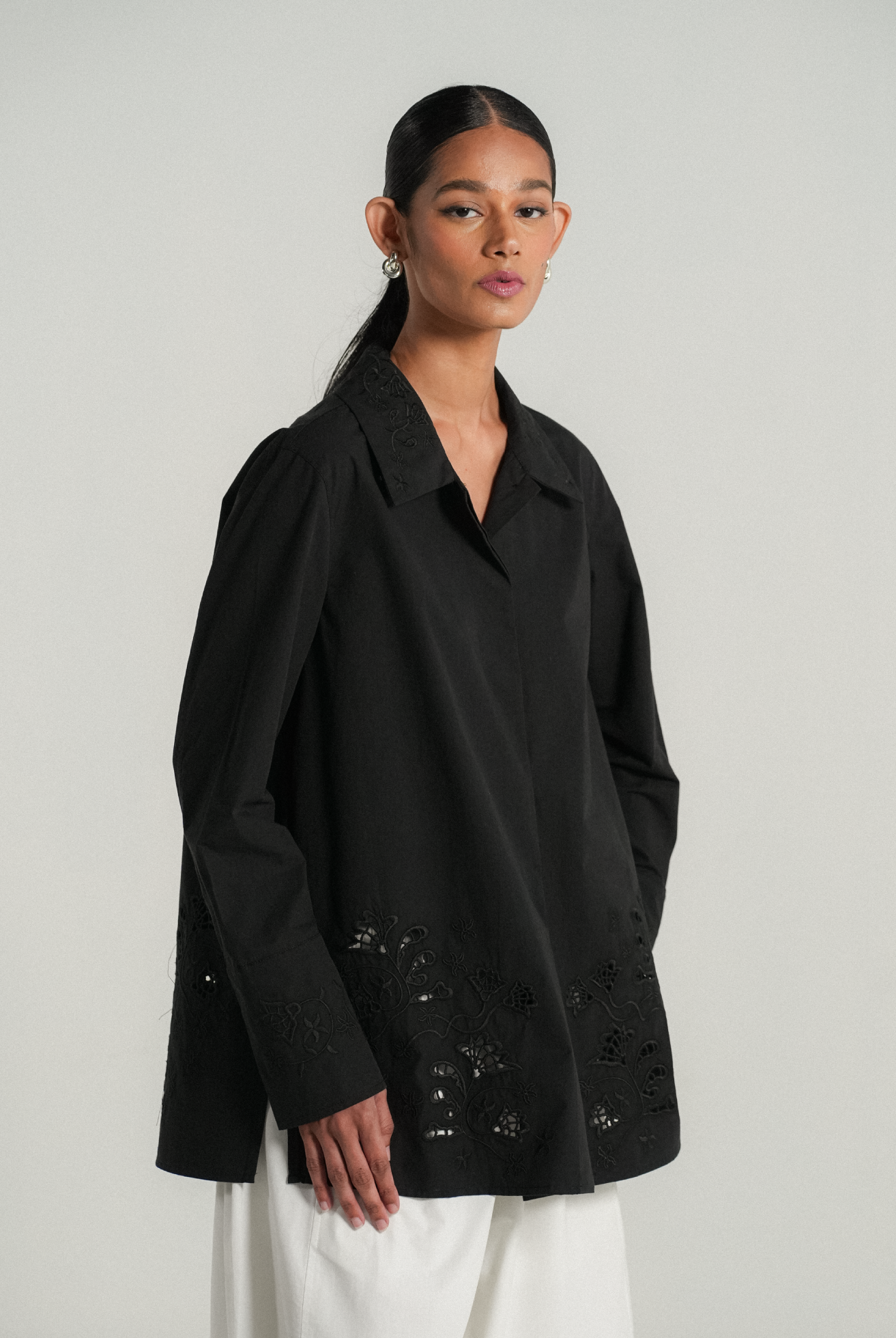 A crisp shirt, rendered in cotton. A relaxed fit with side slits that features delicate flower embroidery on the pointed collar. Intricate eyelet embroidery both front and back, finished with embroidered cuffs on slim-cut sleeves.