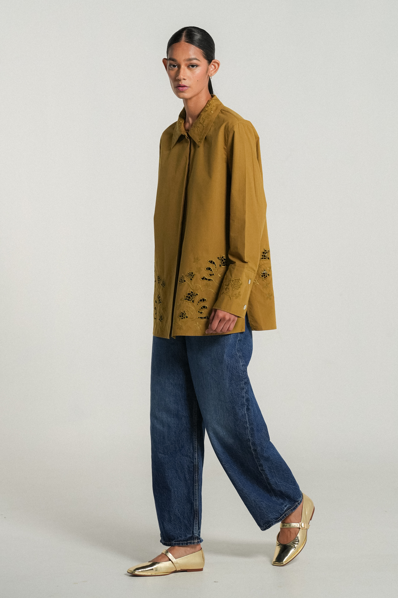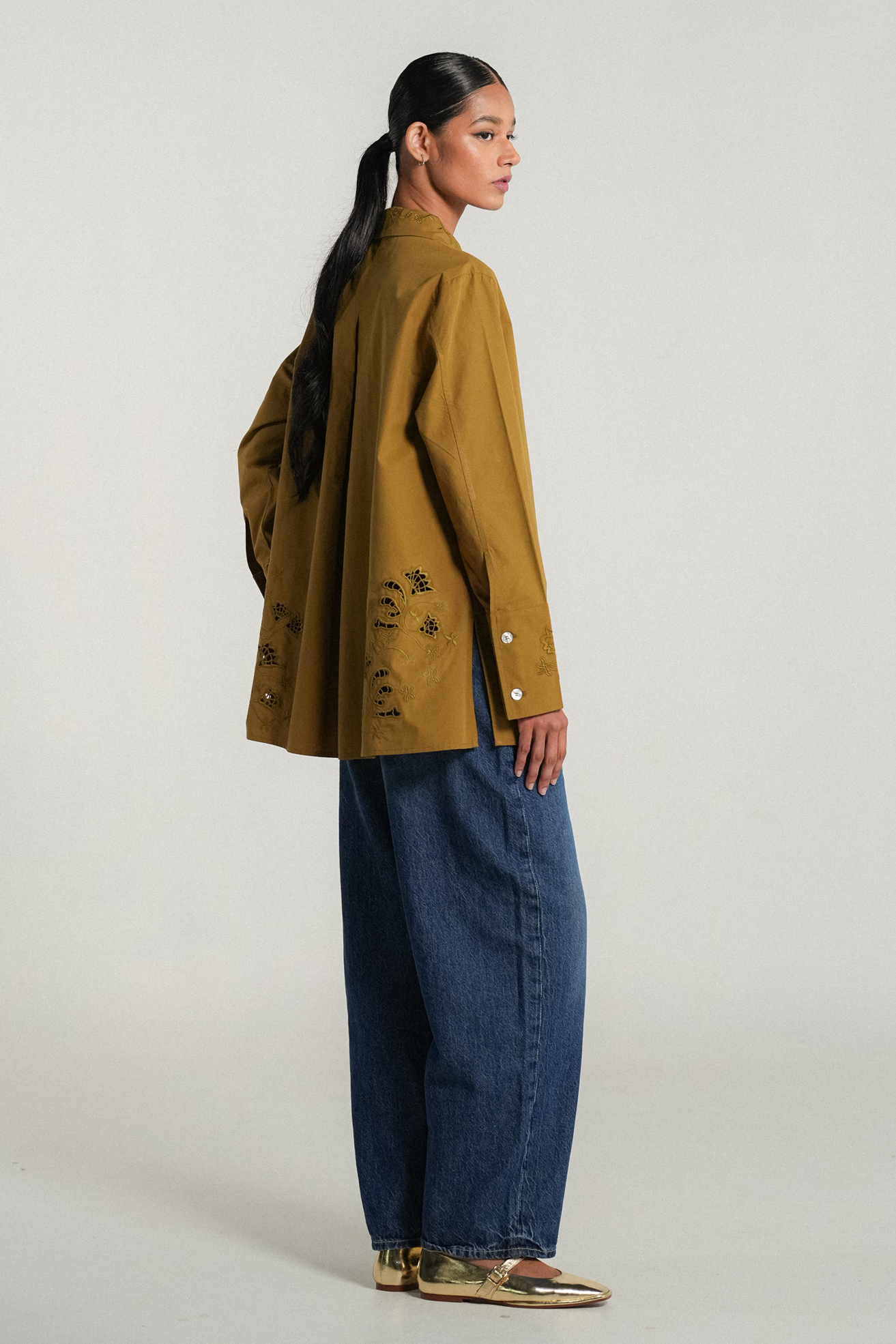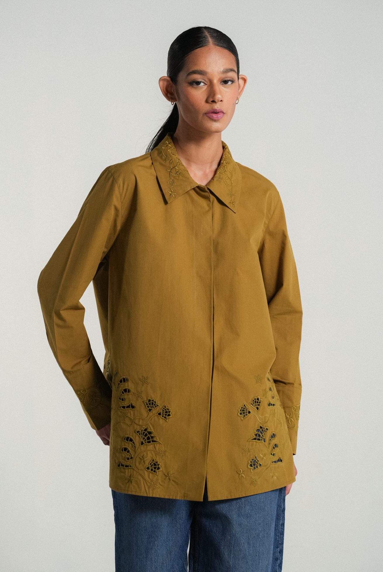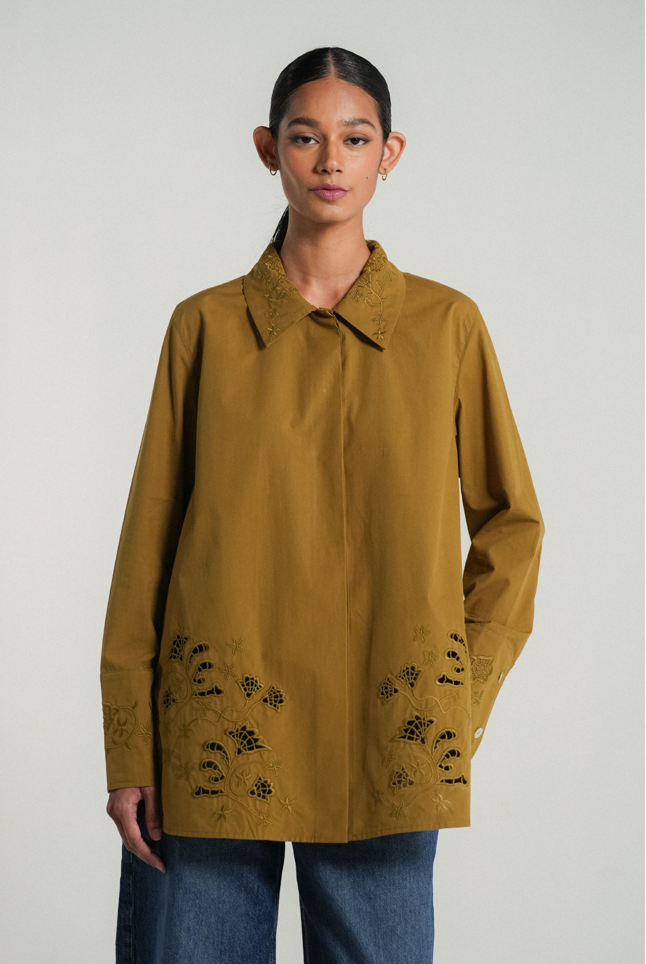 A crisp shirt, rendered in cotton. A relaxed fit with side slits that features delicate flower embroidery on the pointed collar. Intricate eyelet embroidery both front and back, finished with embroidered cuffs on slim-cut sleeves.