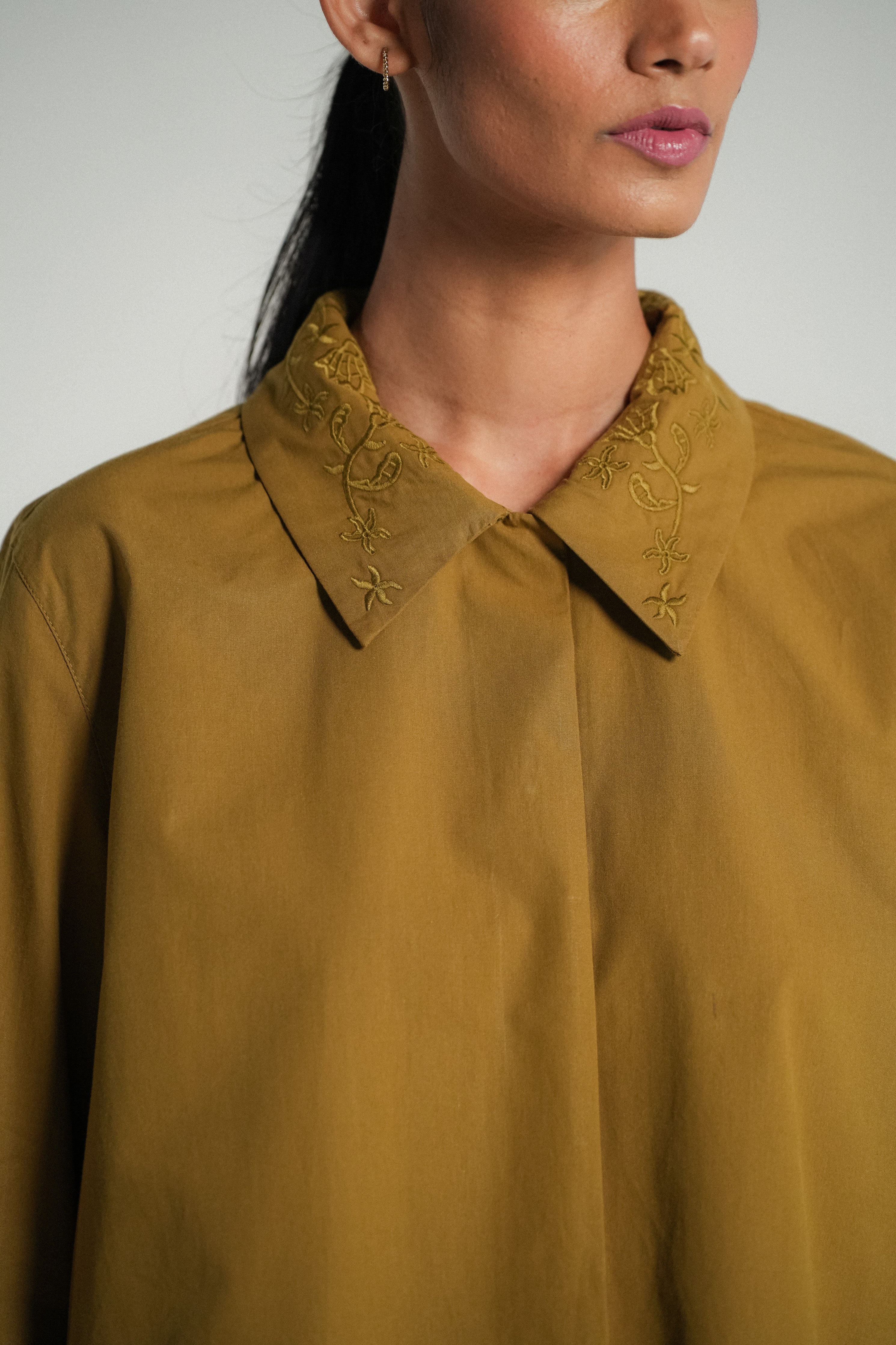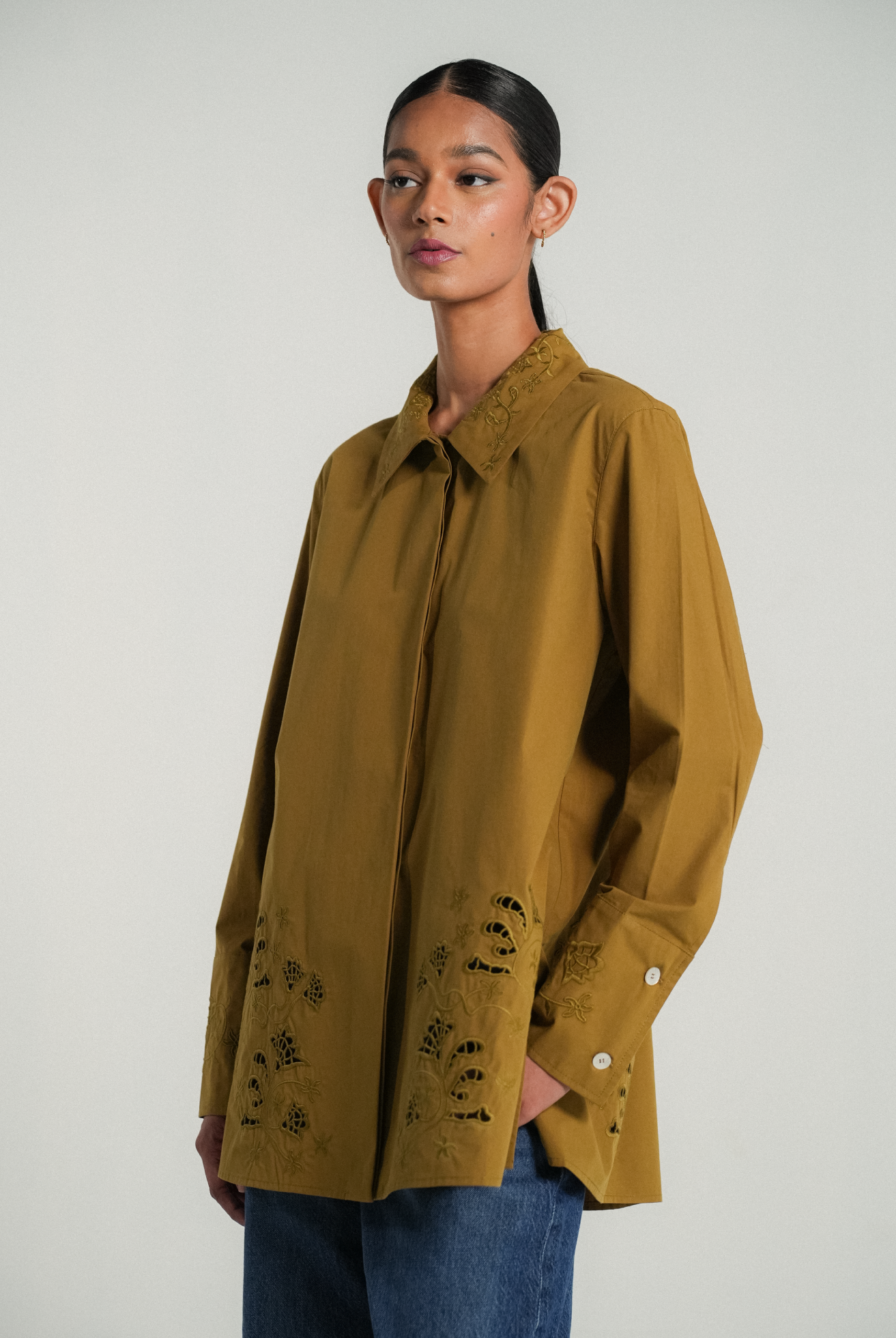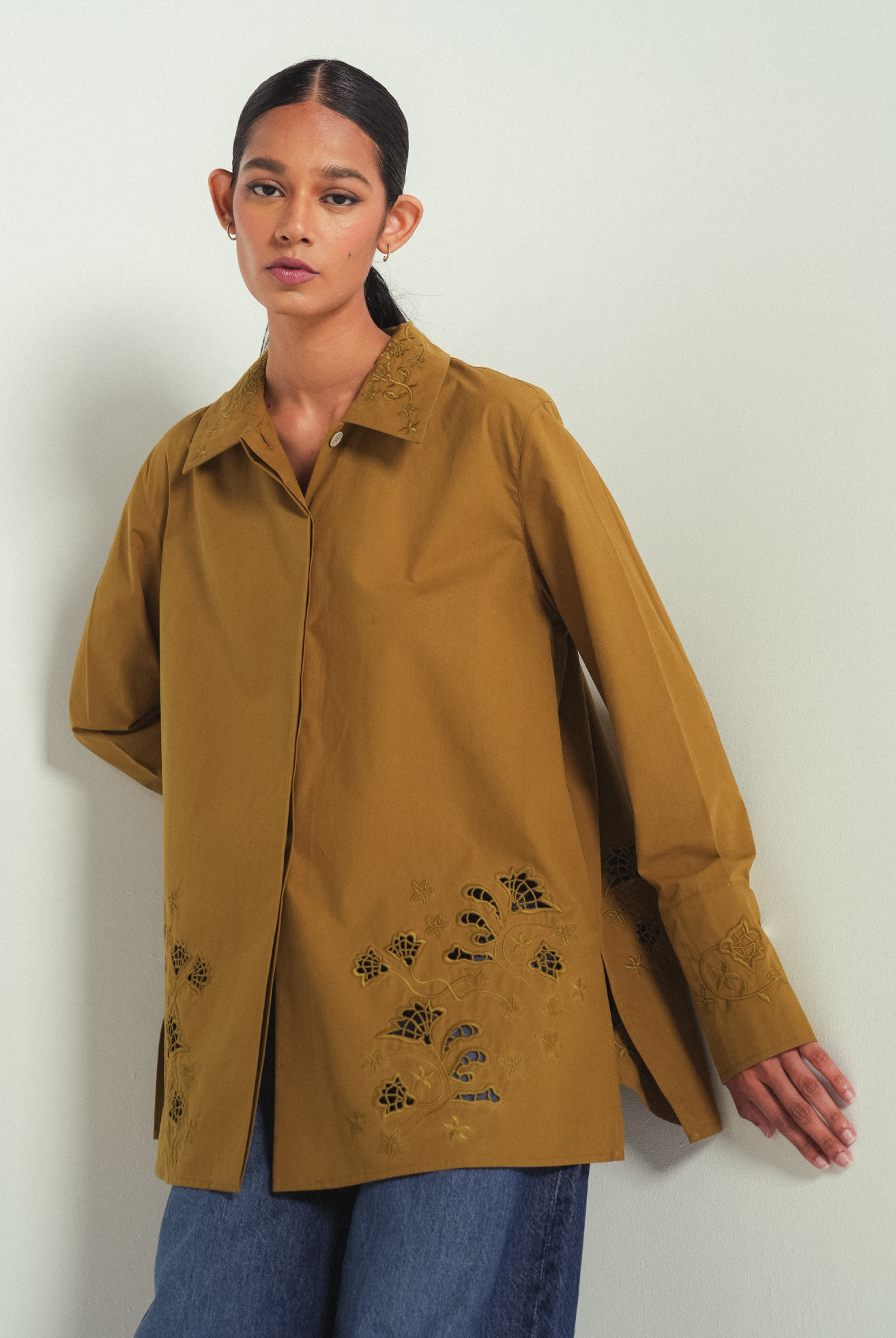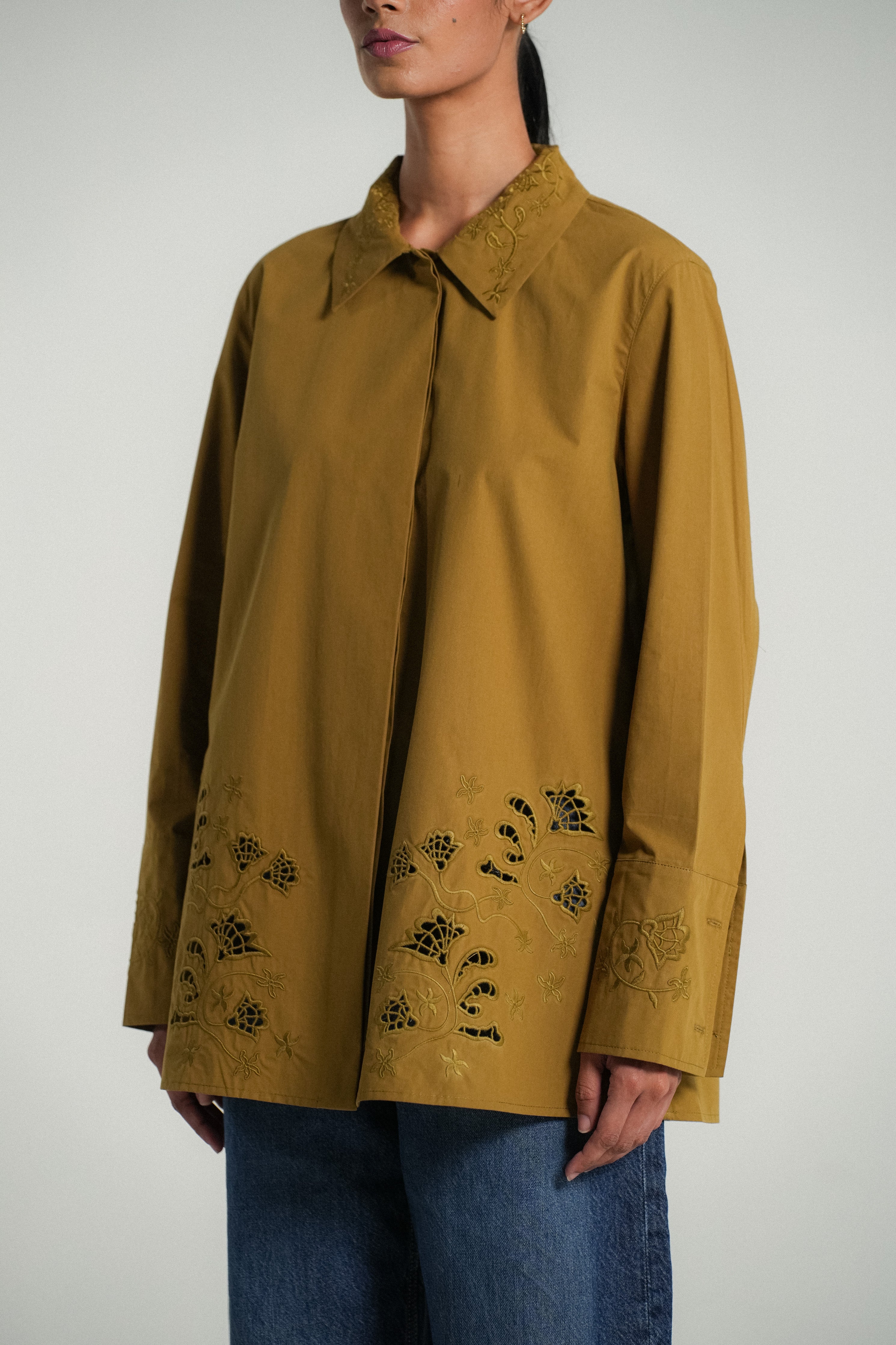 A crisp shirt, rendered in cotton. A relaxed fit with side slits that features delicate flower embroidery on the pointed collar. Intricate eyelet embroidery both front and back, finished with embroidered cuffs on slim-cut sleeves.