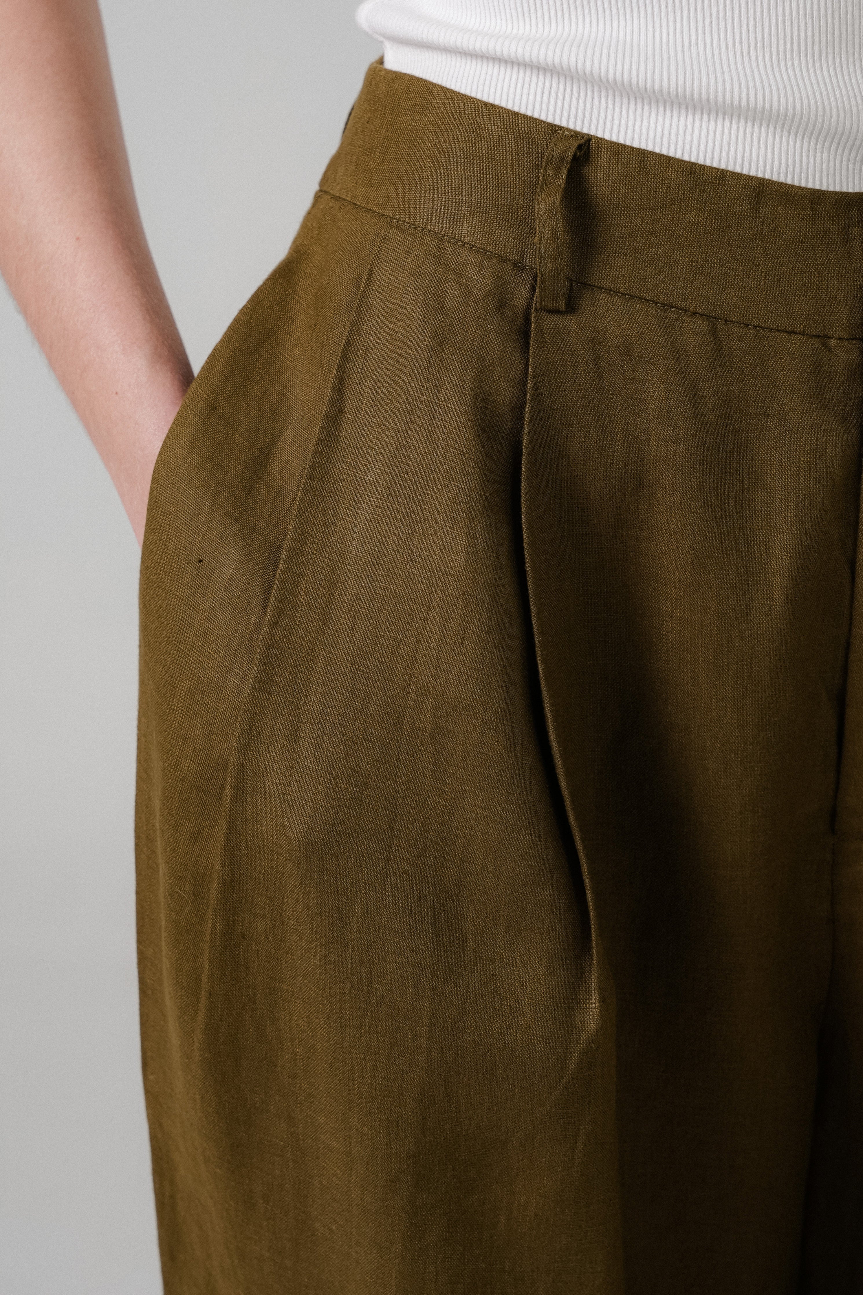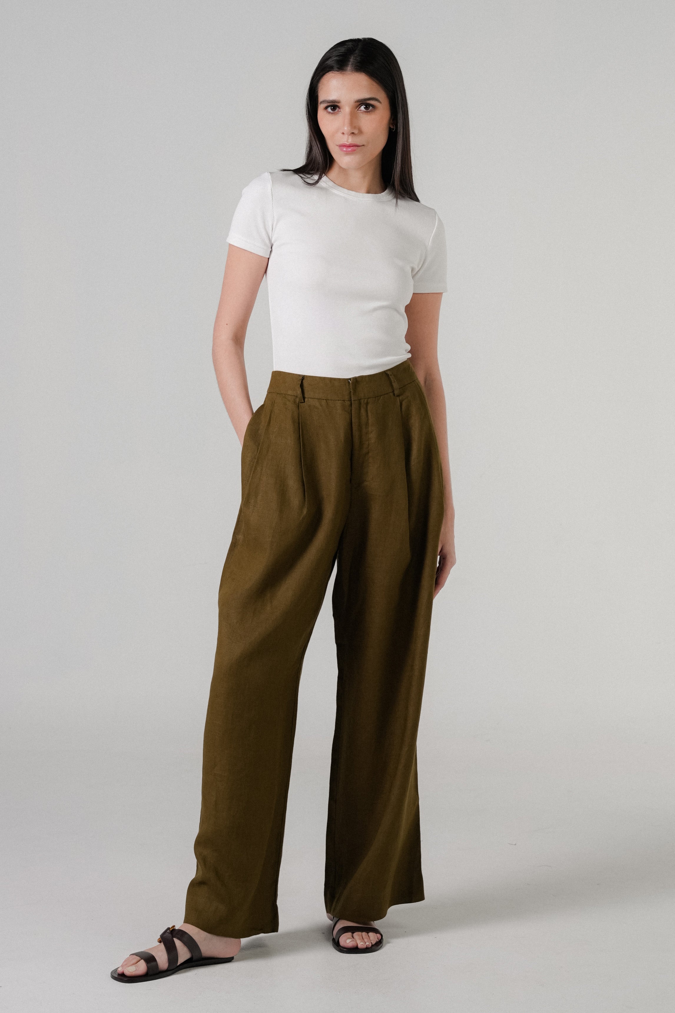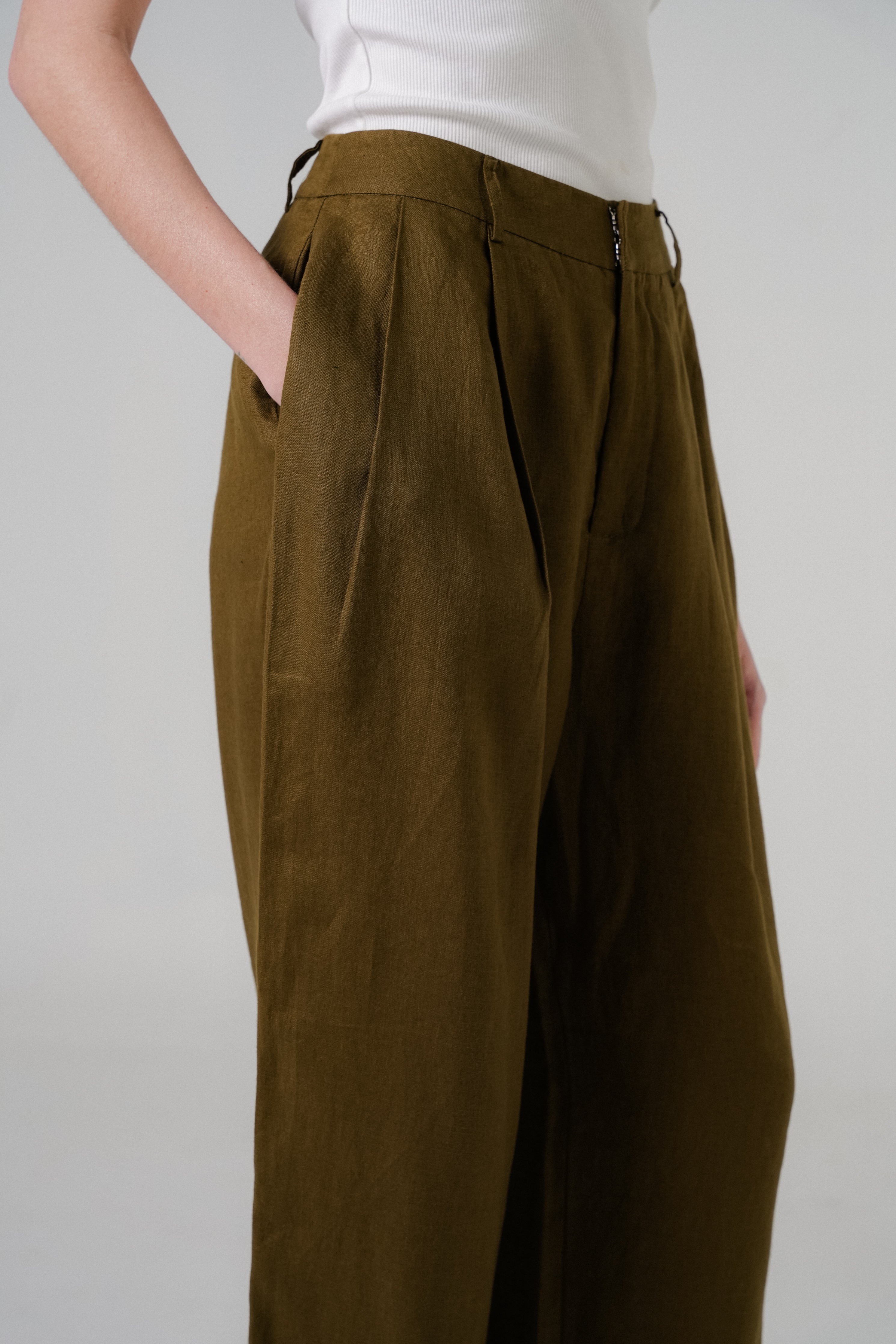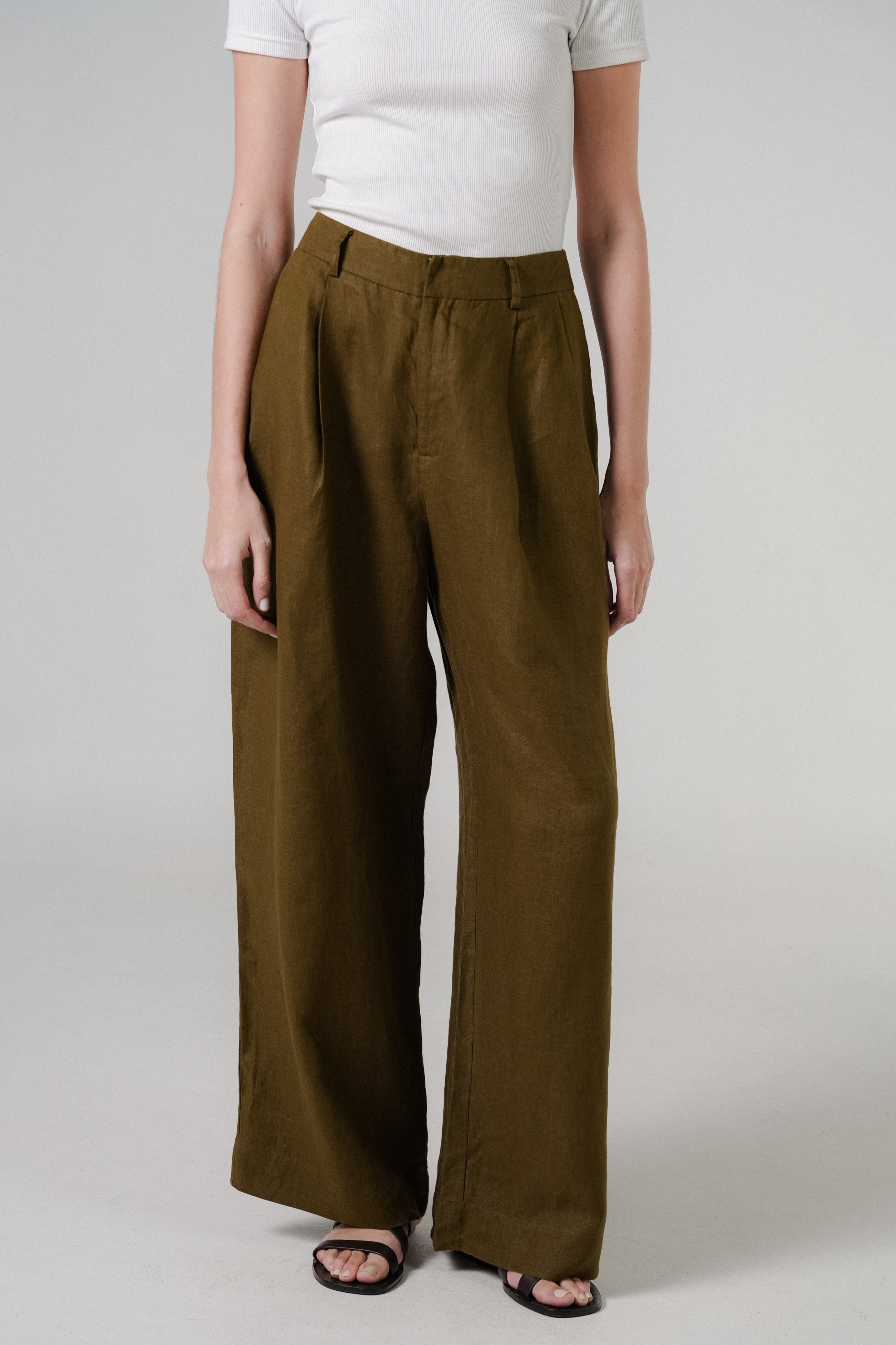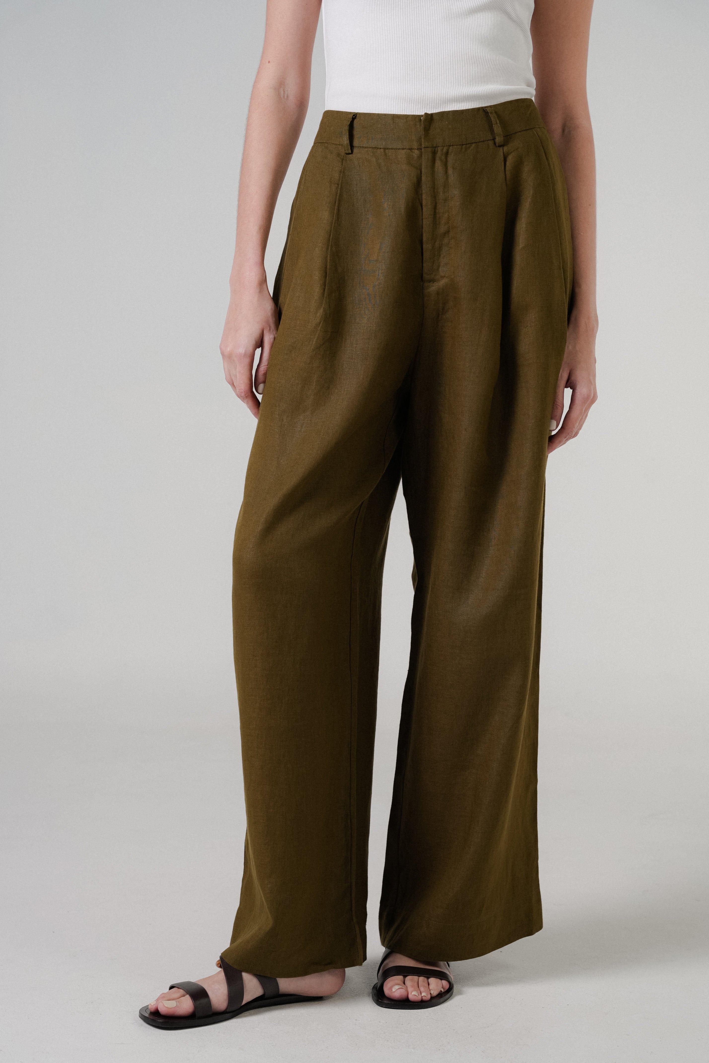 High-waisted trousers, with front pleats. A full-length relaxed fit. Rendered in 100% linen. Featuring side pockets, and finished with a back welt pocket.