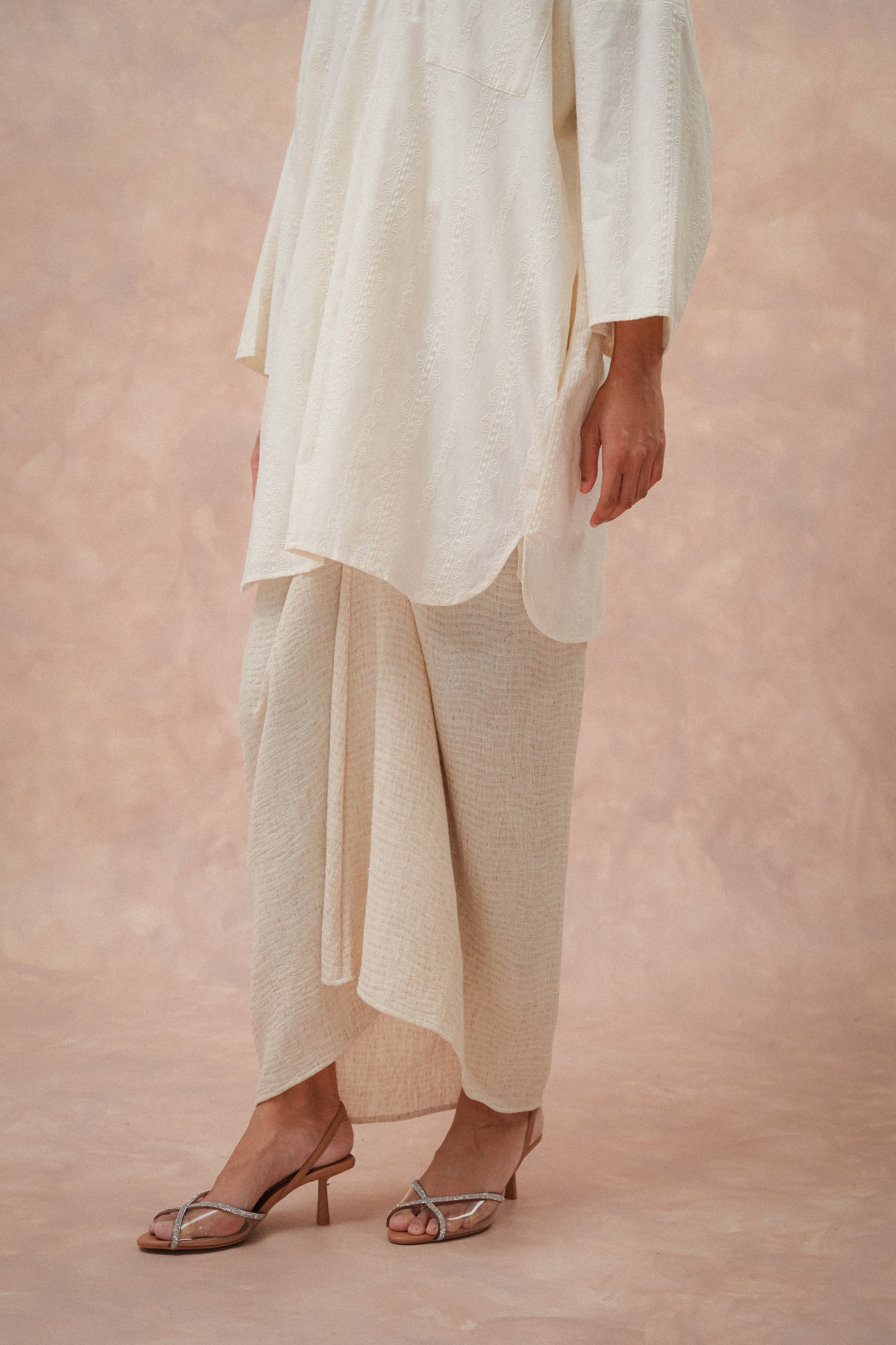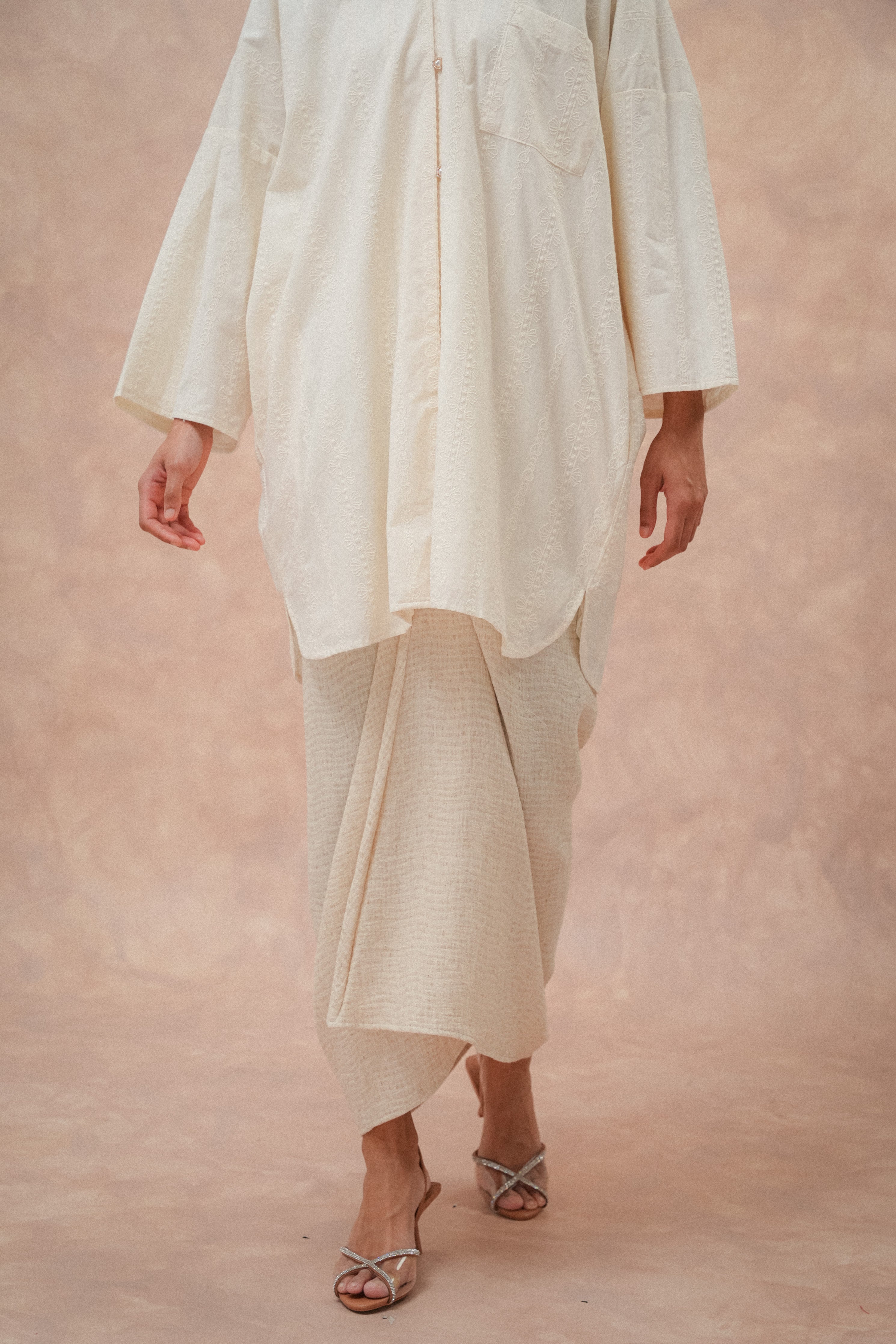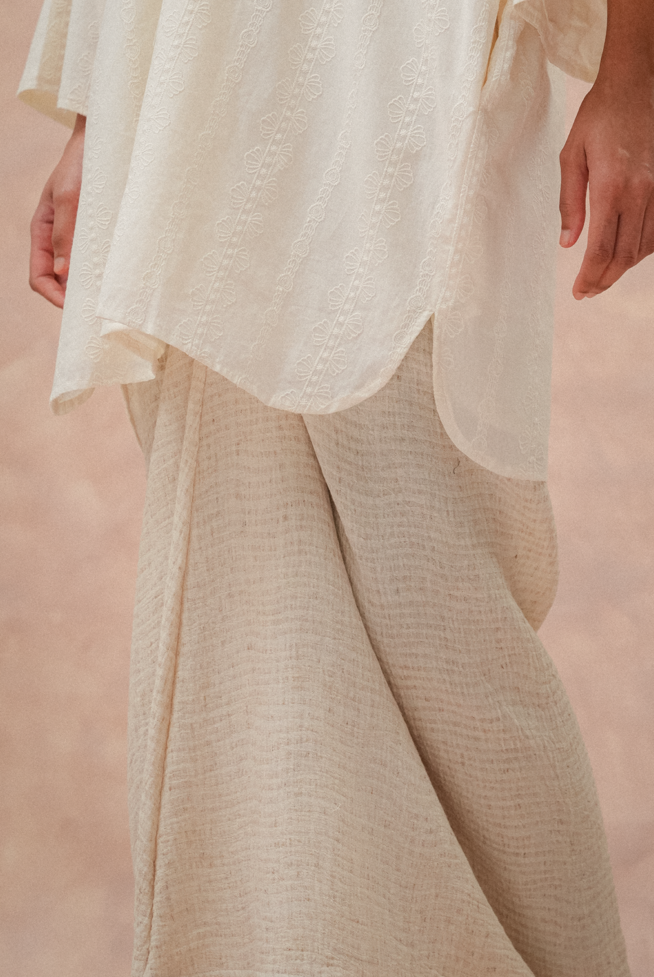 A true staple, this is a slip-on knot skirt that can be secured with a double knot. Made from textured cotton with organic motif.