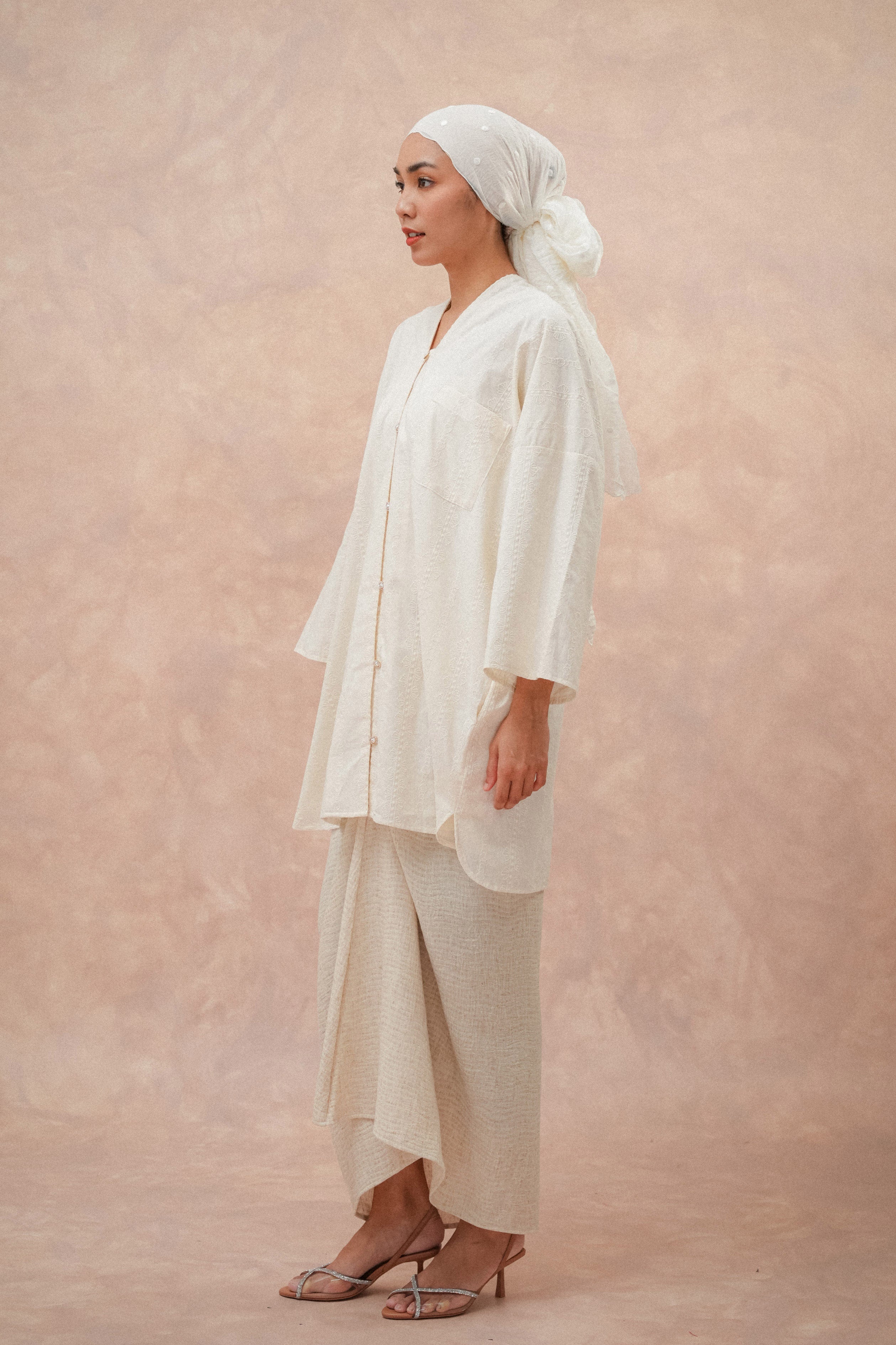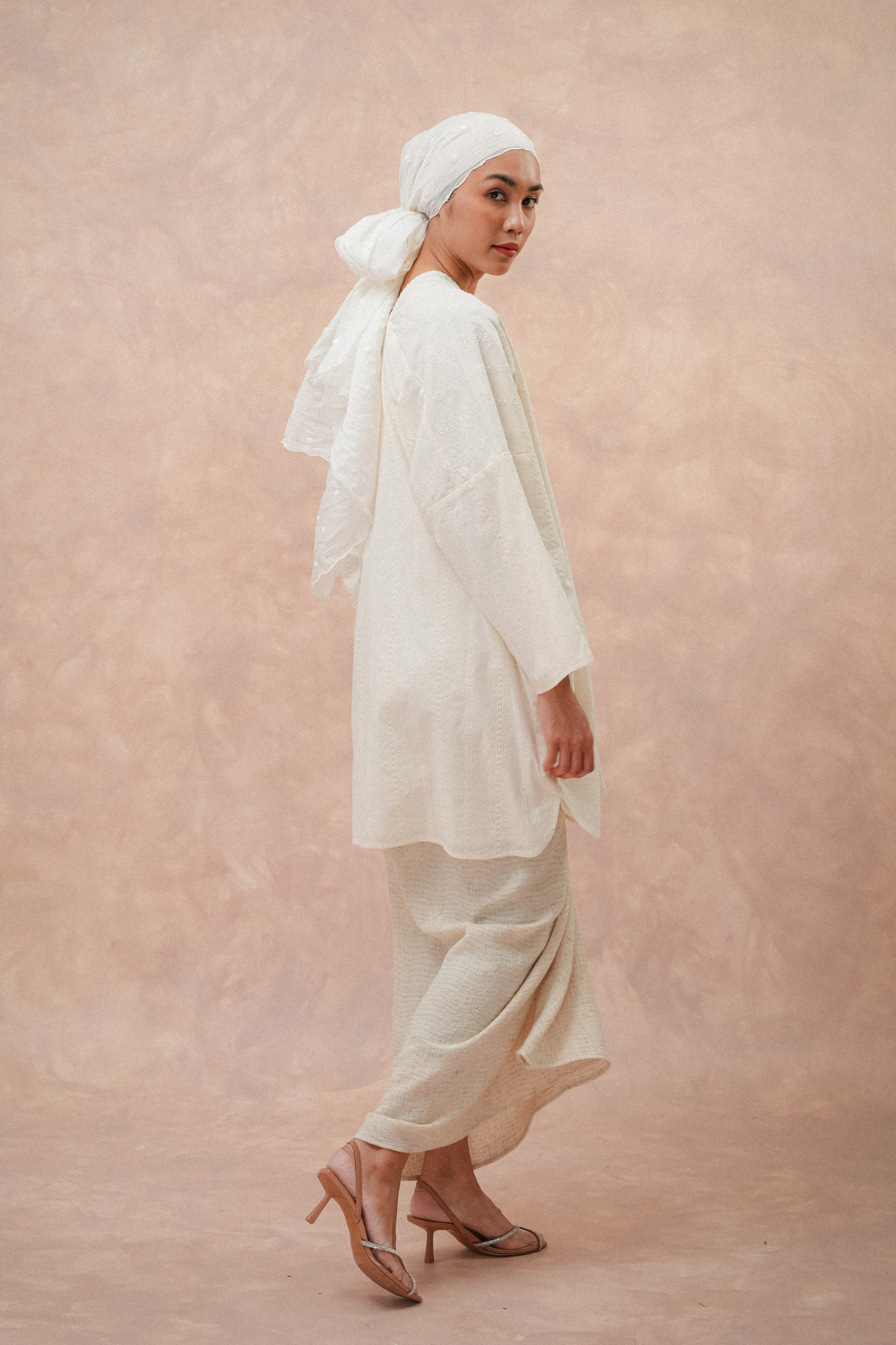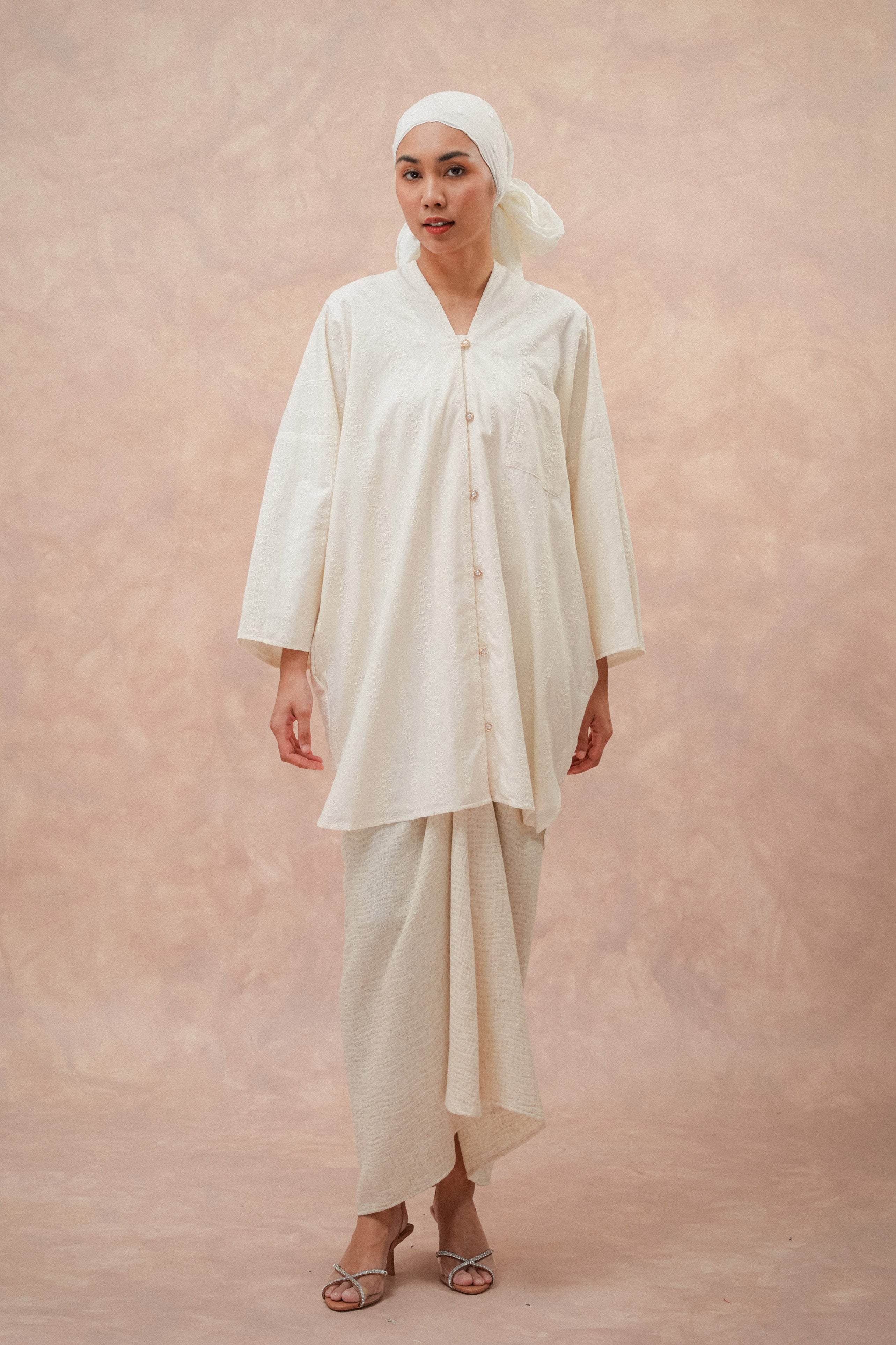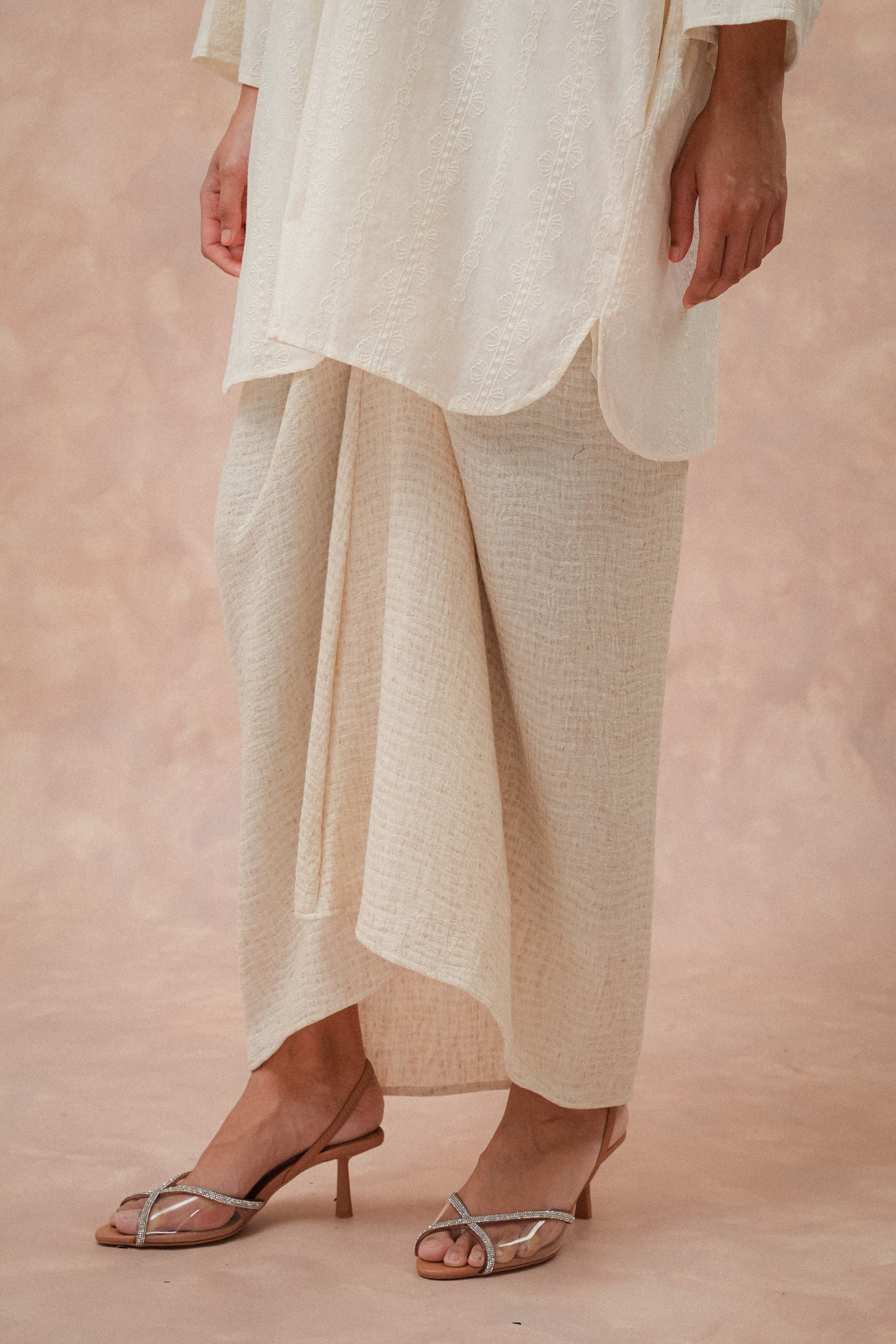 A true staple, this is a slip-on knot skirt that can be secured with a double knot. Made from textured cotton with organic motif.