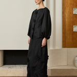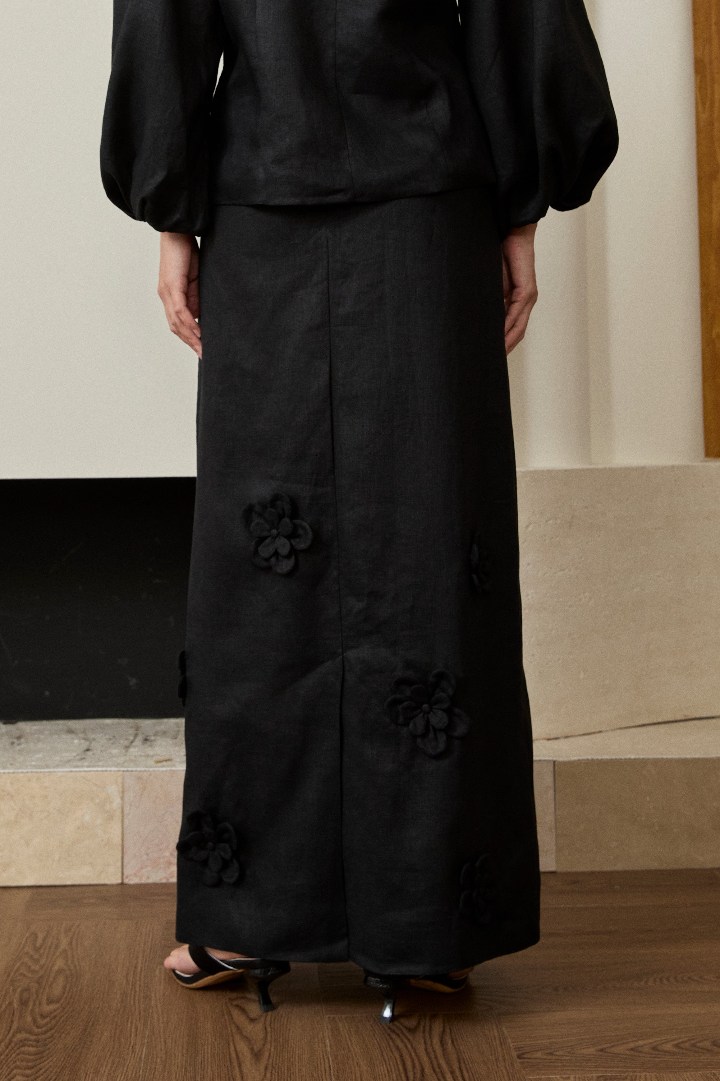 Back-slit pencil skirt adorned with 3D floral embellishments