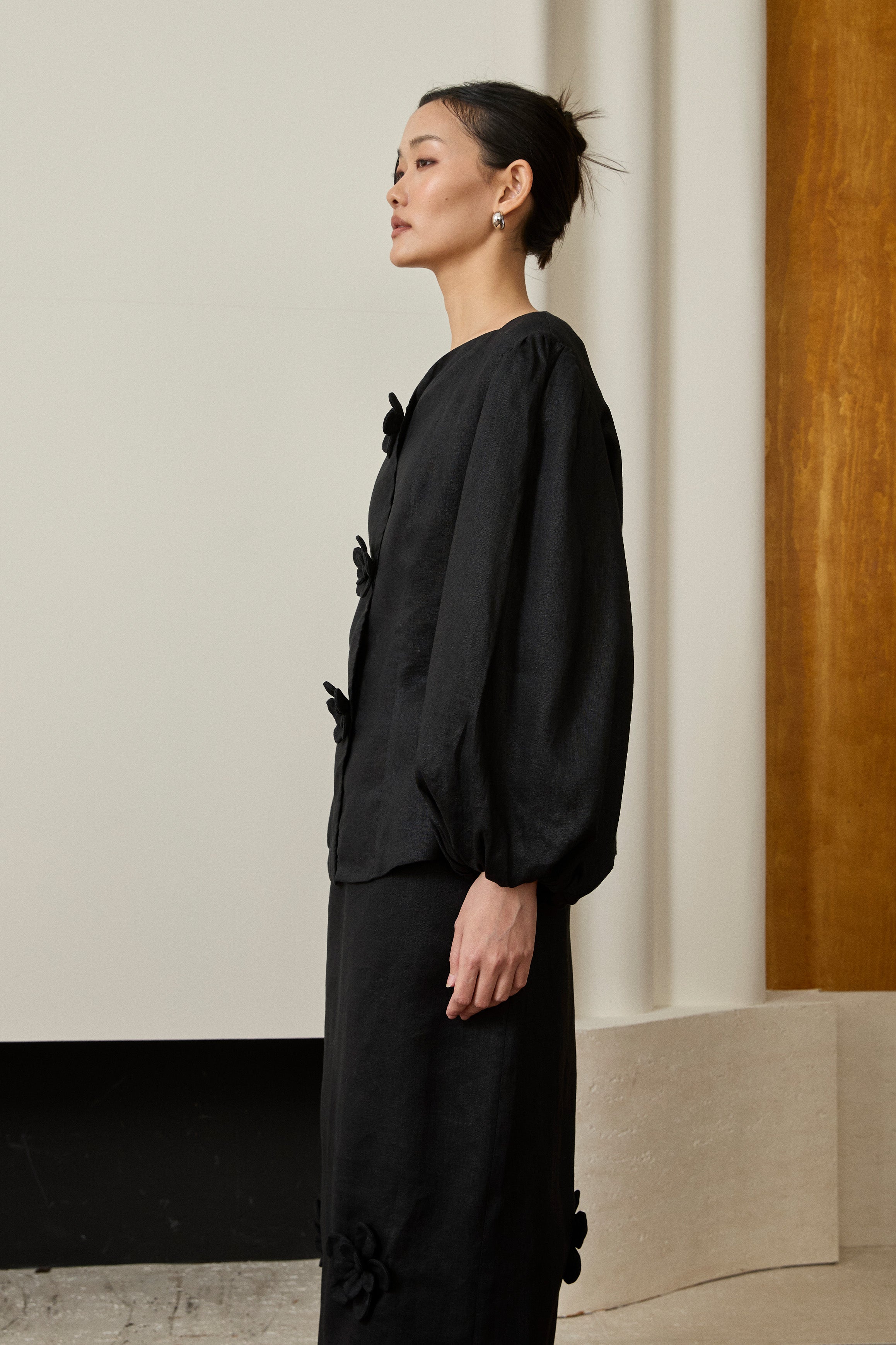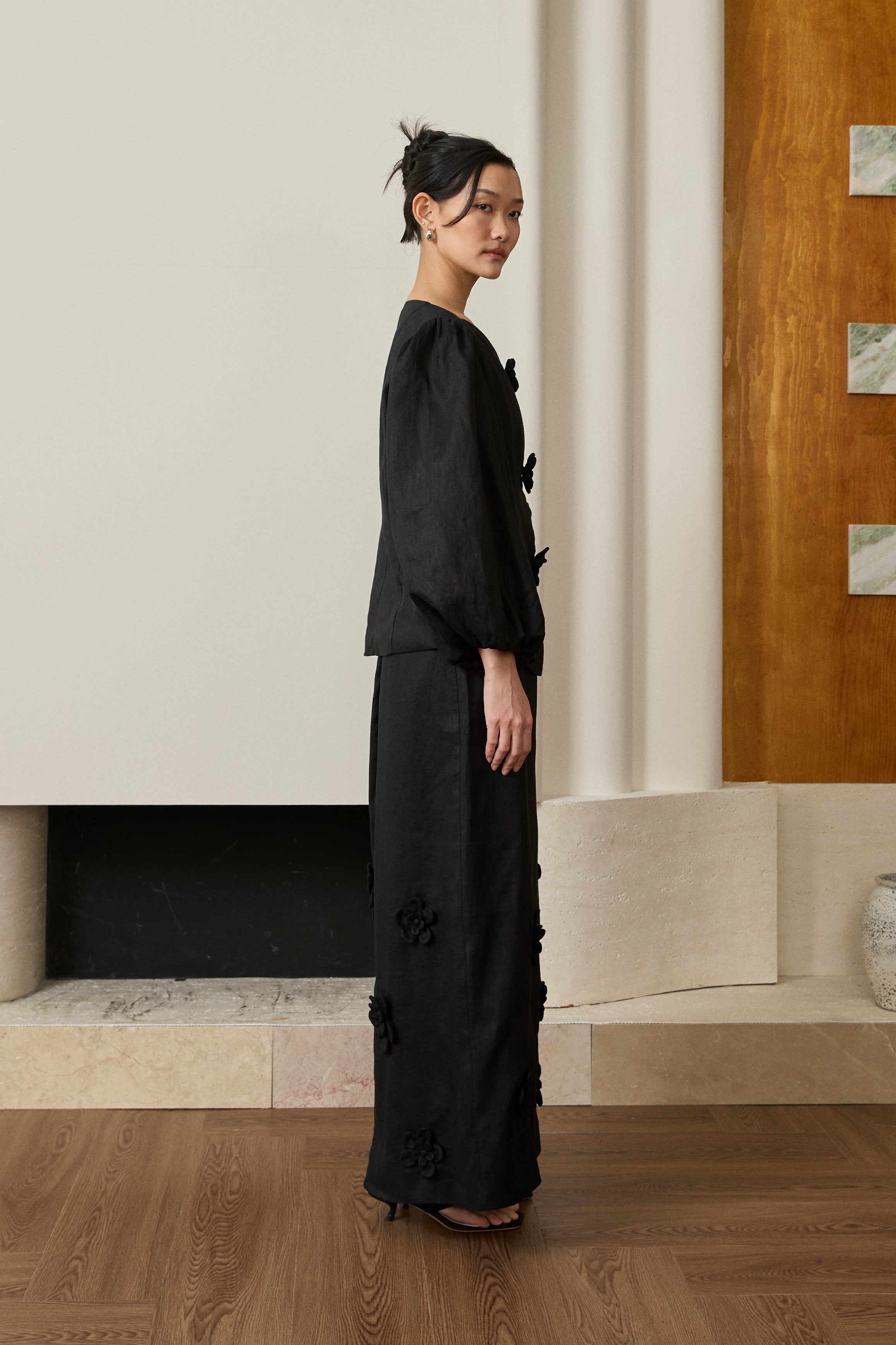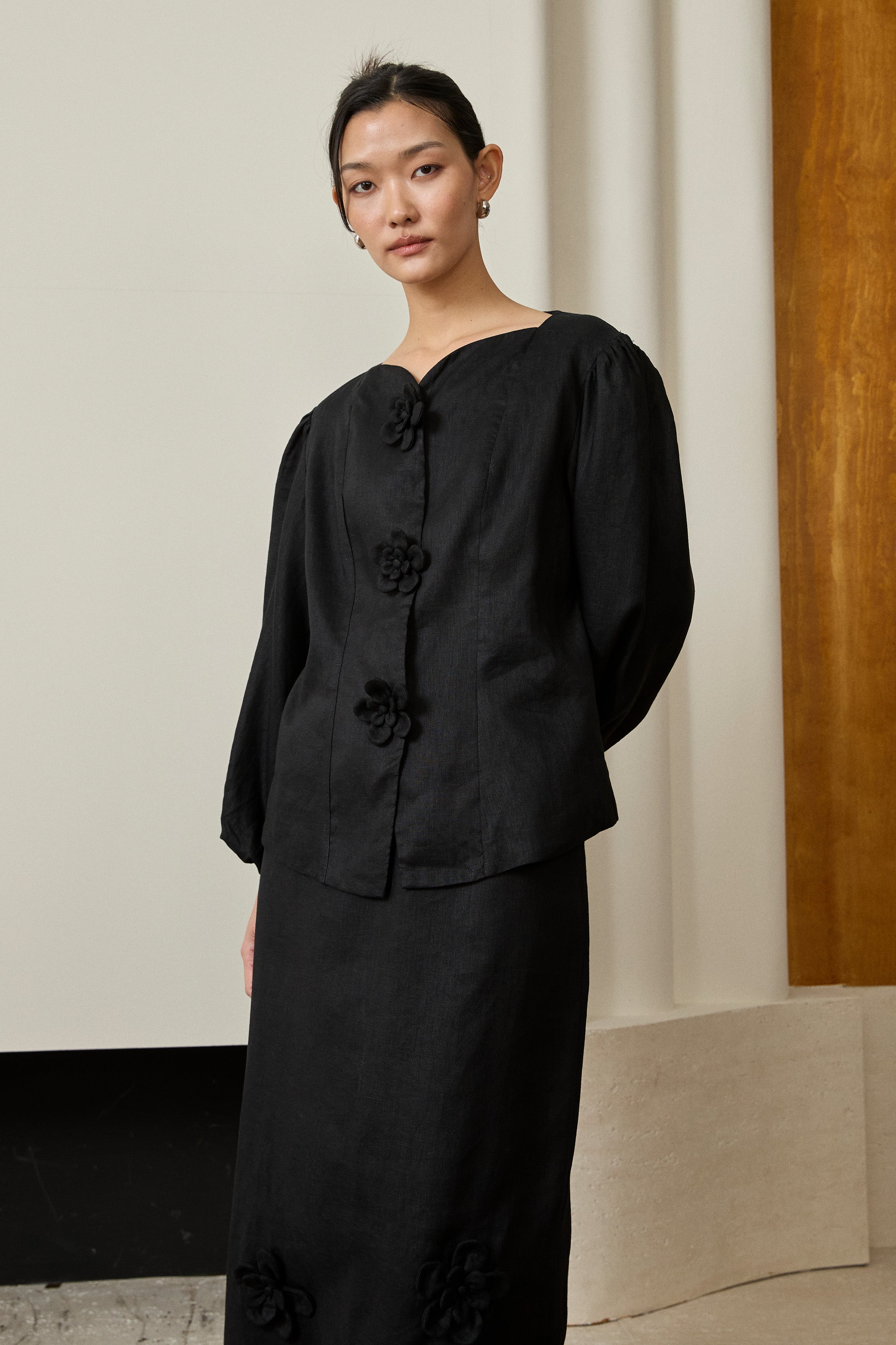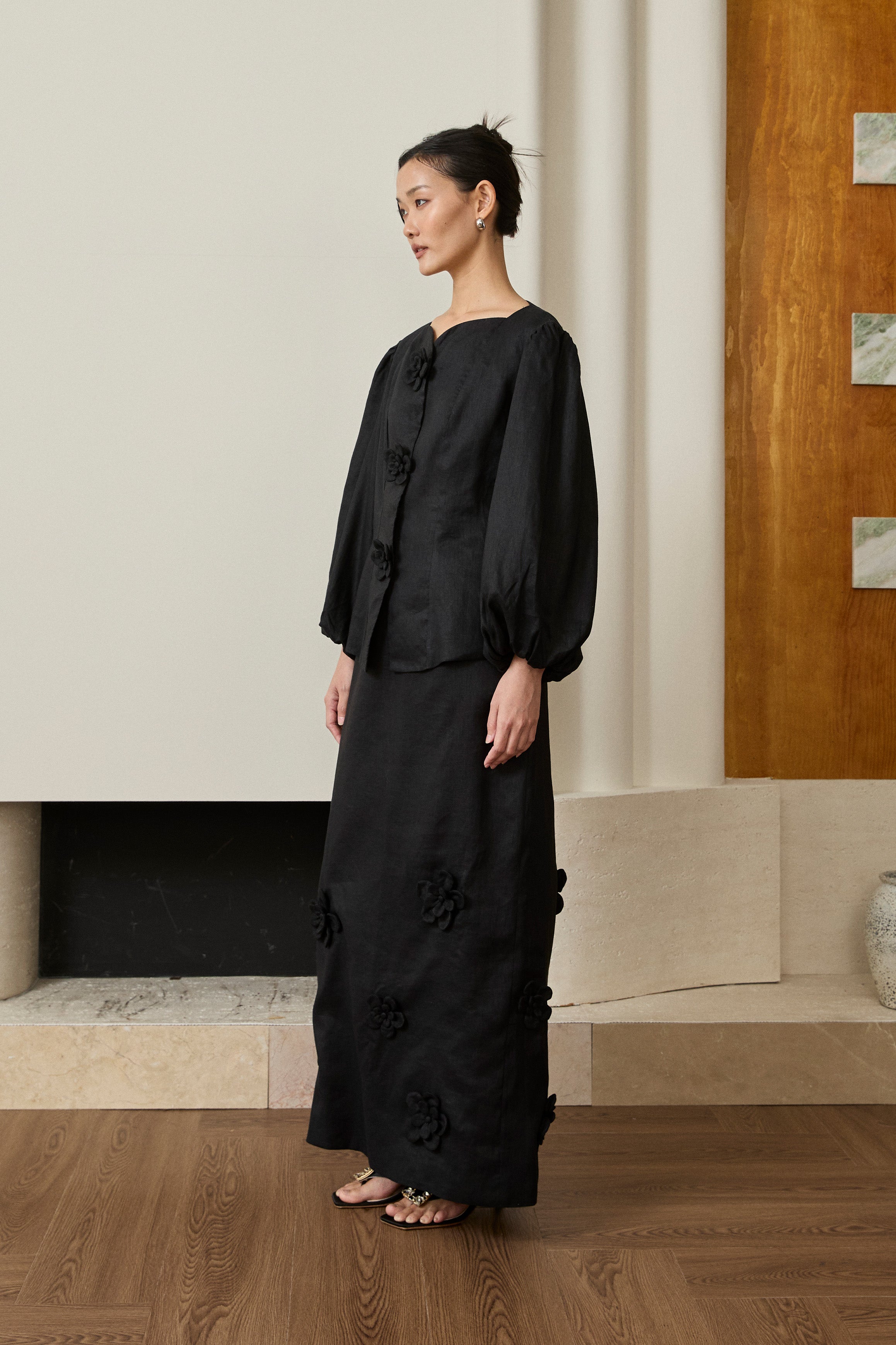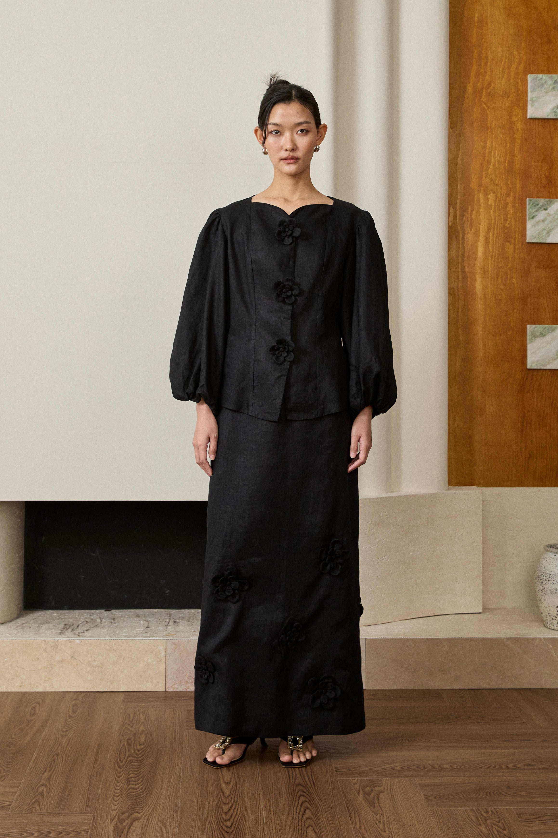 A linen two-piece set. Features a modern-fit Kebaya top with a sweetheart neckline, intricate 3D floral embellishments and puff sleeves. Paired with a back-slit pencil skirt with 3D floral detailing, and a half-elasticated waistband with side pockets. Rendered in linen, fully lined in cotton.