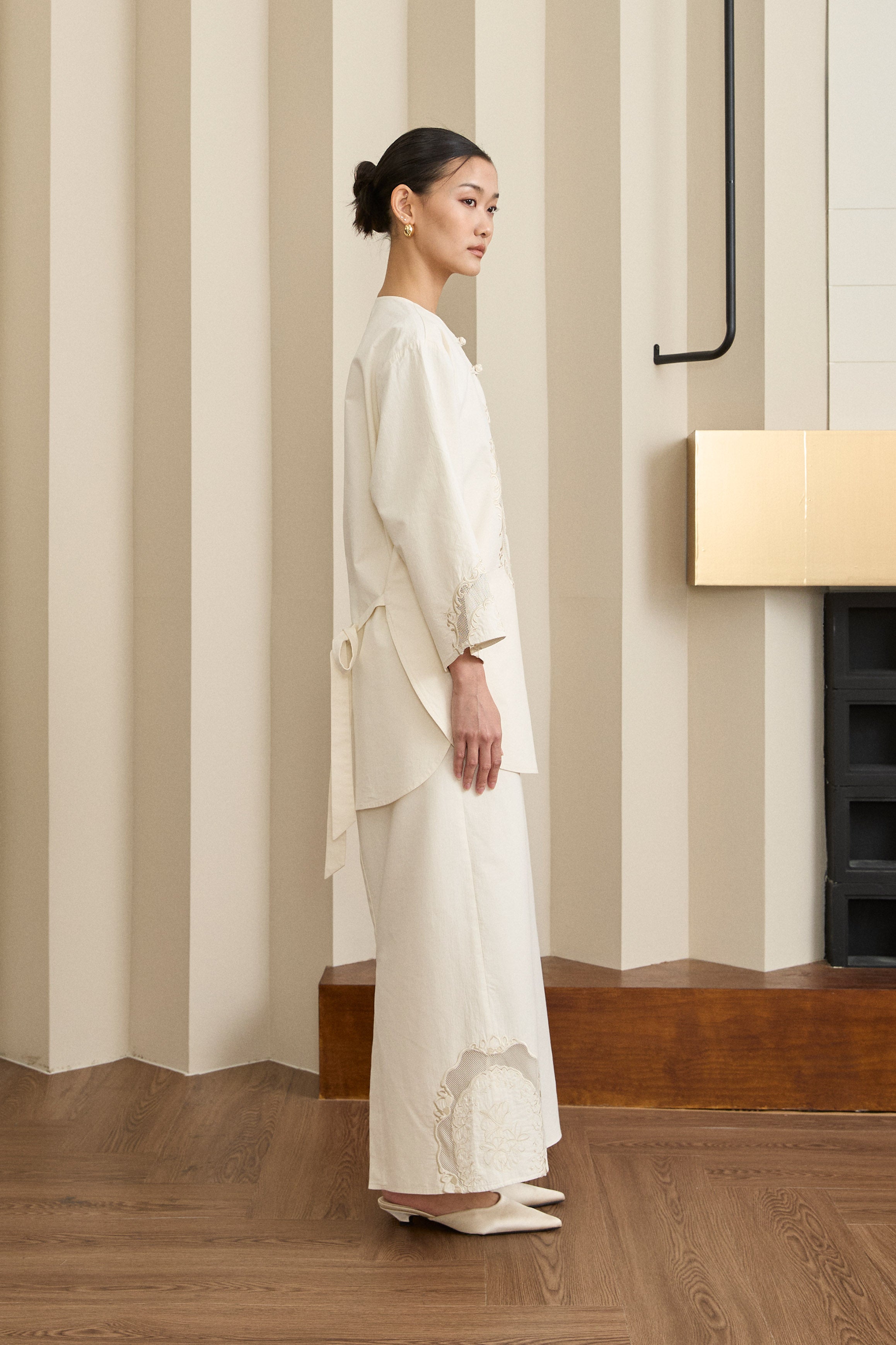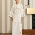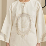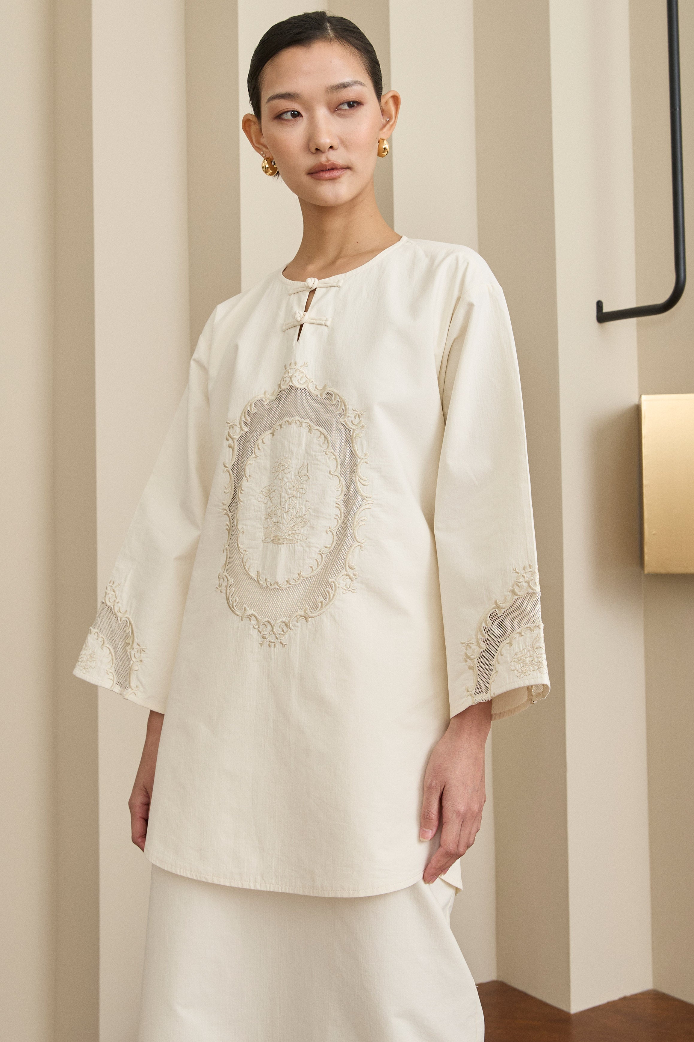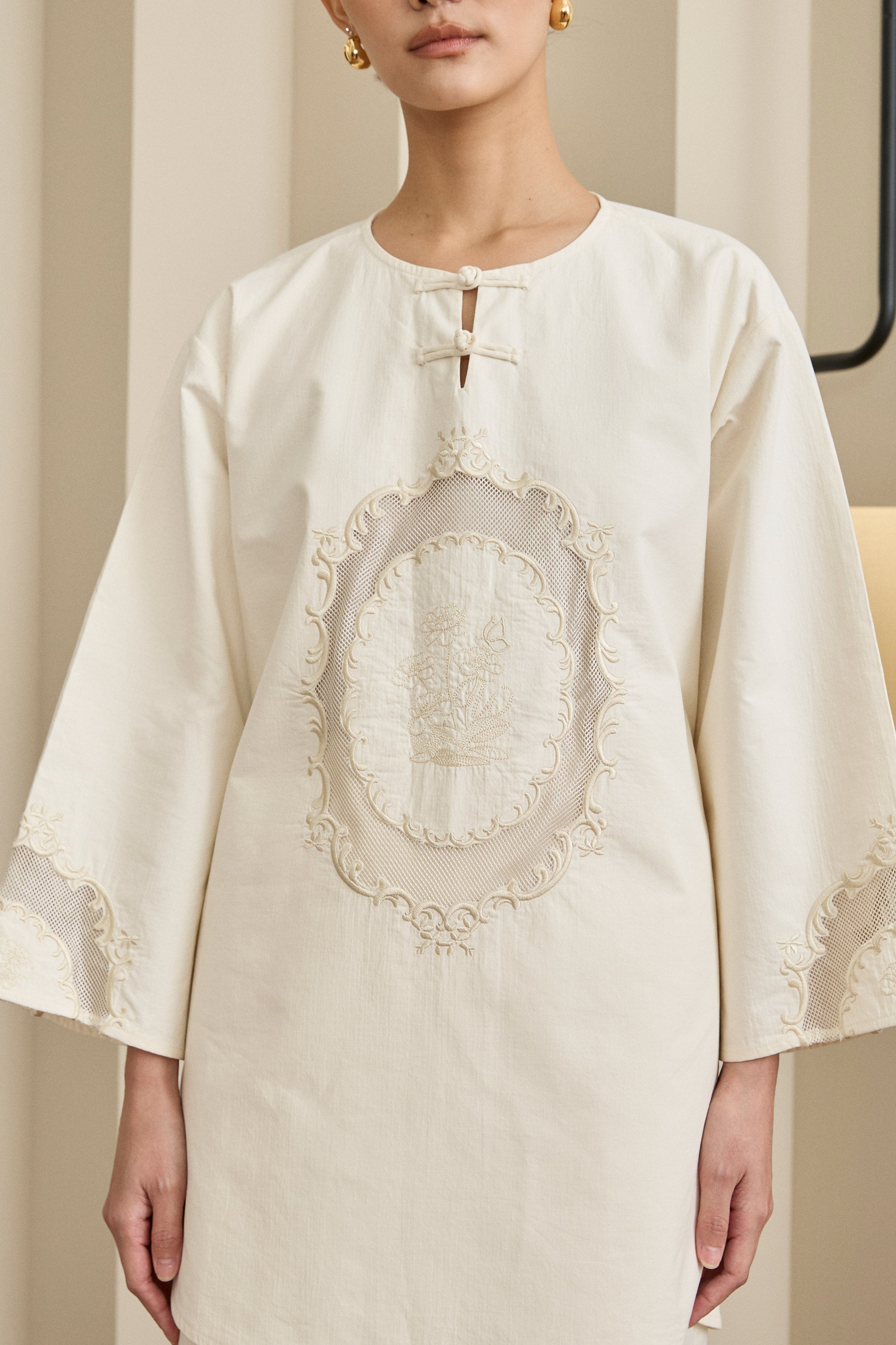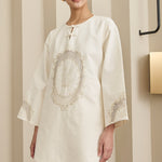 Long-sleeve tunic with a round neckline and heritage knot closure. Features embroidered front bodice and sleeve. Finished with rounded hem with side slits, and a back tie detail. Rendered in cotton.