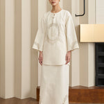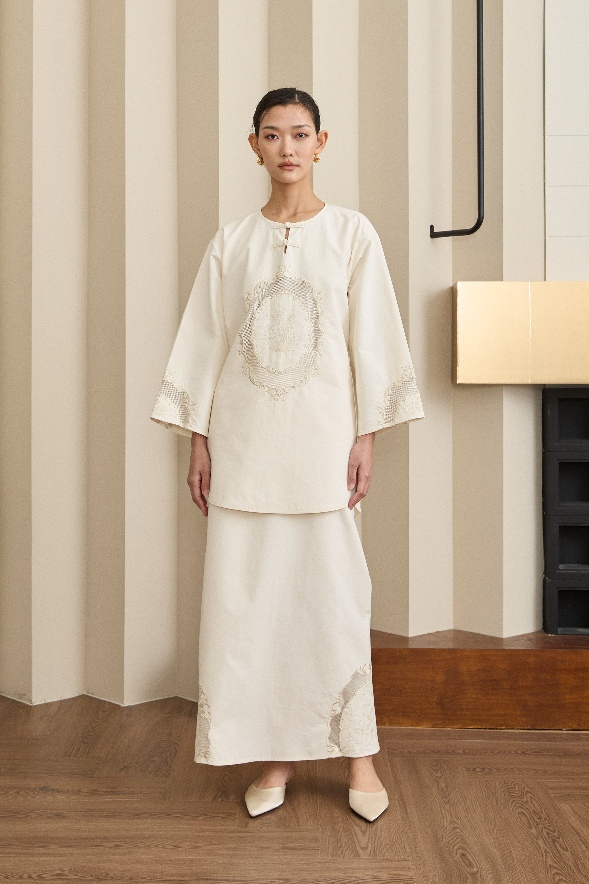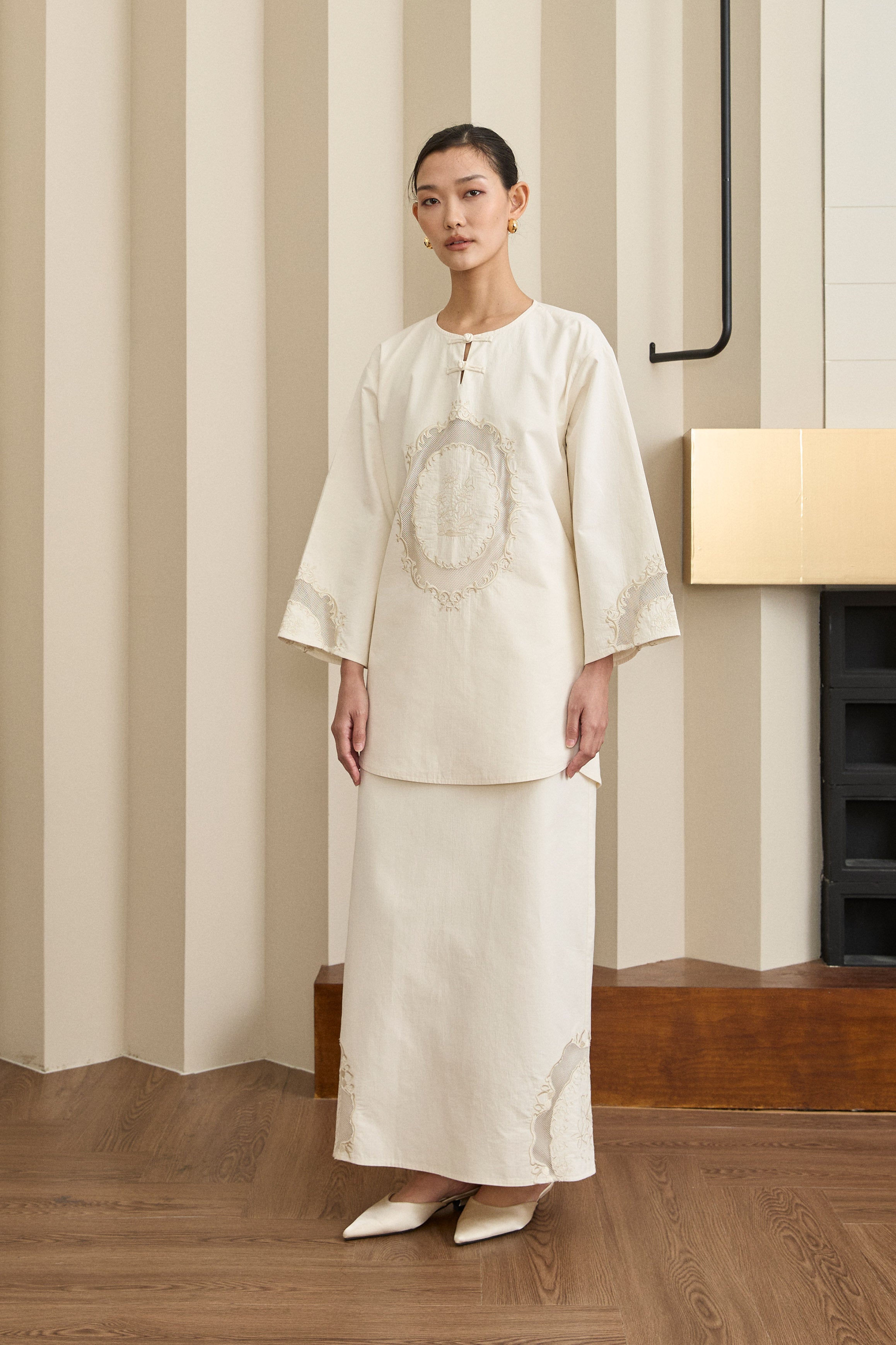Detailed with intricate embroidery along the front panels and sleeves