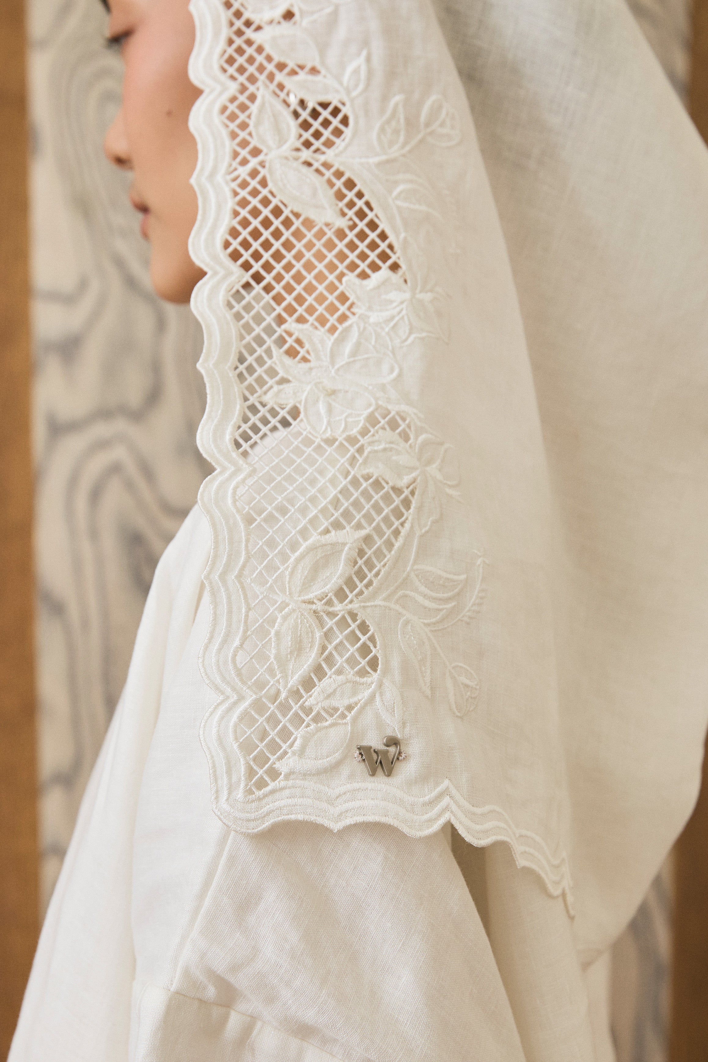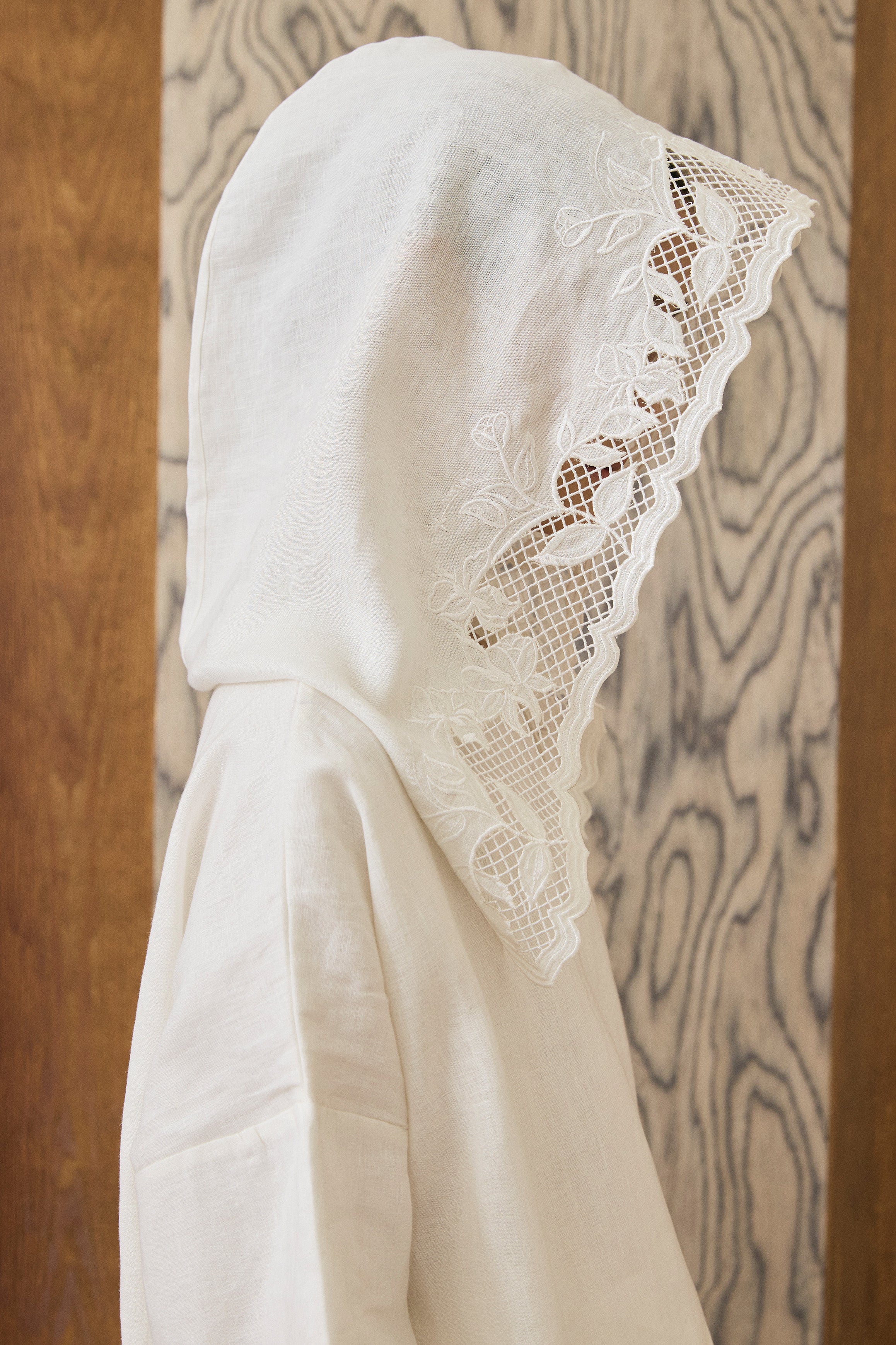 A head piece, with delicate 'sulam goyang' detailing along the hood edge and a curved head shape. Features a snap button for versatile styling. Rendered in linen.
