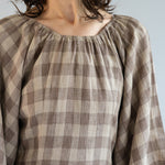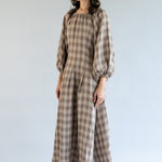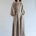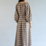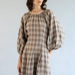 Fitted dress with structured box pleats, rendered in linen. Features a round neckline and bubble sleeves. Finished with side pockets. Fully lined in cotton.