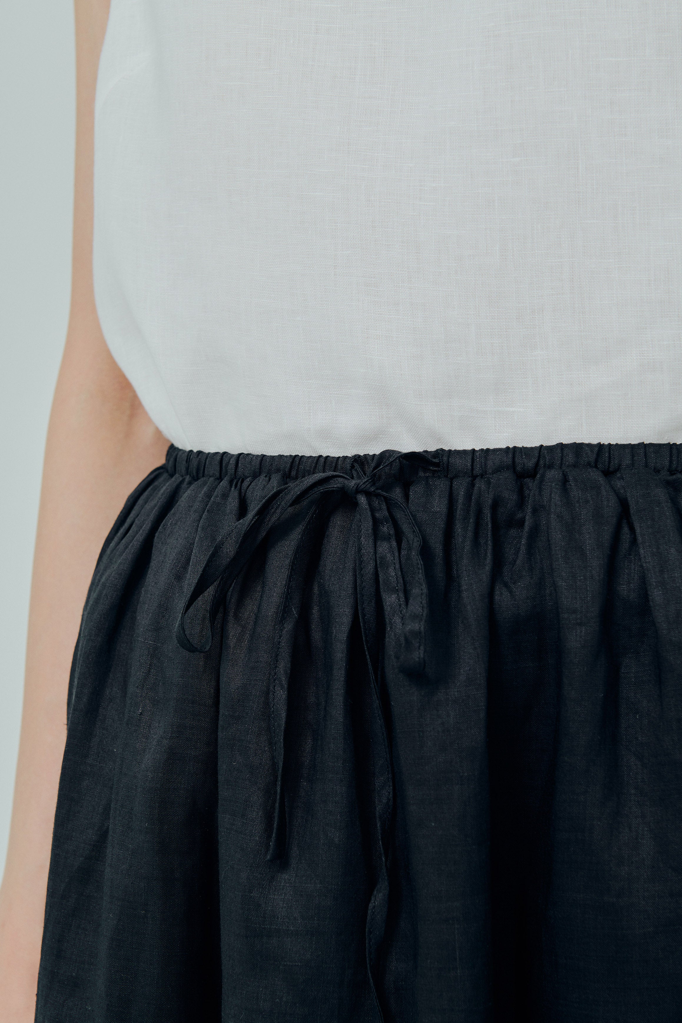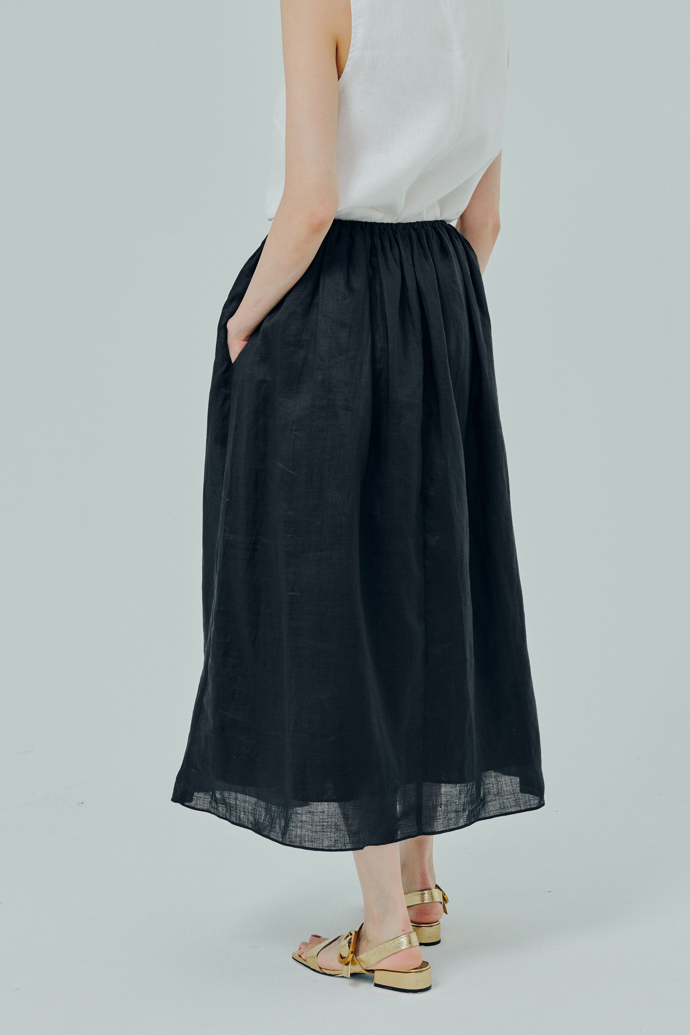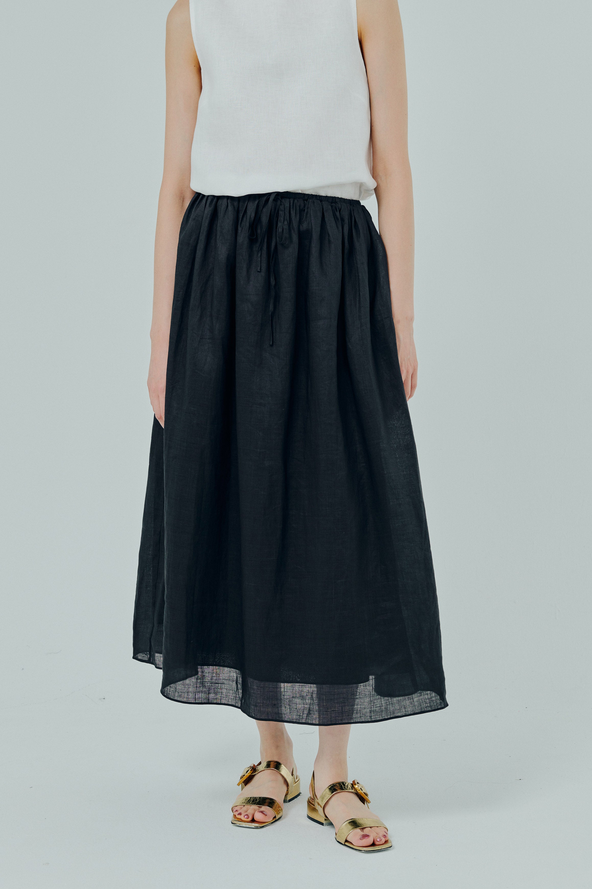 A-line midi skirt with an elastic drawstring waistband. Rendered in ramie, and lined in cotton.
