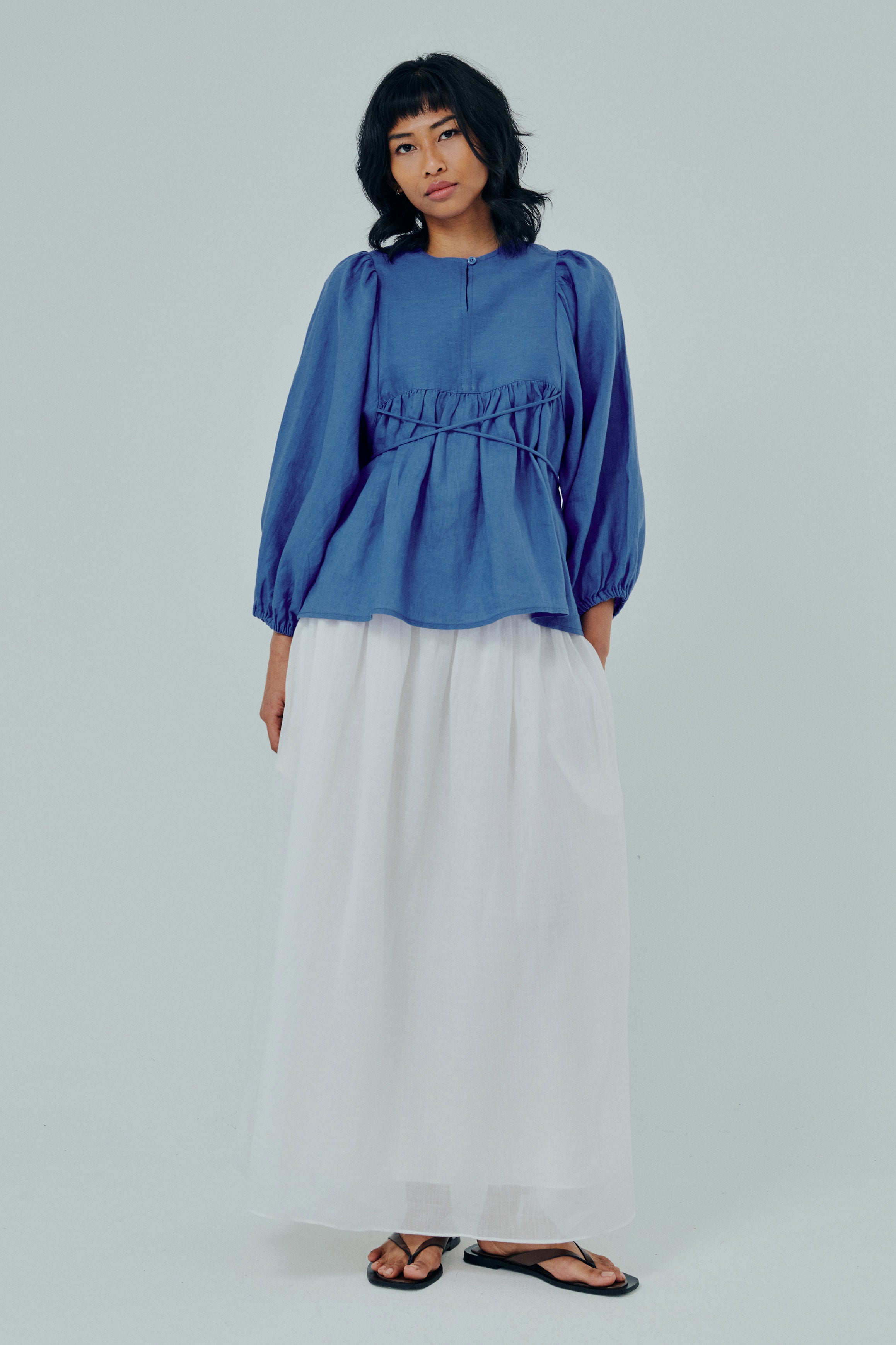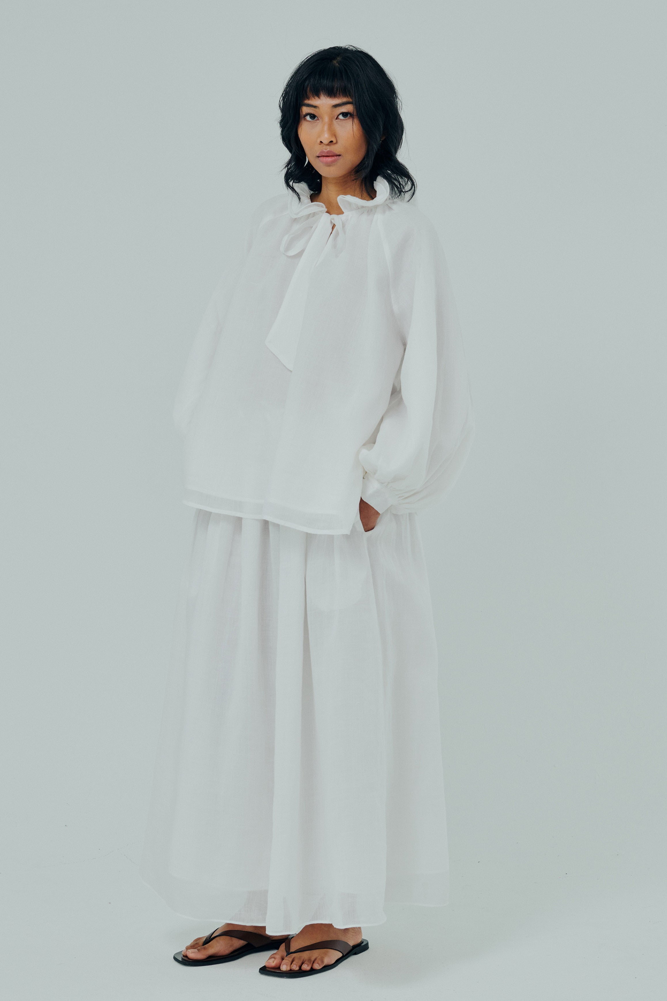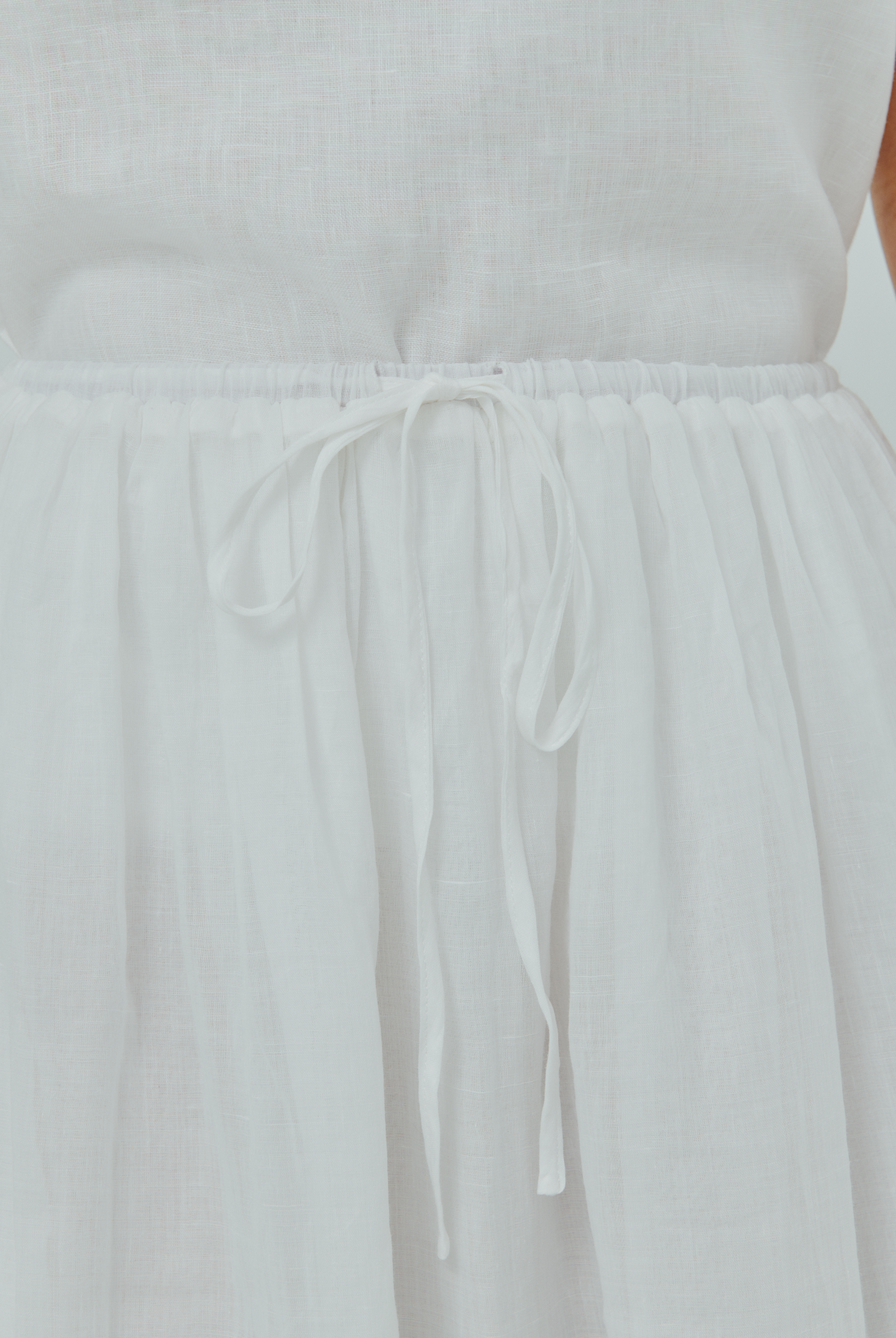 A-line midi skirt with an elastic drawstring waistband. Rendered in ramie, and lined in cotton.