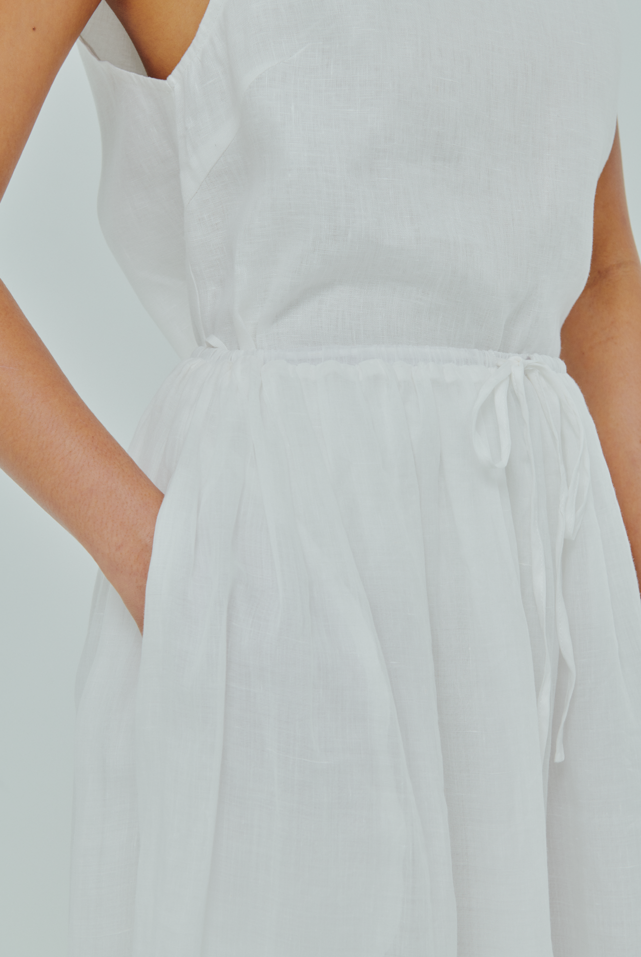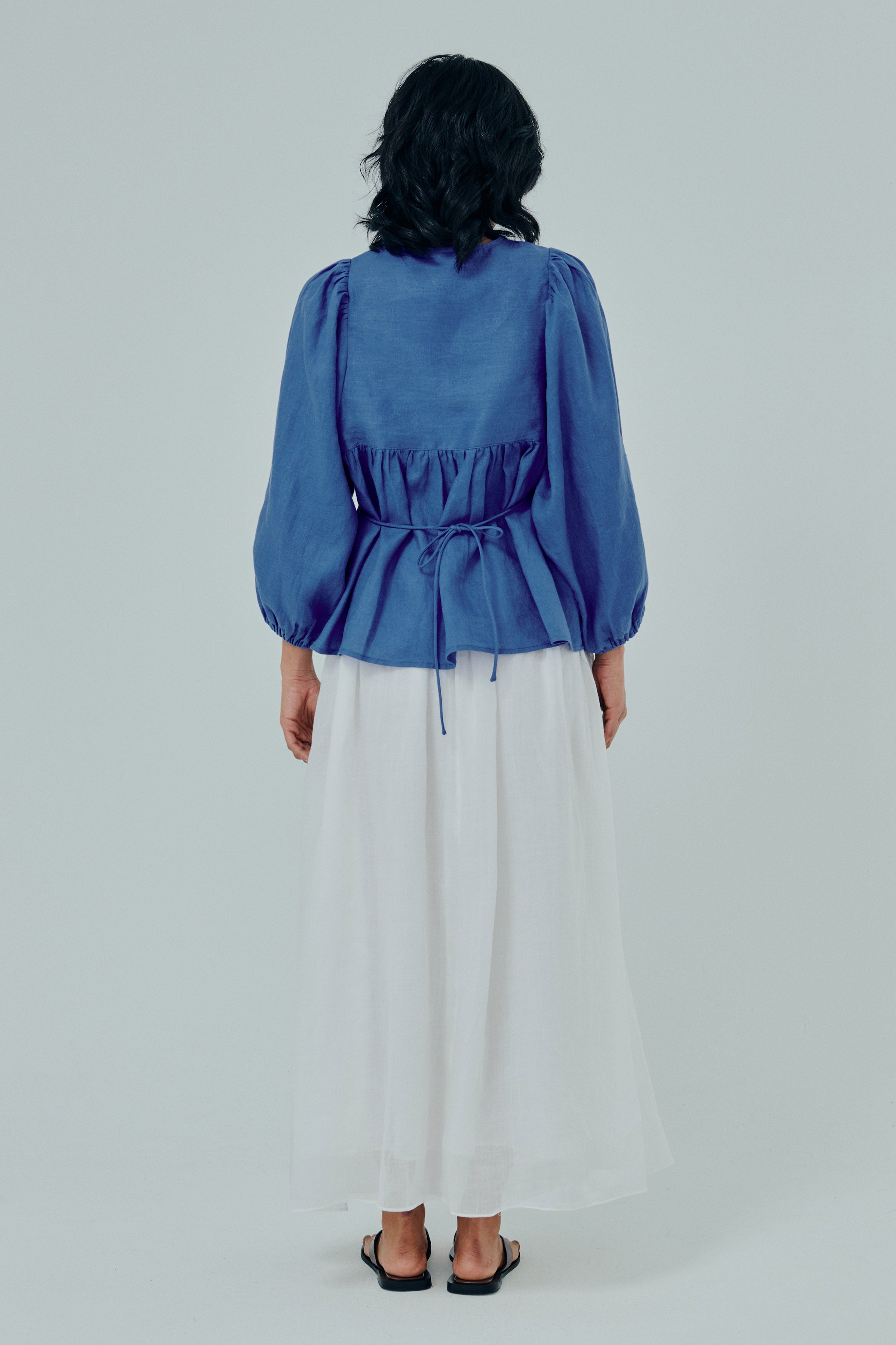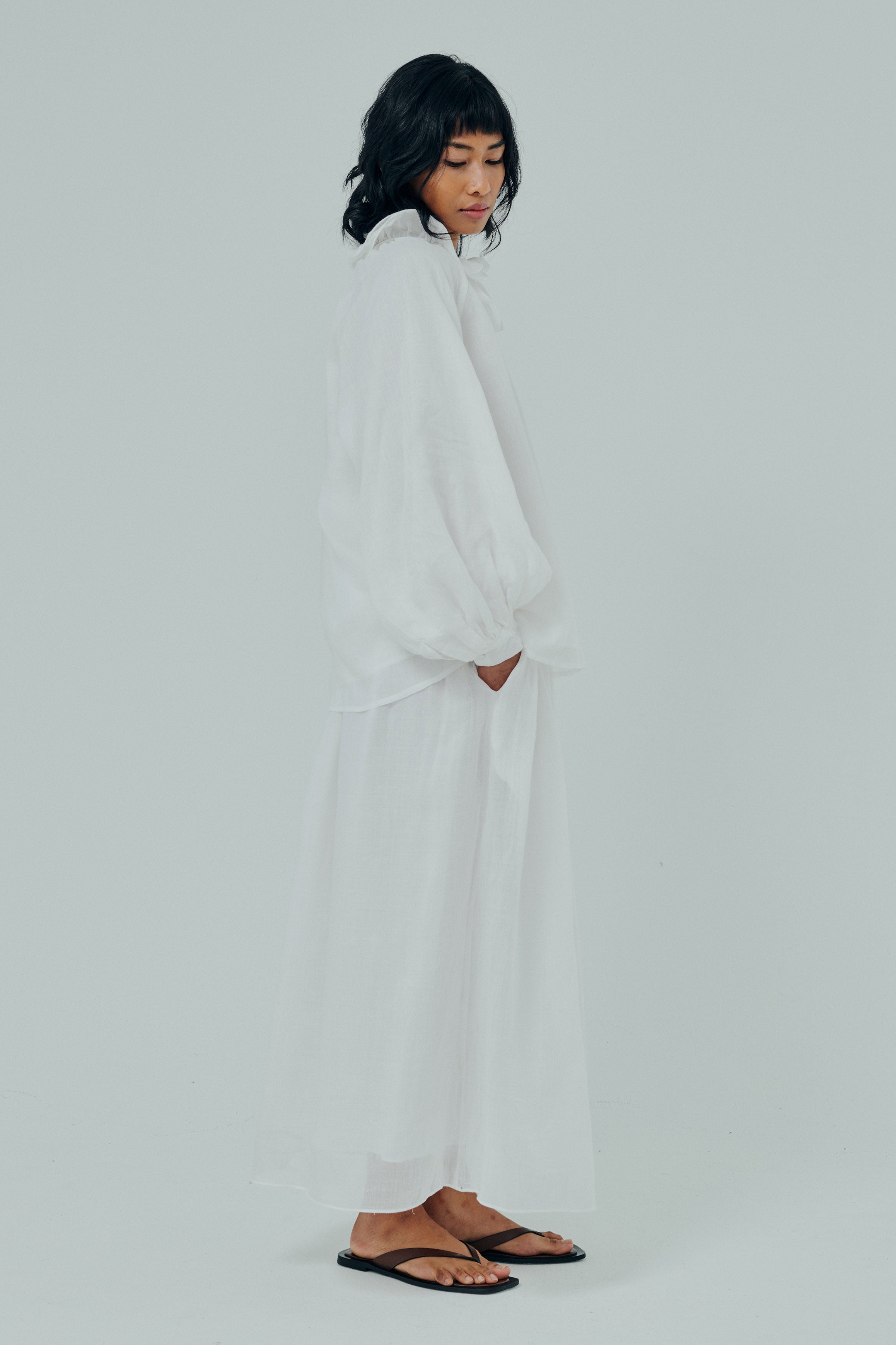 A-line midi skirt with an elastic drawstring waistband. Rendered in ramie, and lined in cotton.