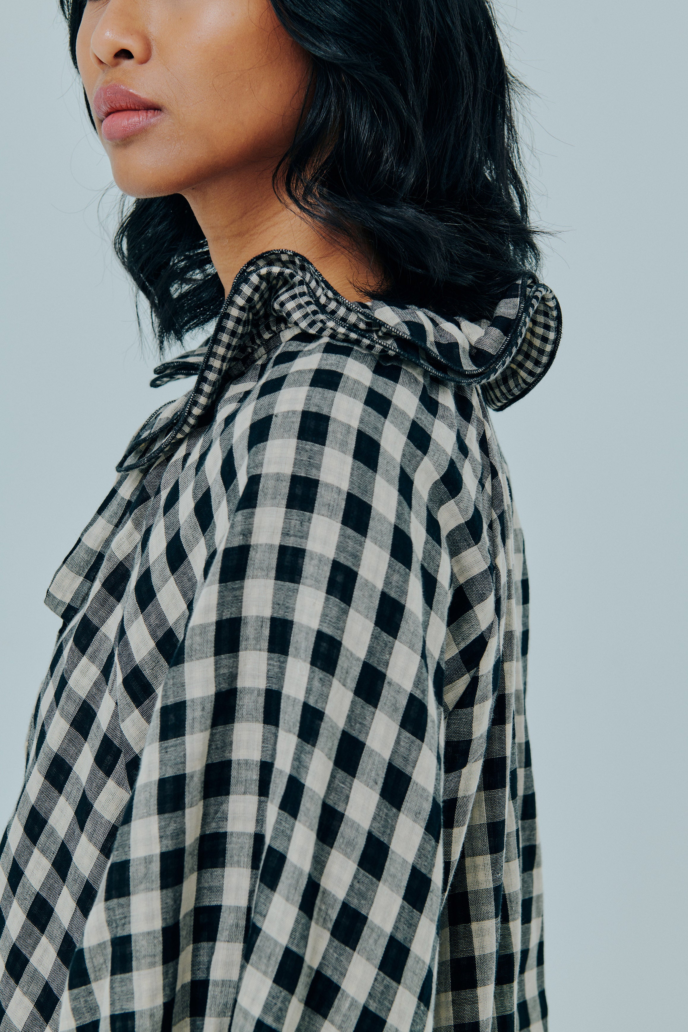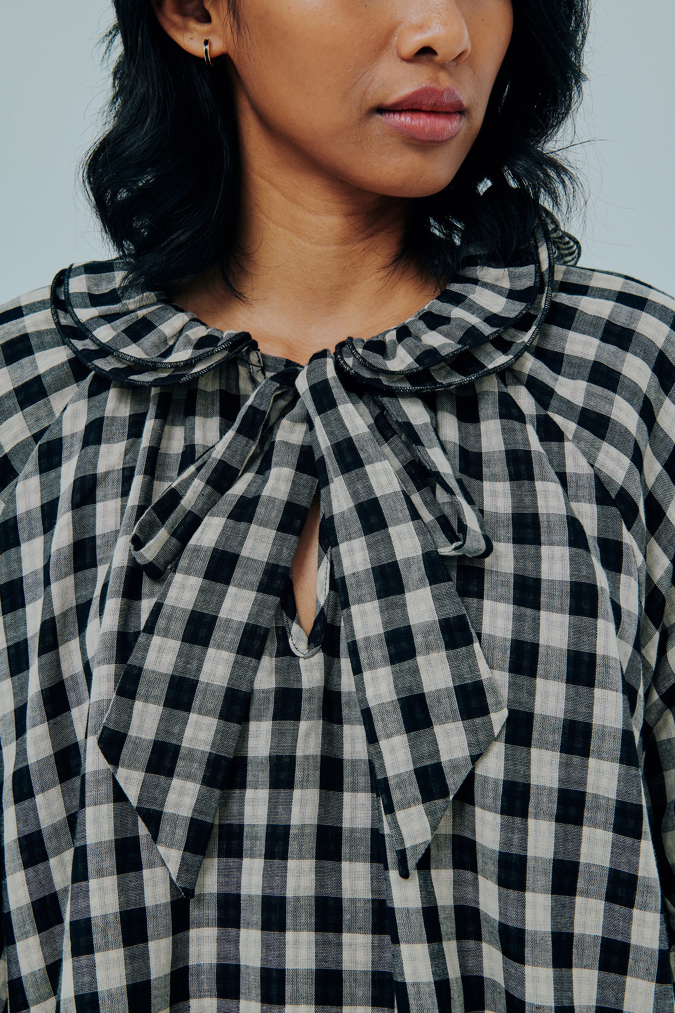 A relaxed fit, with round frilled neckline and tie closure. Featuring full-length sleeves, and an A-line flare. Rendered in gingham cotton gauze.