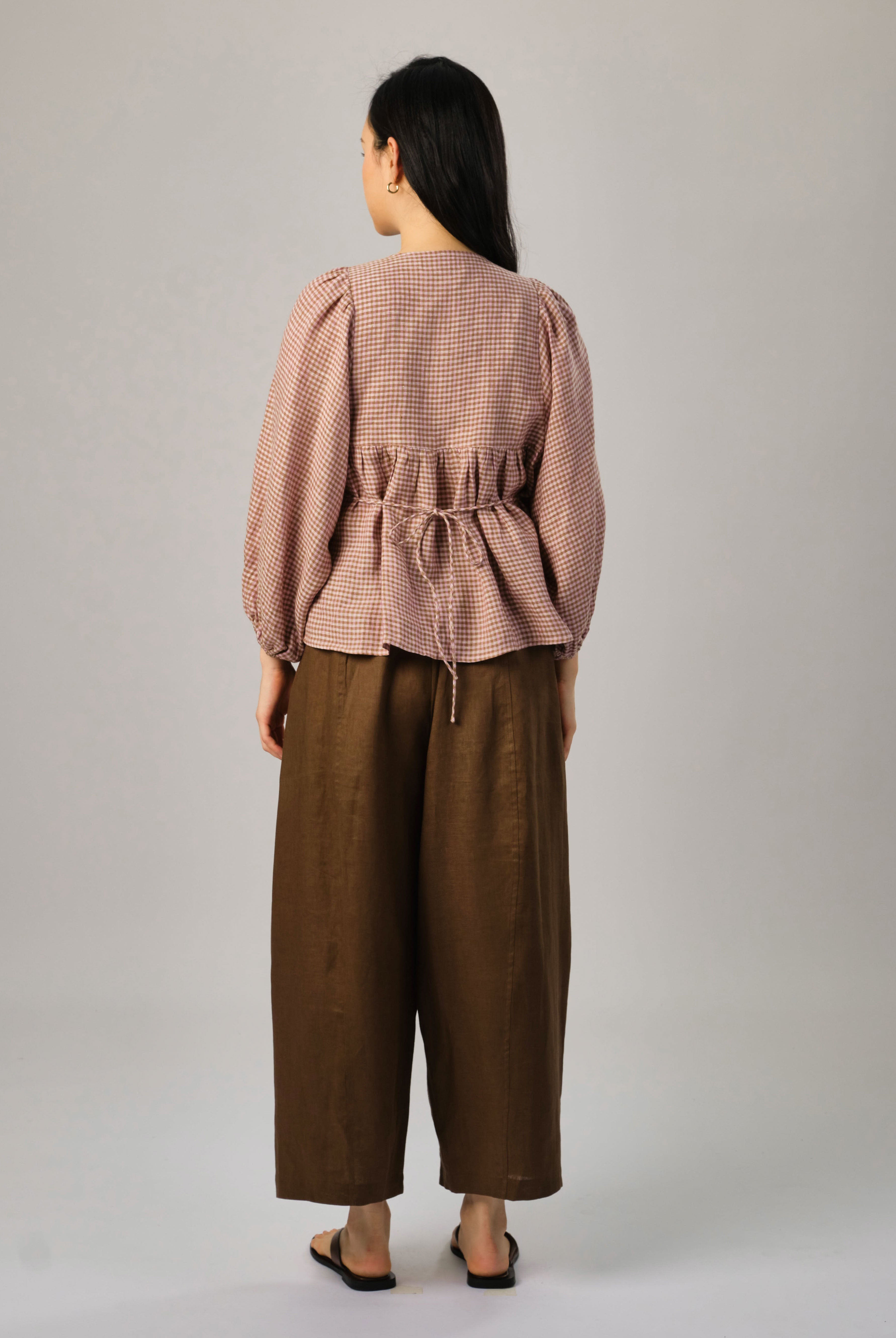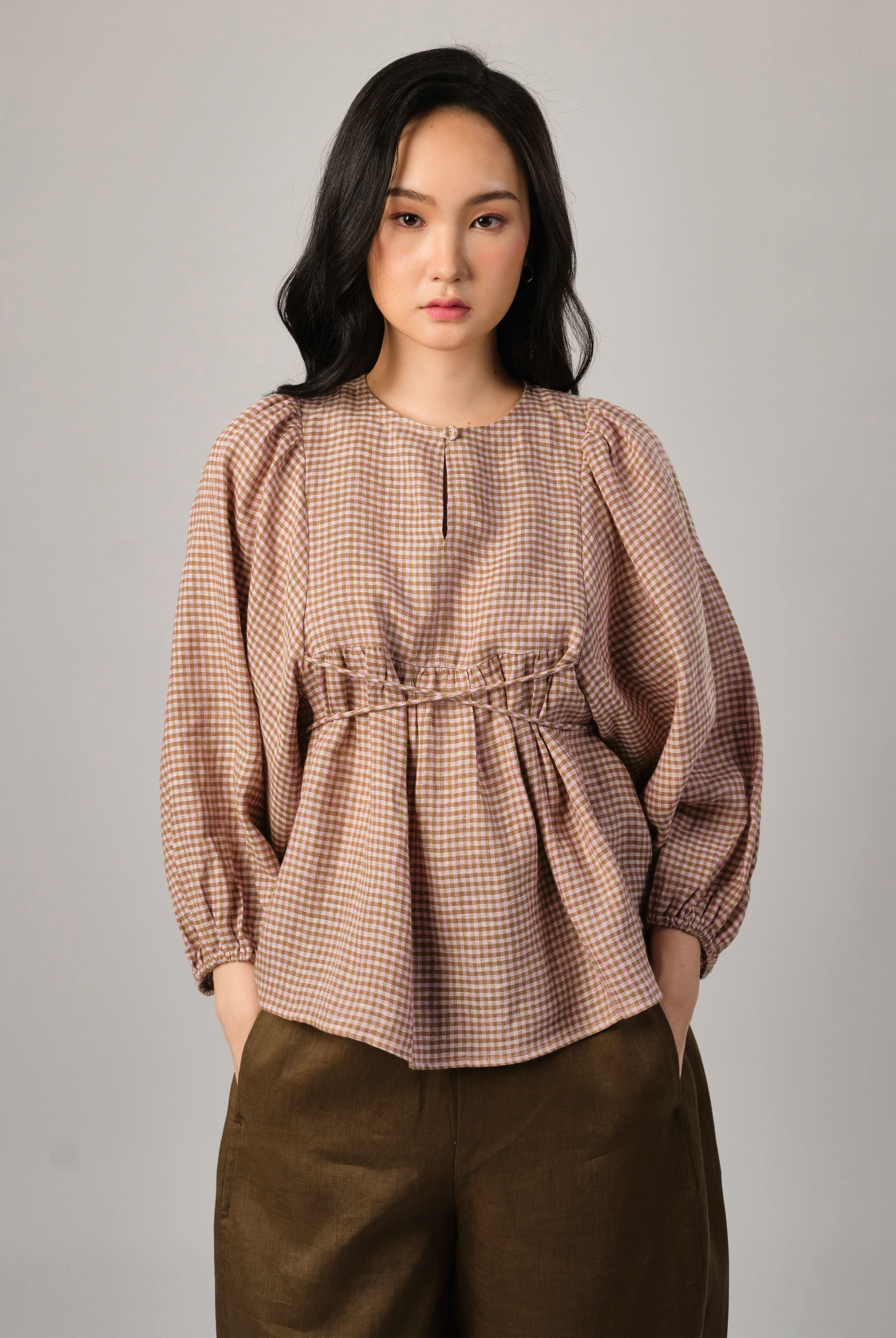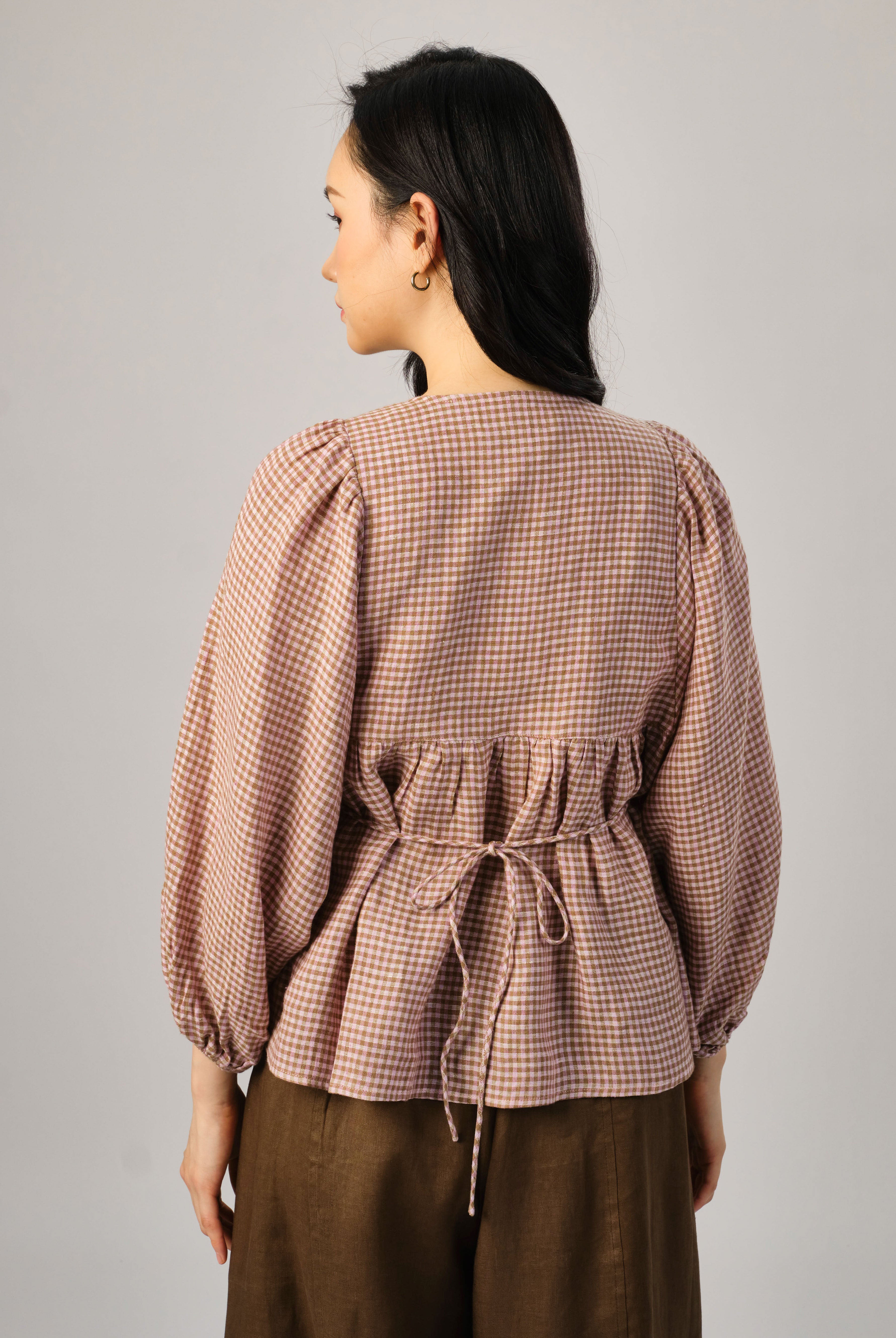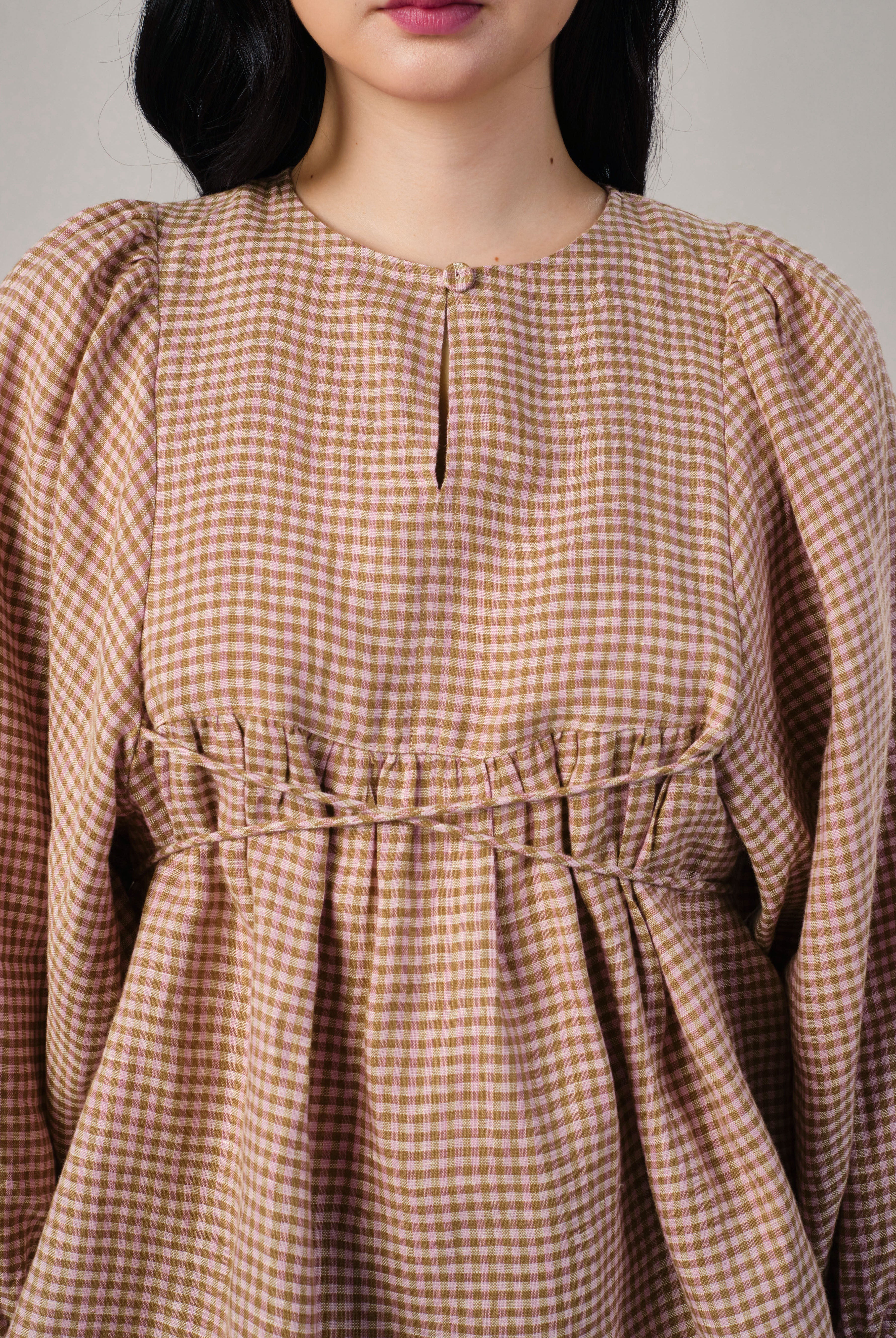 A blouse with a gathered bust, front opening button and voluminous puffed sleeves. Finished with adjustable straps for versatility. Rendered in linen, with gingham weave pattern.