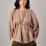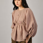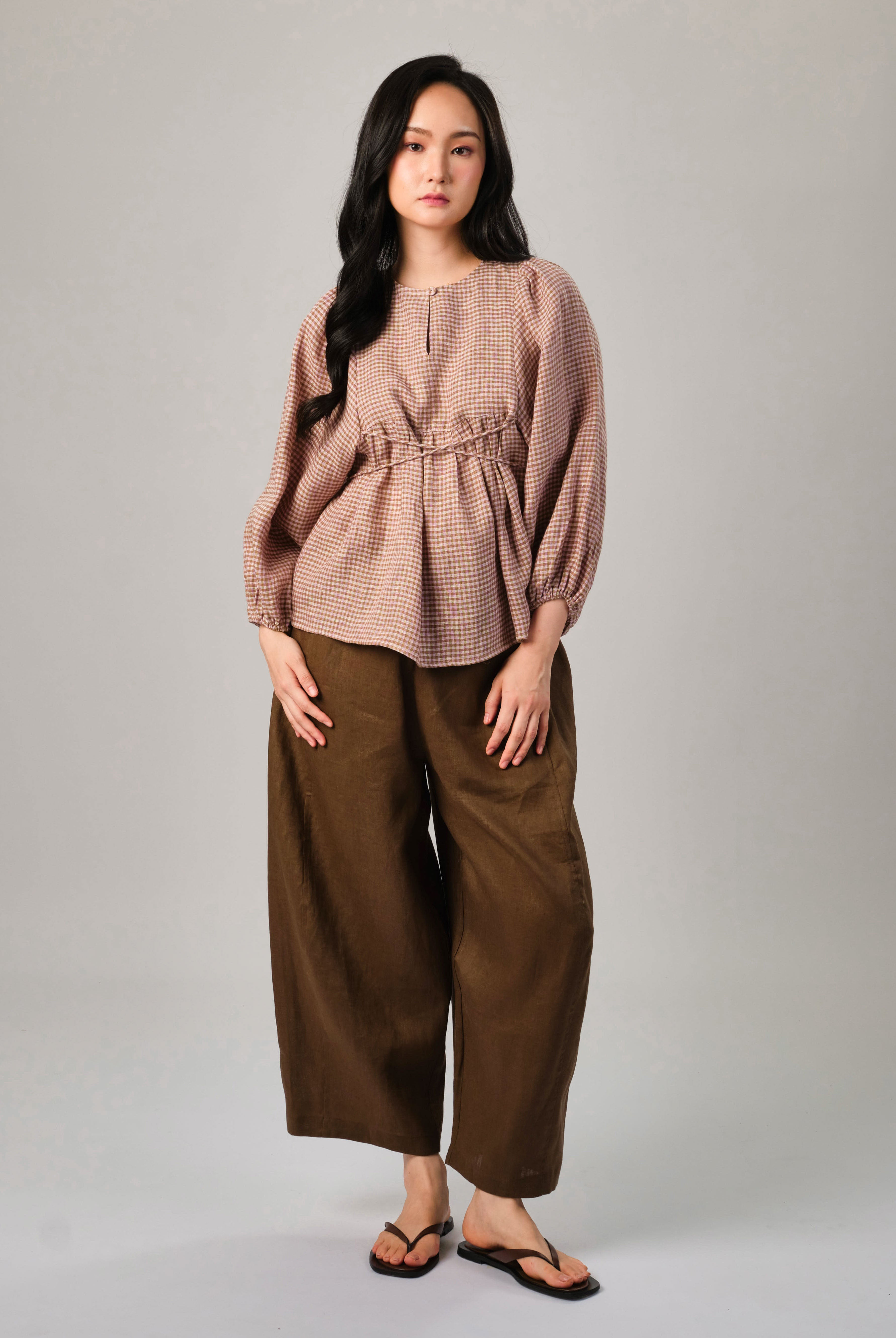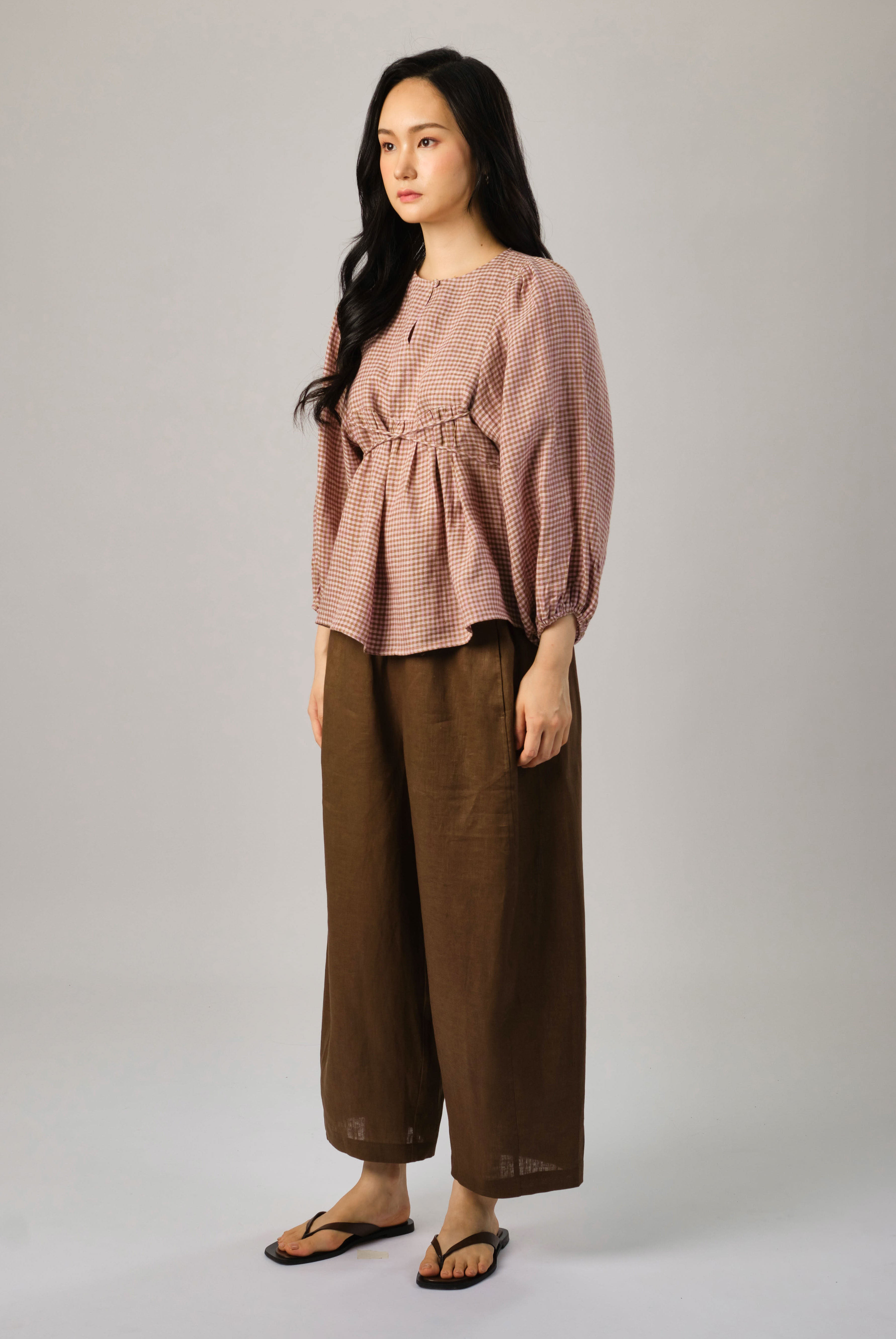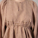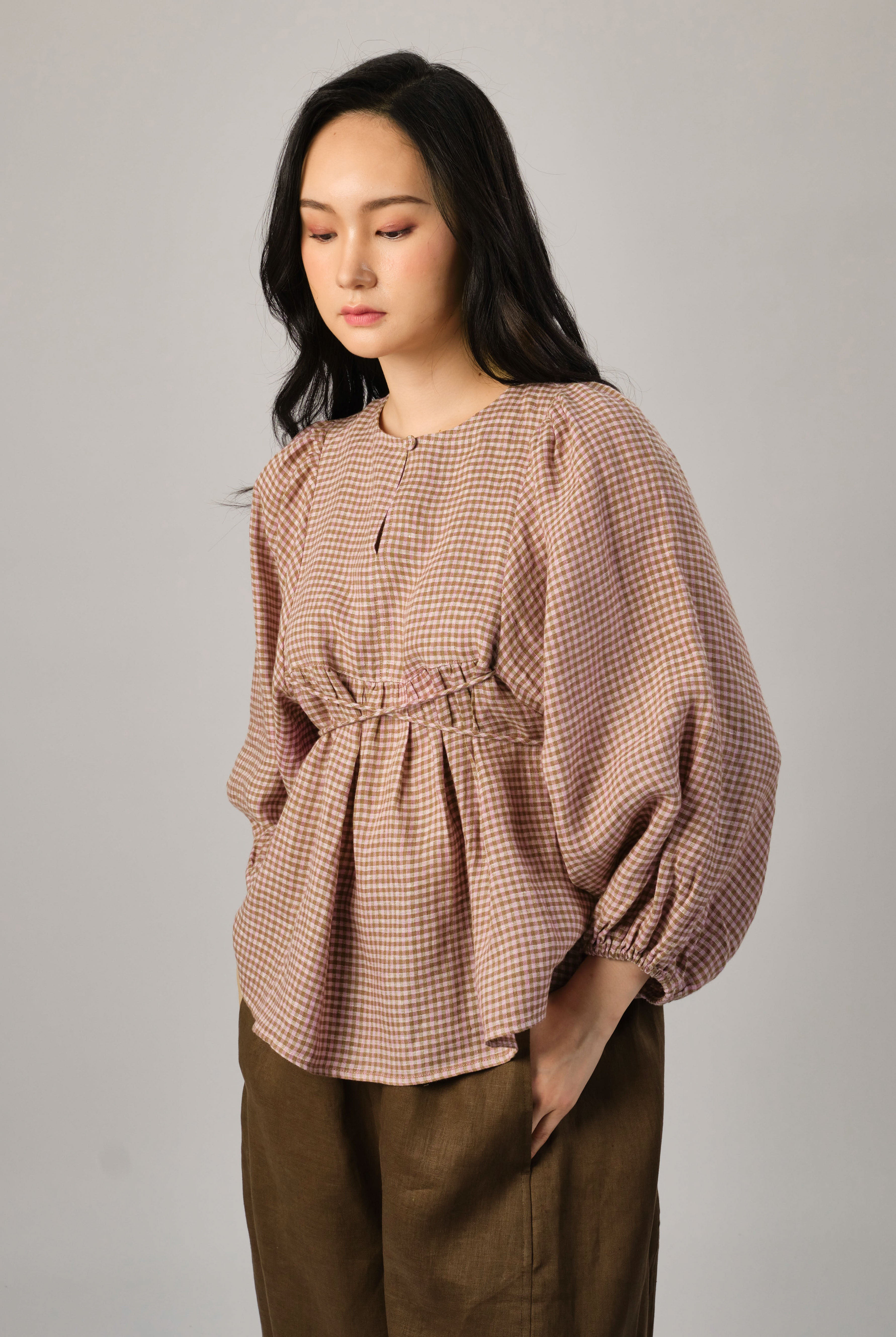 A blouse with a gathered bust, front opening button and voluminous puffed sleeves. Finished with adjustable straps for versatility. Rendered in linen, with gingham weave pattern.