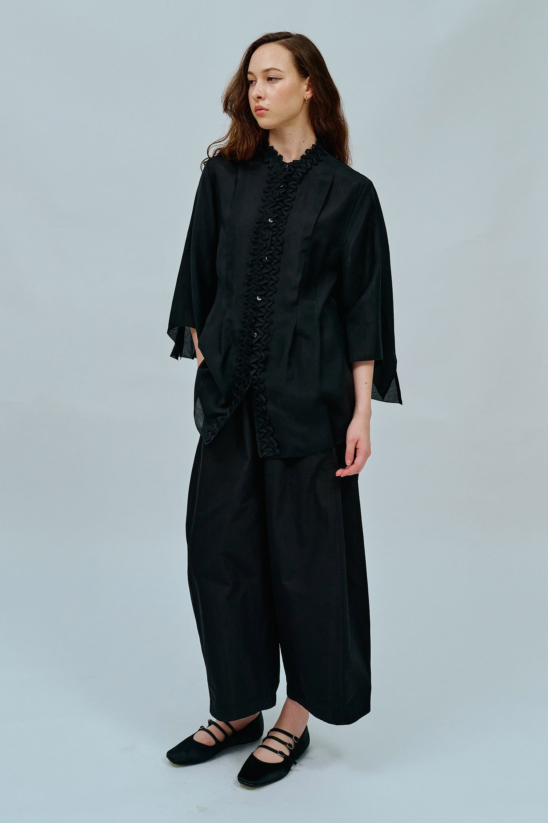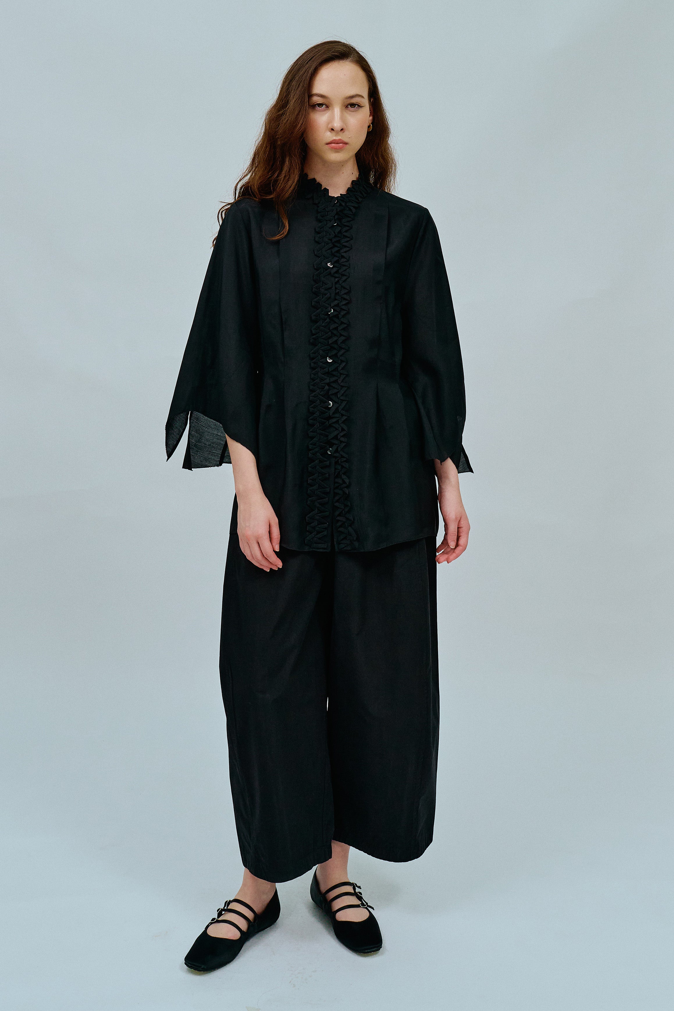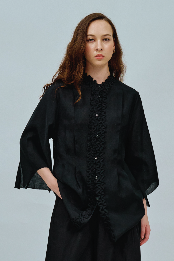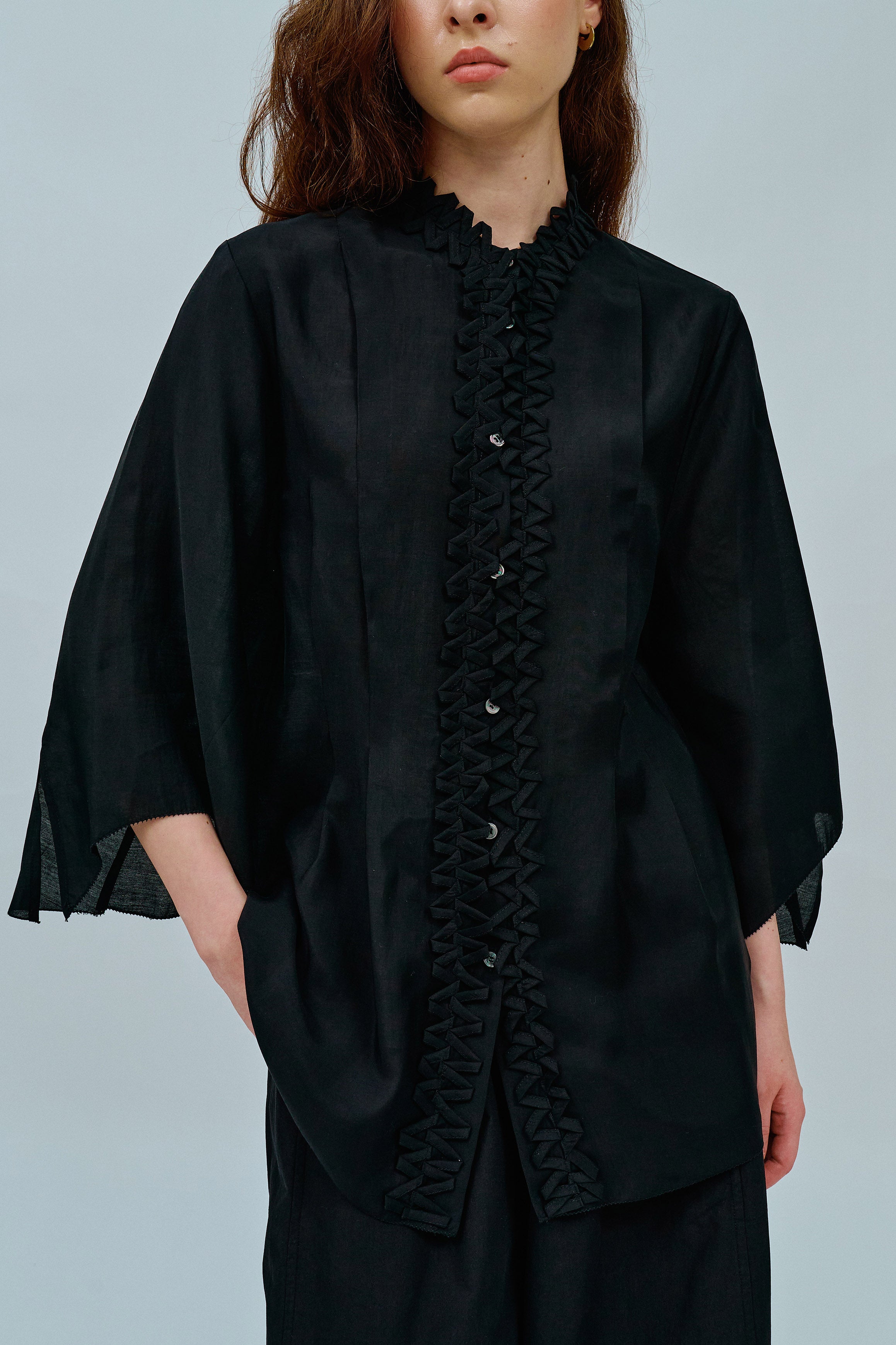 A shirt featuring a stand-up collar with wavy trims that trace the button band. Designed with form-flattering pleats at the front and back, and A-line sleeves with an uneven hem. Finished with an eyelash-stitch trim to add the right accent.