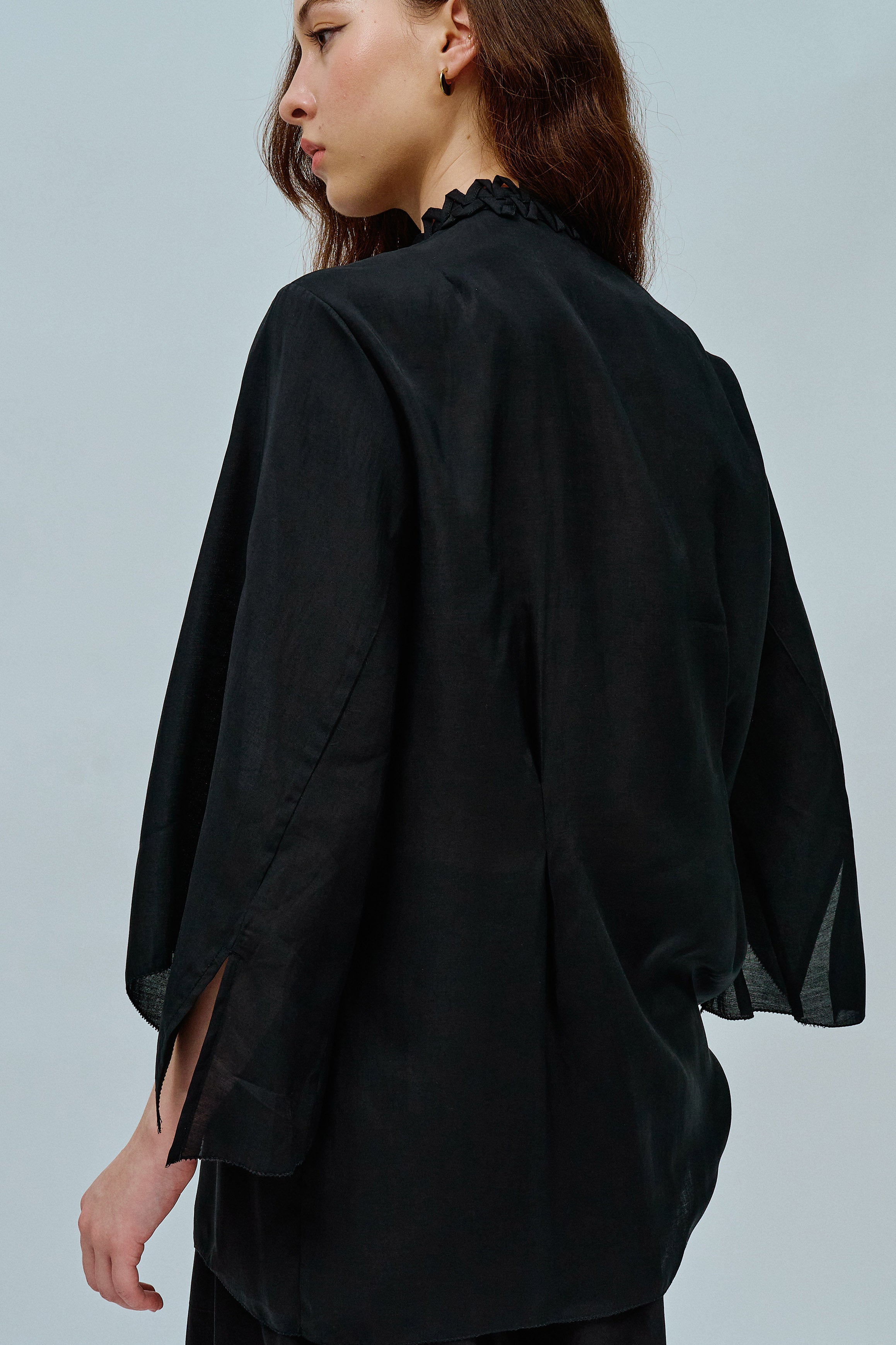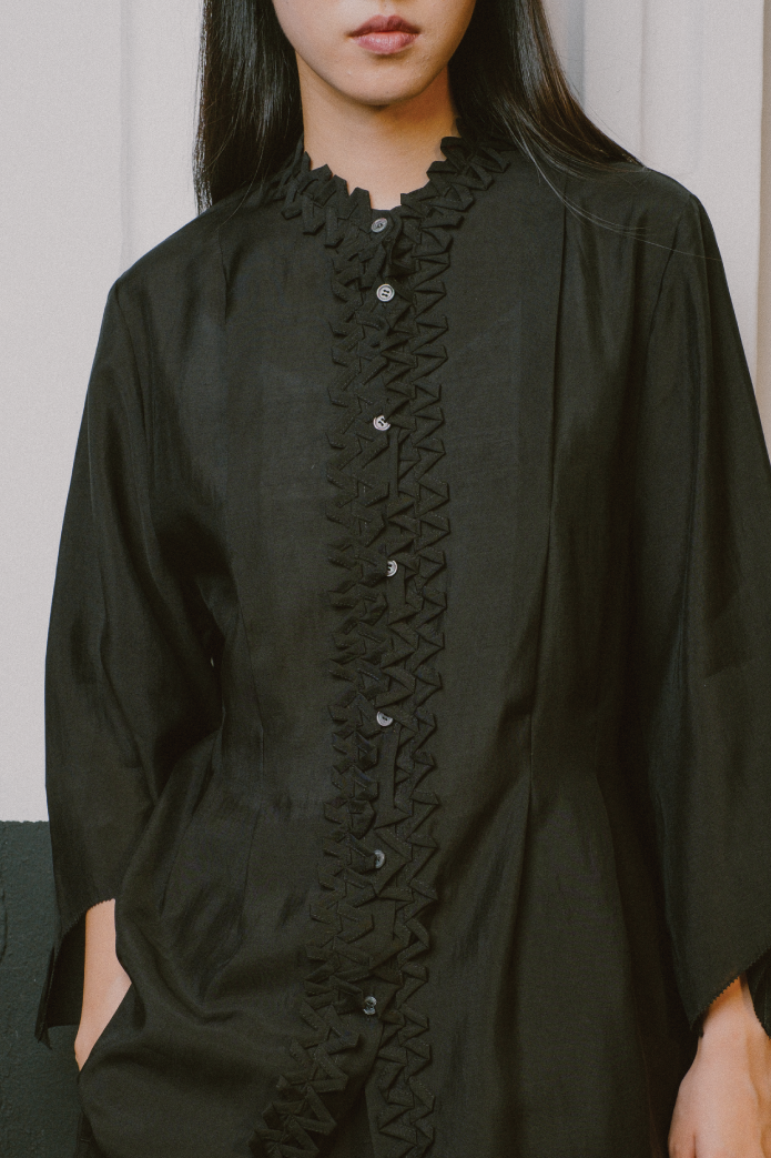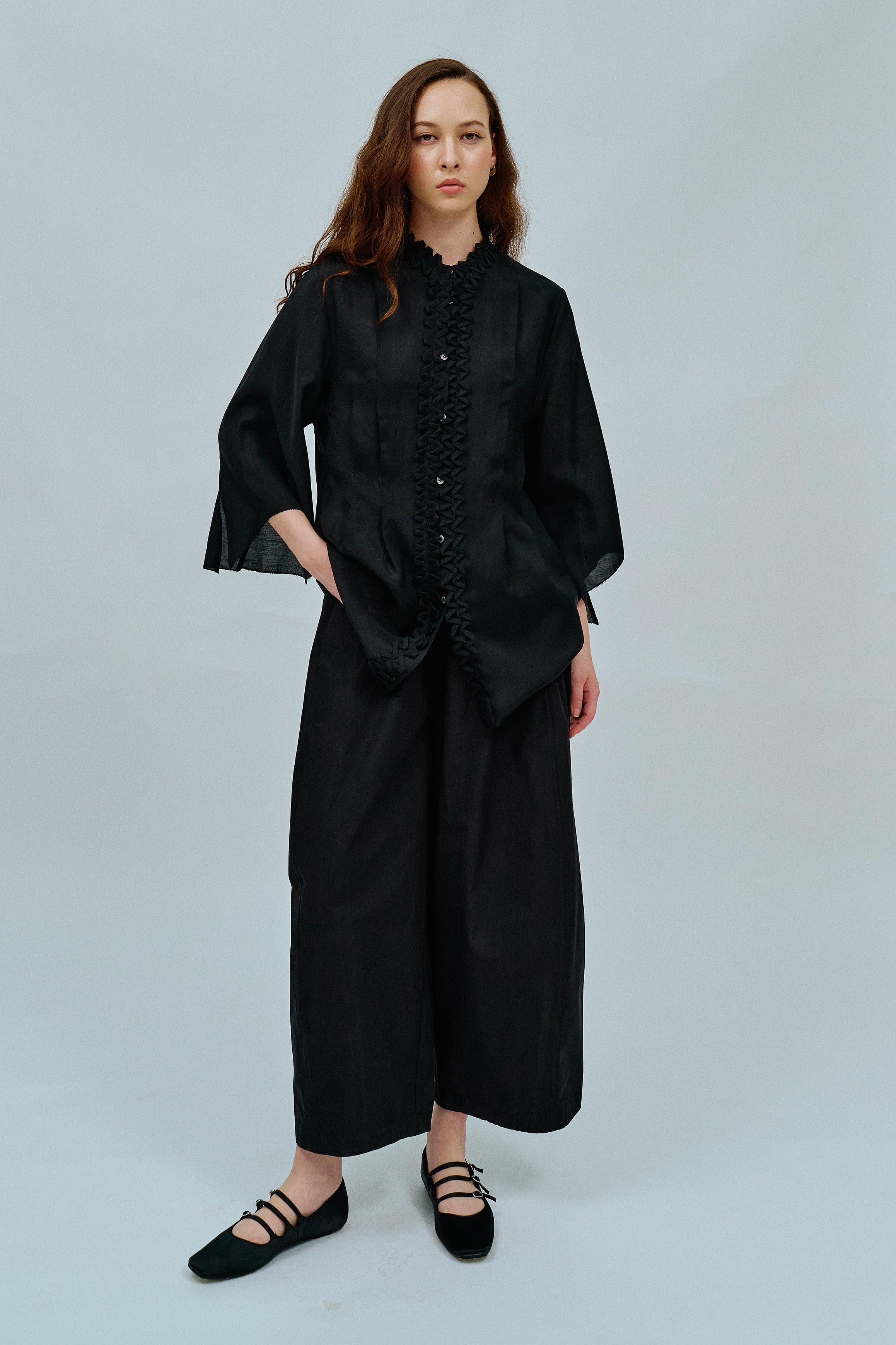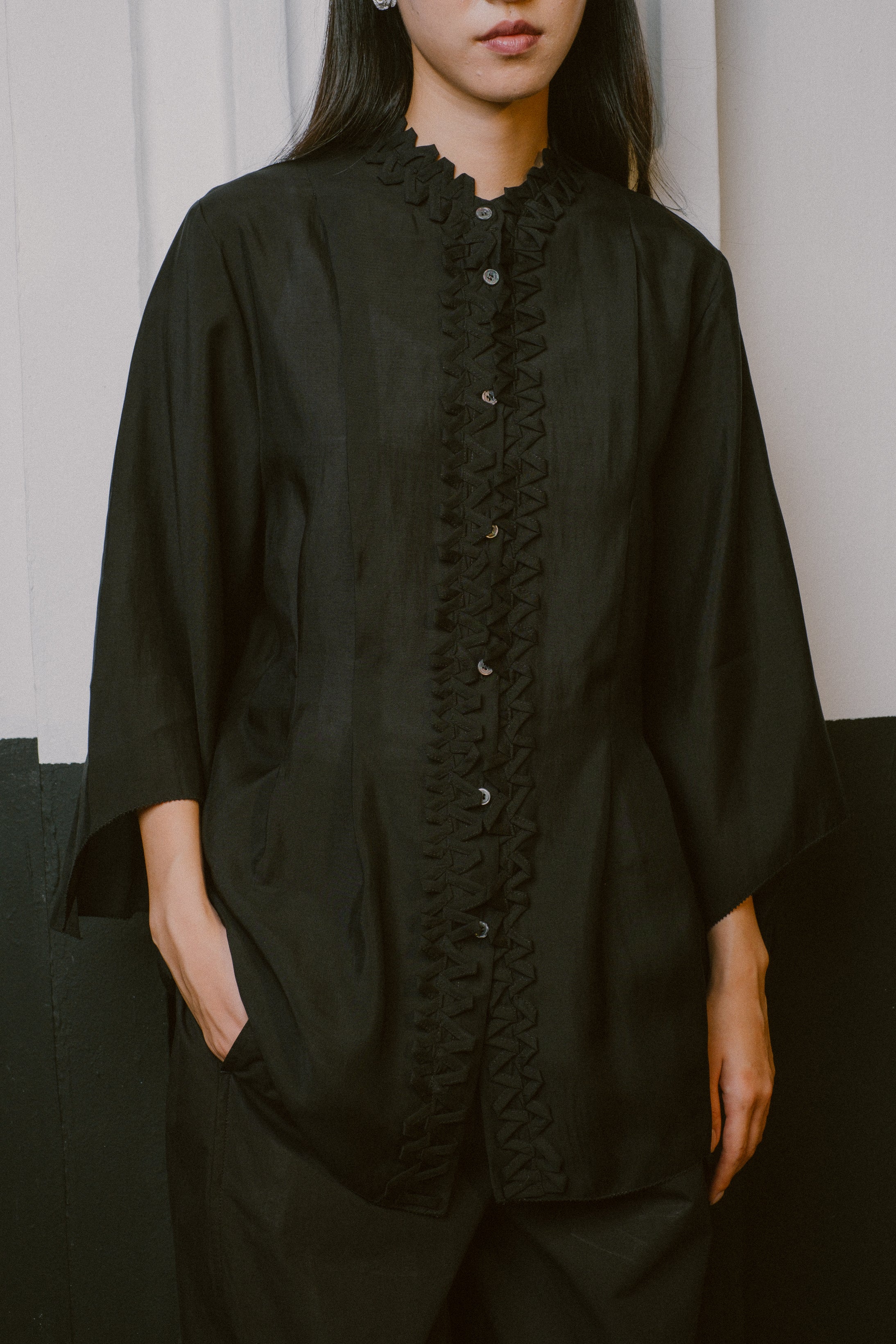 A shirt featuring a stand-up collar with wavy trims that trace the button band. Designed with form-flattering pleats at the front and back, and A-line sleeves with an uneven hem. Finished with an eyelash-stitch trim to add the right accent.