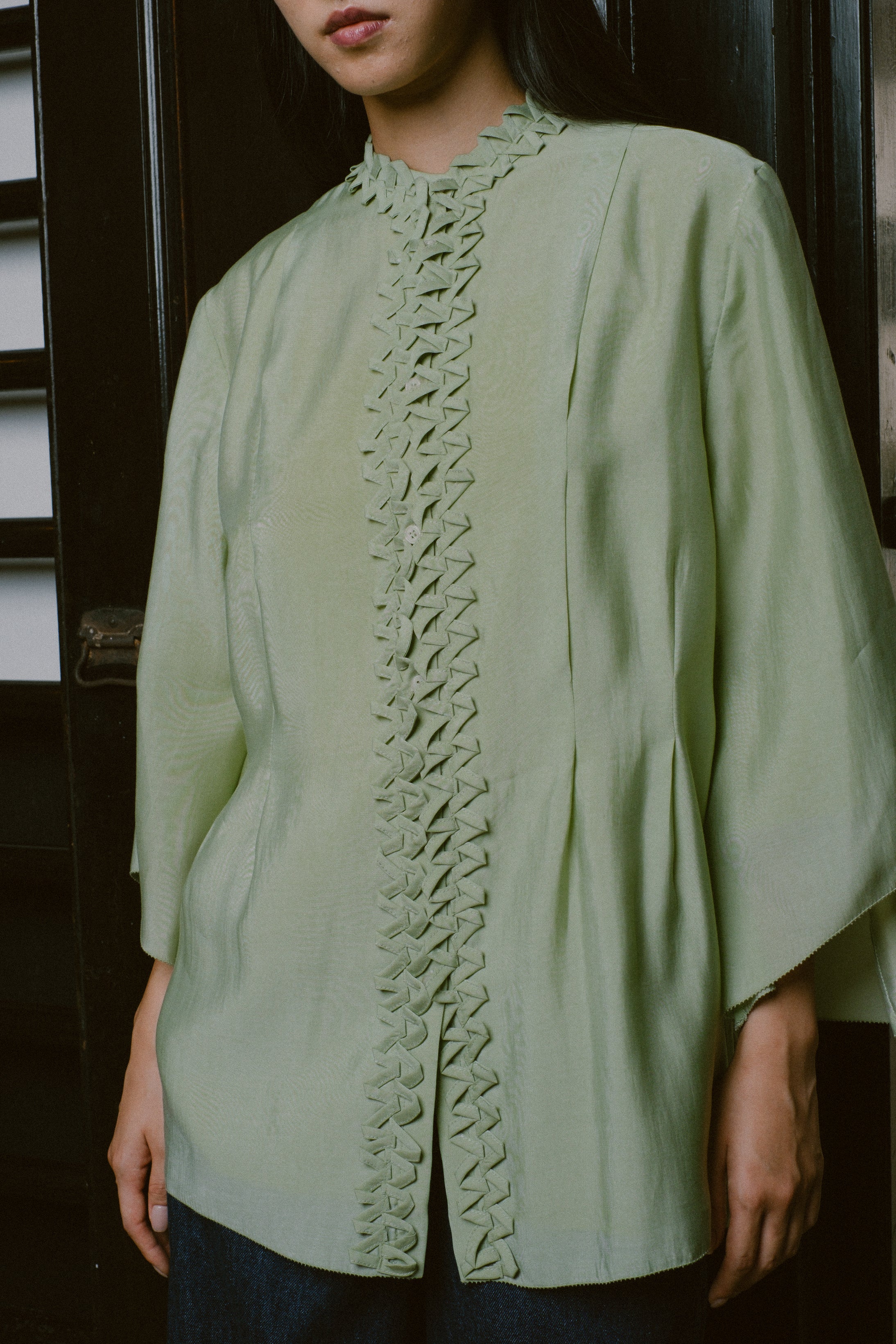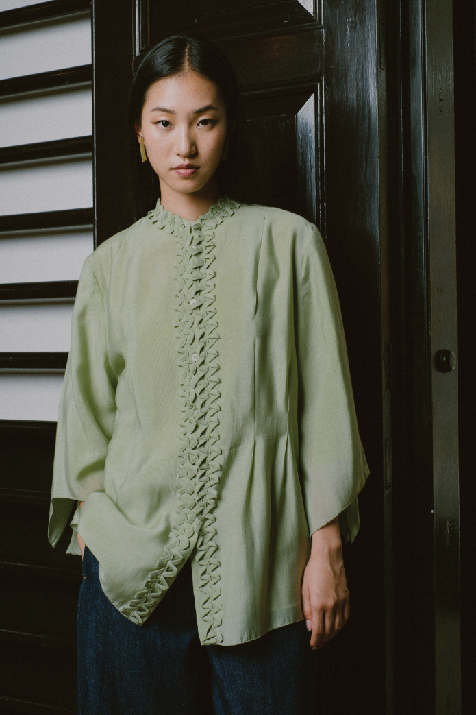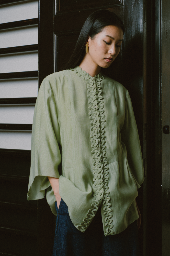 A shirt featuring a stand-up collar with wavy trims that trace the button band. Designed with form-flattering pleats at the front and back, and A-line sleeves with an uneven hem. Finished with an eyelash-stitch trim to add the right accent.