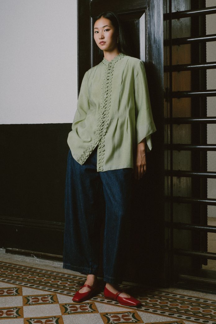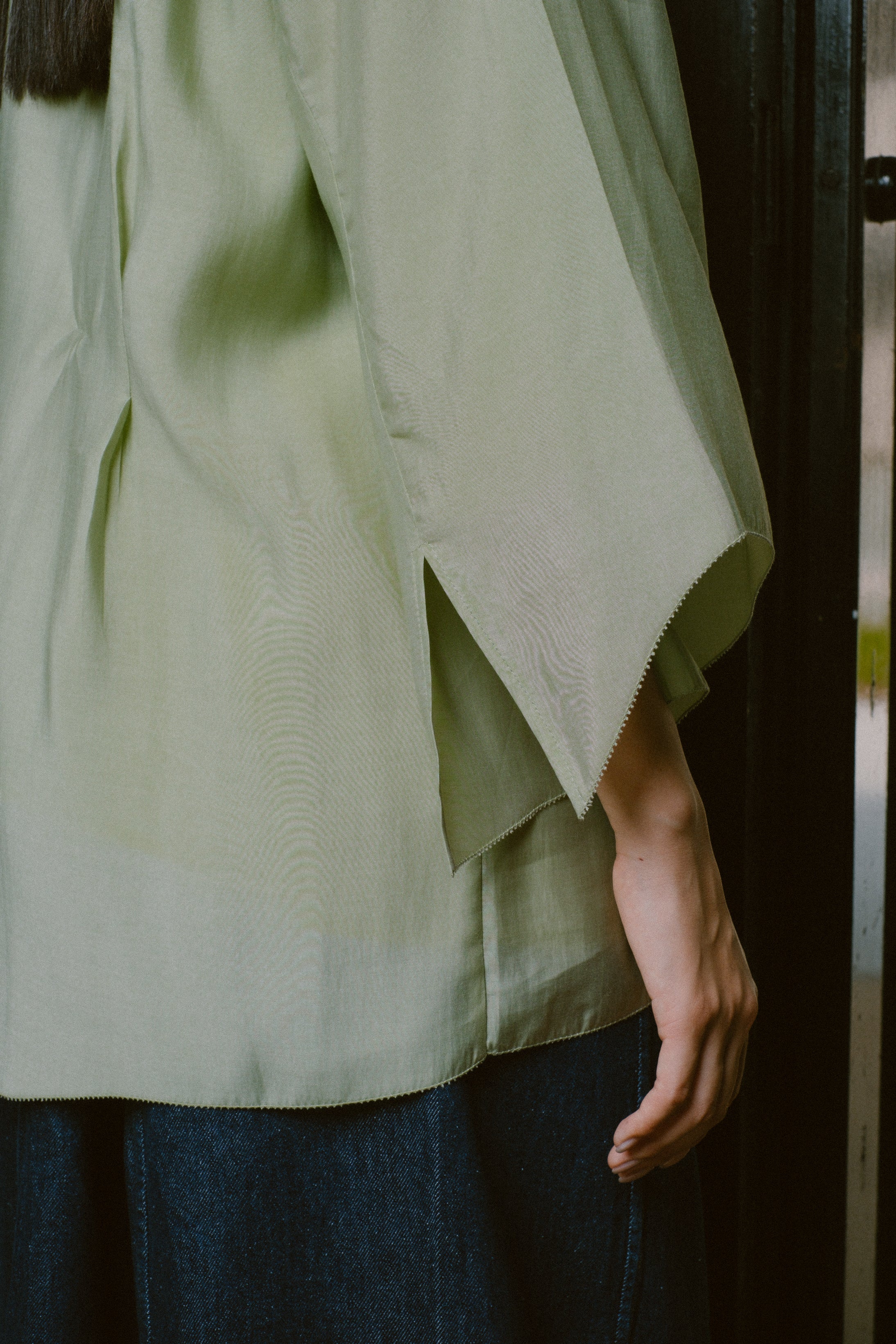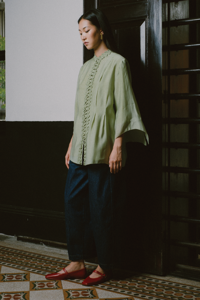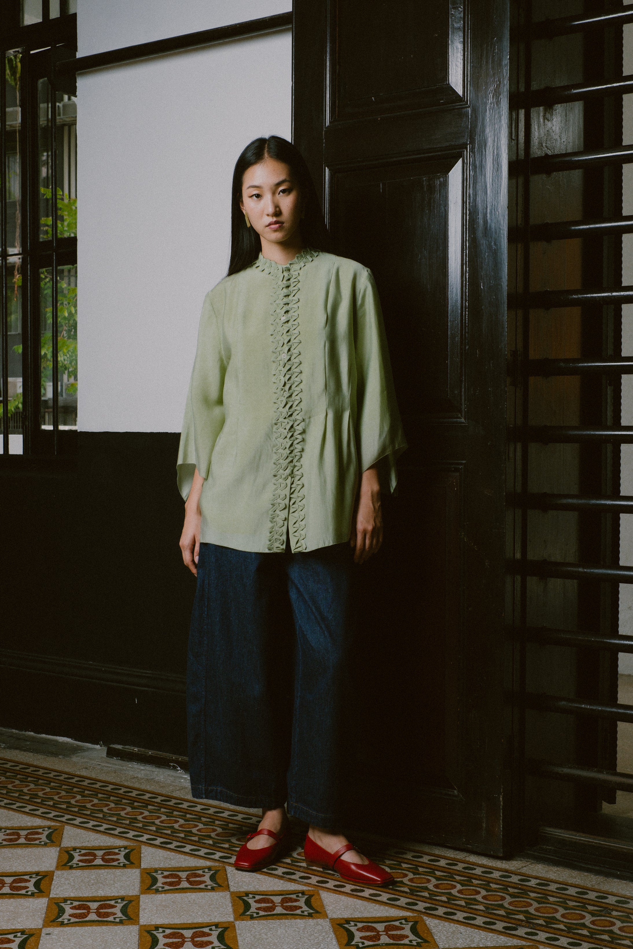 A shirt featuring a stand-up collar with wavy trims that trace the button band. Designed with form-flattering pleats at the front and back, and A-line sleeves with an uneven hem. Finished with an eyelash-stitch trim to add the right accent.