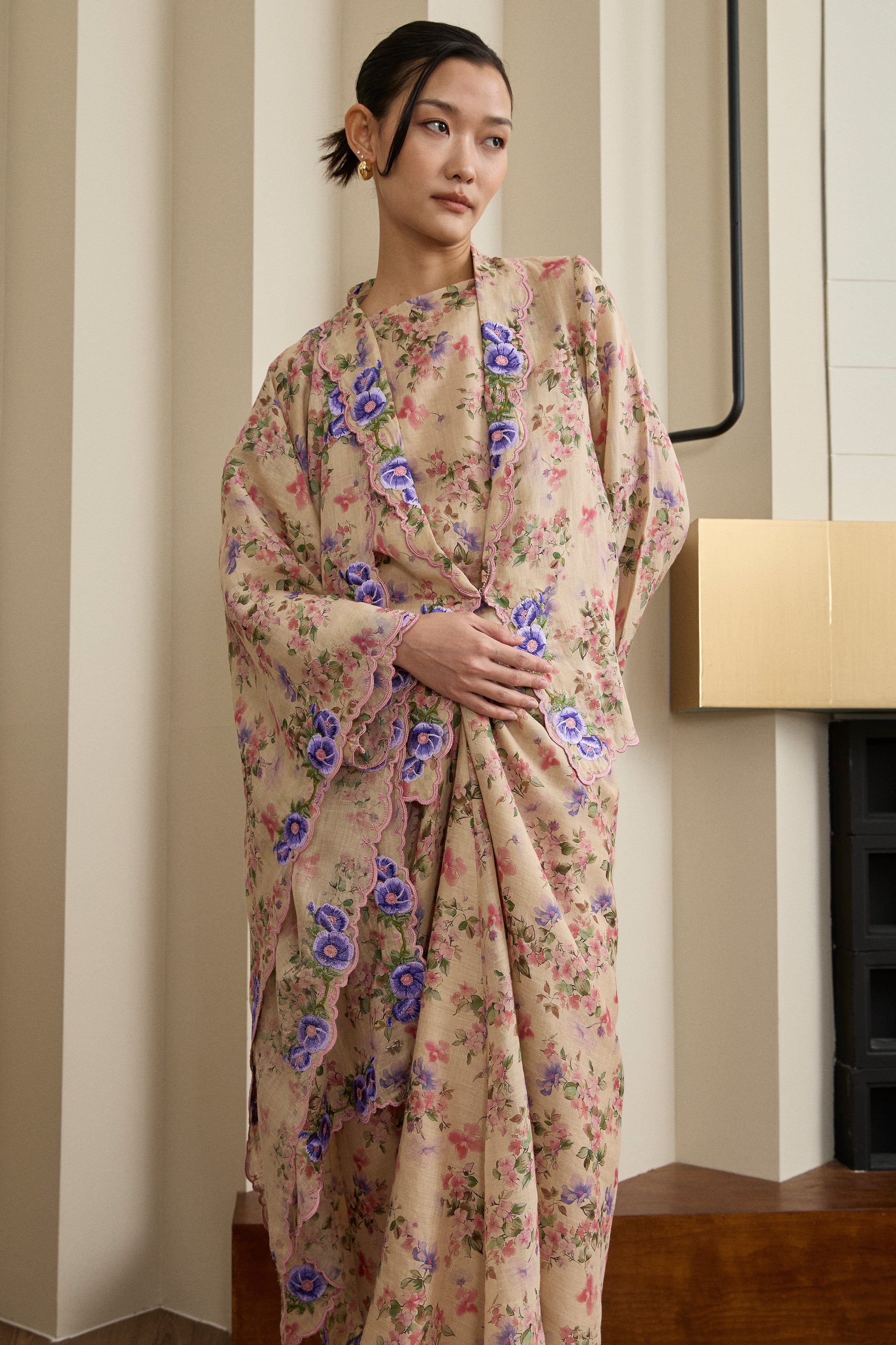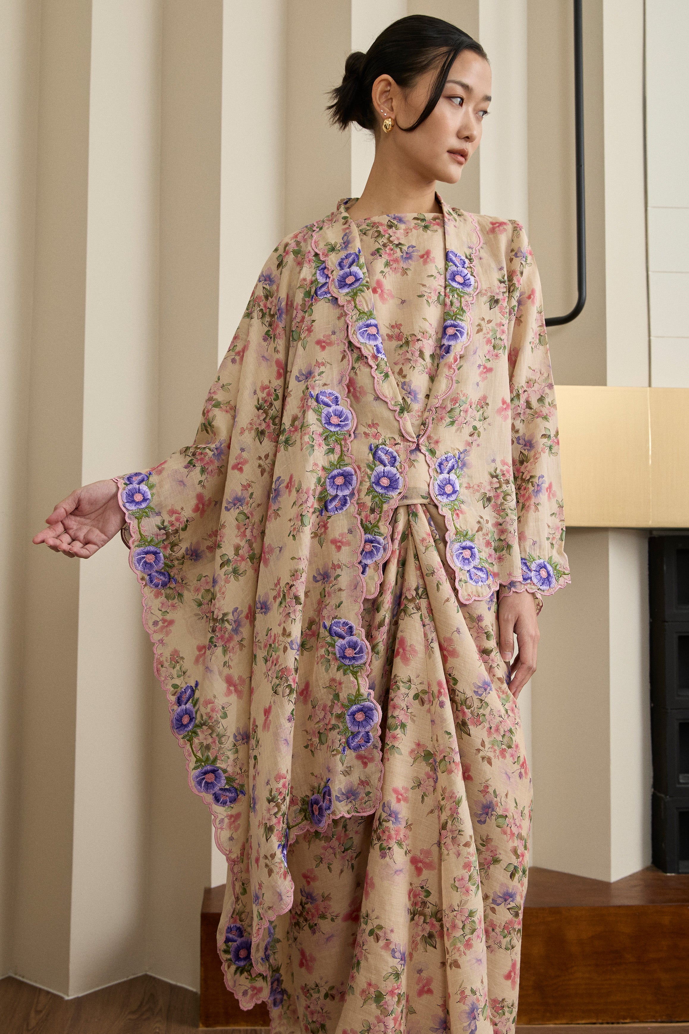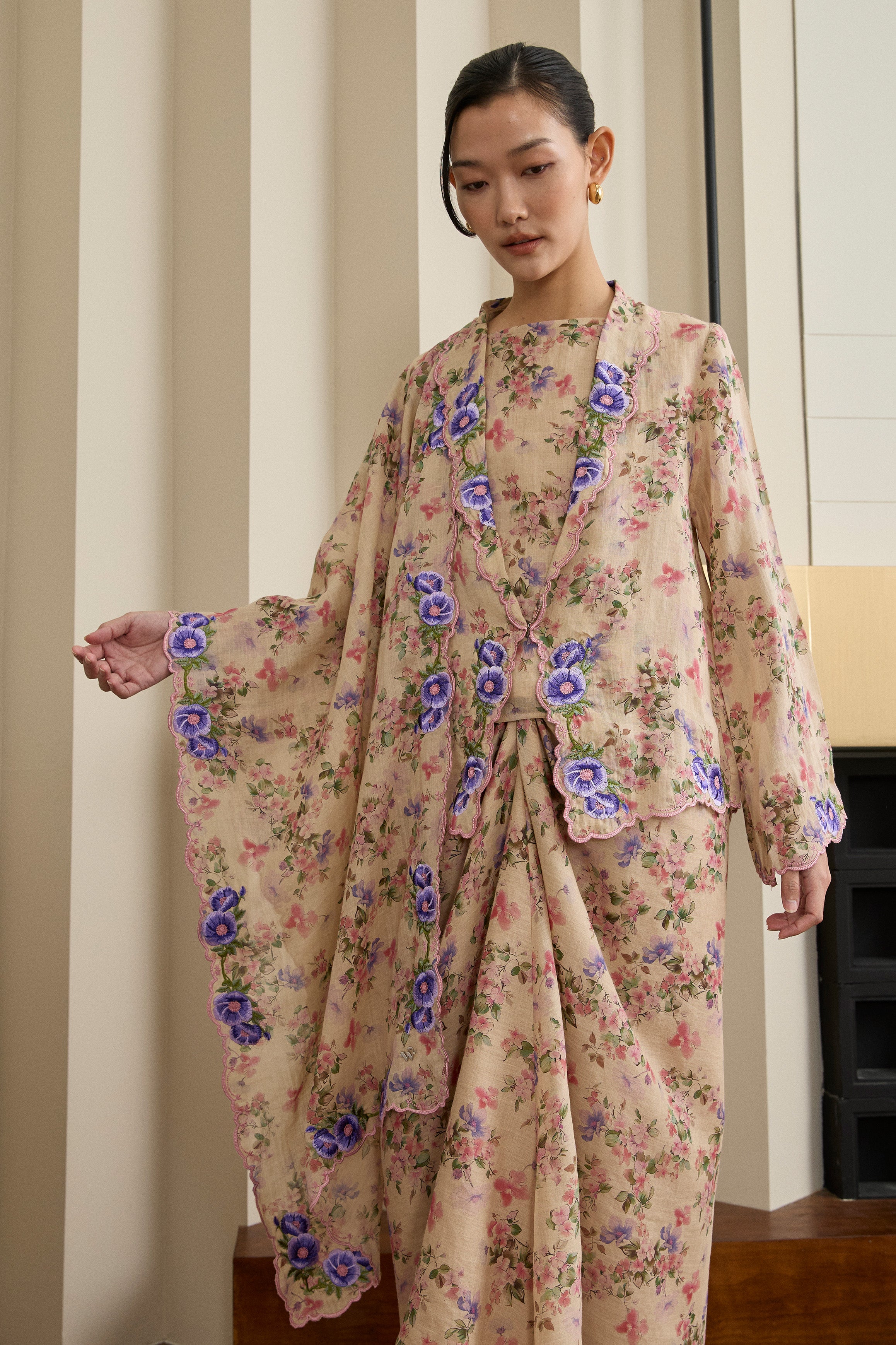 A refined essential, rendered in ramie. This selendang is framed with Intricate multicolour embroidery in floral motif. Finished with a subtle W metal logo. Wear it on shoulder or as a headscarf to show it off to full effect.