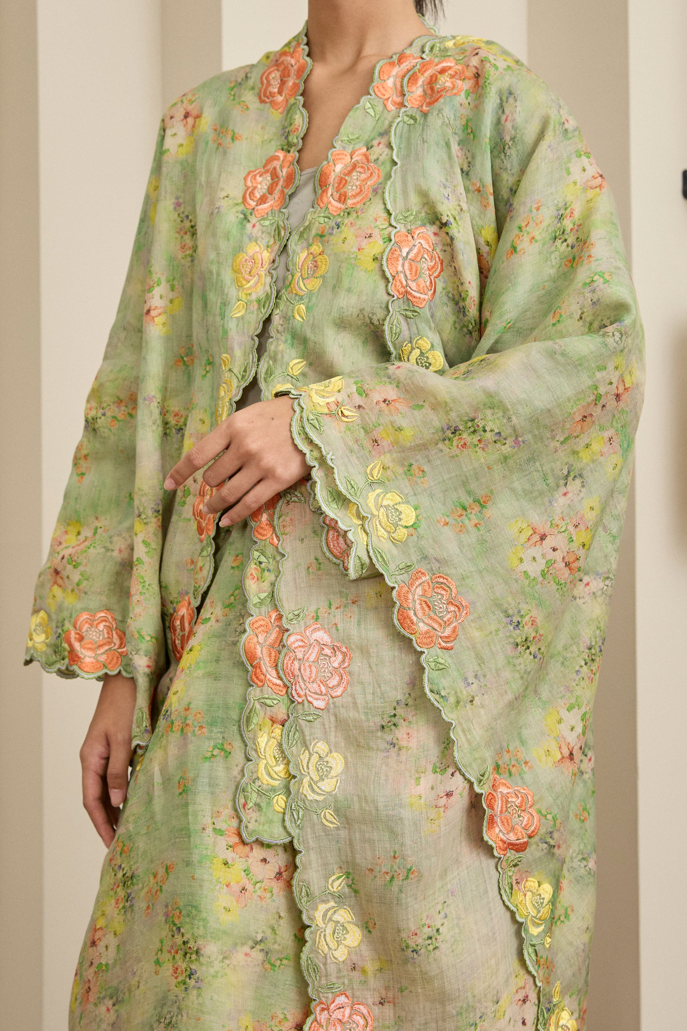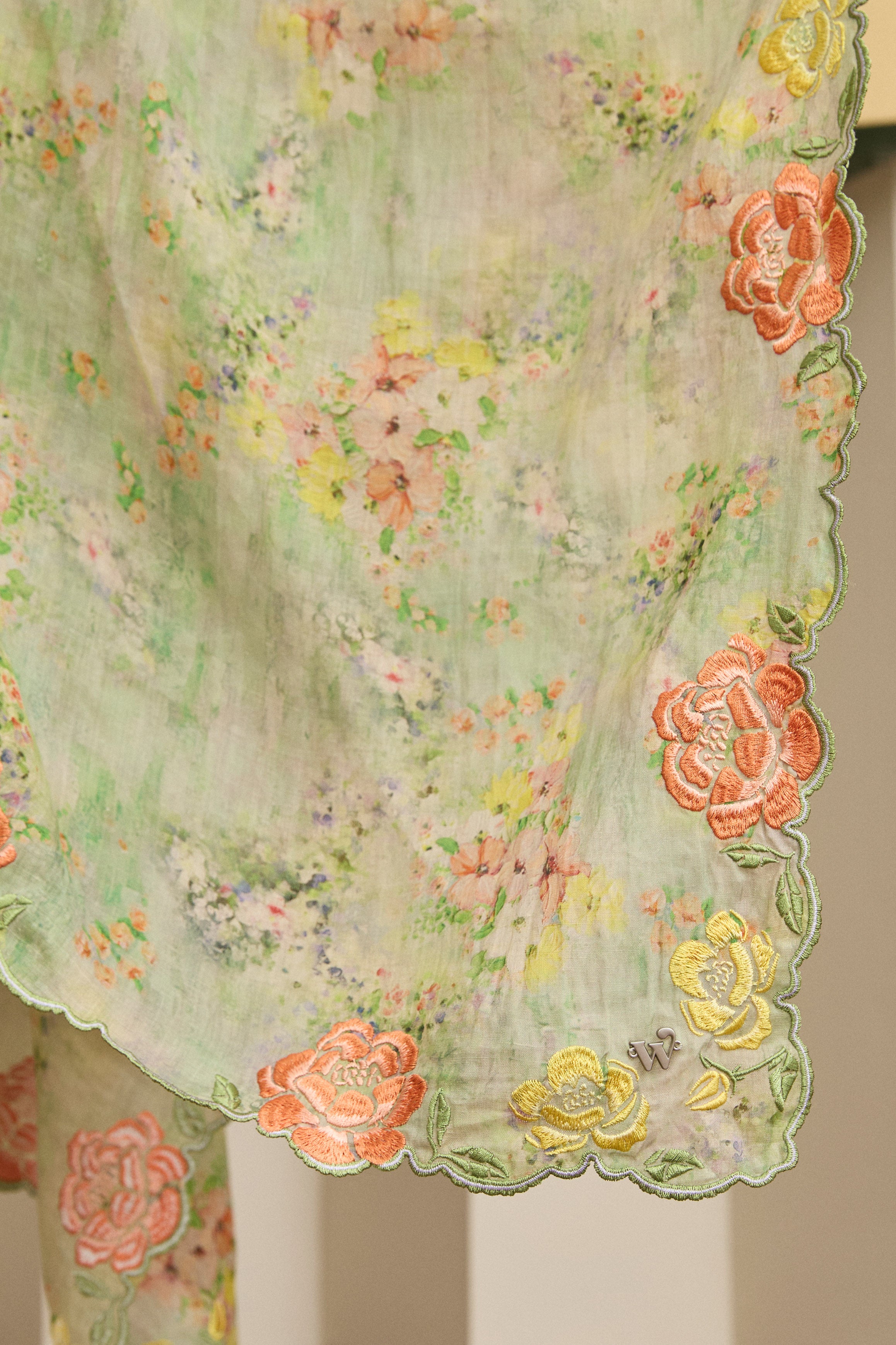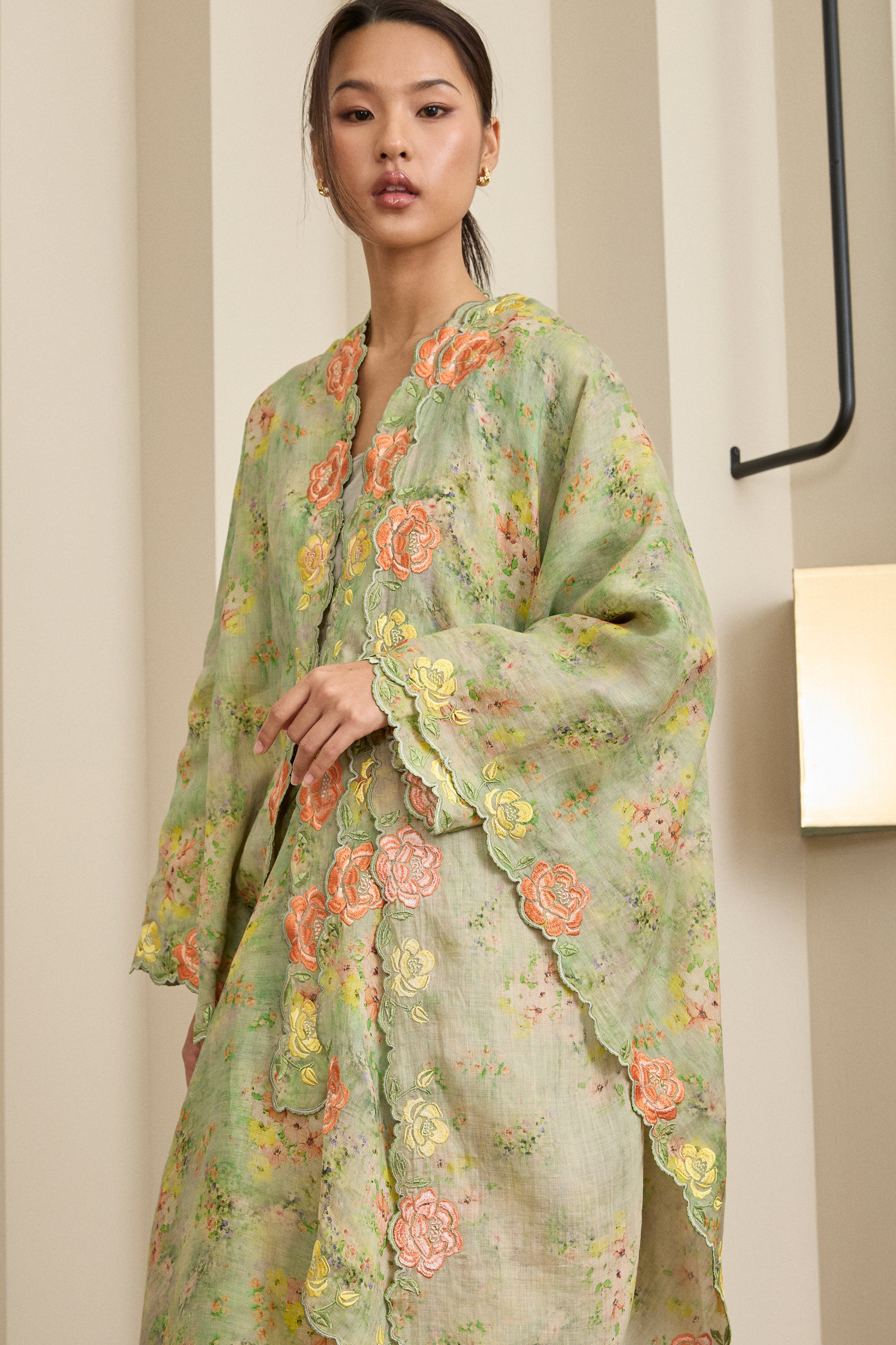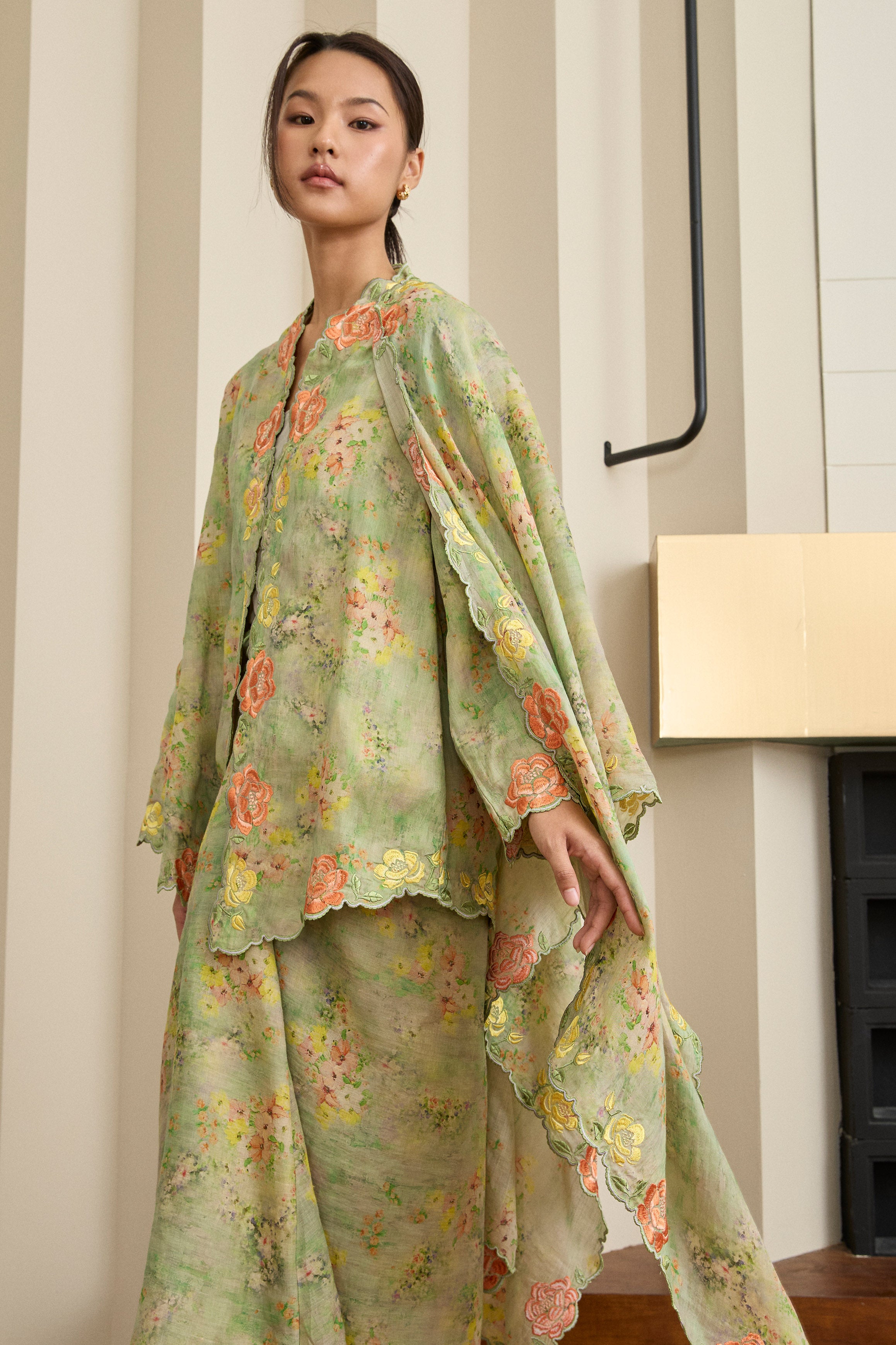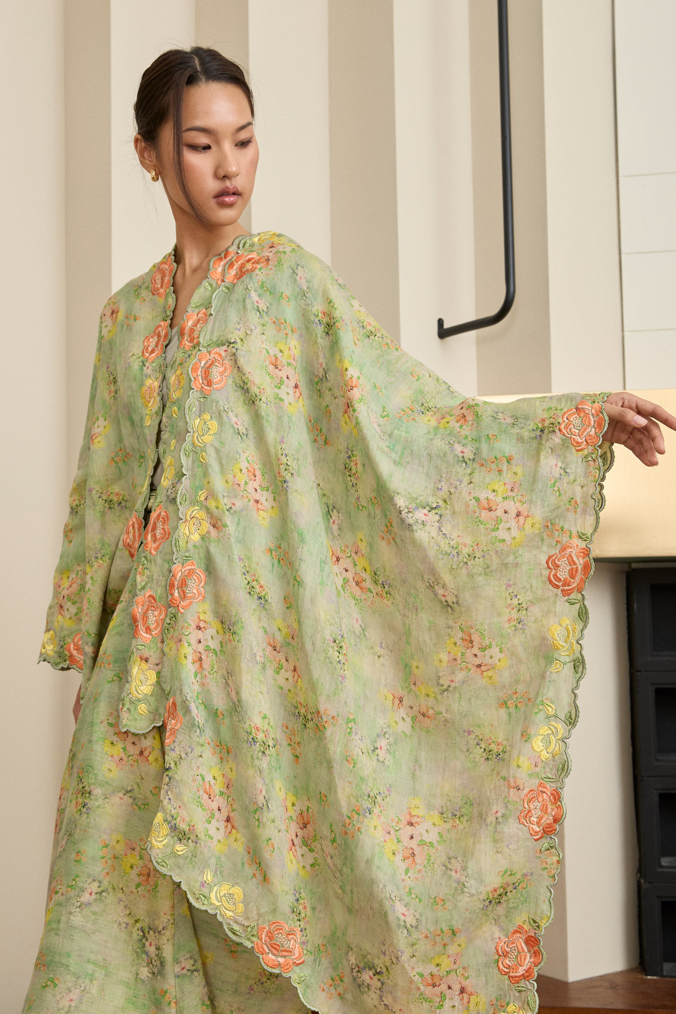 A refined essential, rendered in ramie. This selendang is framed with Intricate multicolour embroidery in floral motif. Finished with a subtle W metal logo. Wear it on shoulder or as a headscarf to show it off to full effect.