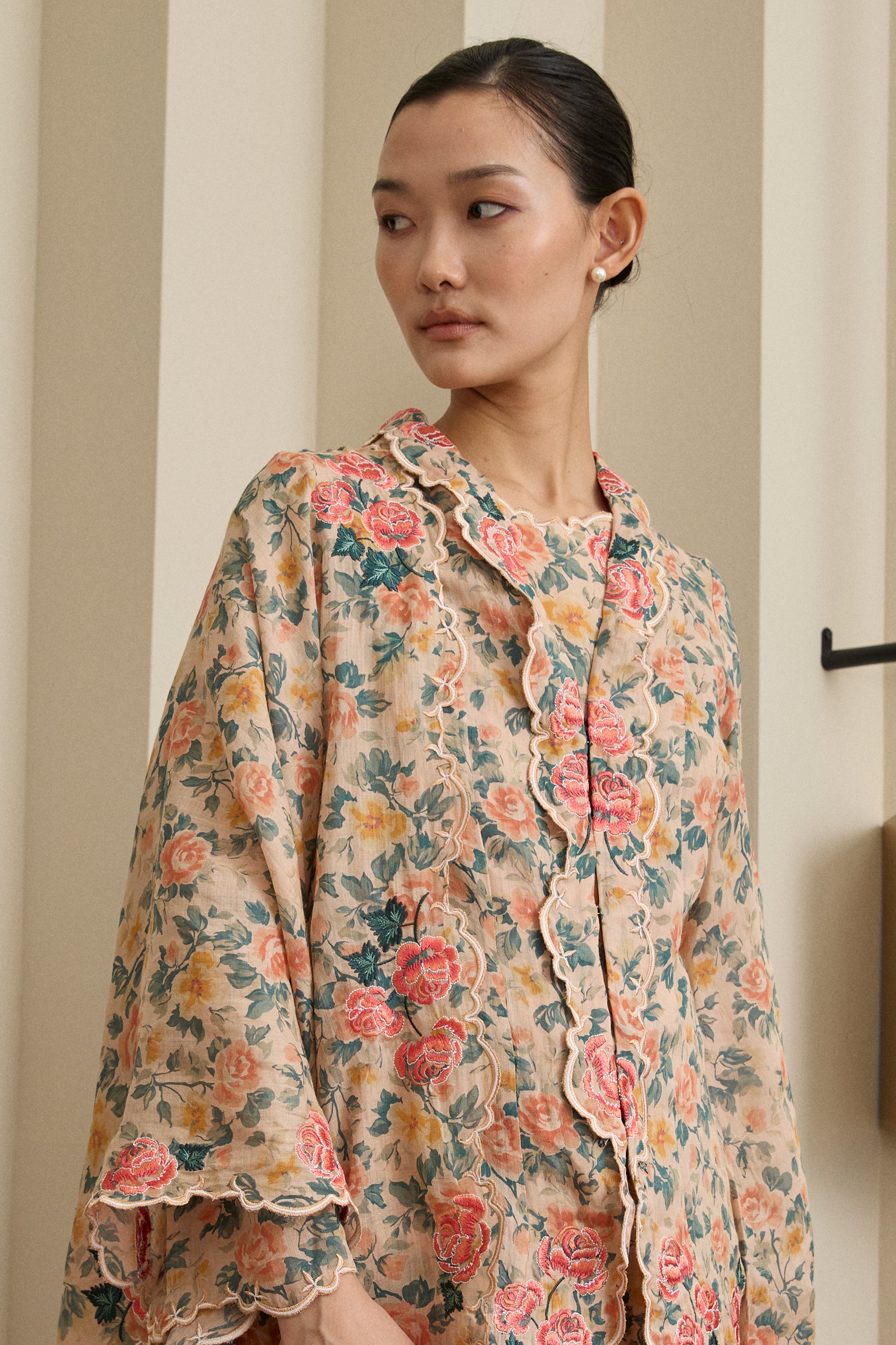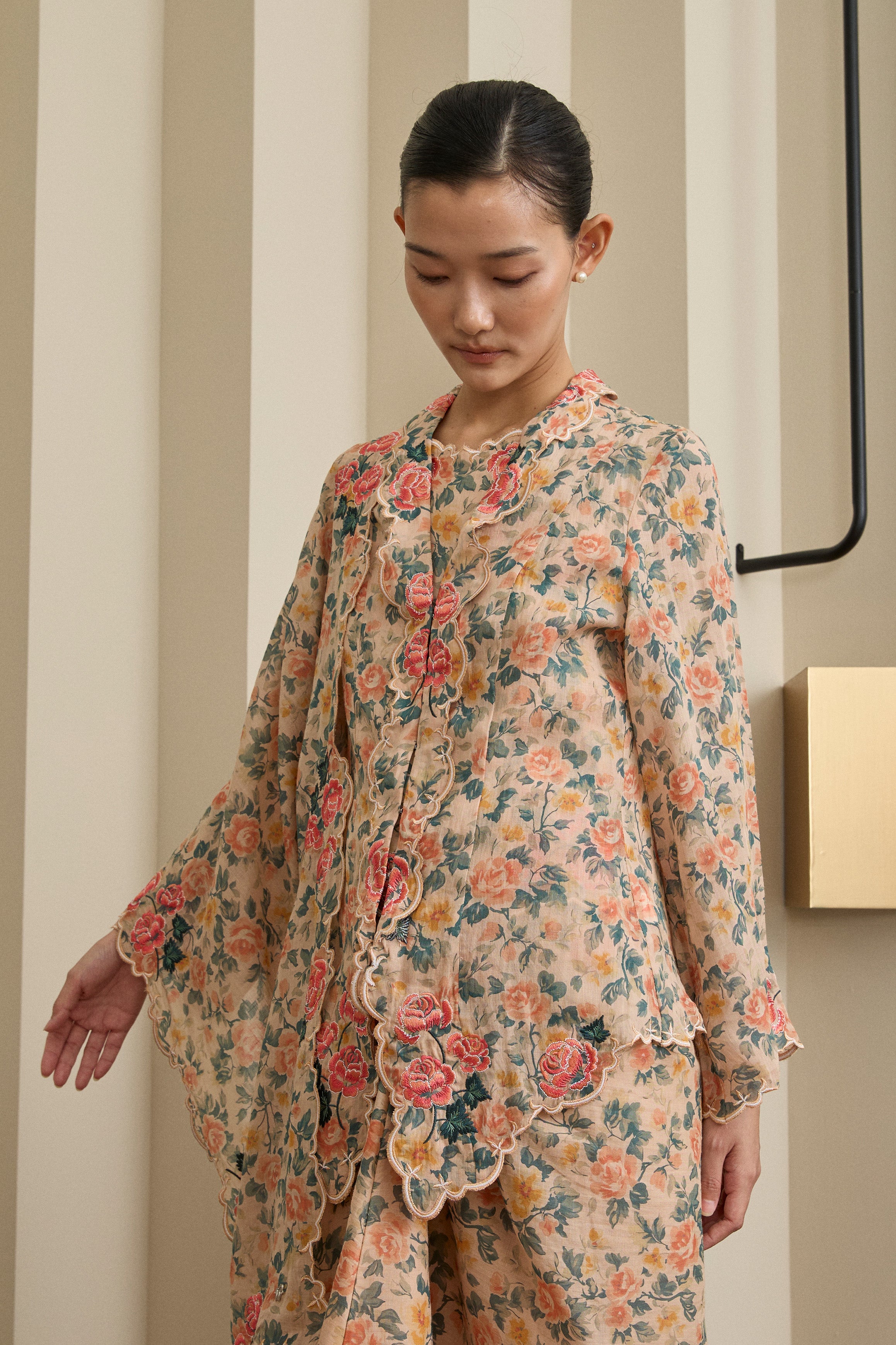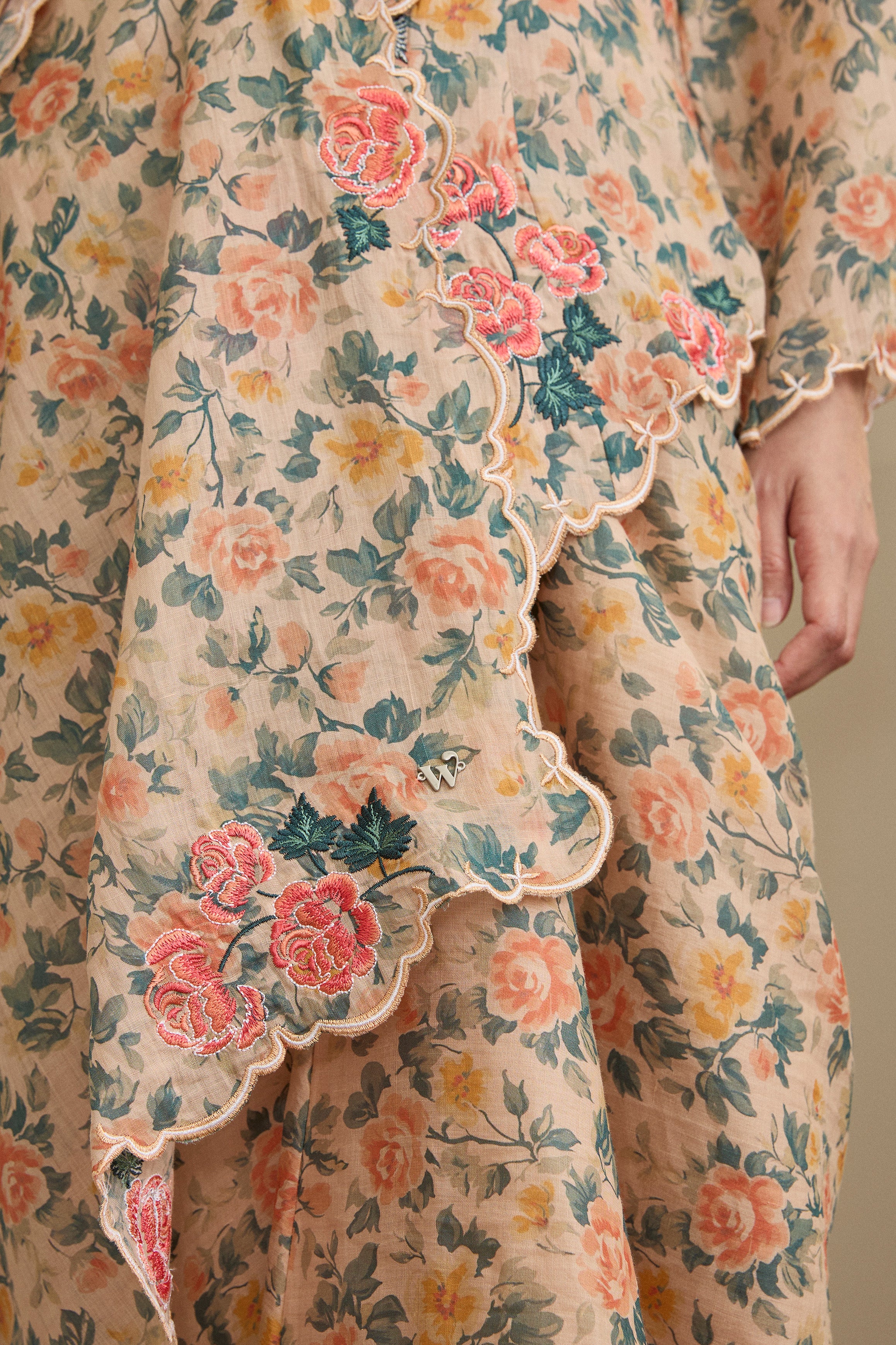 A refined essential, rendered in ramie. This selendang is framed with Intricate multicolour embroidery in floral motif. Finished with a subtle W metal logo. Wear it on shoulder or as a headscarf to show it off to full effect.