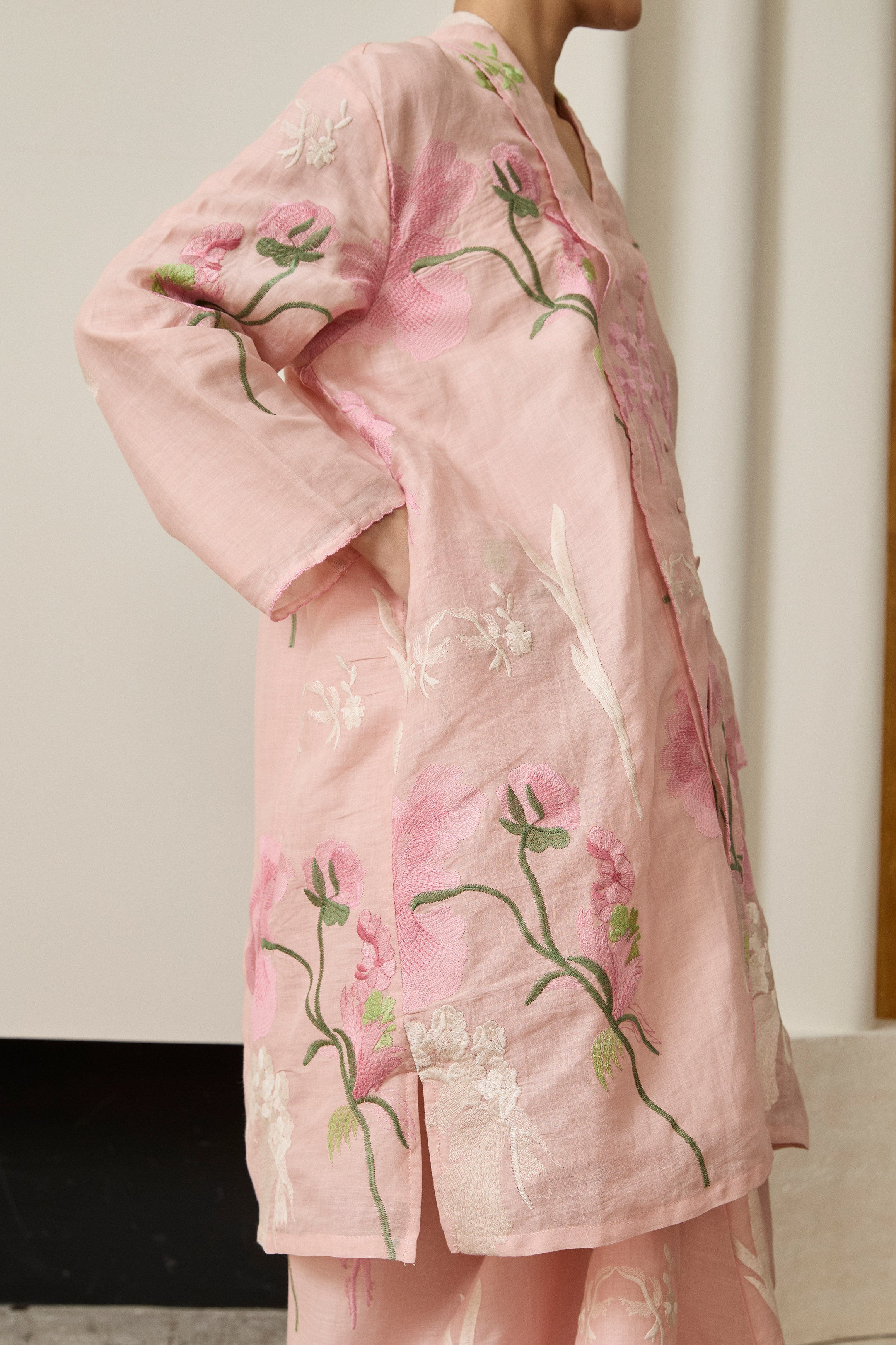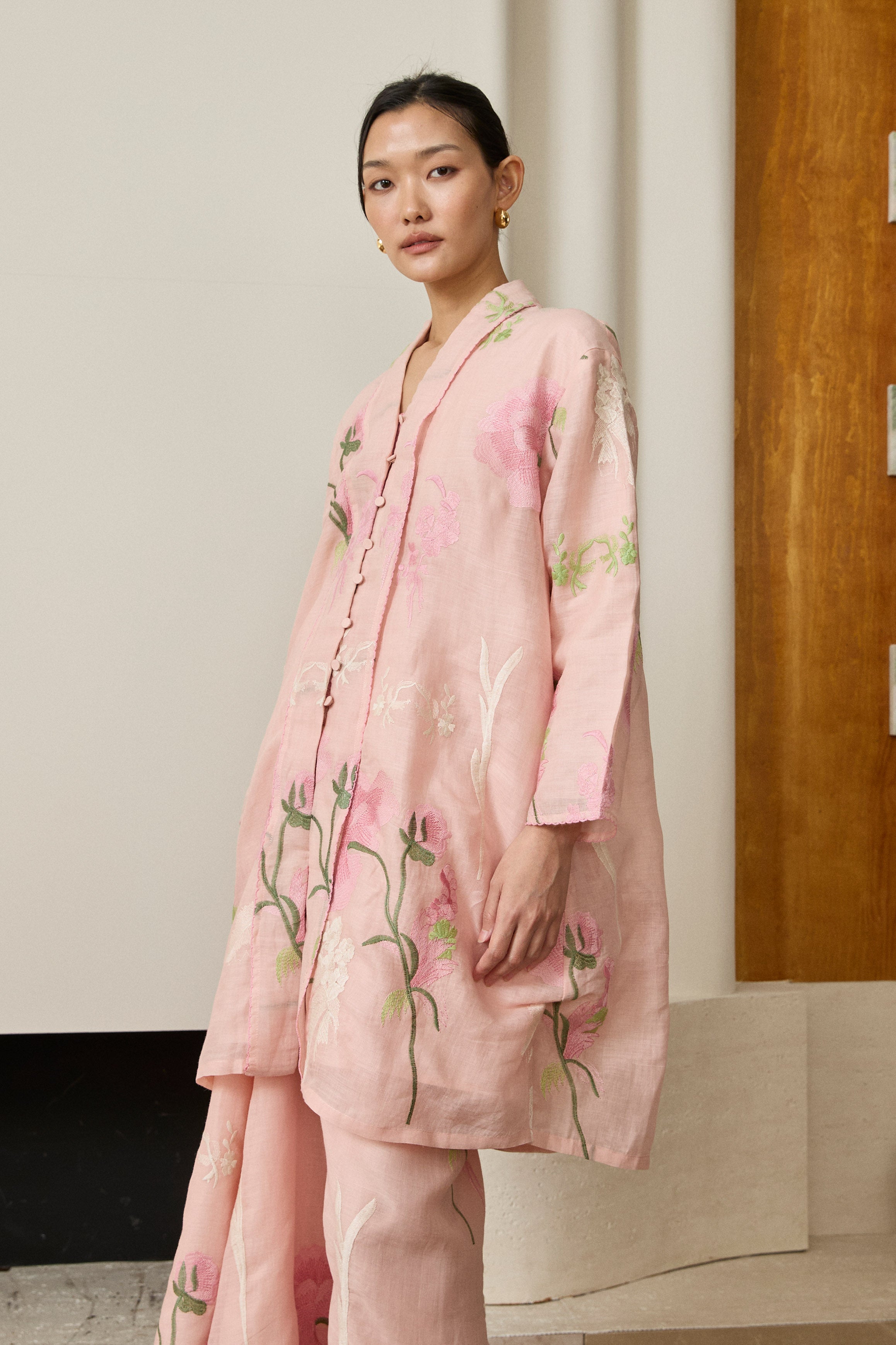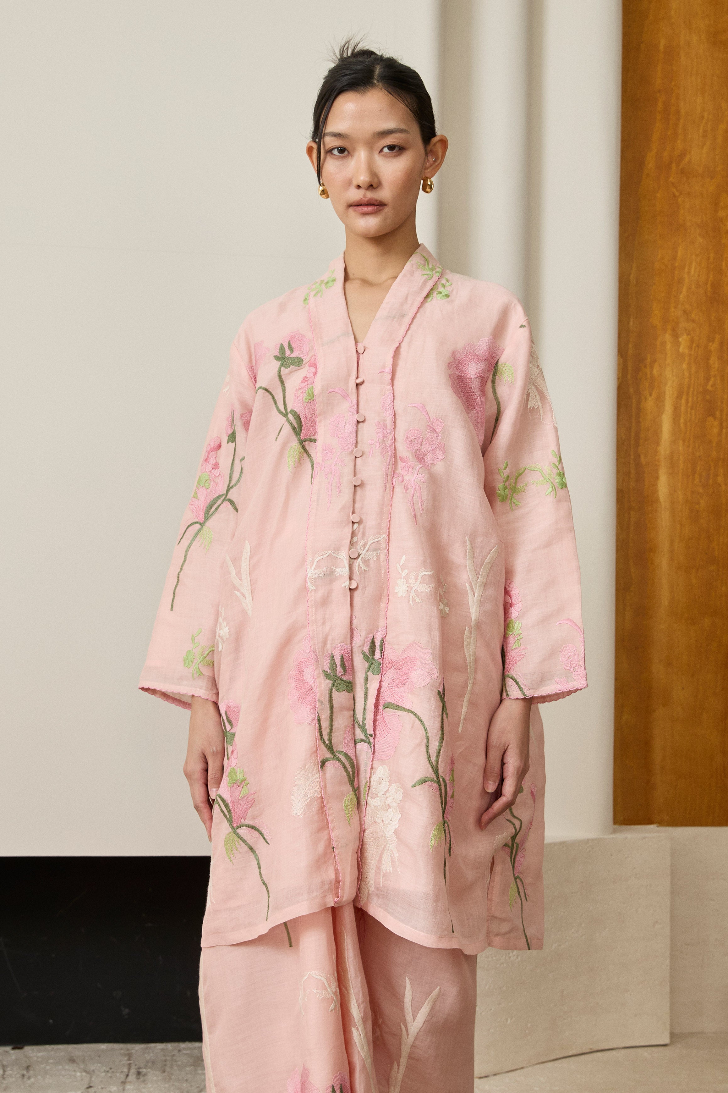 A long kebaya, rendered in embroidered ramie. Bversized, loose fit and full sleeves. Features self-covered button closures and pockets on both sides. Lined in cotton.