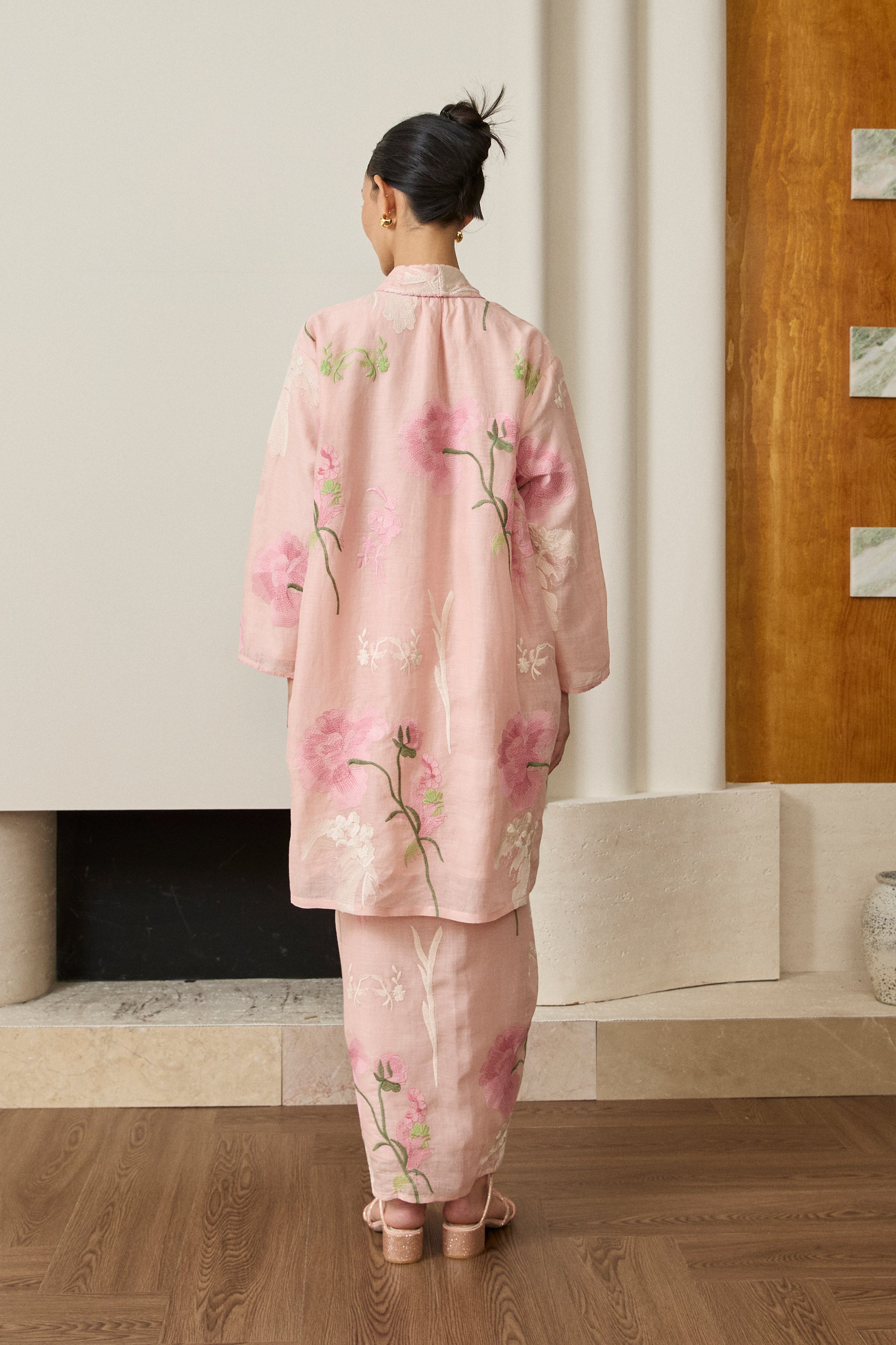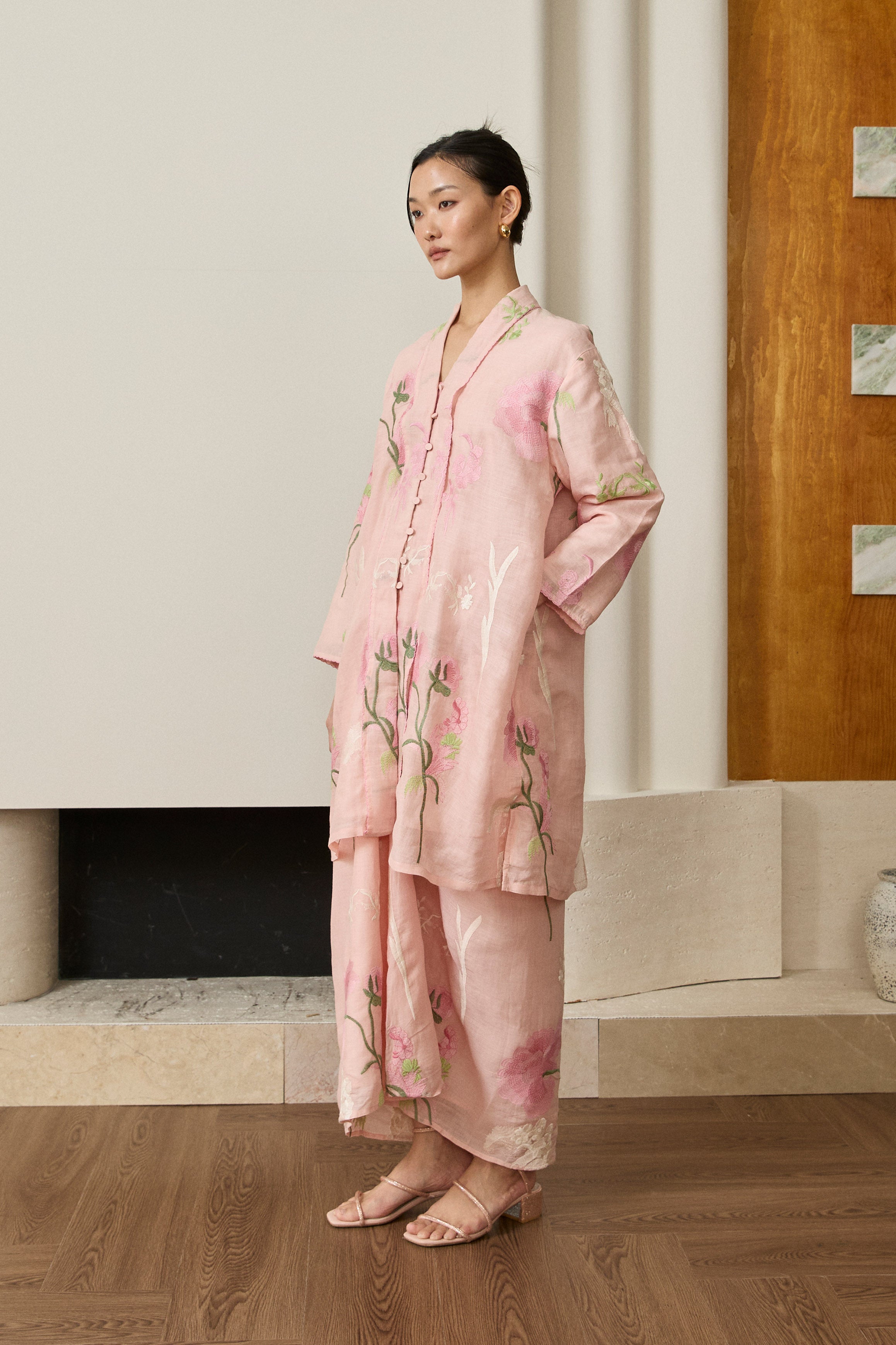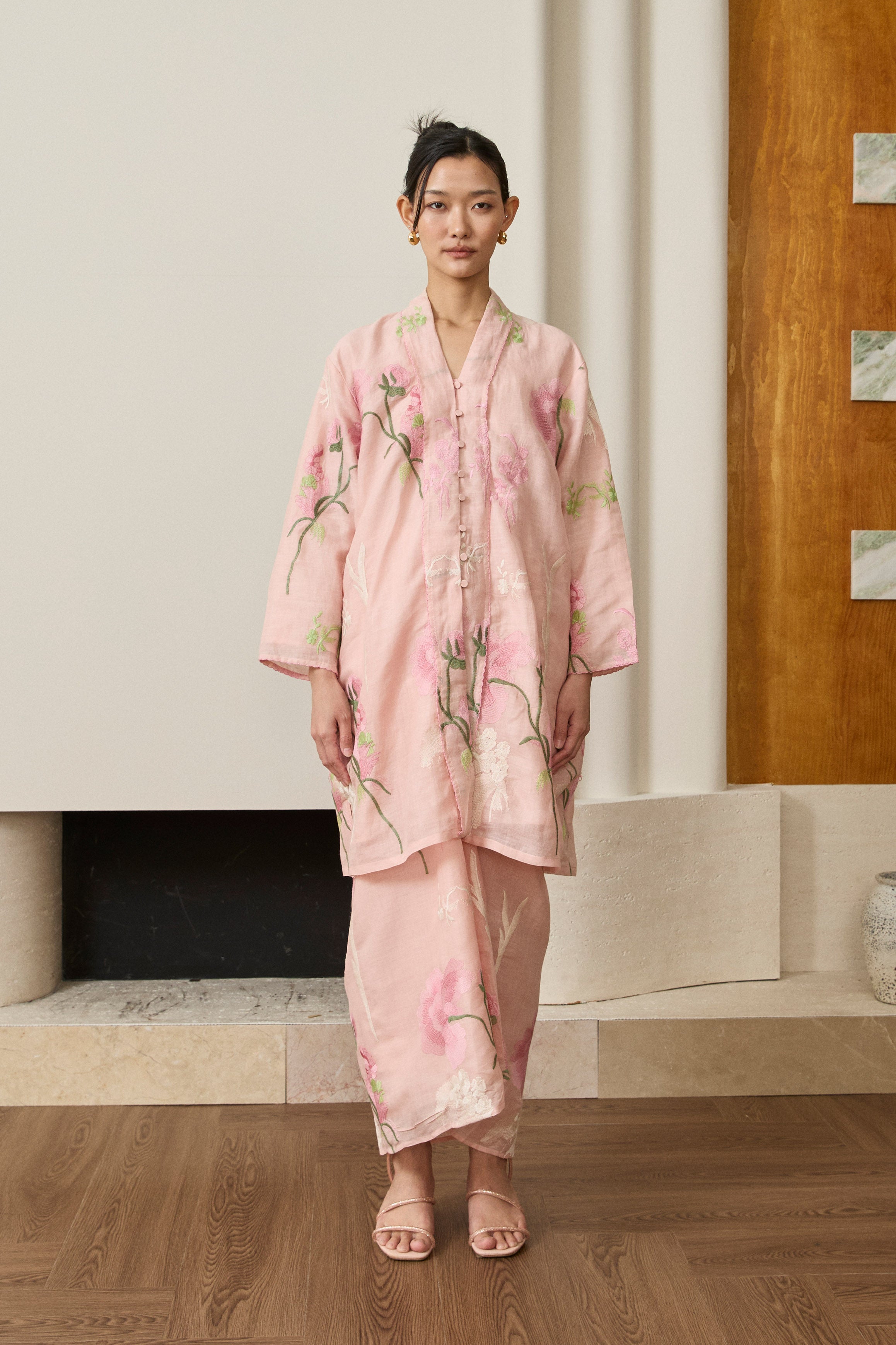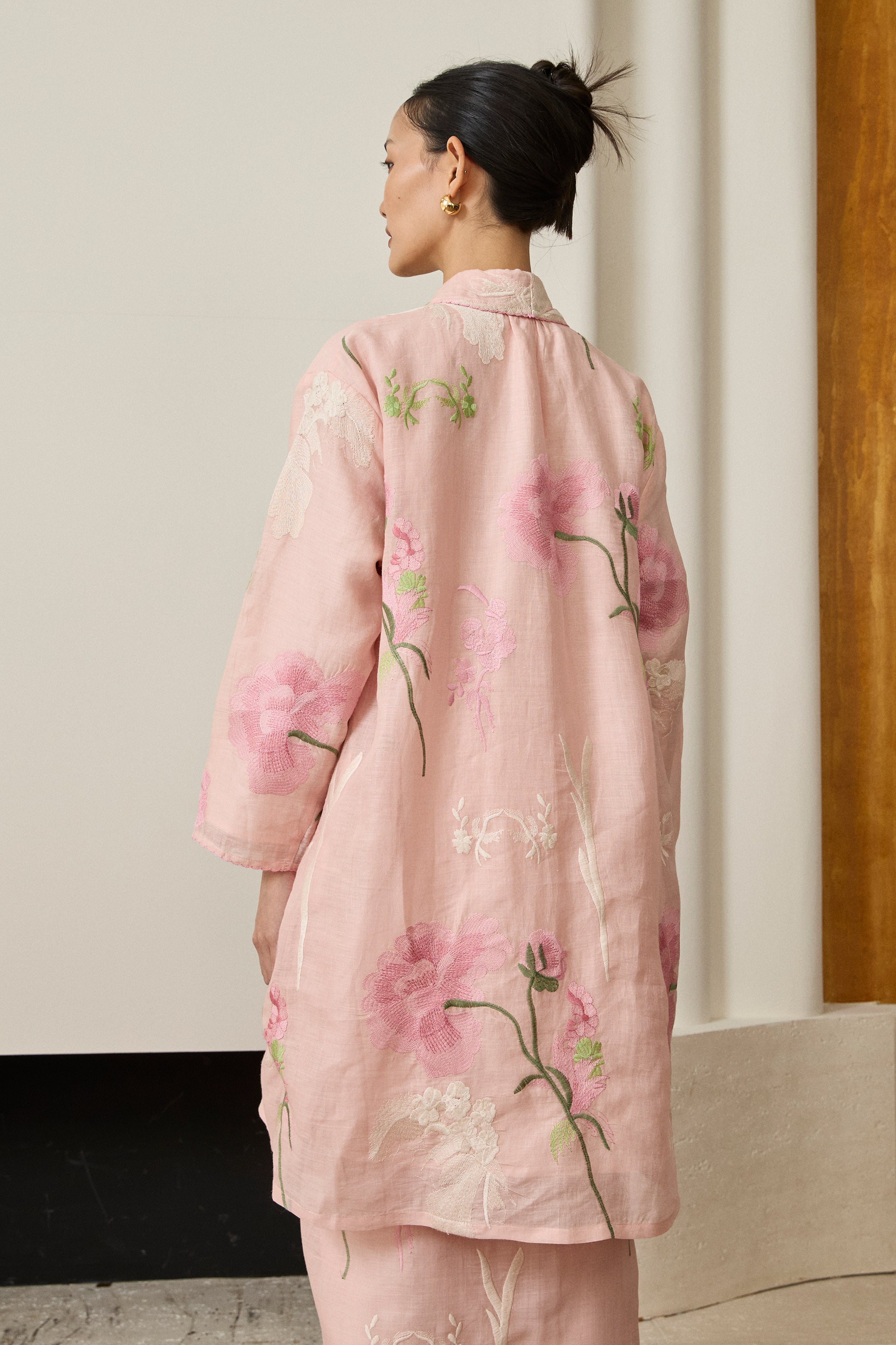 A long kebaya, rendered in embroidered ramie. Bversized, loose fit and full sleeves. Features self-covered button closures and pockets on both sides. Lined in cotton.
