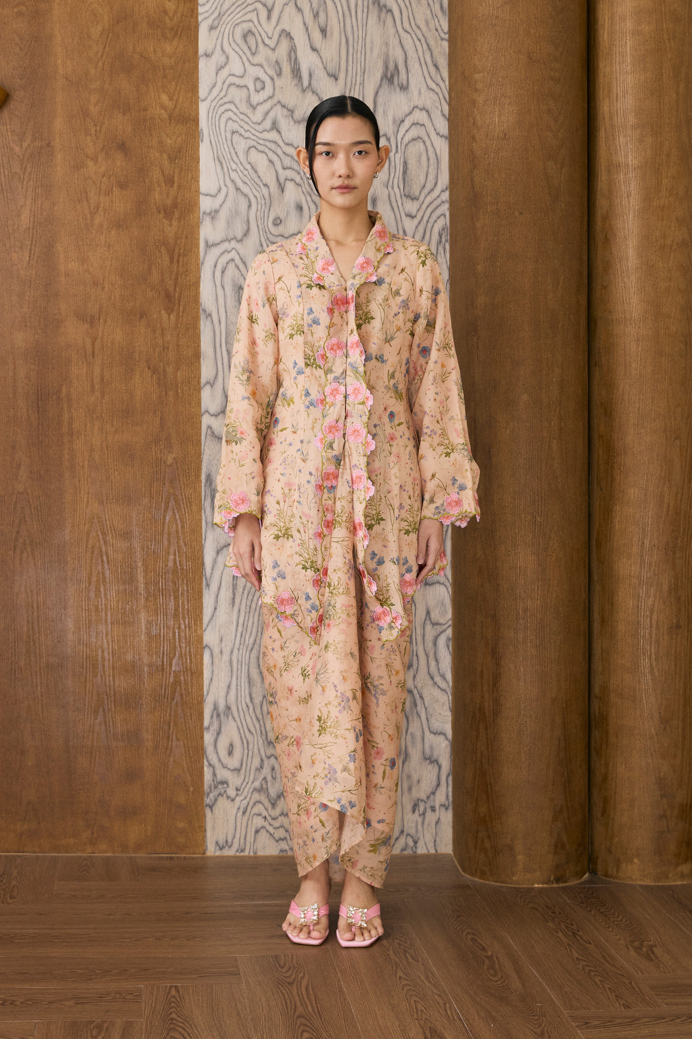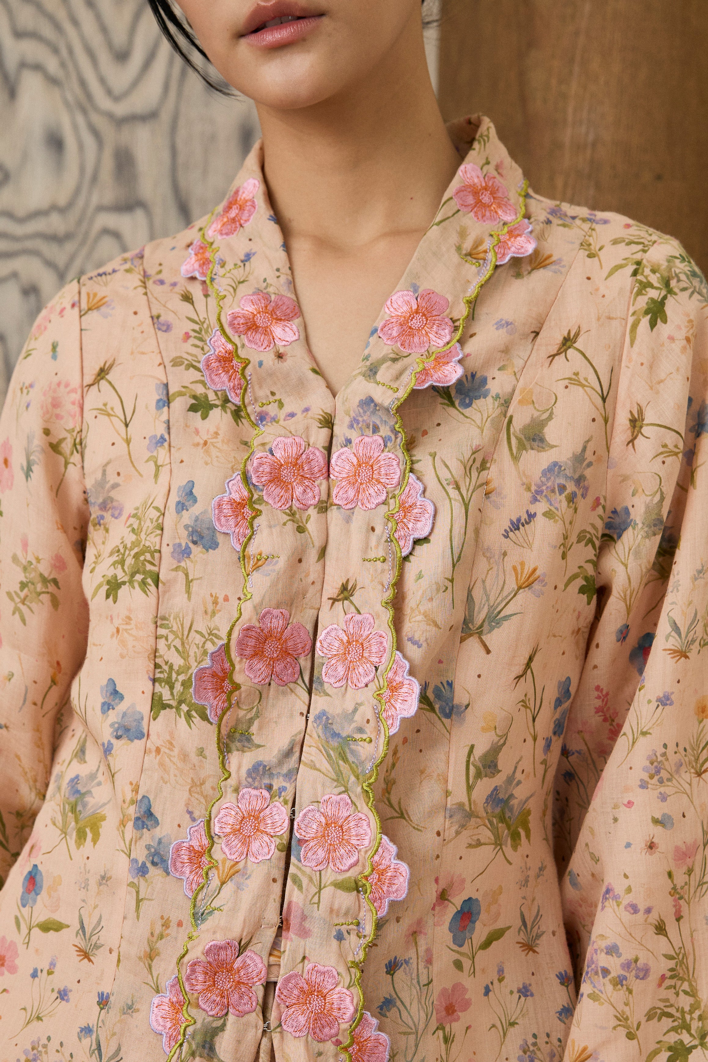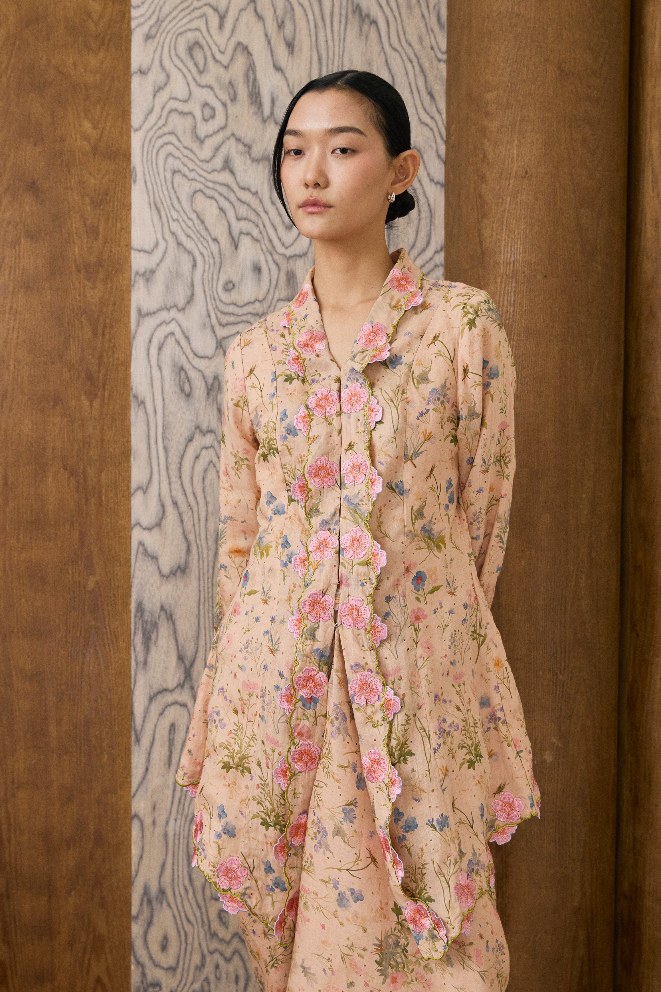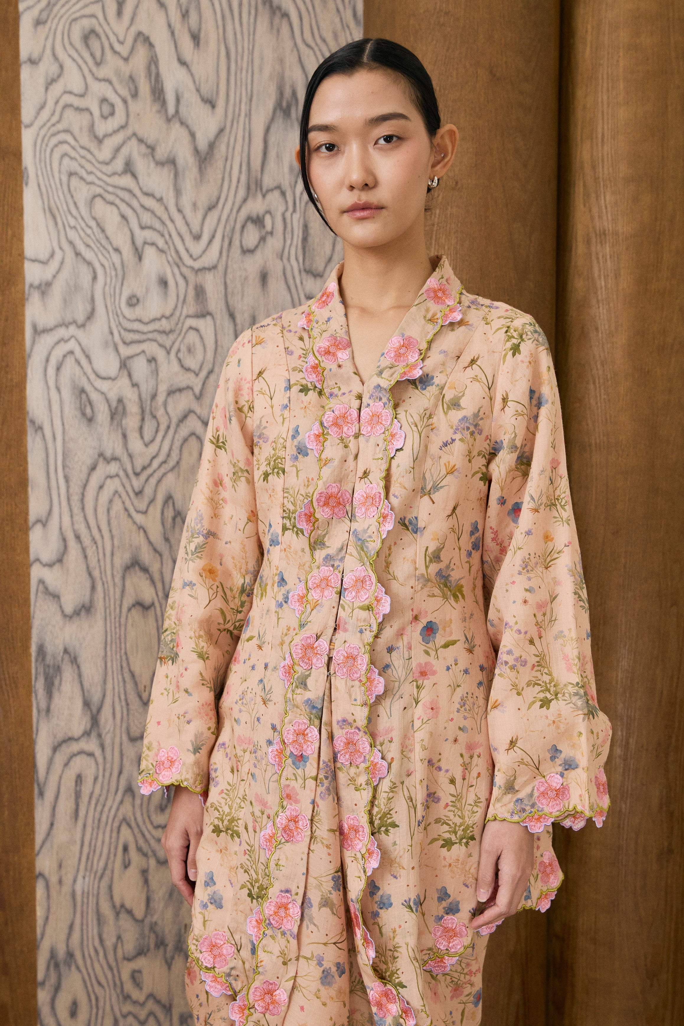 A traditional long Kebaya top, featuring a flower-embroidered lapel and front hook-and-eye closure. Rendered in ramie, lined in cotton.