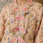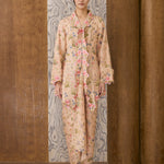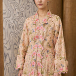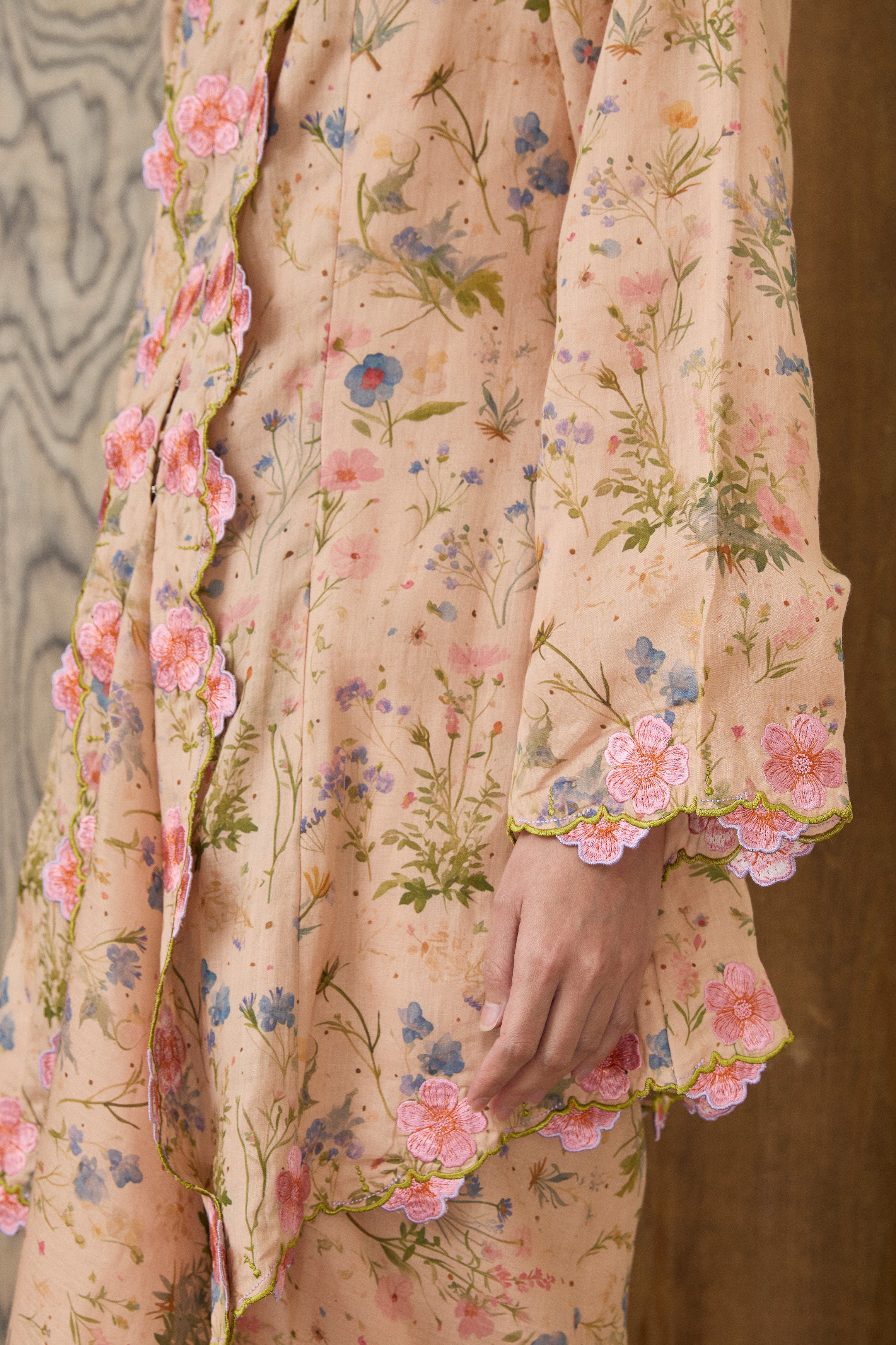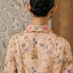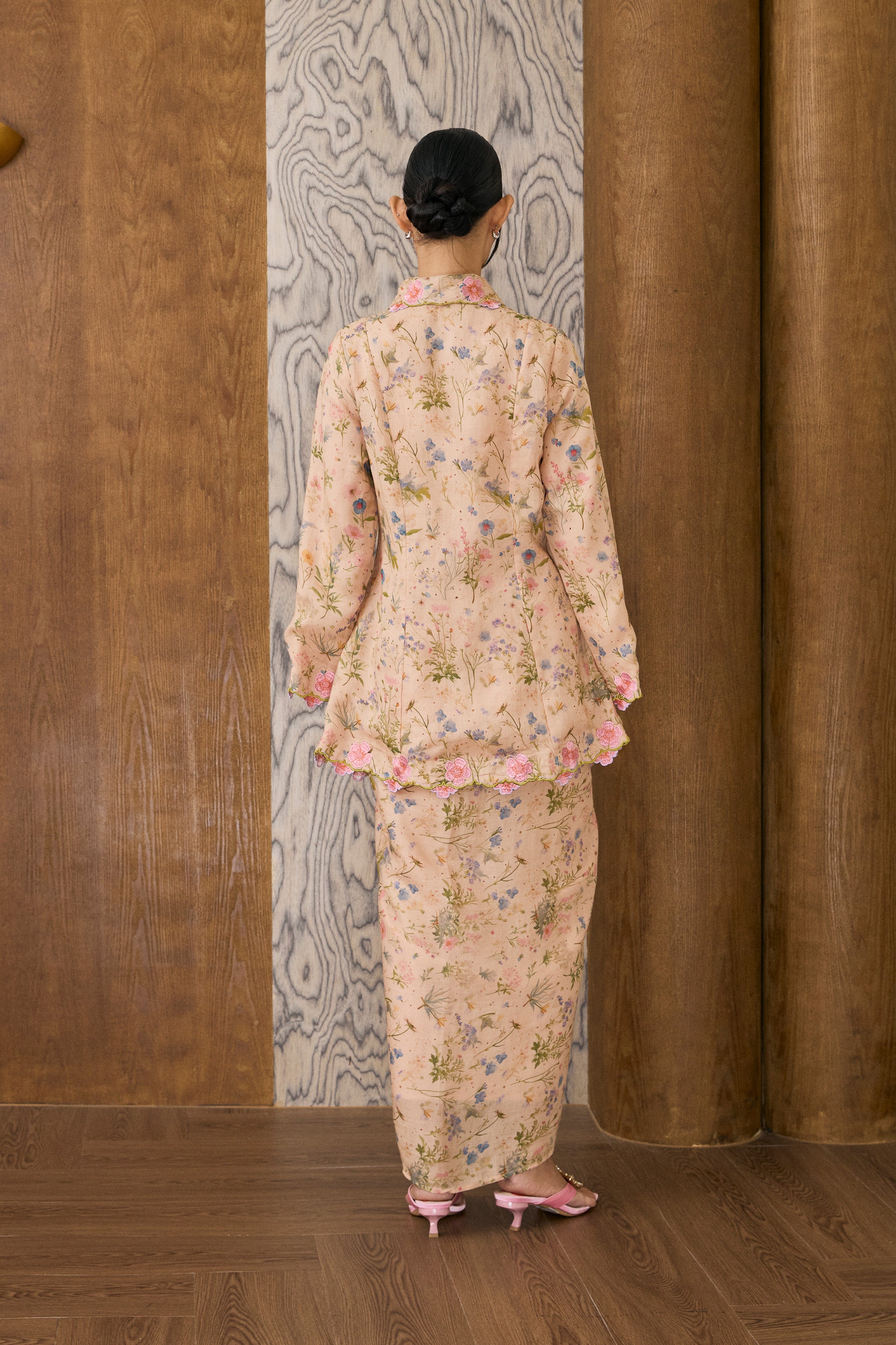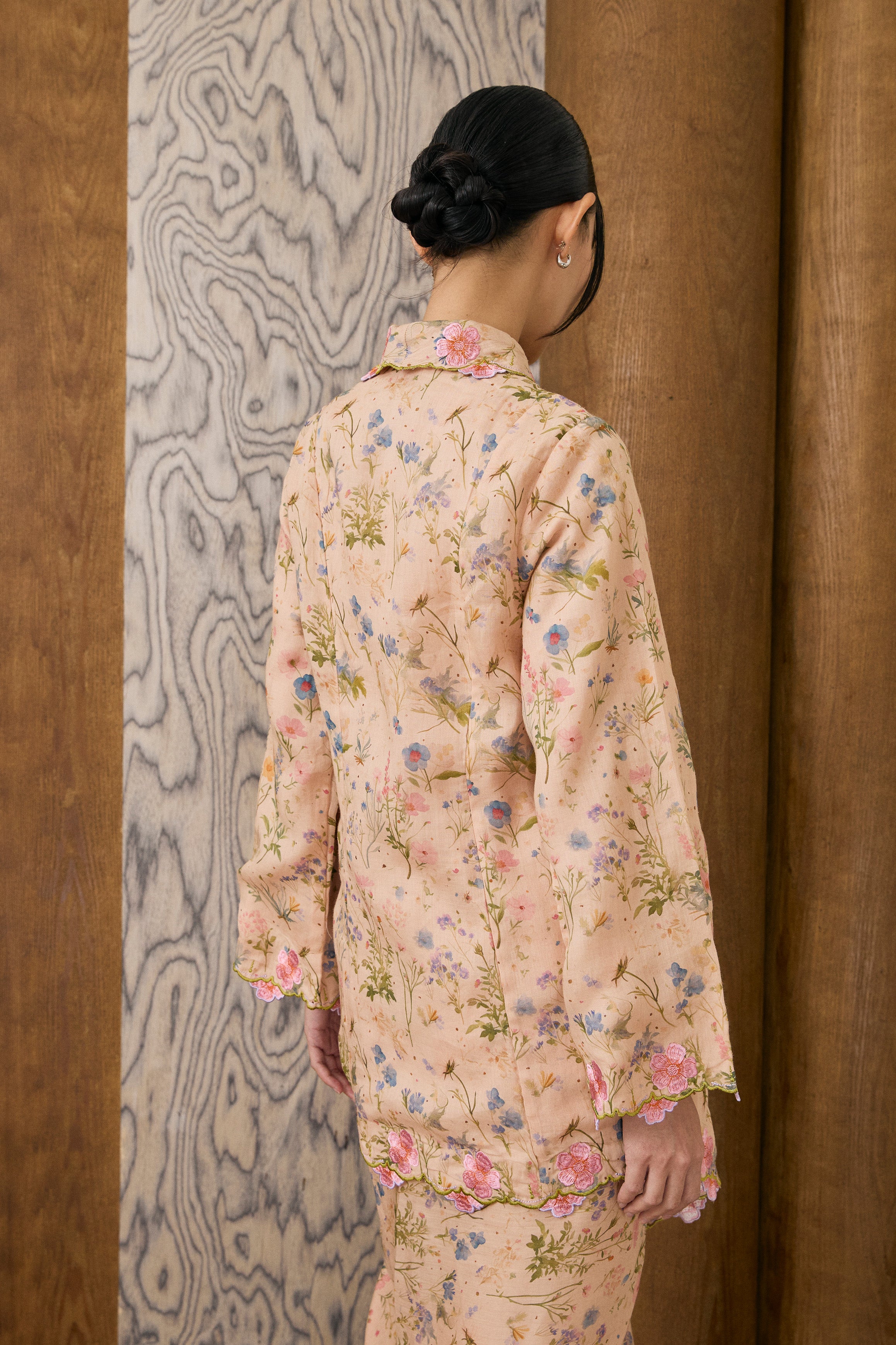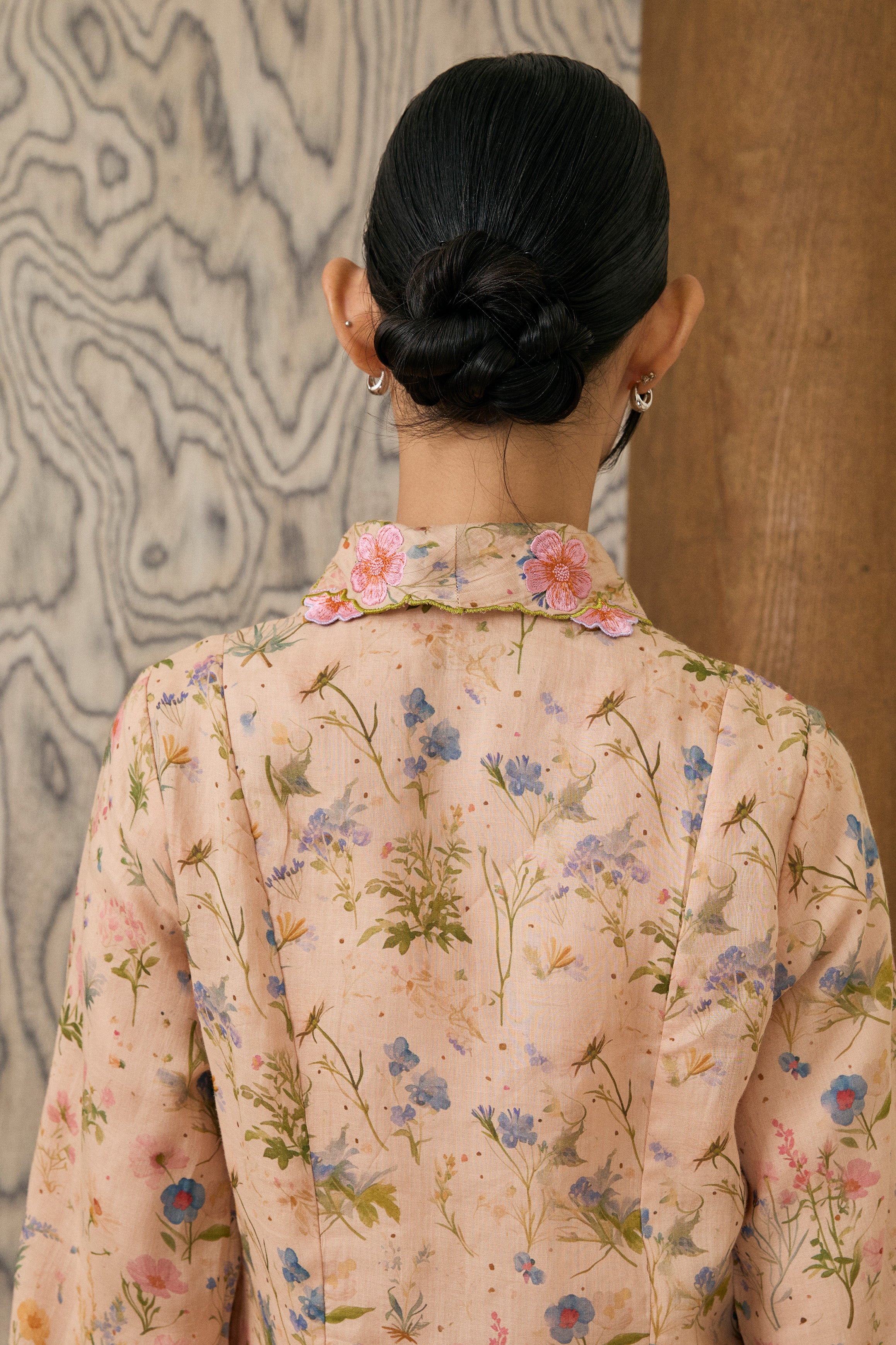 A traditional long Kebaya top, featuring a flower-embroidered lapel and front hook-and-eye closure. Rendered in ramie, lined in cotton.