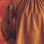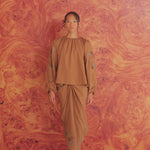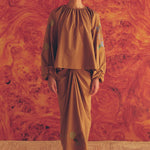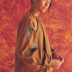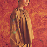 A raglan blouse with a gathered neckline and statement sleeves featuring multicoloured cross stitch detailing. Rendered in Cotton Poplin.