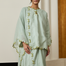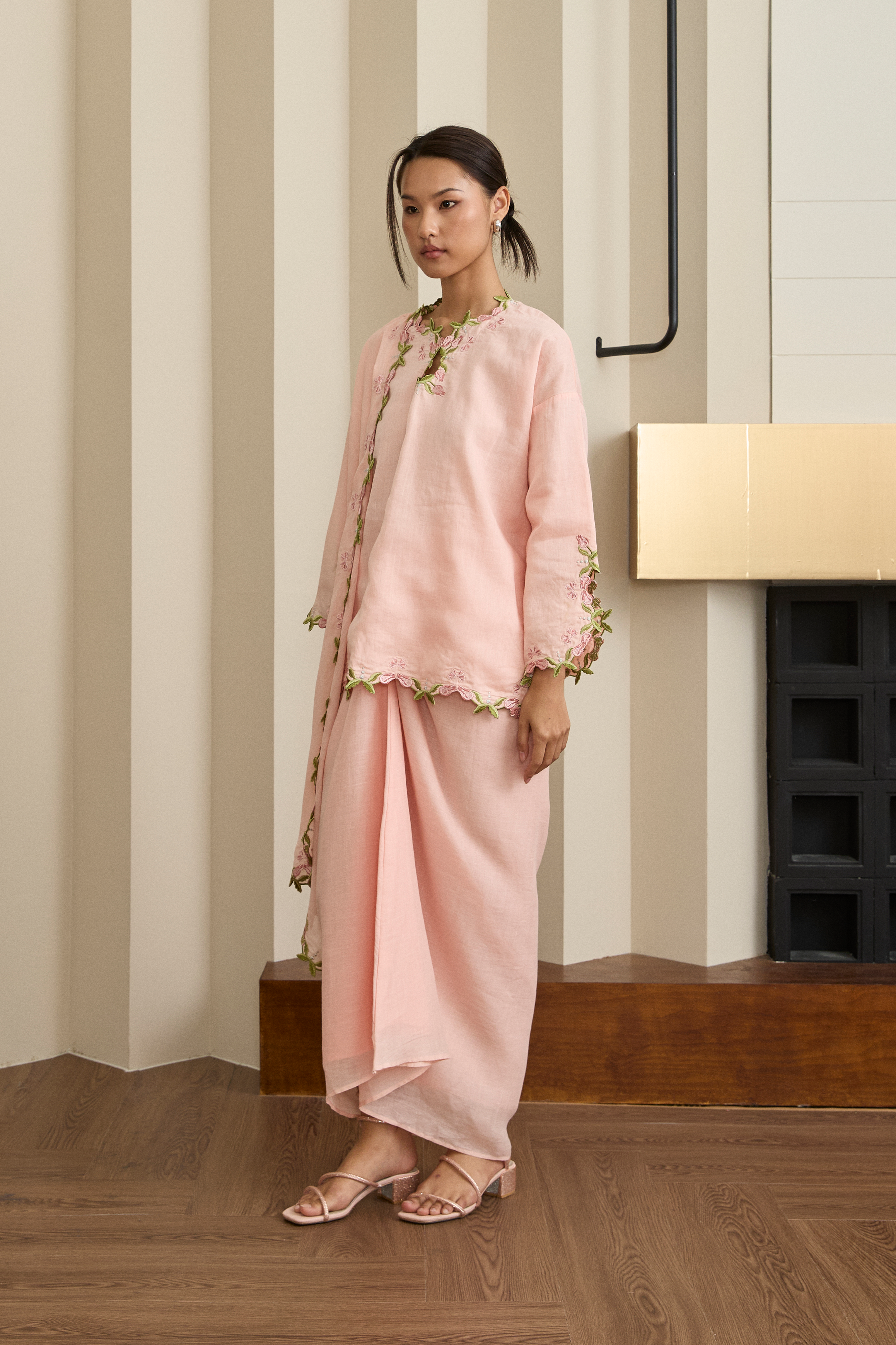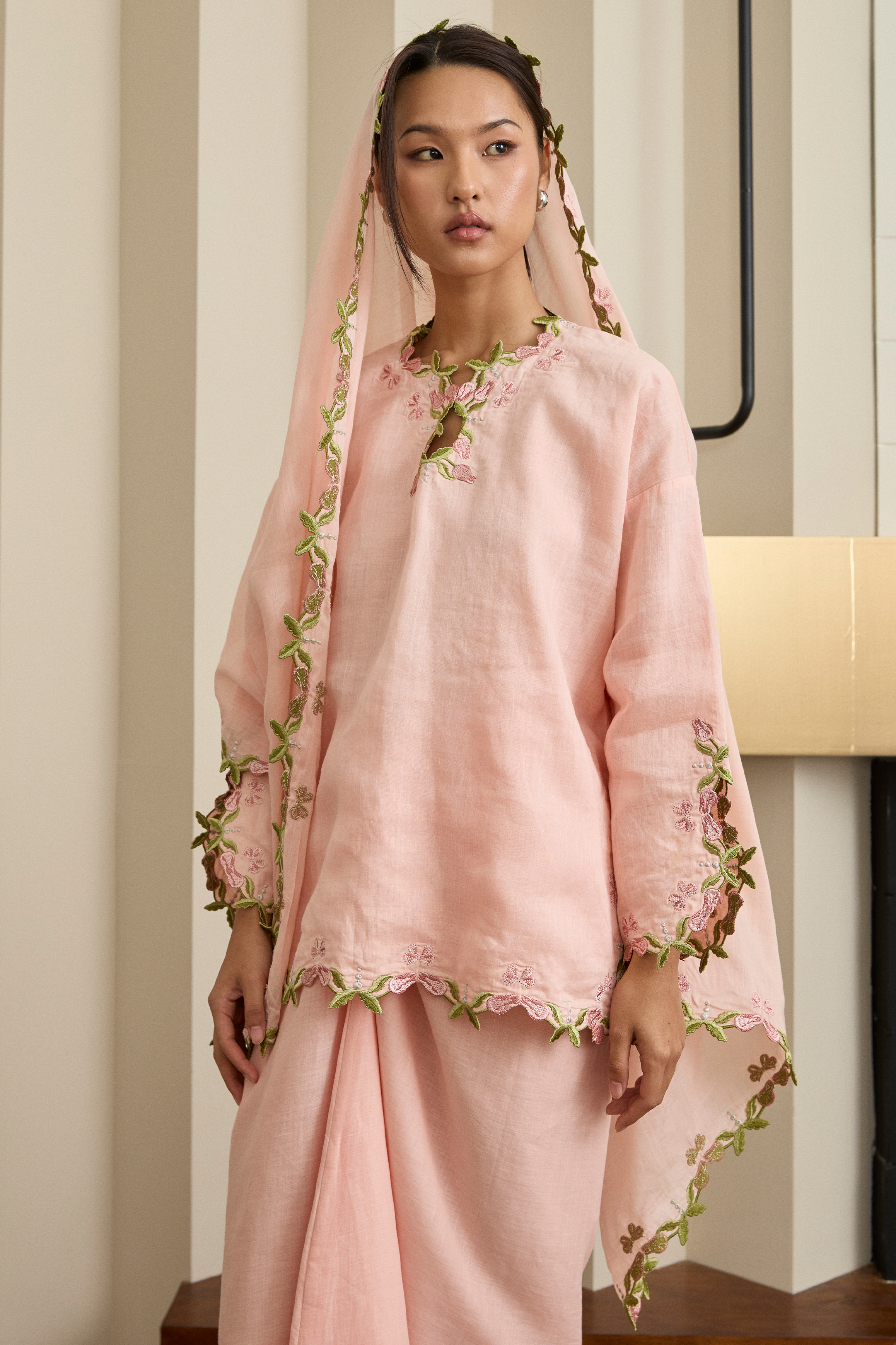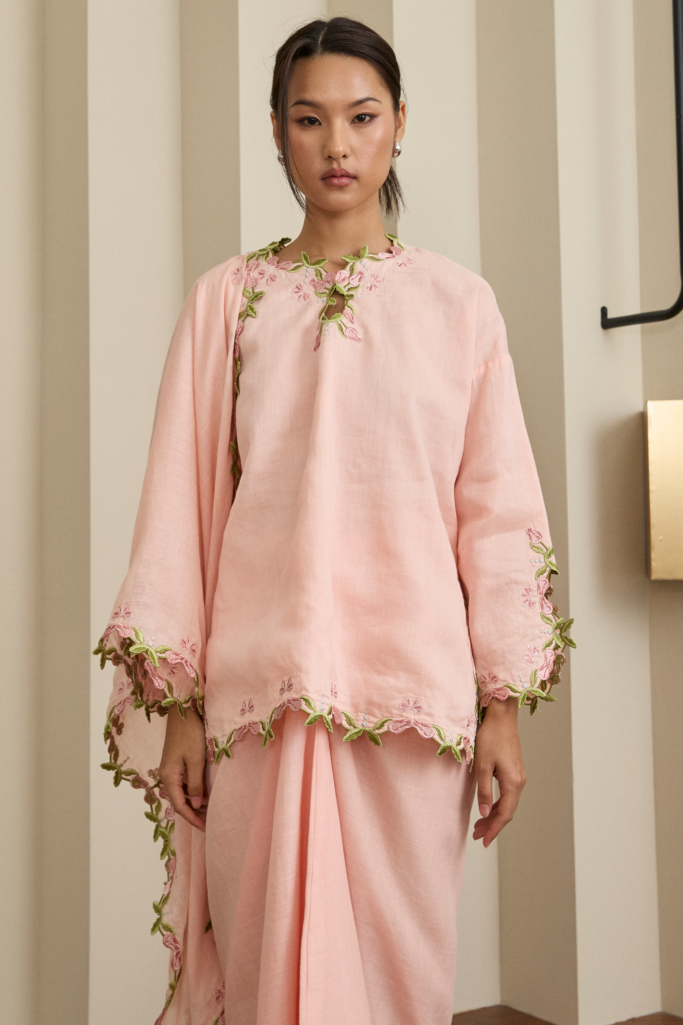 An iteration of the classic Kedah fit, rendered in ramie and lined with cotton. The set includes a top with intricate multi-tone floral embroidery. Finished with tulip-cut sleeves, side slits and a front button closure. Finished with a matching, slip-on knot skirt.
