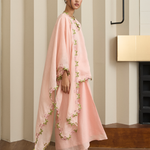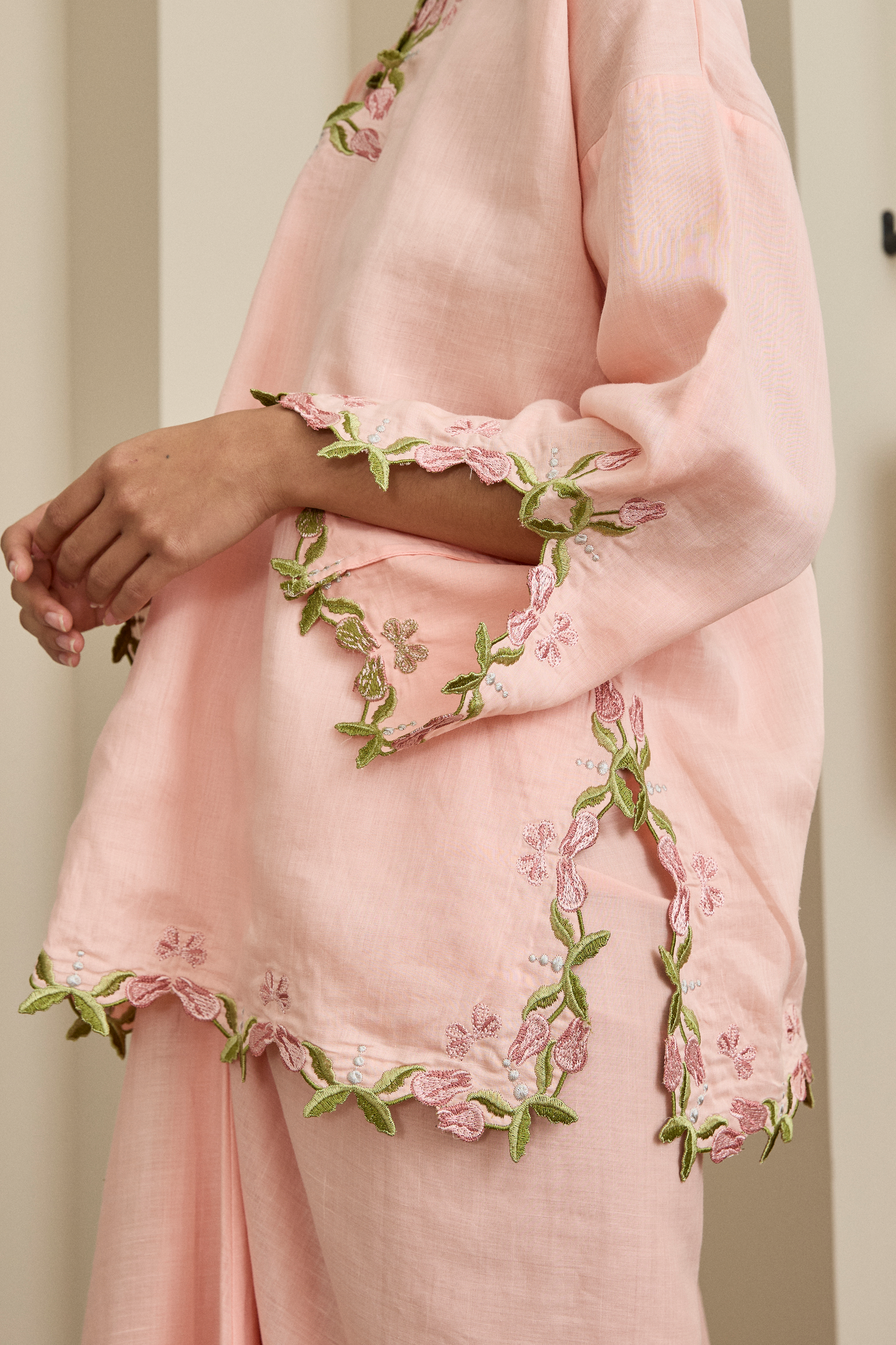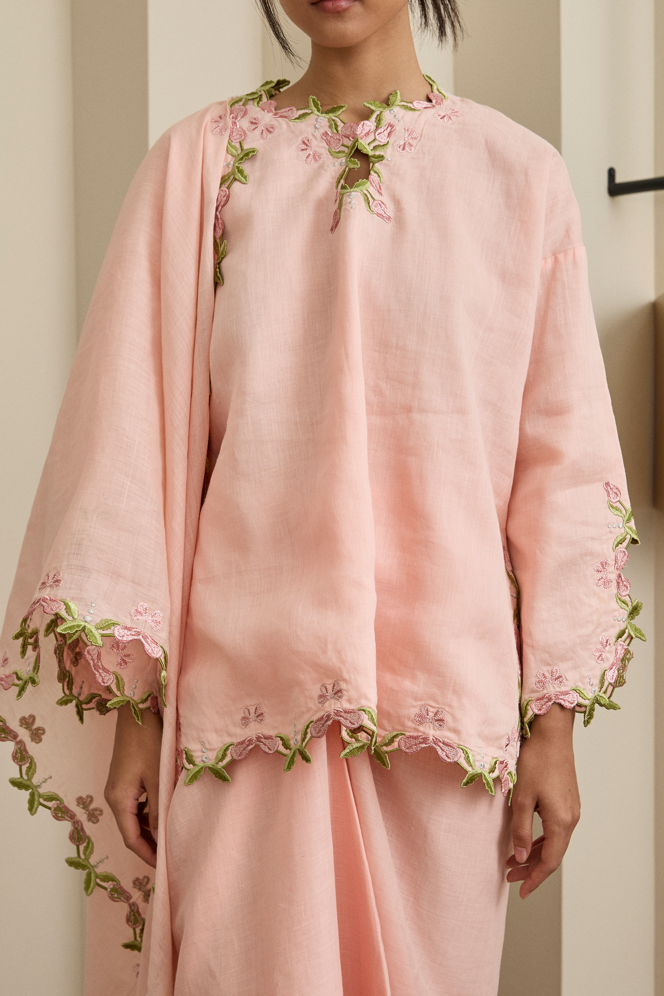 Accented with intricate embroidery along the neckline and sleeves