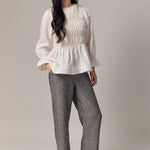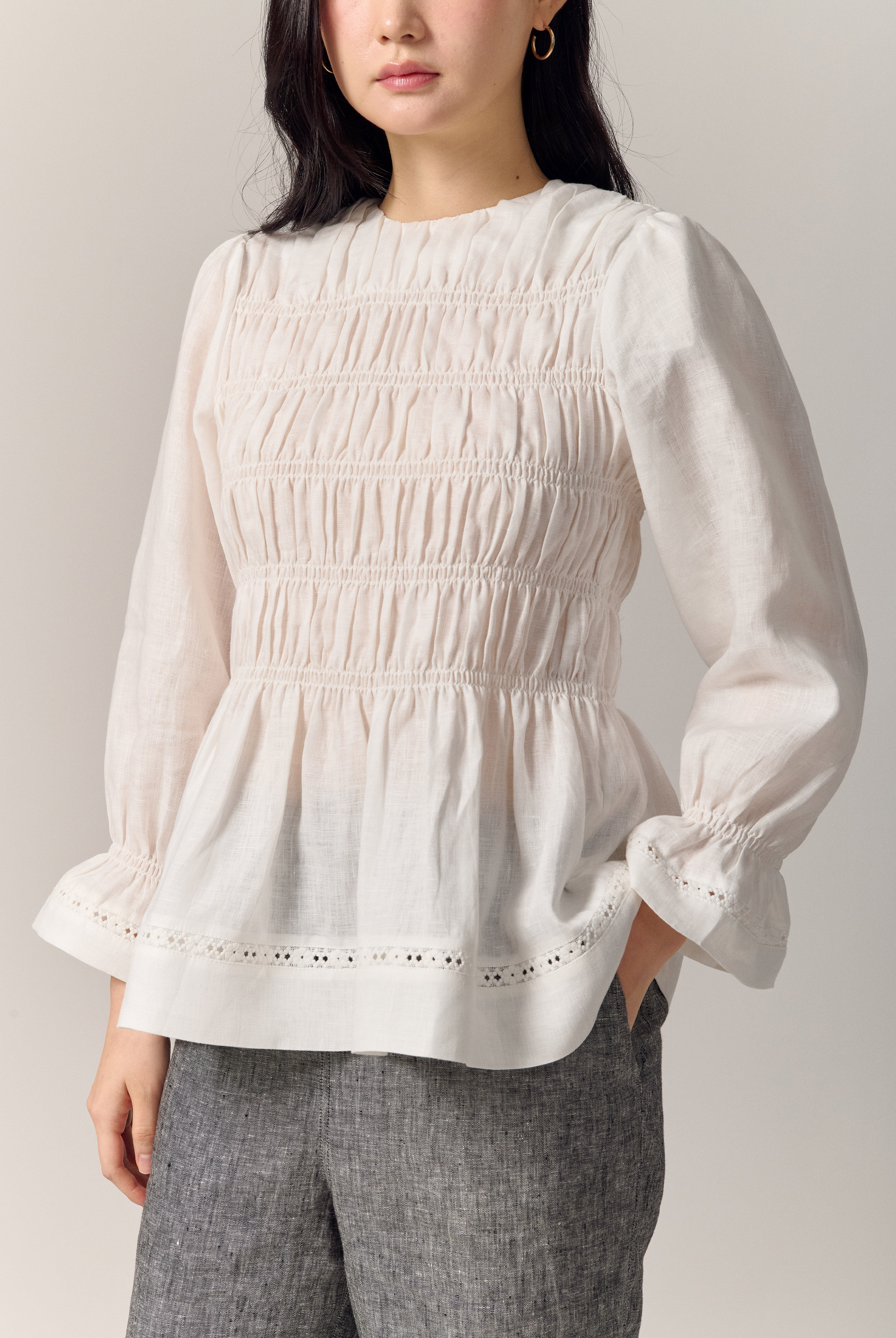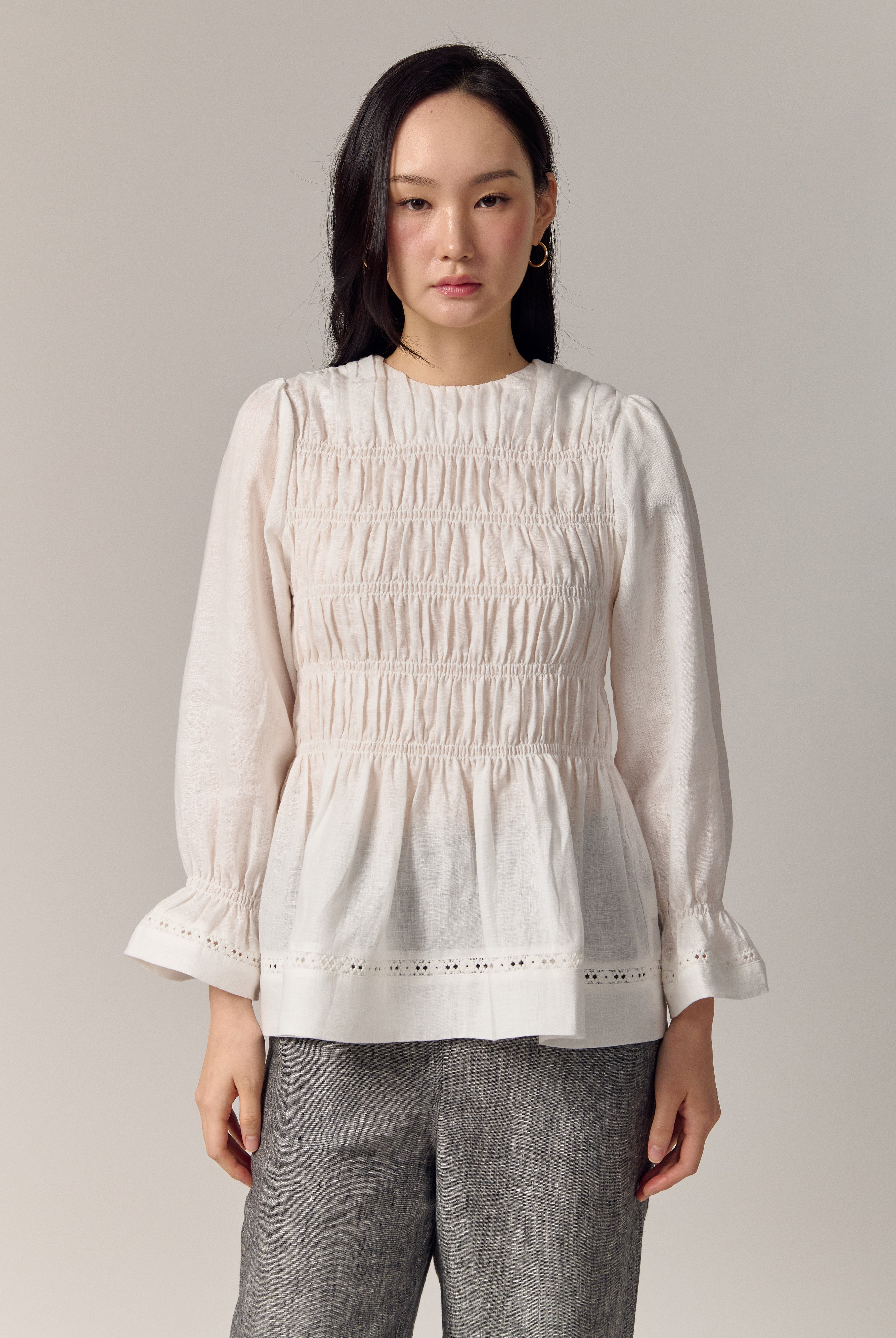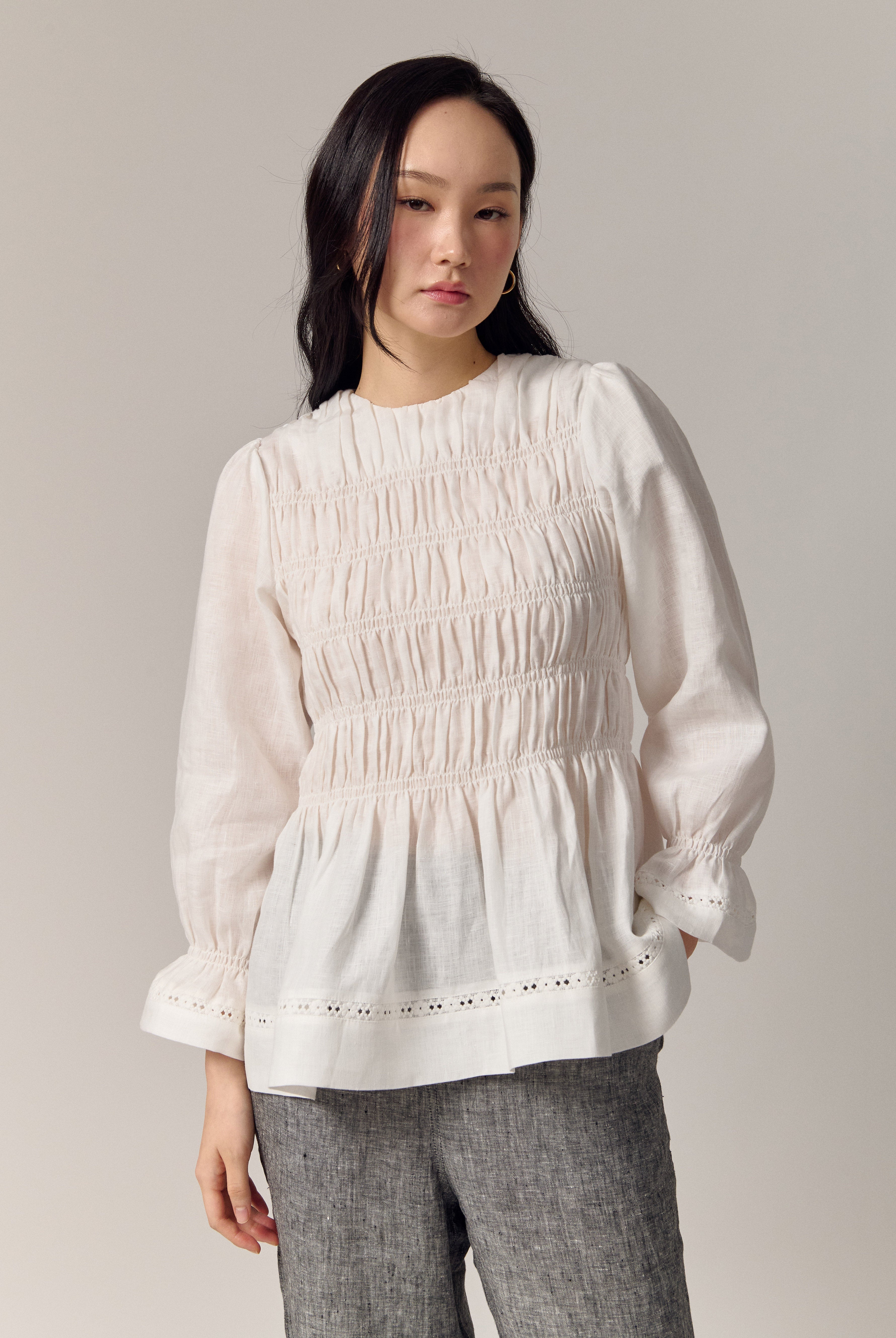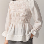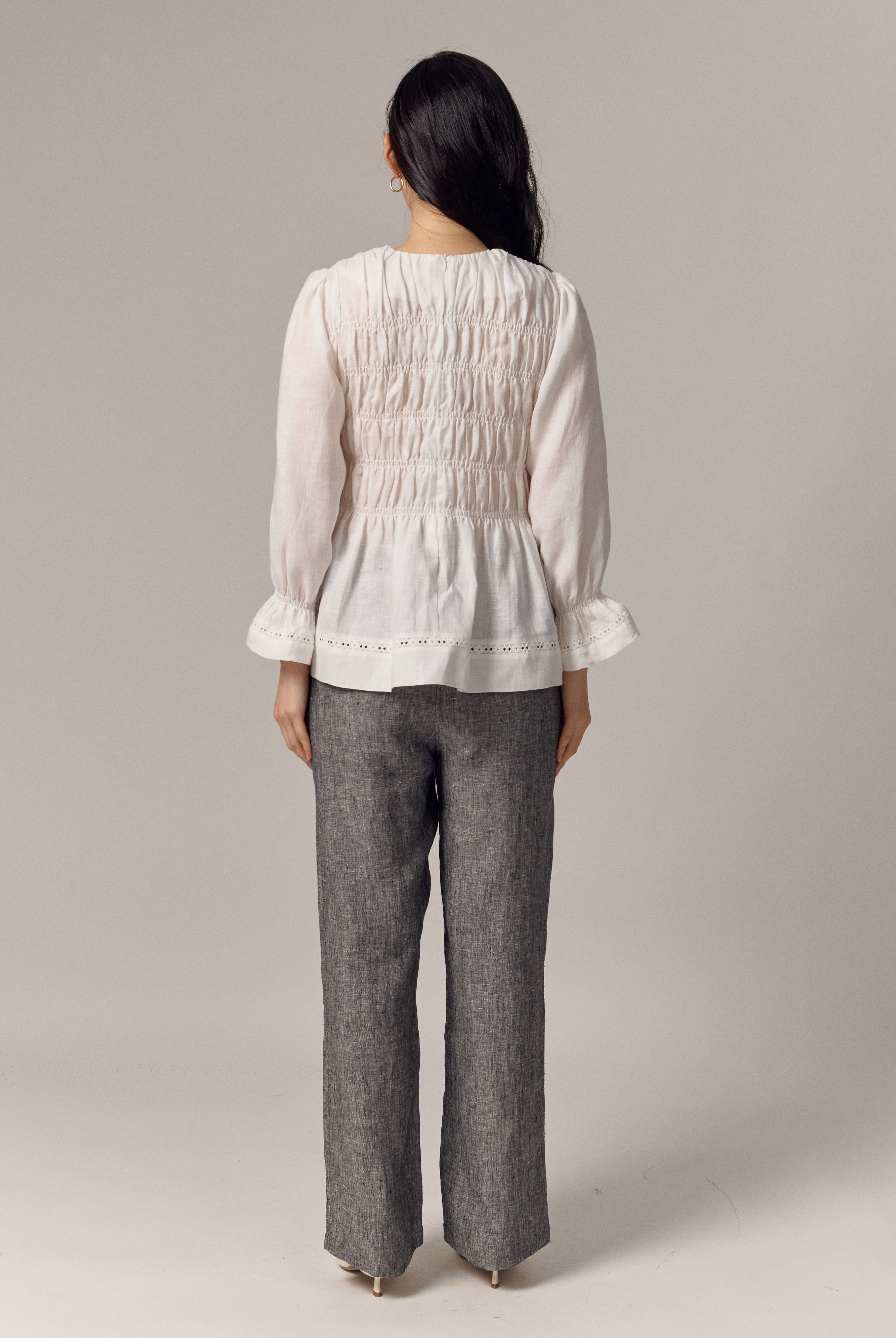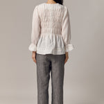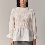 A shirred blouse rendered in linen, designed with a peplum for soft structure. Framed with intricate trimming and smocked wristbands, finished with a round neckline.