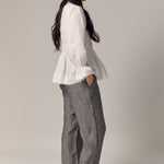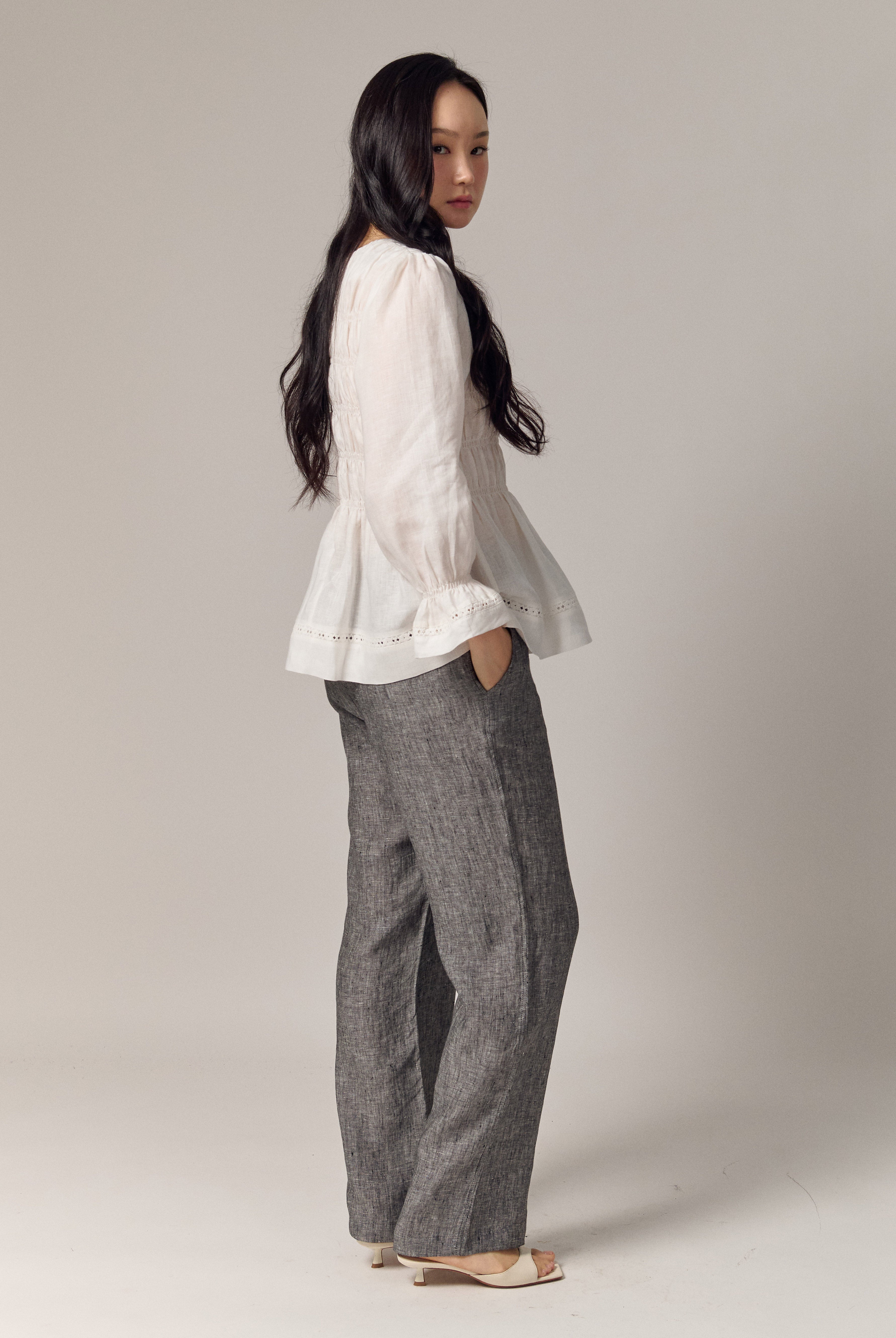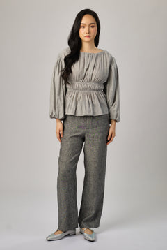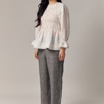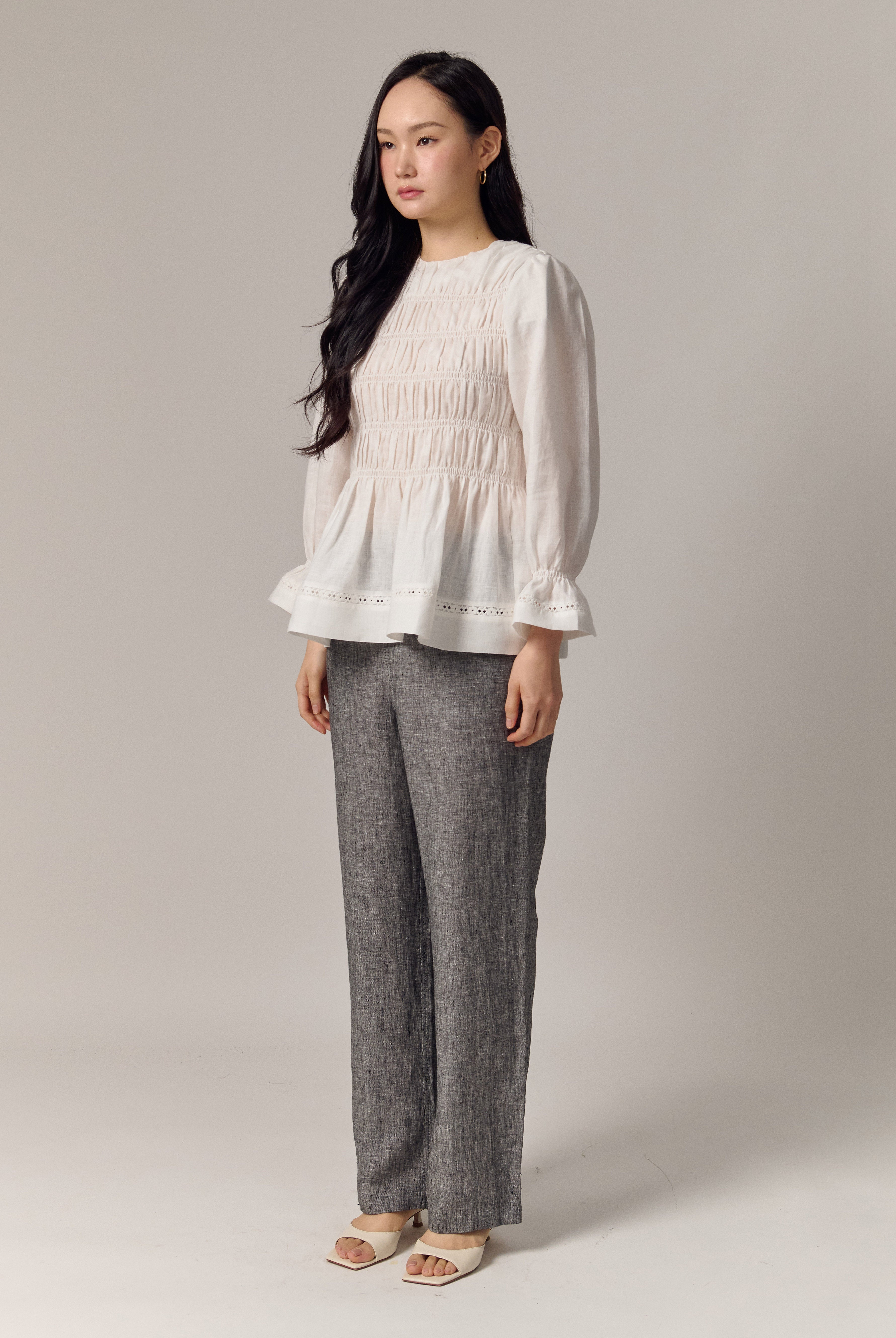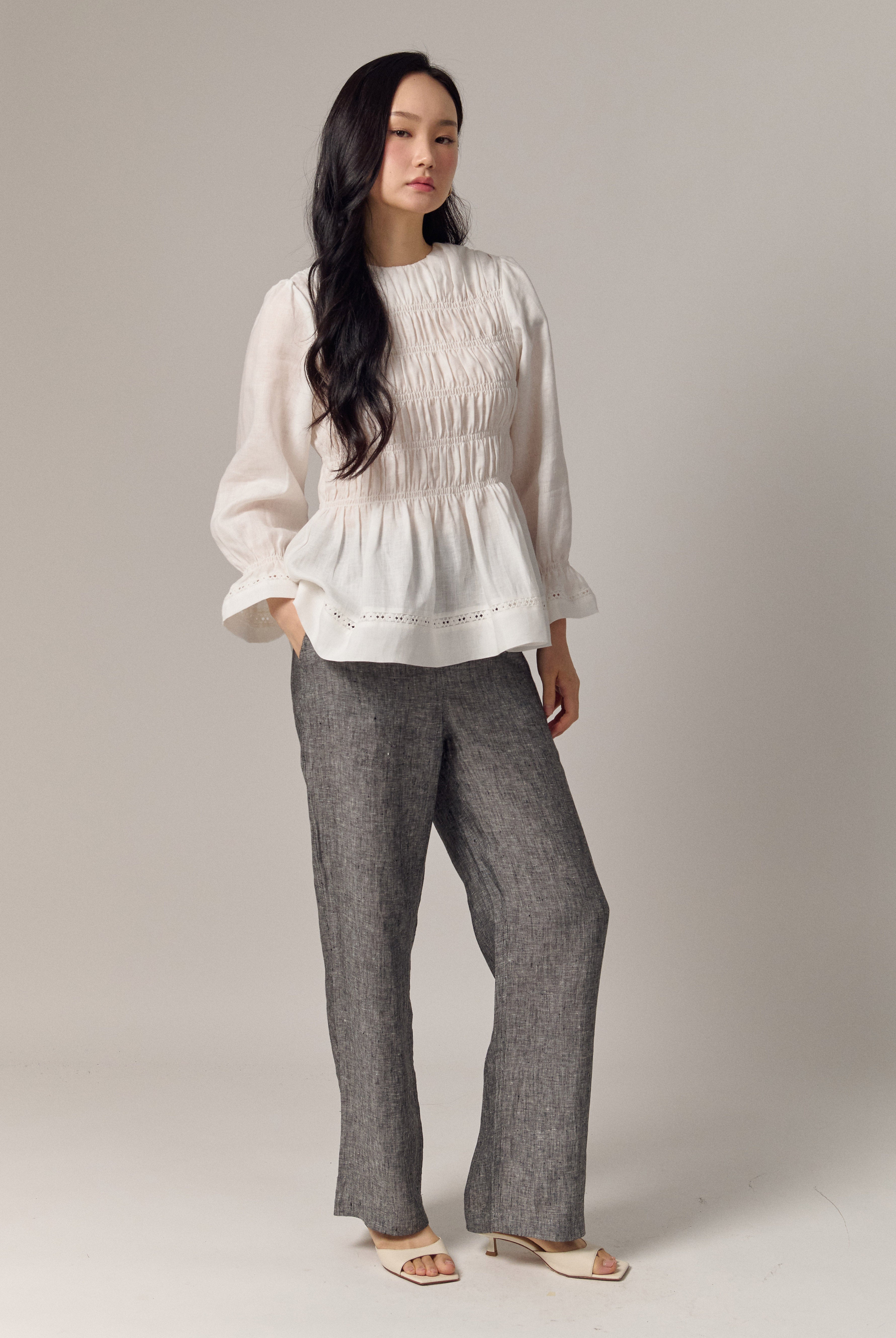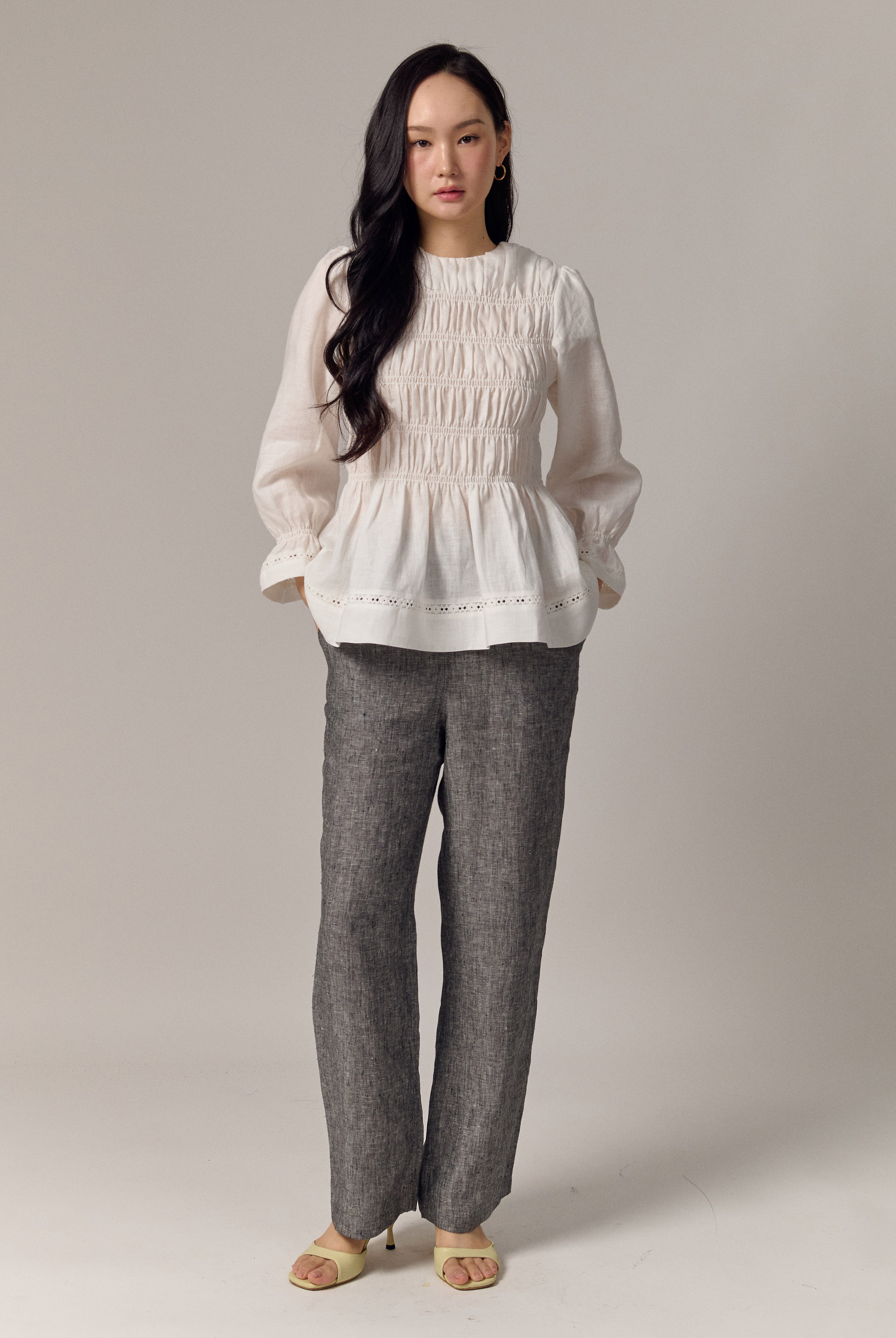 A shirred blouse rendered in linen, designed with a peplum for soft structure. Framed with intricate trimming and smocked wristbands, finished with a round neckline.