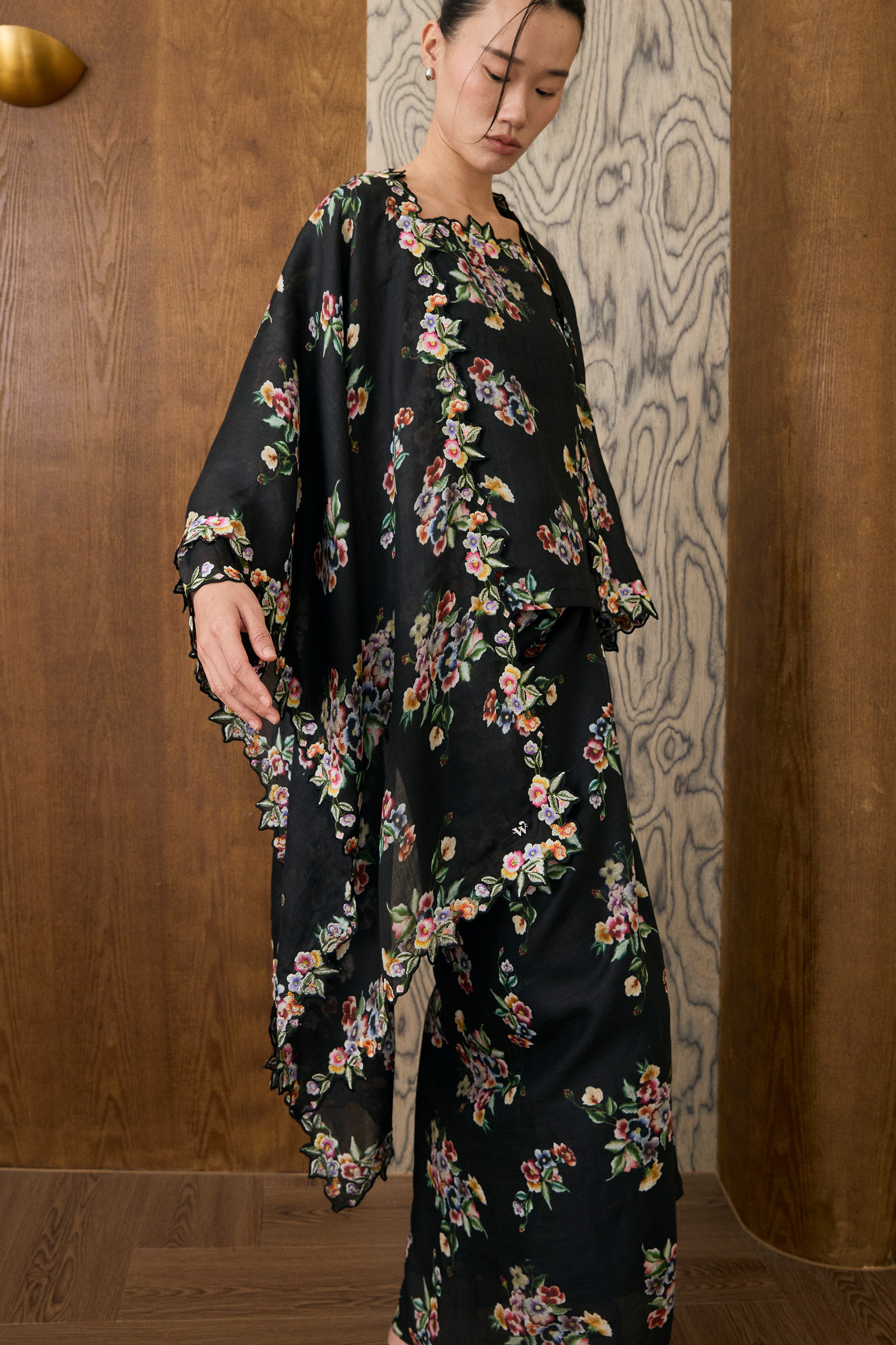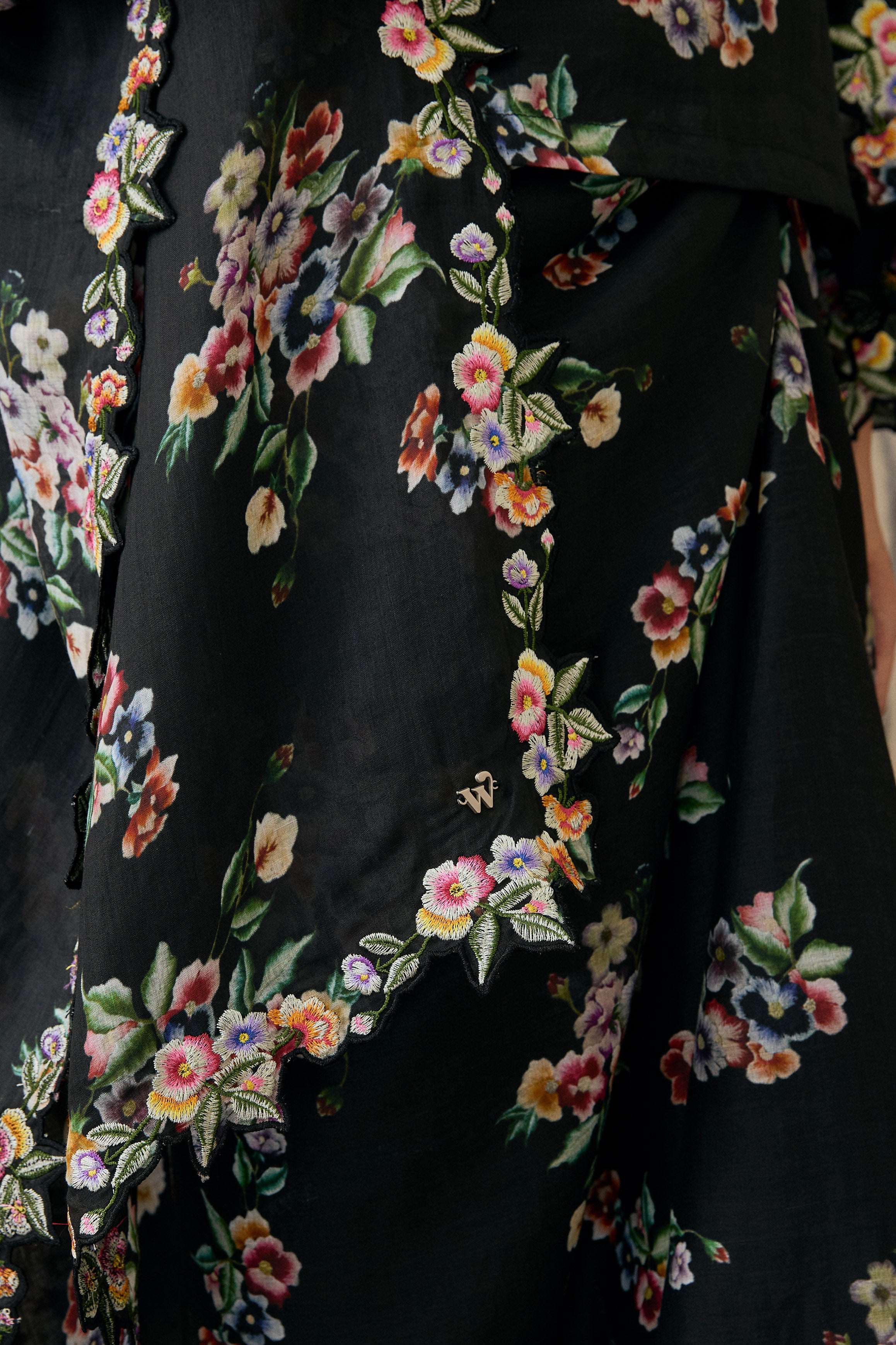 A selendang, rendered in ramie. Framed with intricate multicolour embroidery in floral motifs. inished with a subtle W metal logo. Wear it on shoulder or as a headscarf to show it off to full effect.