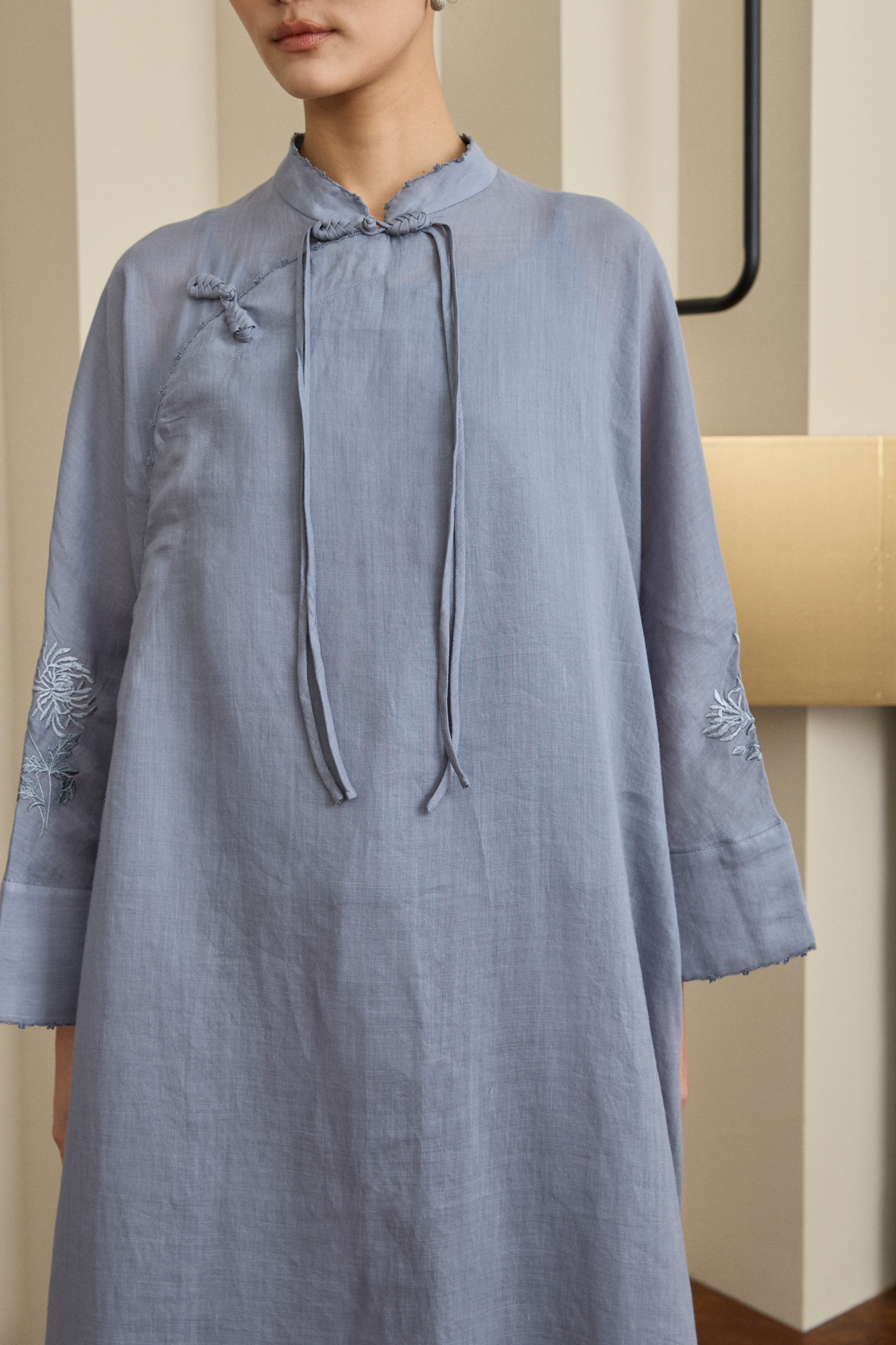 A long tunic, with a batwing silhouette and raglan sleeves. Rendered in ramie. Features a mandarin collar with asymmetrical button detailing and intricate floral embroidery on the sleeves and back bodice, with delicate trimming along all hems. Designed with a separate cotton camisole.