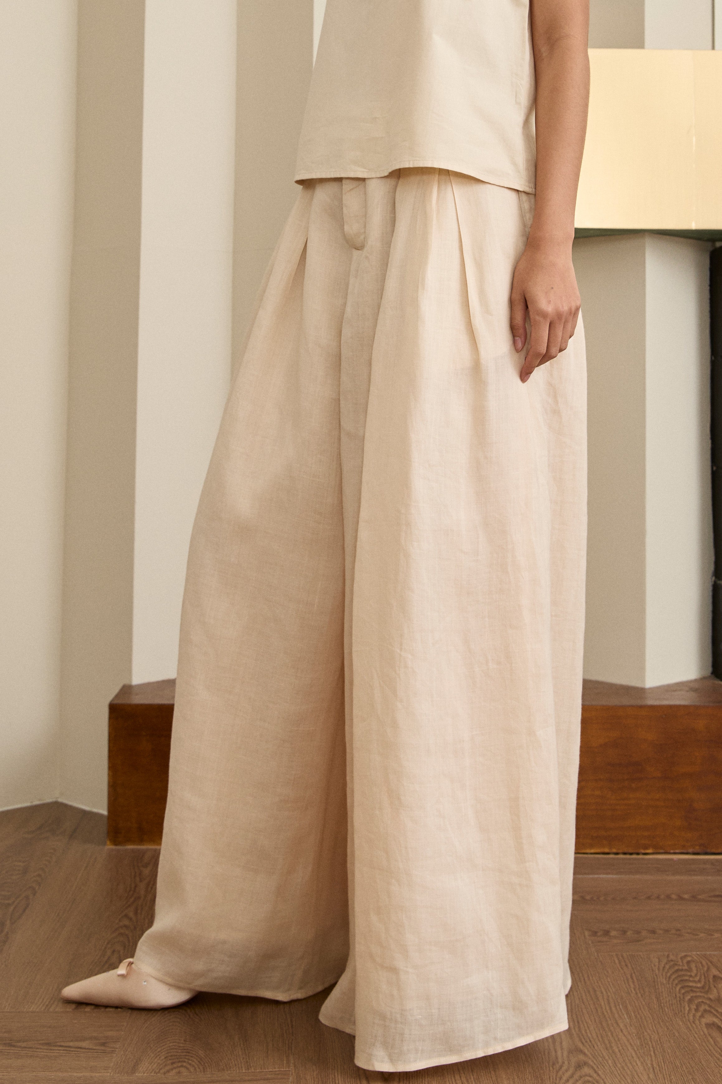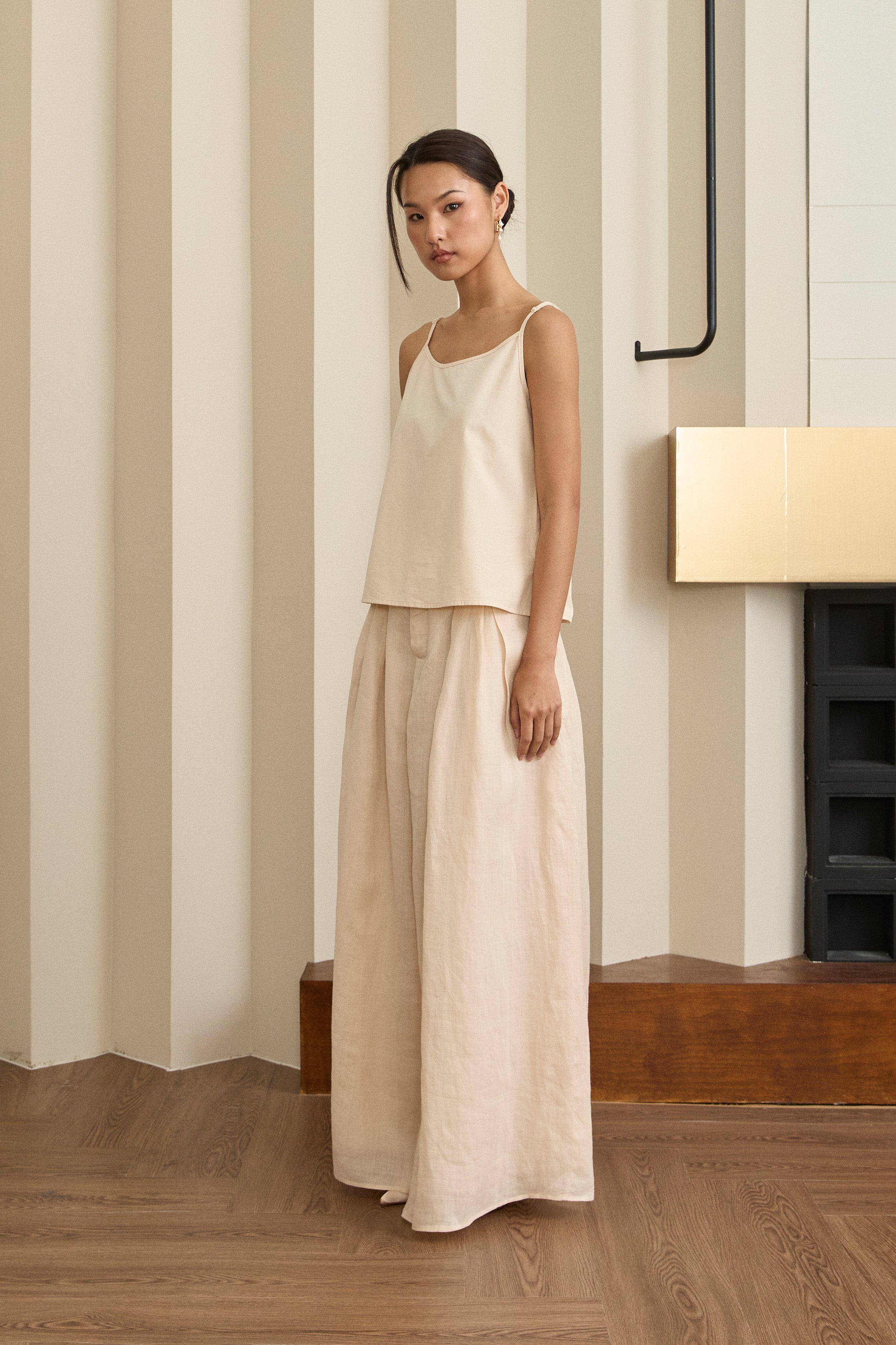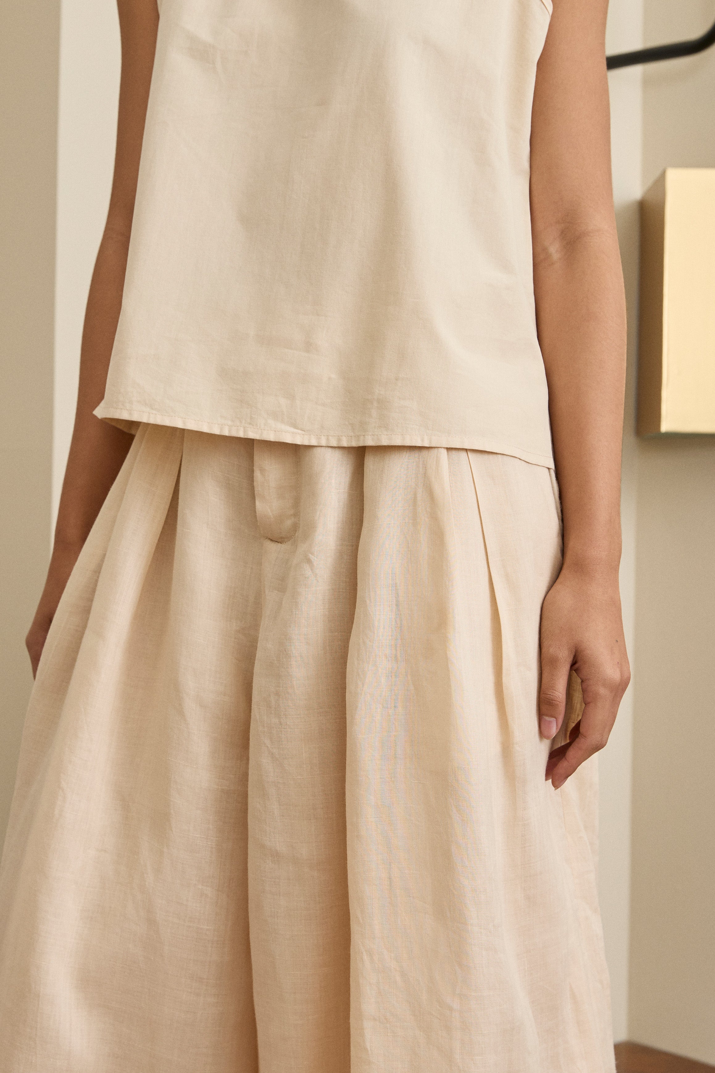 A relaxed, wide flared fit, featuring front zip fastening and half elastic waistband. Rendered in ramie, fully lined in cotton. Finished with pockets.