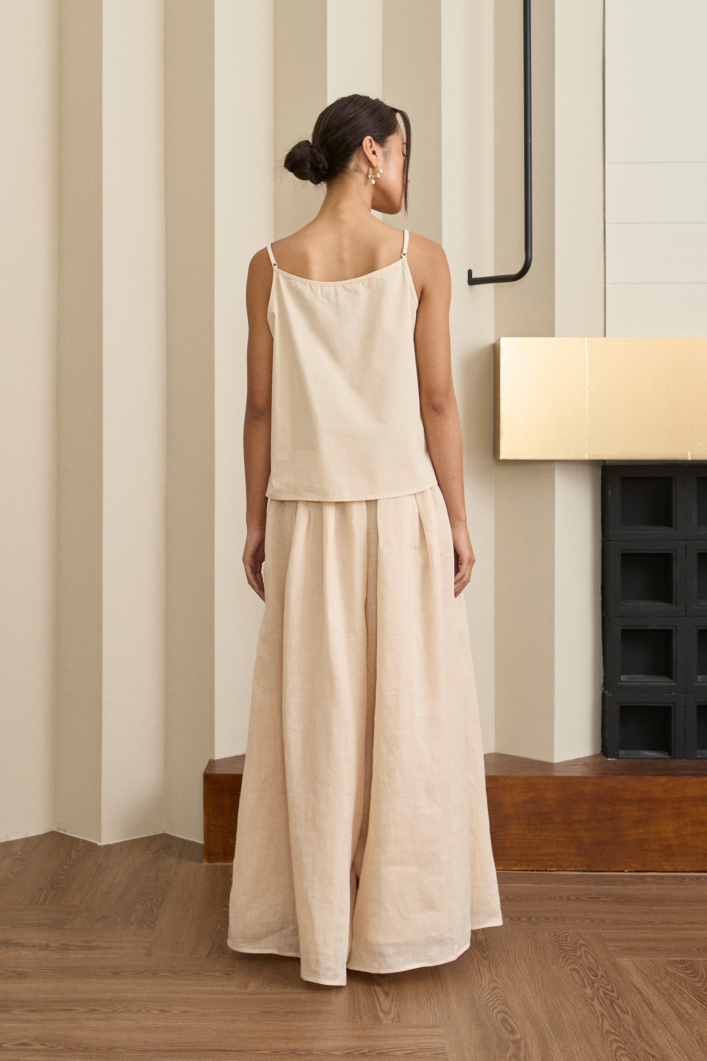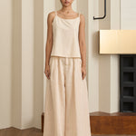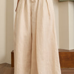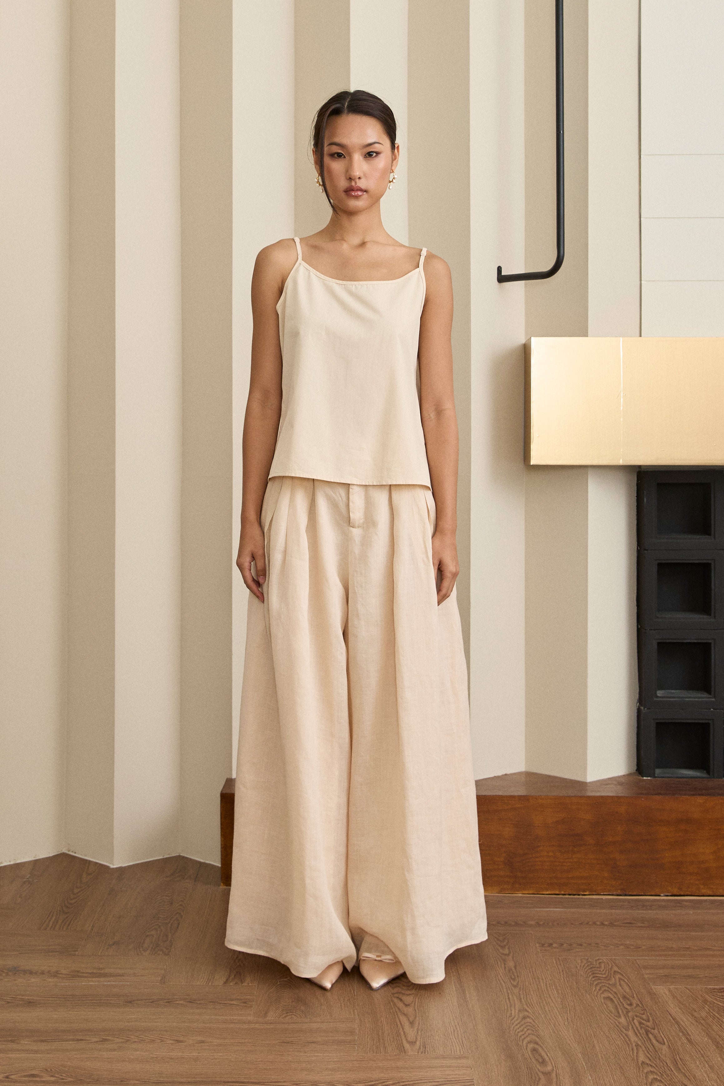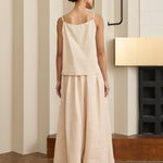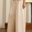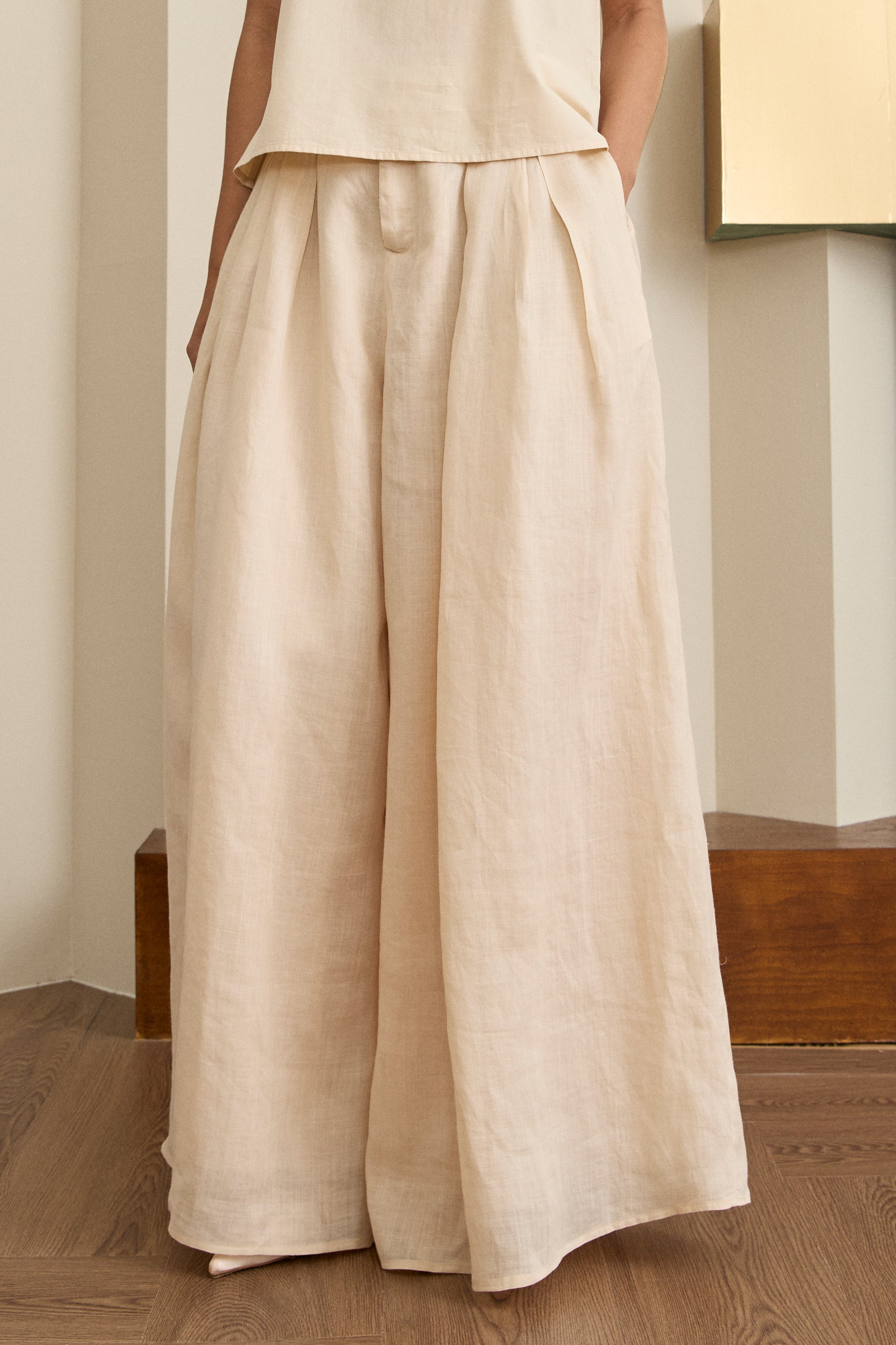 A relaxed, wide flared fit, featuring front zip fastening and half elastic waistband. Rendered in ramie, fully lined in cotton. Finished with pockets.